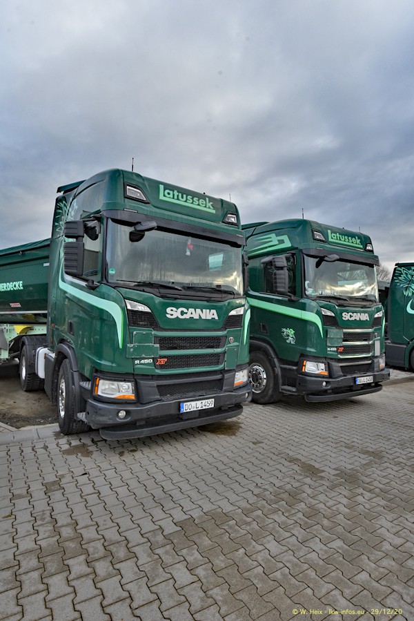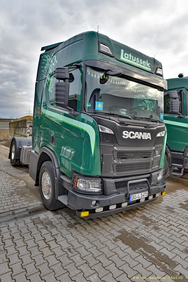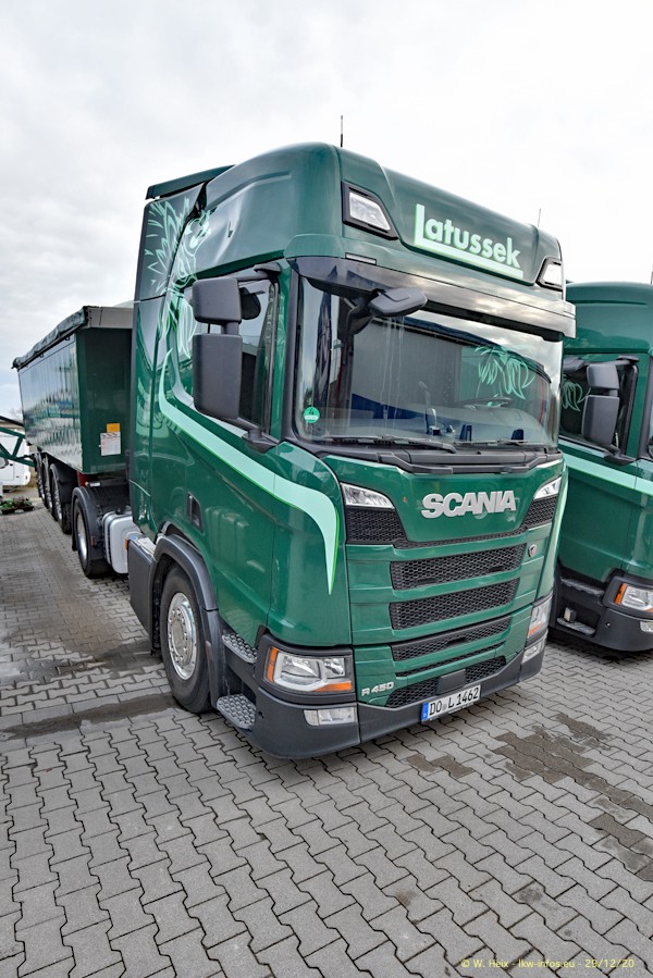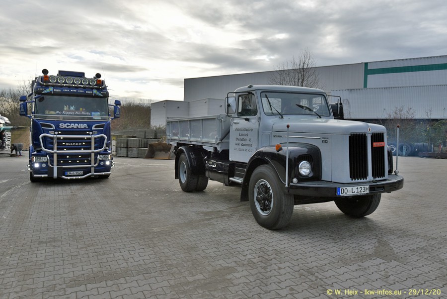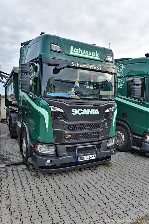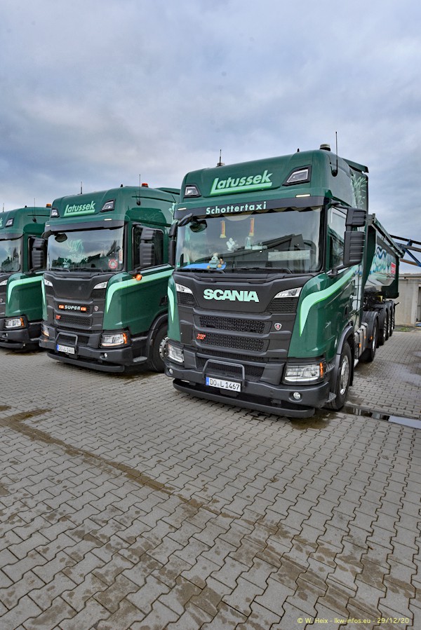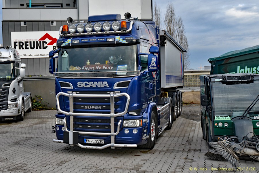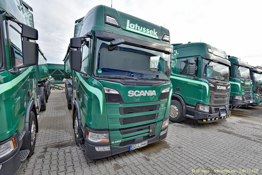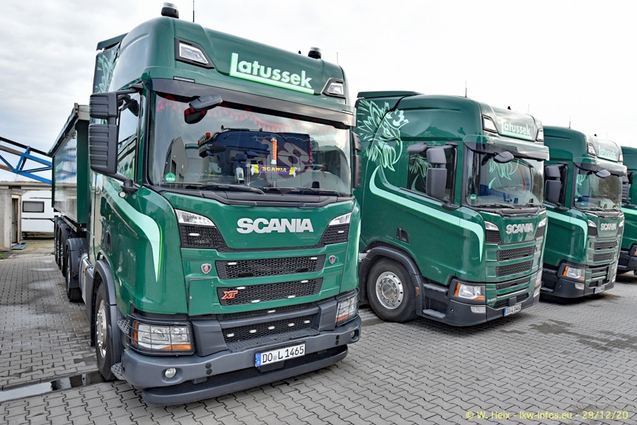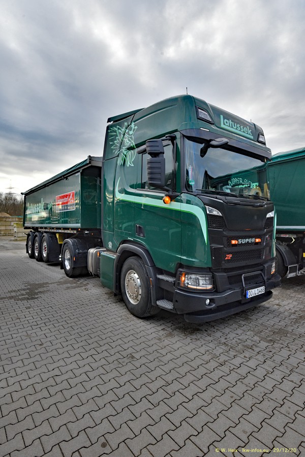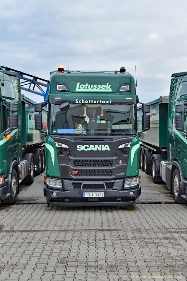 Dies war mein erster Besuch bei der Firma Latussek in Dortmund. Der Fuhrpark besteht aus ca. 30 LKW. Das sind IVECO, MAN, SCANIA und VOLVO, wobei der größte Teil Fahrzeuge von SCANIA ist. Der blaue SCANIA R 520 V8 Streamline gehört auch zum Fuhrpark und es gibt noch den schönen SCANIA L 110 Oldtimer, der für den Fotobesuch extra aus der Garage geholt wurde. Der LKW ist von 1973, hat 305 PS und ist in einem guten Zustand, die Restaurierung ist schon über 15 Jahre her. Bei Latussek ist es wie bei vielen Firmen: Nur Weihnachten bzw. zwischen den Feiertagen sind so gut wie alle LKW zuhause. Zwei fehlten, weil diese im Einsatz waren.