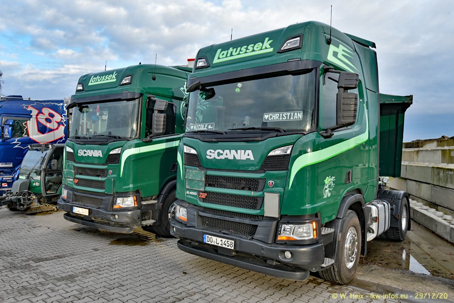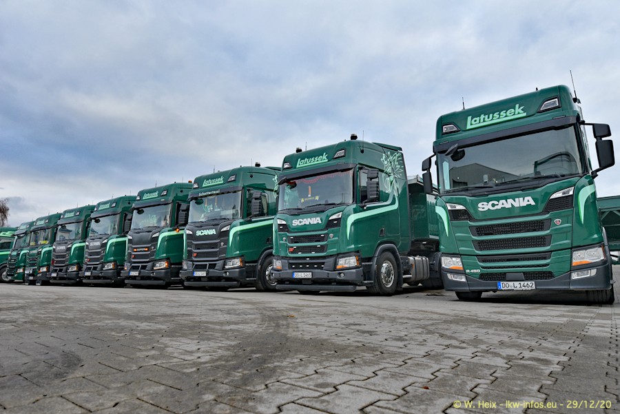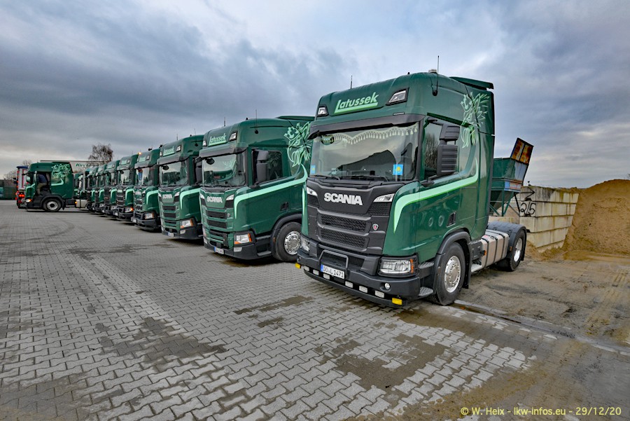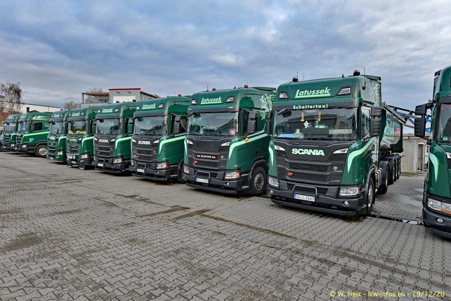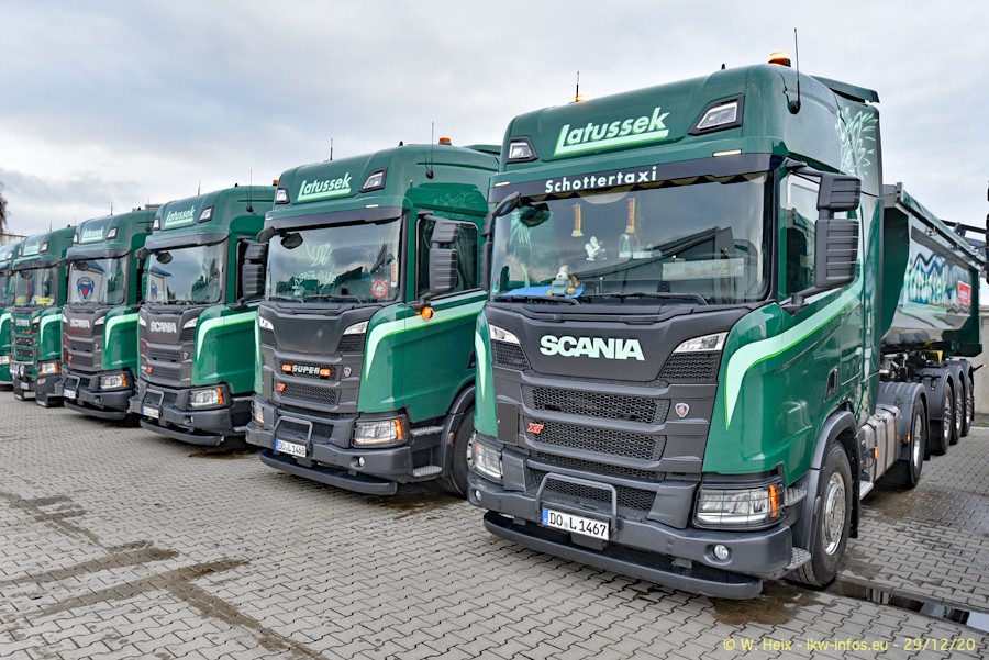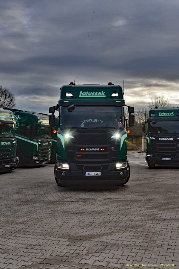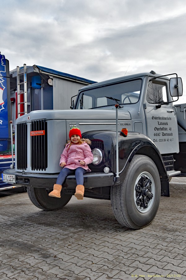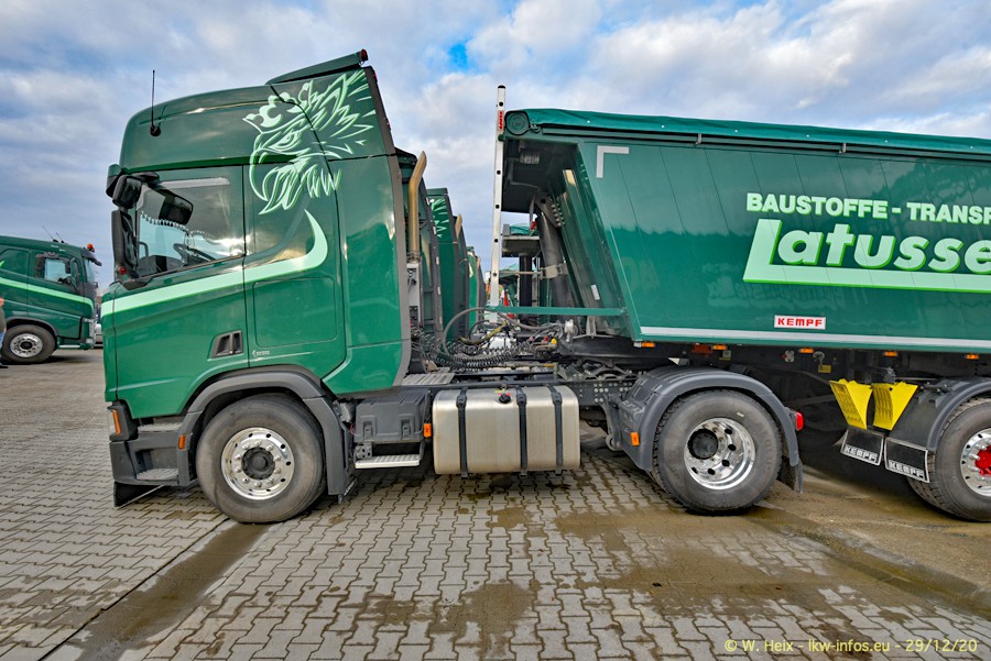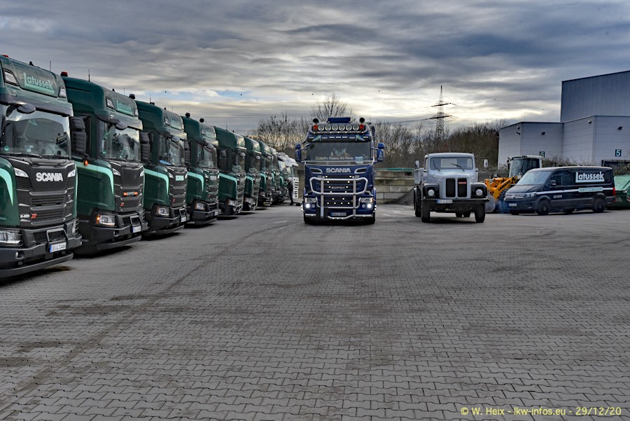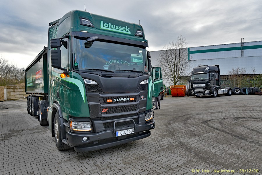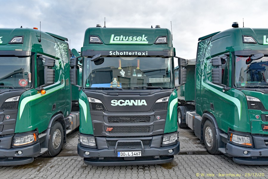 Dies war mein erster Besuch bei der Firma Latussek in Dortmund. Der Fuhrpark besteht aus ca. 30 LKW. Das sind IVECO, MAN, SCANIA und VOLVO, wobei der größte Teil Fahrzeuge von SCANIA ist. Der blaue SCANIA R 520 V8 Streamline gehört auch zum Fuhrpark und es gibt noch den schönen SCANIA L 110 Oldtimer, der für den Fotobesuch extra aus der Garage geholt wurde. Der LKW ist von 1973, hat 305 PS und ist in einem guten Zustand, die Restaurierung ist schon über 15 Jahre her. Bei Latussek ist es wie bei vielen Firmen: Nur Weihnachten bzw. zwischen den Feiertagen sind so gut wie alle LKW zuhause. Zwei fehlten, weil diese im Einsatz waren.