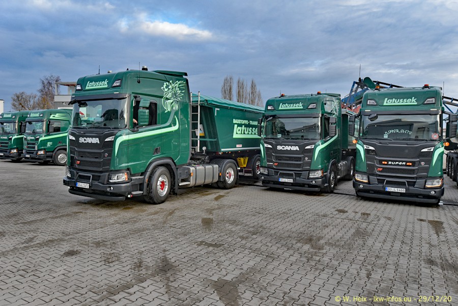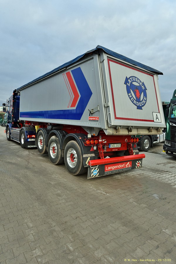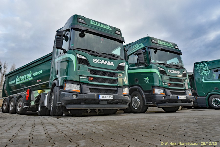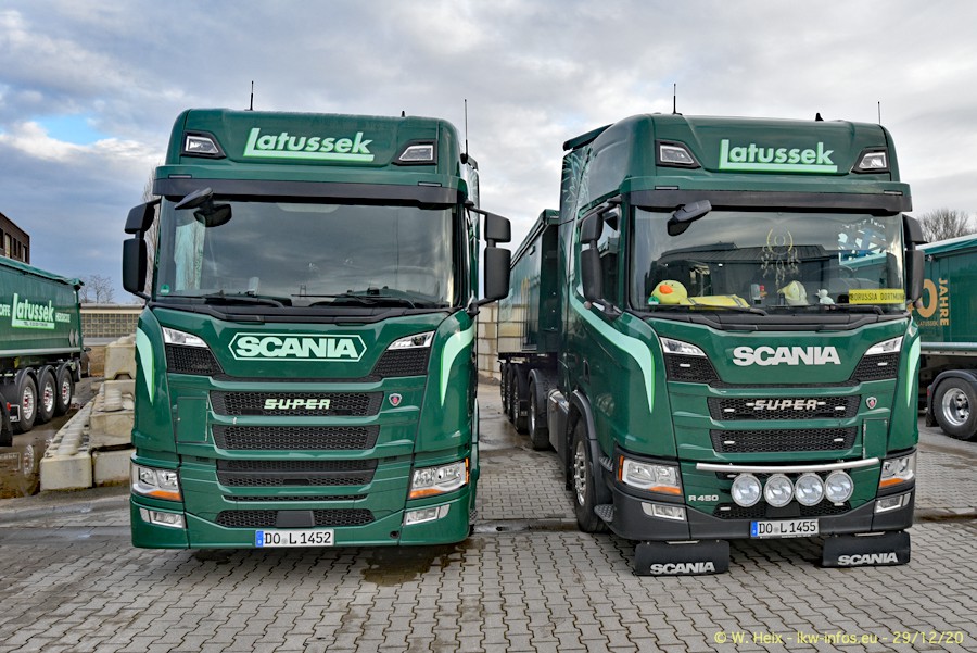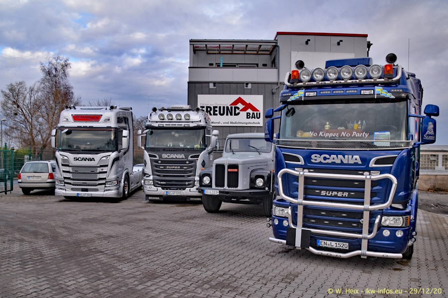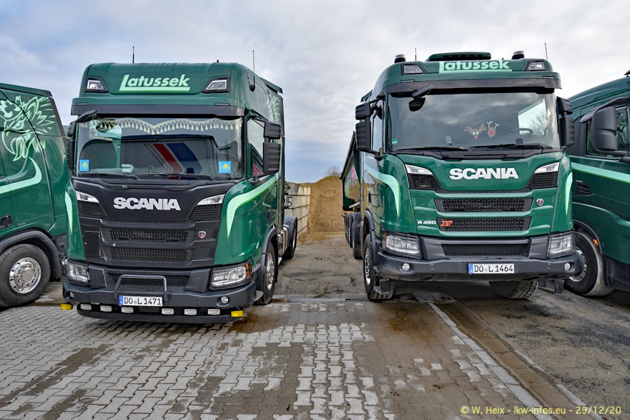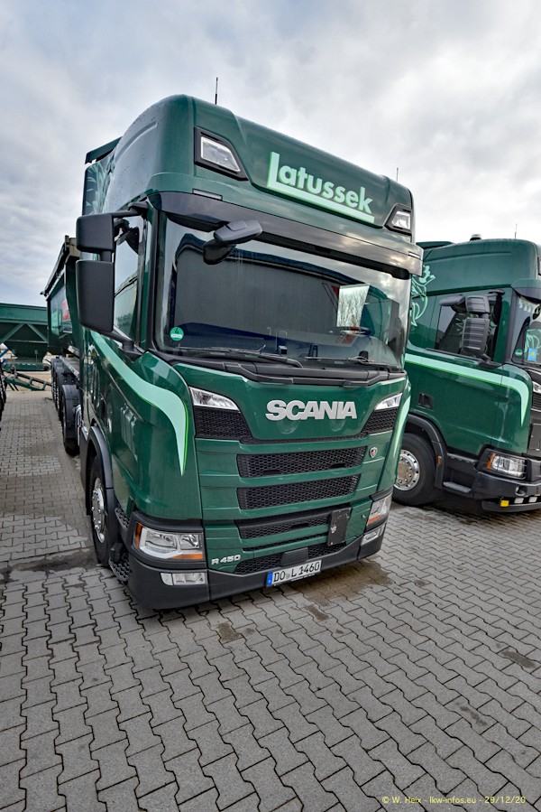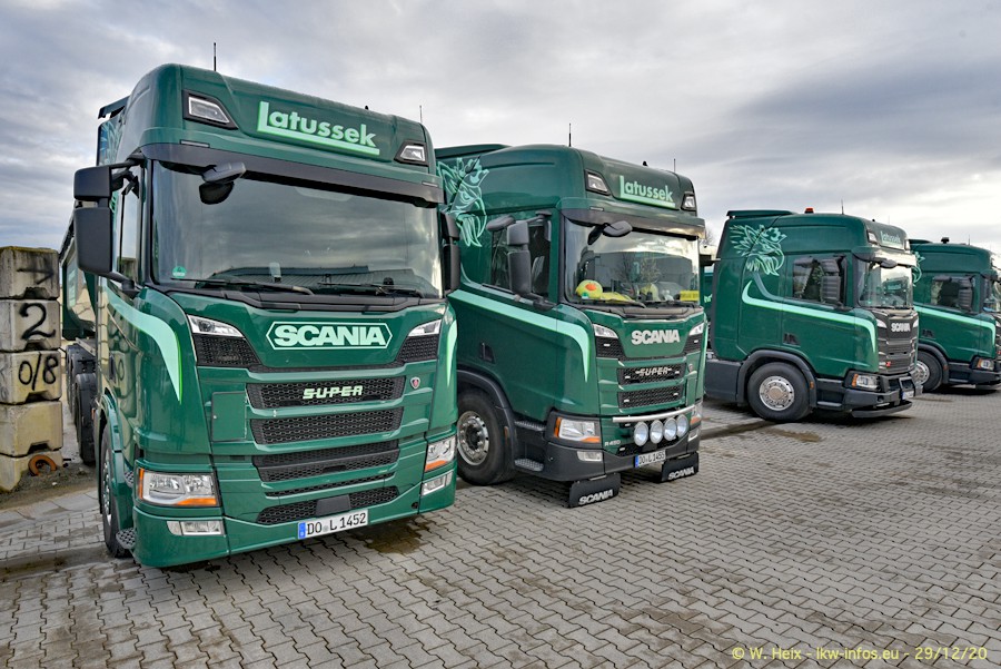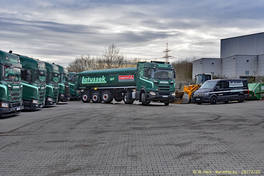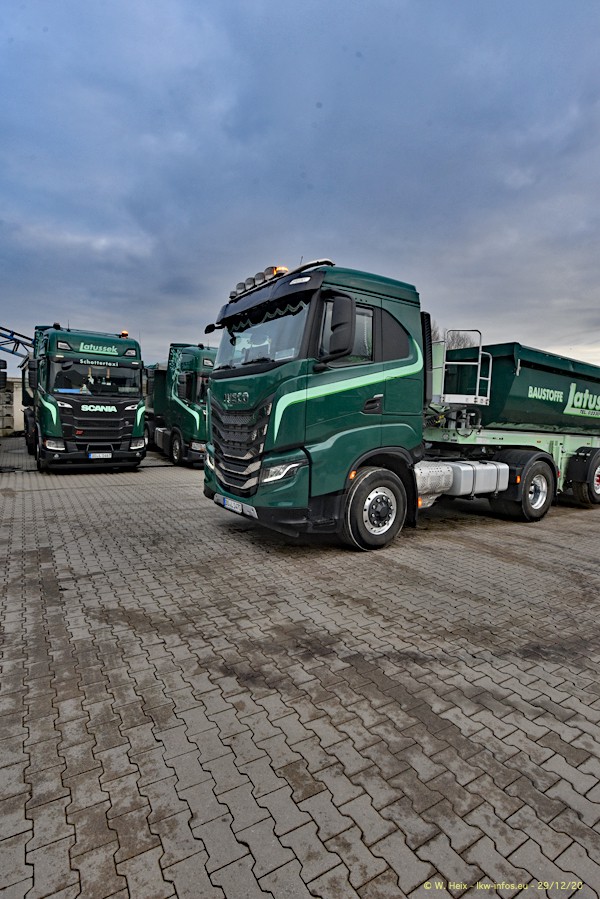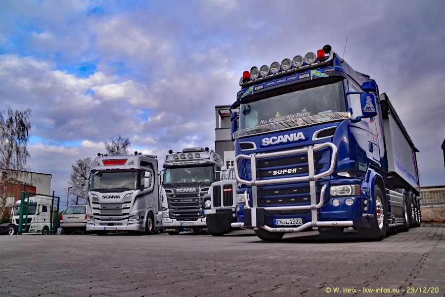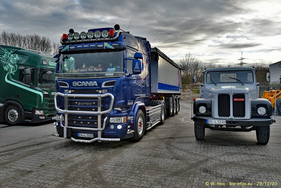 Dies war mein erster Besuch bei der Firma Latussek in Dortmund. Der Fuhrpark besteht aus ca. 30 LKW. Das sind IVECO, MAN, SCANIA und VOLVO, wobei der größte Teil Fahrzeuge von SCANIA ist. Der blaue SCANIA R 520 V8 Streamline gehört auch zum Fuhrpark und es gibt noch den schönen SCANIA L 110 Oldtimer, der für den Fotobesuch extra aus der Garage geholt wurde. Der LKW ist von 1973, hat 305 PS und ist in einem guten Zustand, die Restaurierung ist schon über 15 Jahre her. Bei Latussek ist es wie bei vielen Firmen: Nur Weihnachten bzw. zwischen den Feiertagen sind so gut wie alle LKW zuhause. Zwei fehlten, weil diese im Einsatz waren.