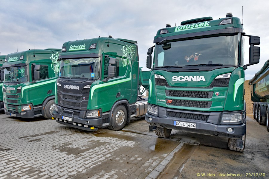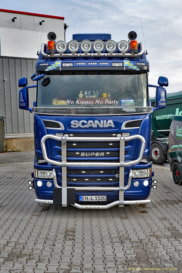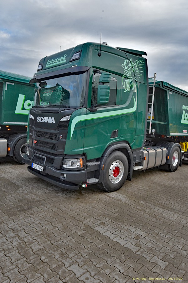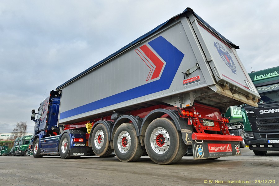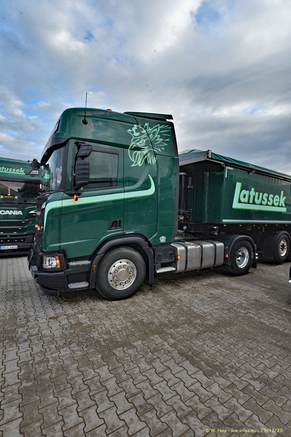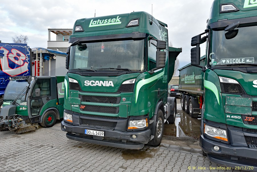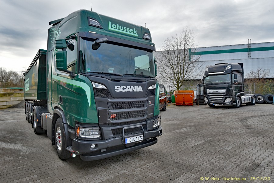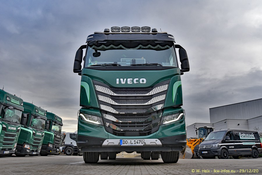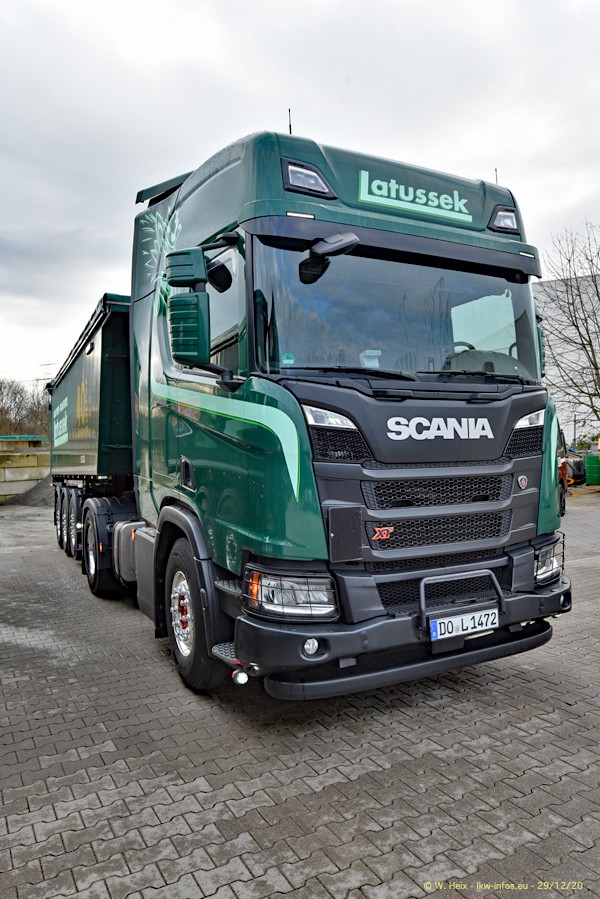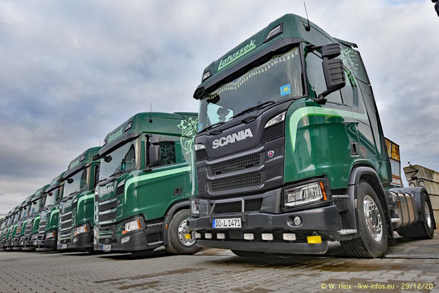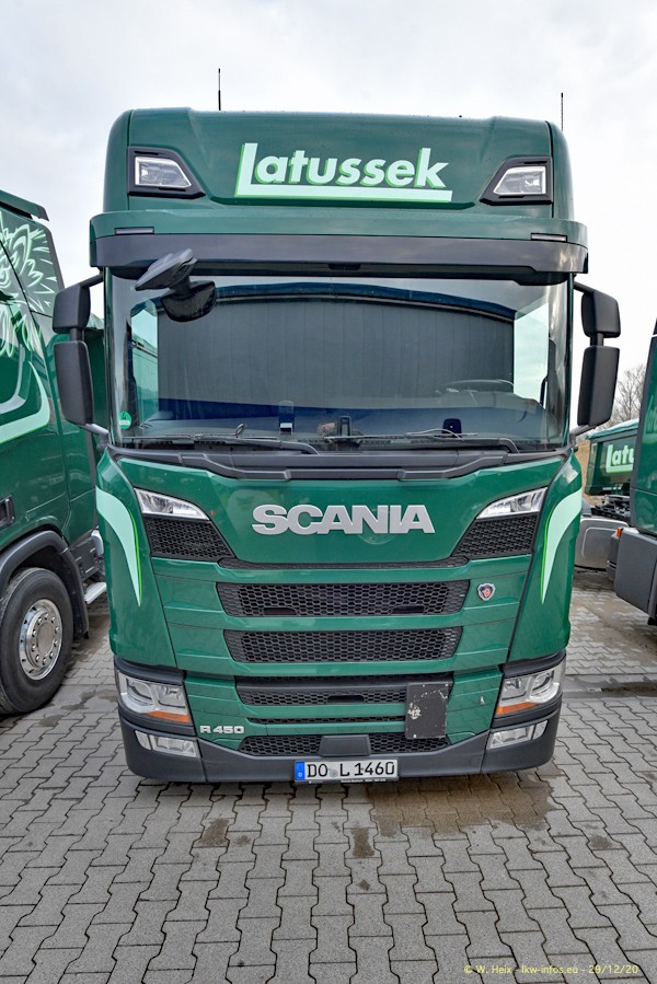 Dies war mein erster Besuch bei der Firma Latussek in Dortmund. Der Fuhrpark besteht aus ca. 30 LKW. Das sind IVECO, MAN, SCANIA und VOLVO, wobei der größte Teil Fahrzeuge von SCANIA ist. Der blaue SCANIA R 520 V8 Streamline gehört auch zum Fuhrpark und es gibt noch den schönen SCANIA L 110 Oldtimer, der für den Fotobesuch extra aus der Garage geholt wurde. Der LKW ist von 1973, hat 305 PS und ist in einem guten Zustand, die Restaurierung ist schon über 15 Jahre her. Bei Latussek ist es wie bei vielen Firmen: Nur Weihnachten bzw. zwischen den Feiertagen sind so gut wie alle LKW zuhause. Zwei fehlten, weil diese im Einsatz waren.