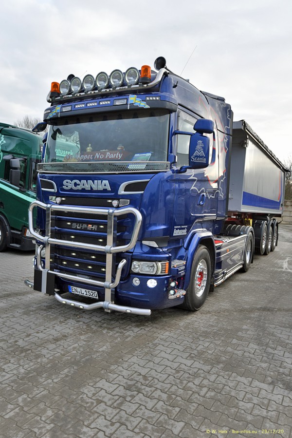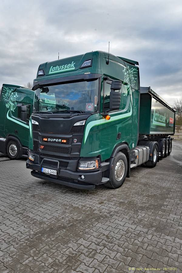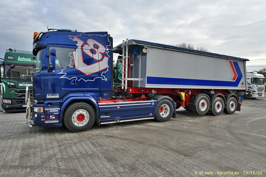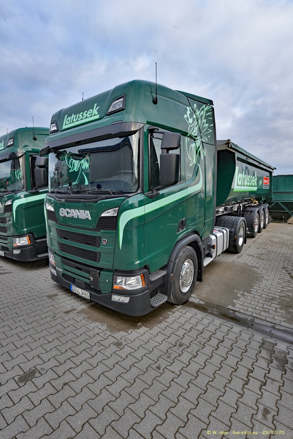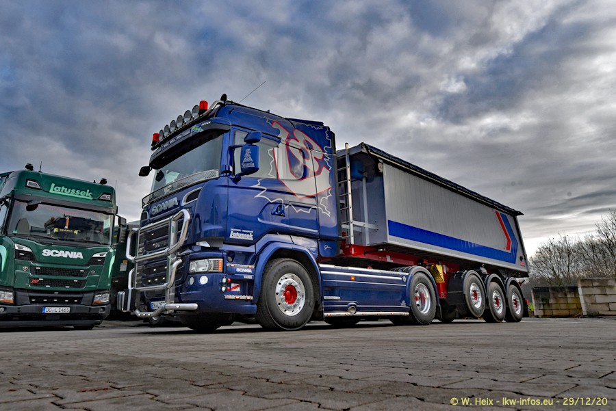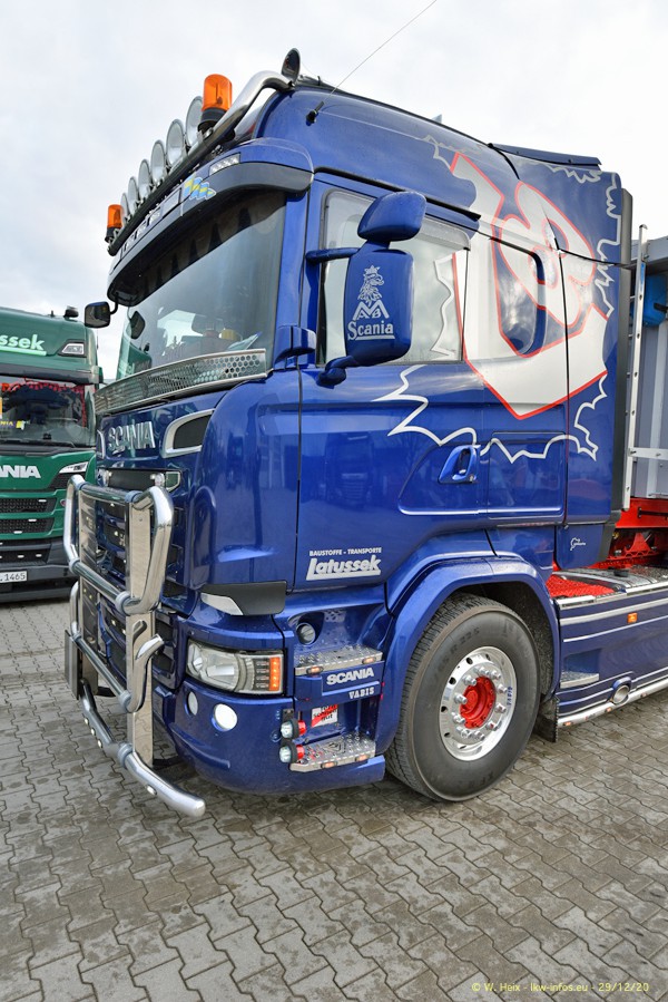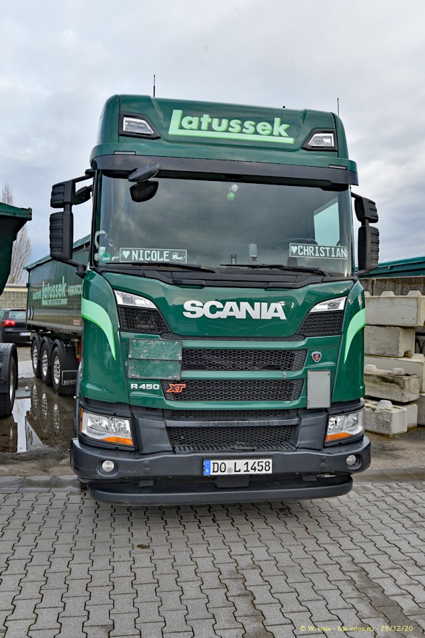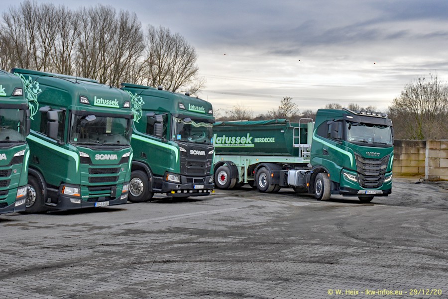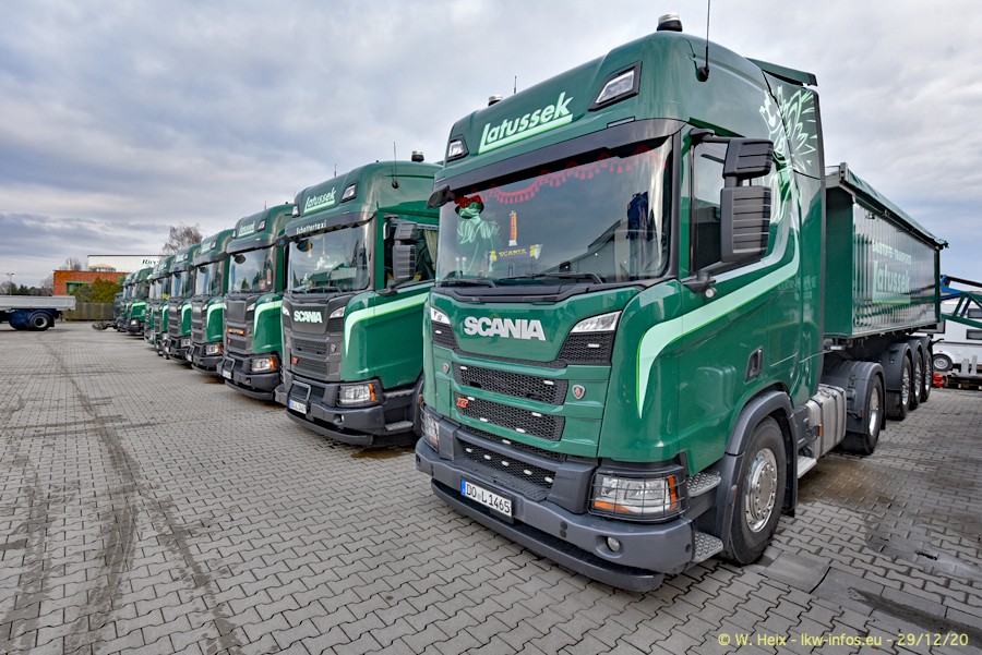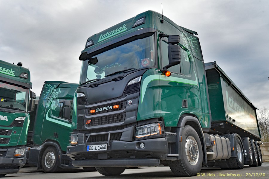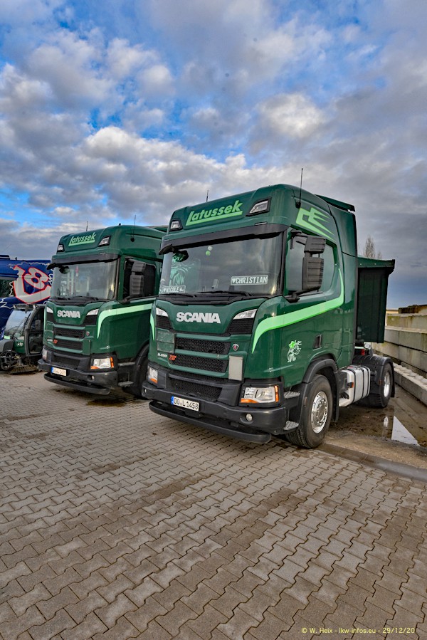 Dies war mein erster Besuch bei der Firma Latussek in Dortmund. Der Fuhrpark besteht aus ca. 30 LKW. Das sind IVECO, MAN, SCANIA und VOLVO, wobei der größte Teil Fahrzeuge von SCANIA ist. Der blaue SCANIA R 520 V8 Streamline gehört auch zum Fuhrpark und es gibt noch den schönen SCANIA L 110 Oldtimer, der für den Fotobesuch extra aus der Garage geholt wurde. Der LKW ist von 1973, hat 305 PS und ist in einem guten Zustand, die Restaurierung ist schon über 15 Jahre her. Bei Latussek ist es wie bei vielen Firmen: Nur Weihnachten bzw. zwischen den Feiertagen sind so gut wie alle LKW zuhause. Zwei fehlten, weil diese im Einsatz waren.