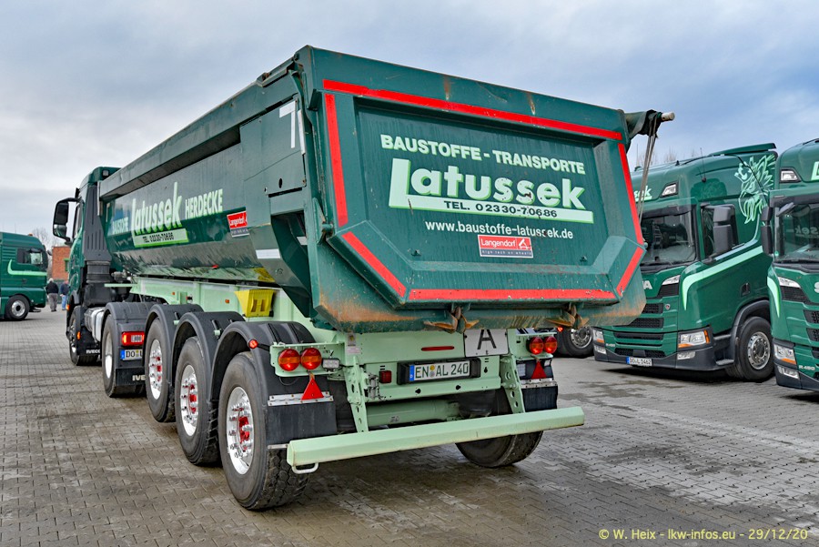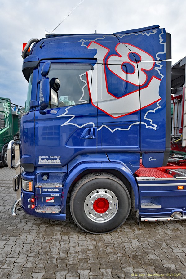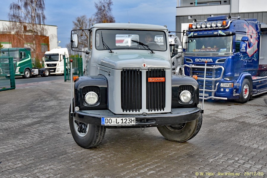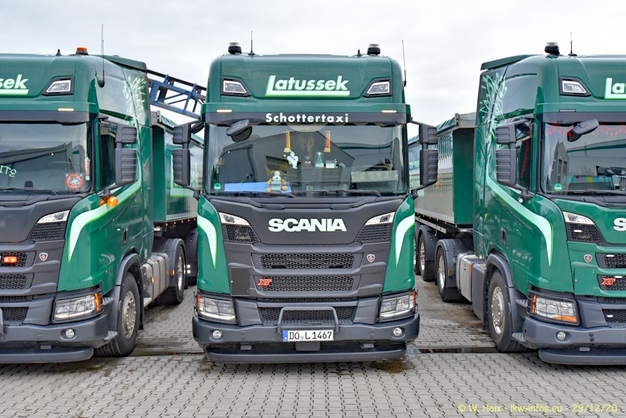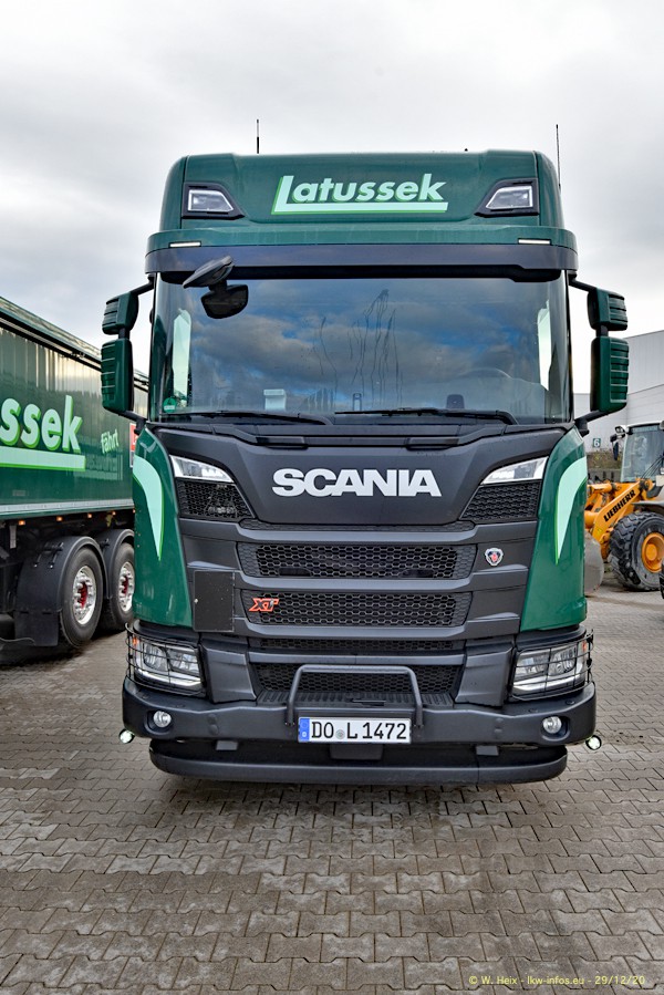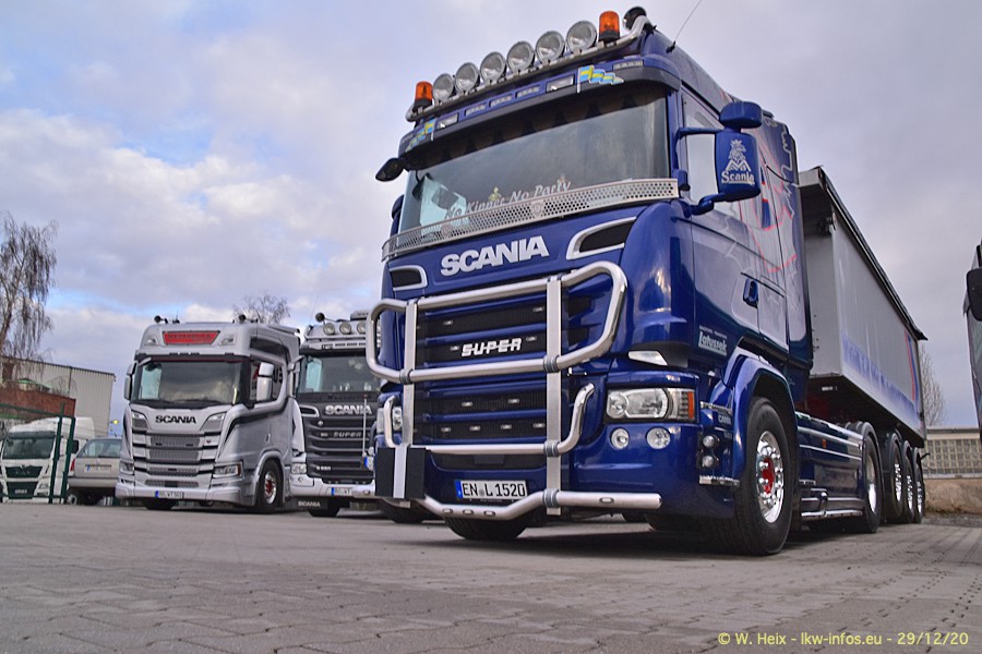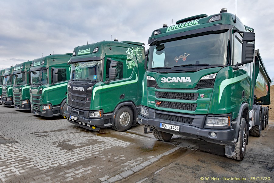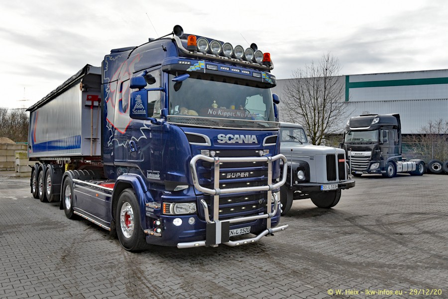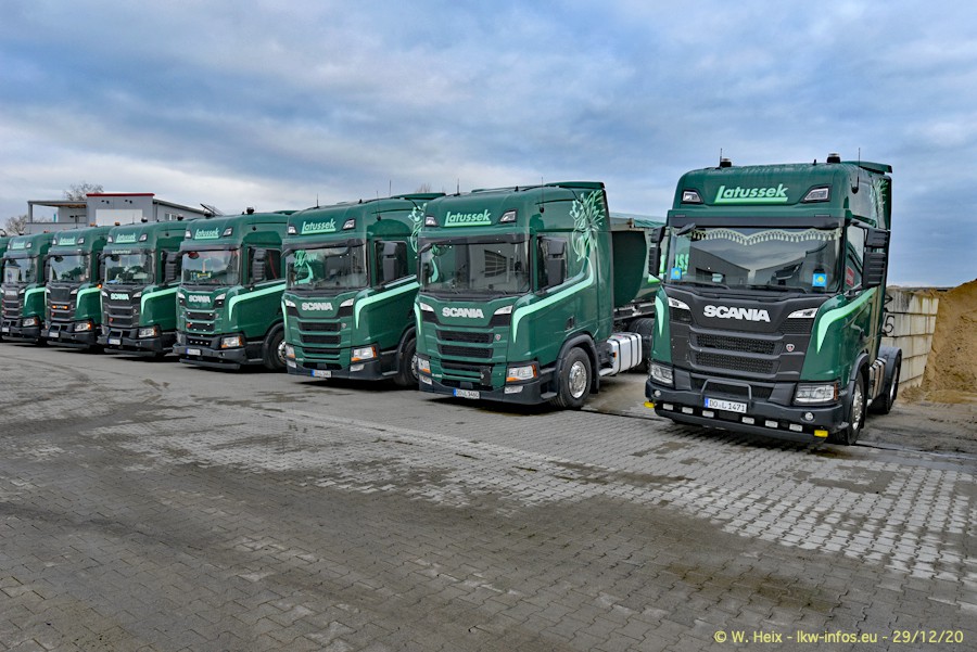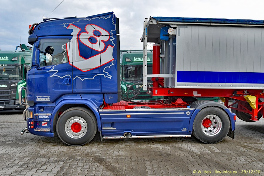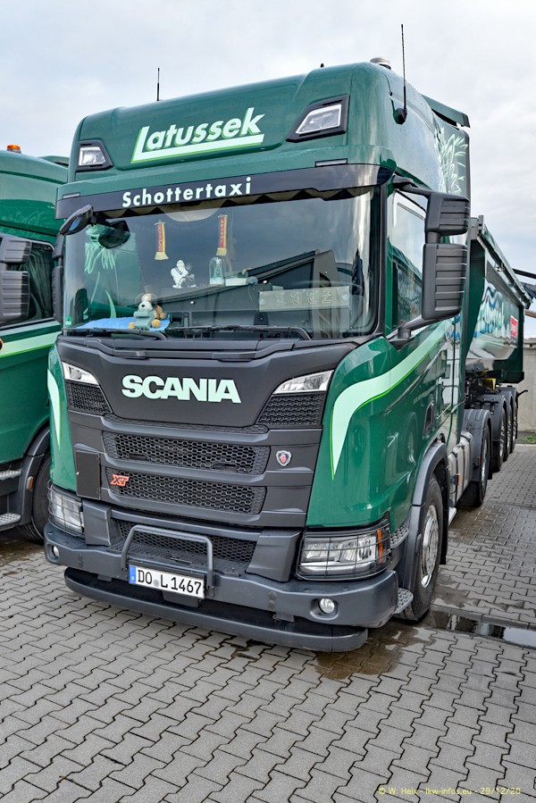 Dies war mein erster Besuch bei der Firma Latussek in Dortmund. Der Fuhrpark besteht aus ca. 30 LKW. Das sind IVECO, MAN, SCANIA und VOLVO, wobei der größte Teil Fahrzeuge von SCANIA ist. Der blaue SCANIA R 520 V8 Streamline gehört auch zum Fuhrpark und es gibt noch den schönen SCANIA L 110 Oldtimer, der für den Fotobesuch extra aus der Garage geholt wurde. Der LKW ist von 1973, hat 305 PS und ist in einem guten Zustand, die Restaurierung ist schon über 15 Jahre her. Bei Latussek ist es wie bei vielen Firmen: Nur Weihnachten bzw. zwischen den Feiertagen sind so gut wie alle LKW zuhause. Zwei fehlten, weil diese im Einsatz waren.