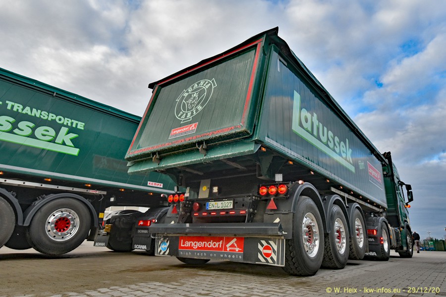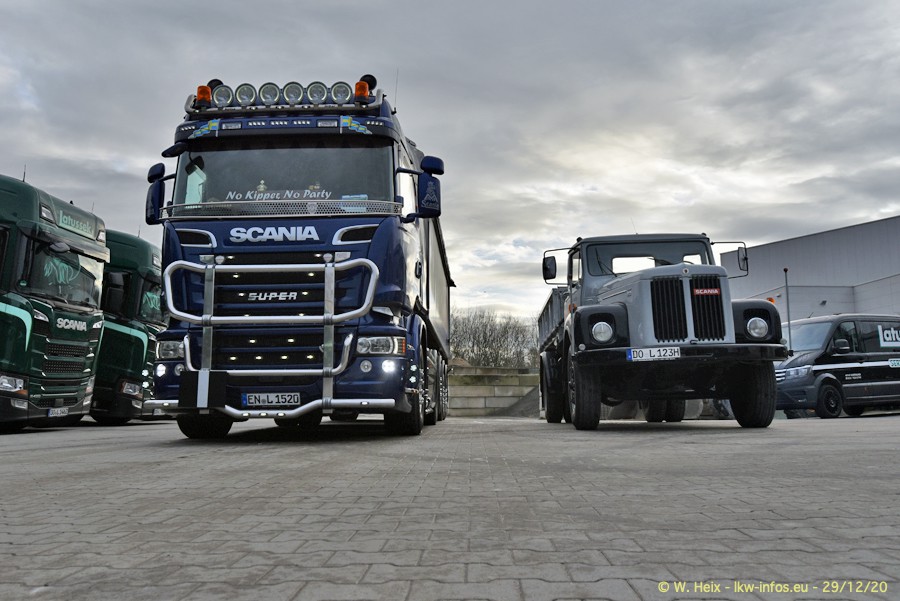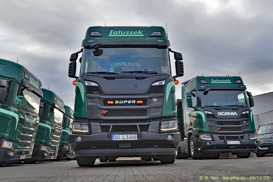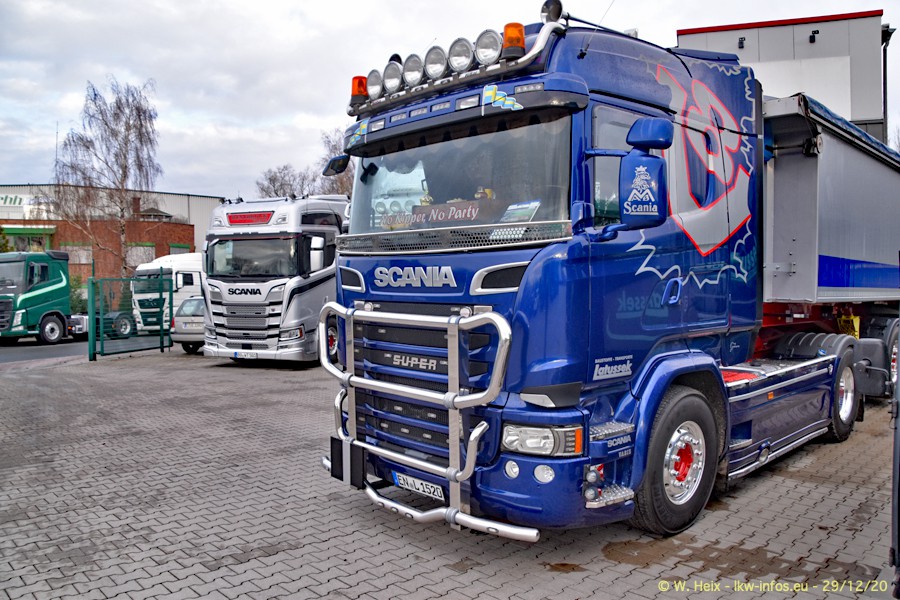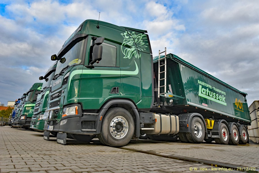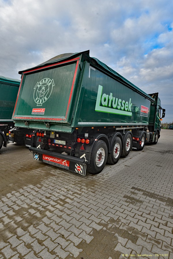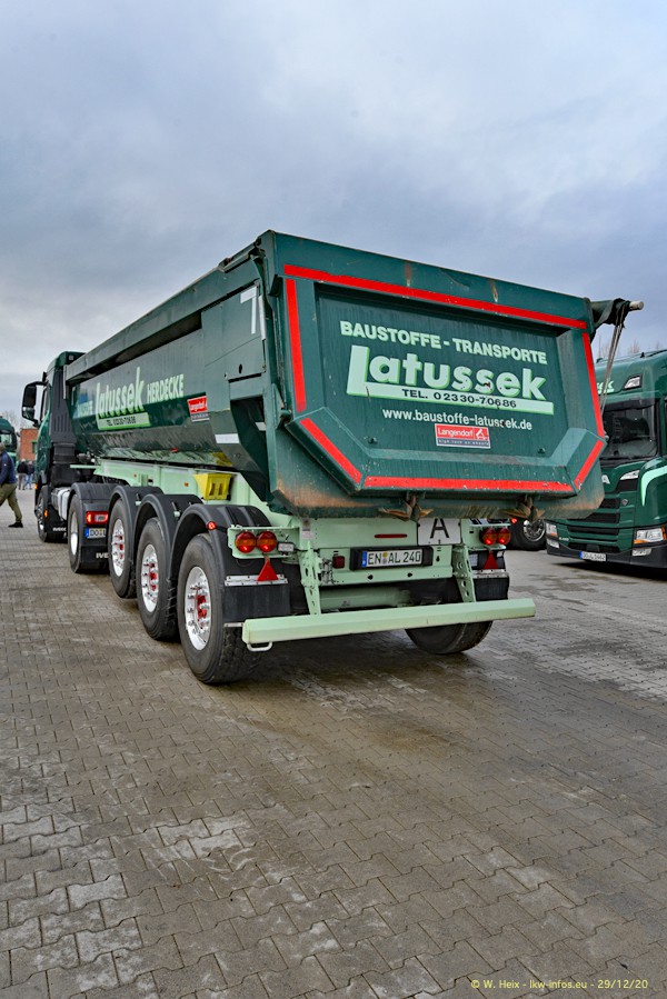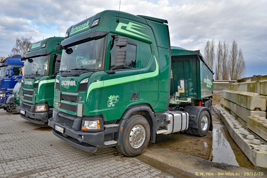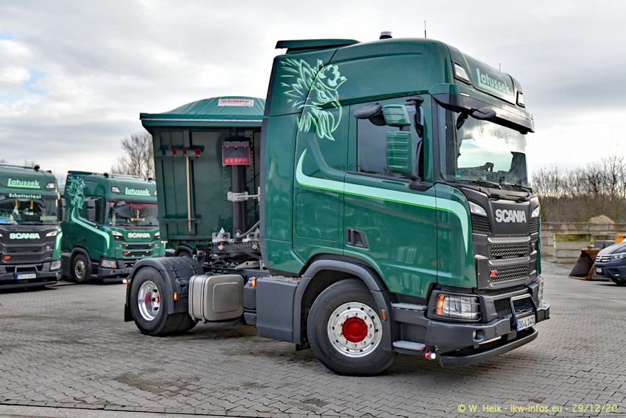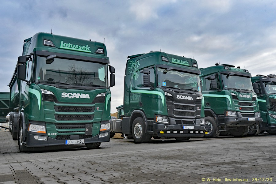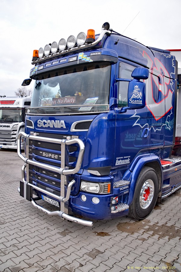 Dies war mein erster Besuch bei der Firma Latussek in Dortmund. Der Fuhrpark besteht aus ca. 30 LKW. Das sind IVECO, MAN, SCANIA und VOLVO, wobei der größte Teil Fahrzeuge von SCANIA ist. Der blaue SCANIA R 520 V8 Streamline gehört auch zum Fuhrpark und es gibt noch den schönen SCANIA L 110 Oldtimer, der für den Fotobesuch extra aus der Garage geholt wurde. Der LKW ist von 1973, hat 305 PS und ist in einem guten Zustand, die Restaurierung ist schon über 15 Jahre her. Bei Latussek ist es wie bei vielen Firmen: Nur Weihnachten bzw. zwischen den Feiertagen sind so gut wie alle LKW zuhause. Zwei fehlten, weil diese im Einsatz waren.