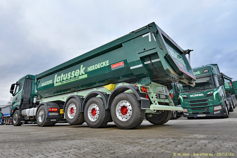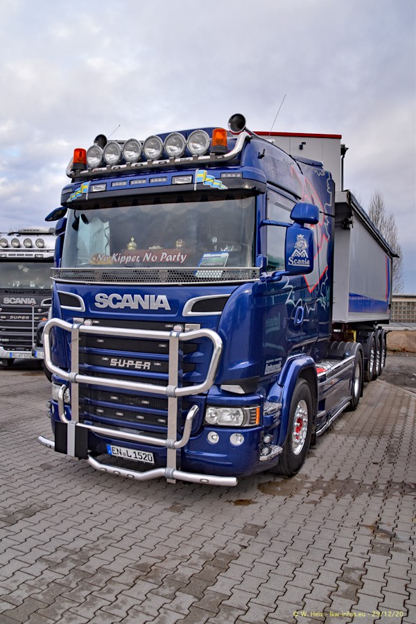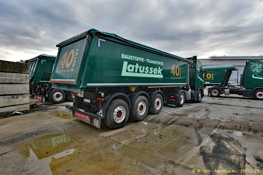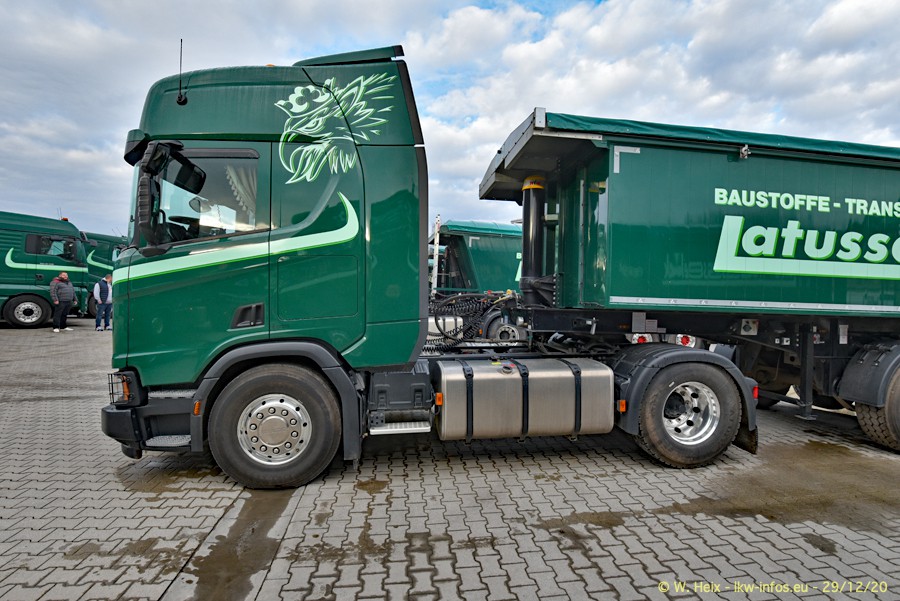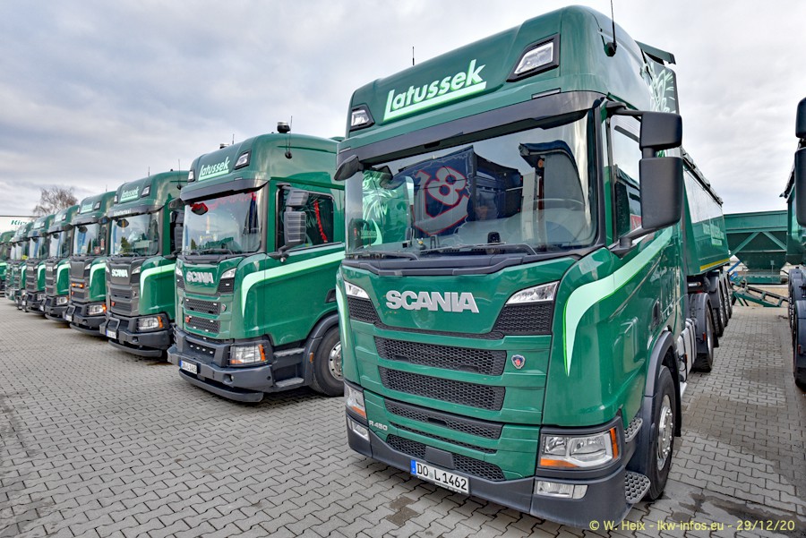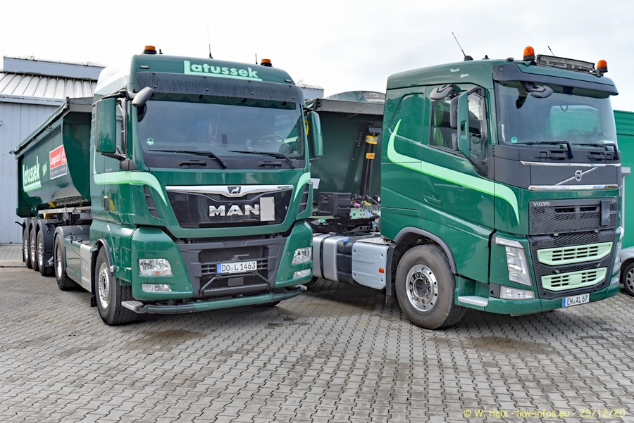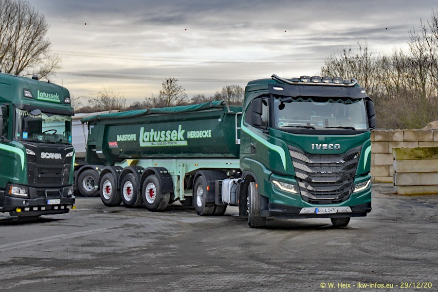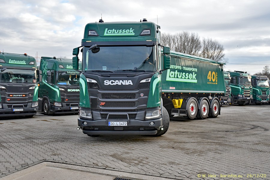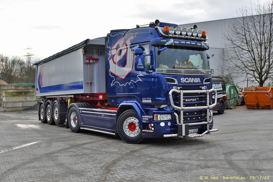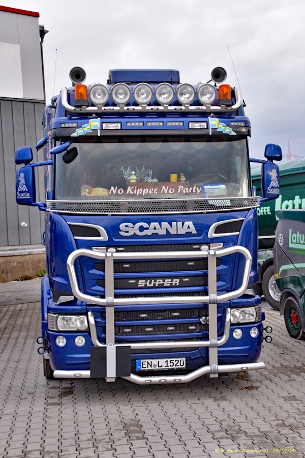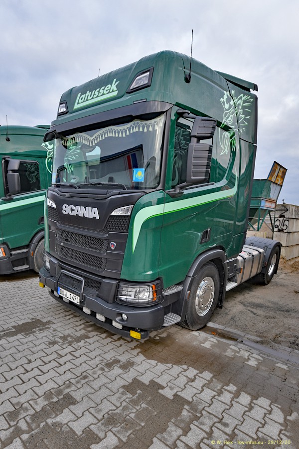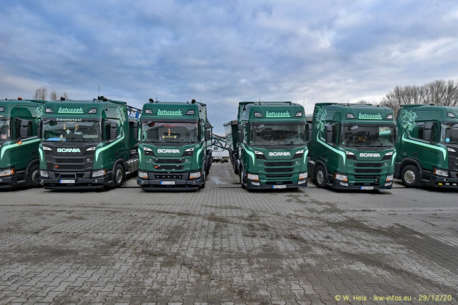 Dies war mein erster Besuch bei der Firma Latussek in Dortmund. Der Fuhrpark besteht aus ca. 30 LKW. Das sind IVECO, MAN, SCANIA und VOLVO, wobei der größte Teil Fahrzeuge von SCANIA ist. Der blaue SCANIA R 520 V8 Streamline gehört auch zum Fuhrpark und es gibt noch den schönen SCANIA L 110 Oldtimer, der für den Fotobesuch extra aus der Garage geholt wurde. Der LKW ist von 1973, hat 305 PS und ist in einem guten Zustand, die Restaurierung ist schon über 15 Jahre her. Bei Latussek ist es wie bei vielen Firmen: Nur Weihnachten bzw. zwischen den Feiertagen sind so gut wie alle LKW zuhause. Zwei fehlten, weil diese im Einsatz waren.
