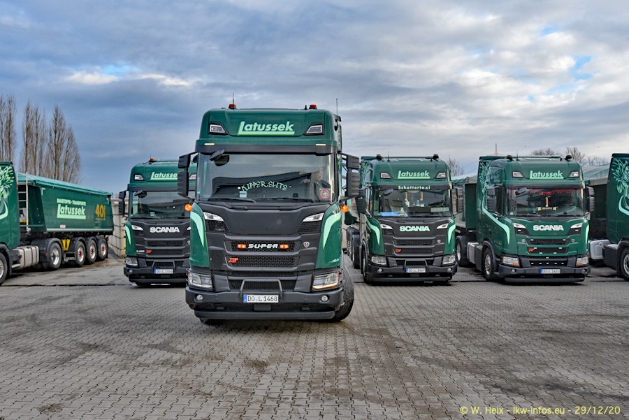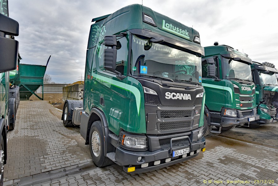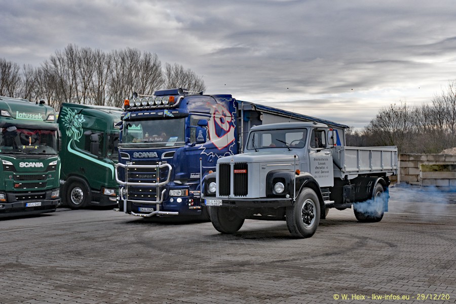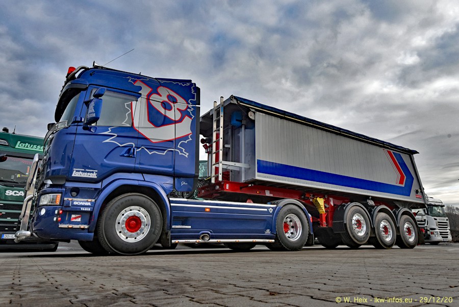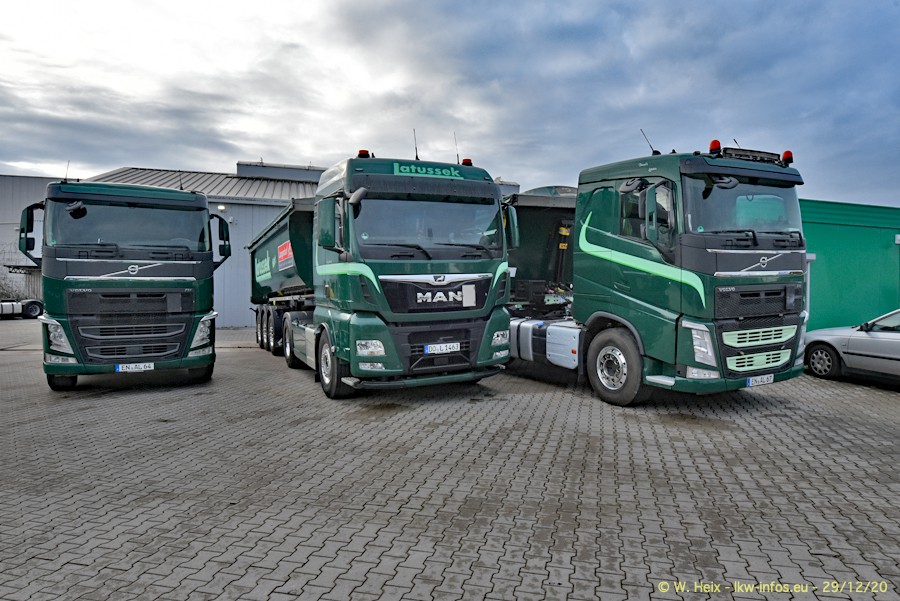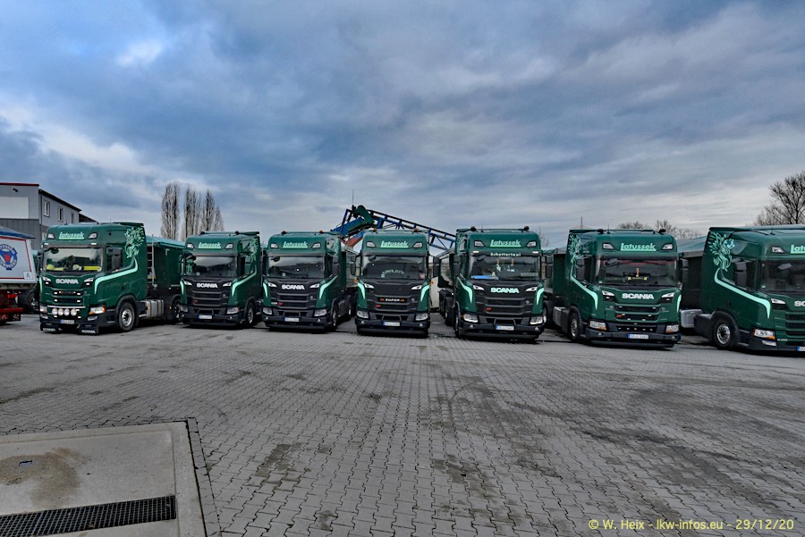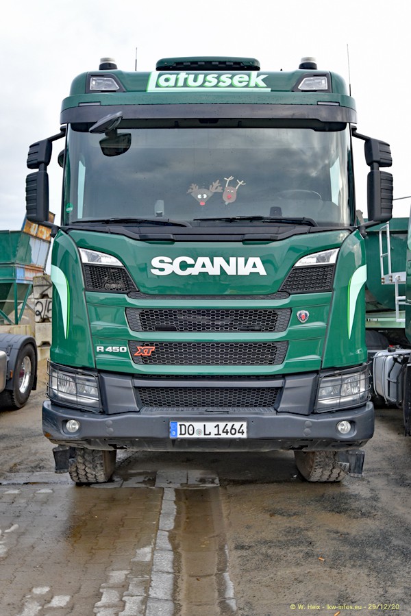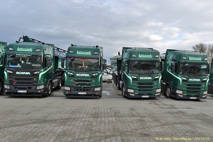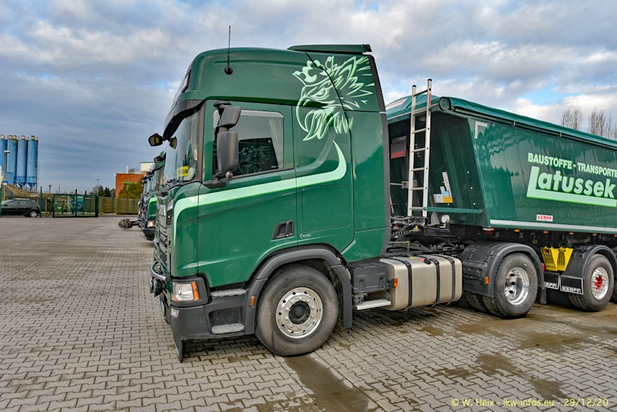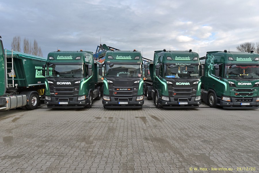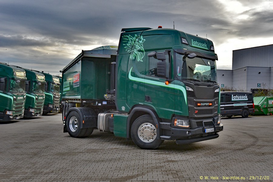 Dies war mein erster Besuch bei der Firma Latussek in Dortmund. Der Fuhrpark besteht aus ca. 30 LKW. Das sind IVECO, MAN, SCANIA und VOLVO, wobei der größte Teil Fahrzeuge von SCANIA ist. Der blaue SCANIA R 520 V8 Streamline gehört auch zum Fuhrpark und es gibt noch den schönen SCANIA L 110 Oldtimer, der für den Fotobesuch extra aus der Garage geholt wurde. Der LKW ist von 1973, hat 305 PS und ist in einem guten Zustand, die Restaurierung ist schon über 15 Jahre her. Bei Latussek ist es wie bei vielen Firmen: Nur Weihnachten bzw. zwischen den Feiertagen sind so gut wie alle LKW zuhause. Zwei fehlten, weil diese im Einsatz waren.