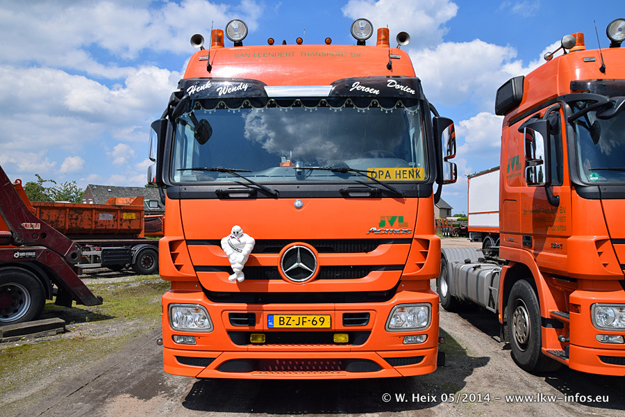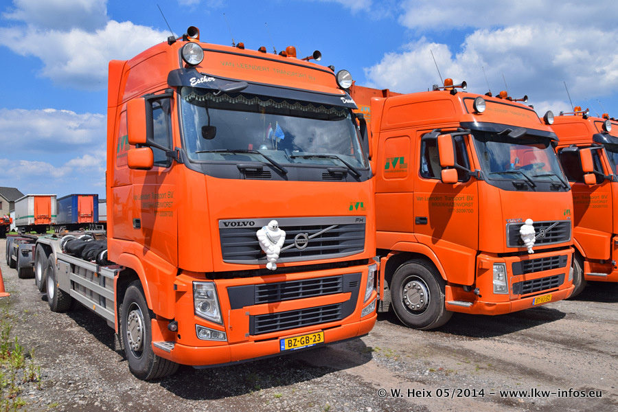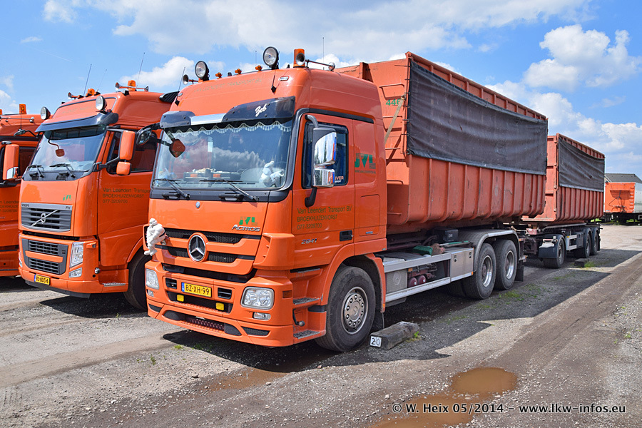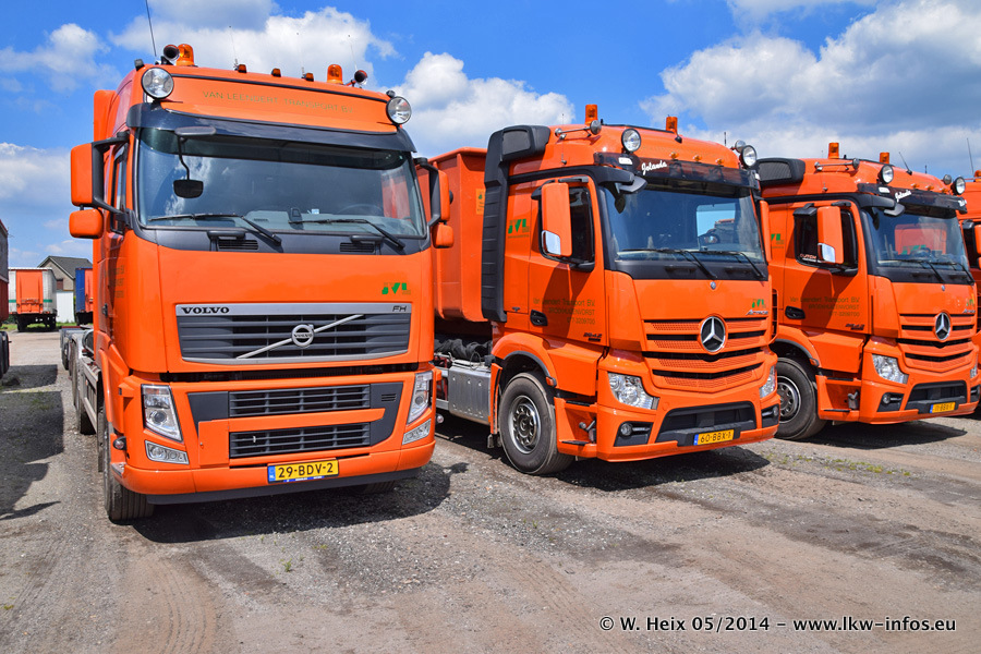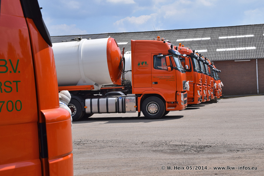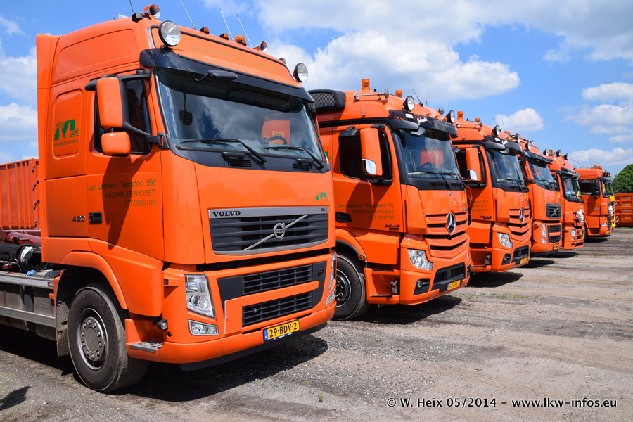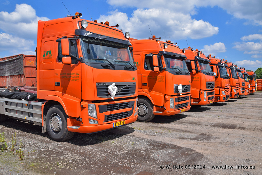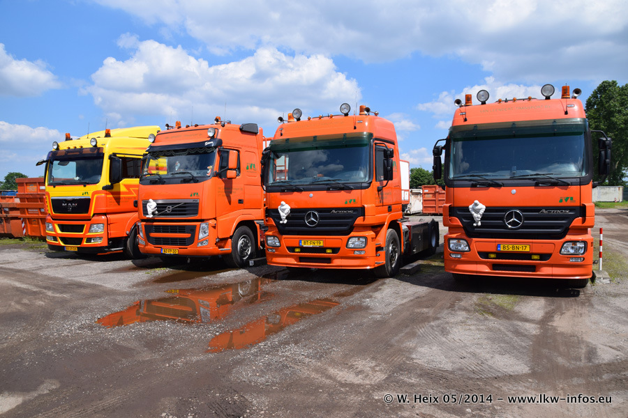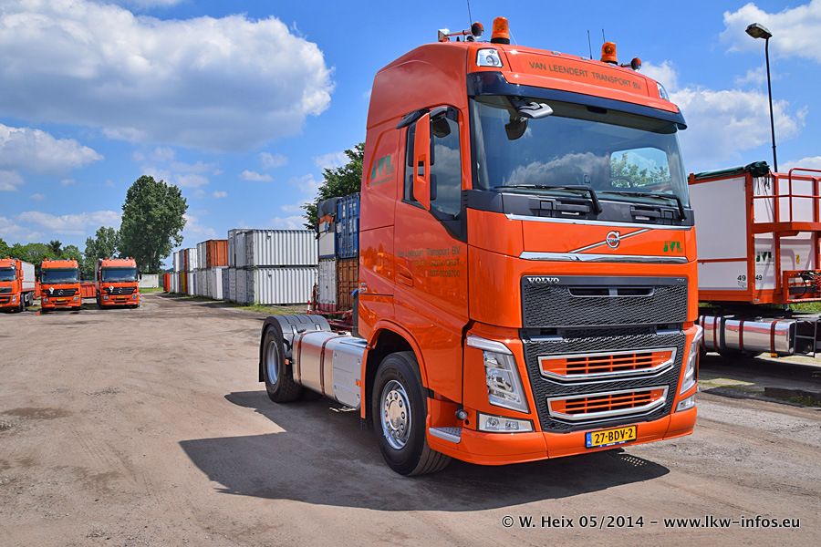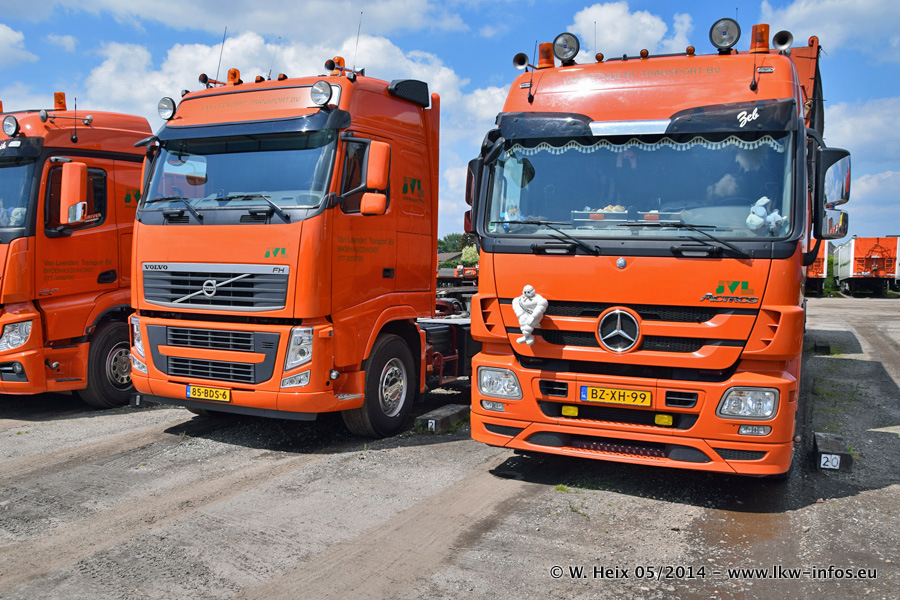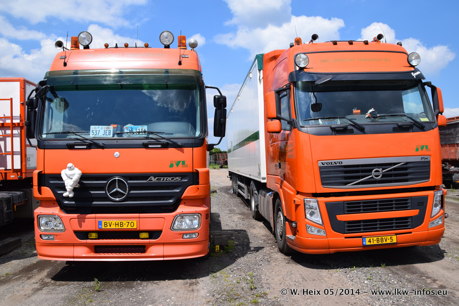 Der Fuhrpark besteht zur Zeit (Ende Mai 2014) aus 42 LKW der Hersteller MAN, Mercedes-Benz, Renault und Volvo. In der Woche vor meinem Besuch hat van Leendert zwei neue Volvo FH Euro 6 bekommen. Es gibt auch einen "Oldtimer", das ist ein Mercedes-Benz NG 2632 6x6. Dies war der erste LKW, den Erik van Leendert nach der Übernahme der Firma von seinem Vater im Jahr 1982 neu gekauft hat. Dieser LKW wird niemals verkauft und wird sogar im Nahverkehr und zum Umsetzen von Containern auf dem Hof verwendet. Der Kenworth W 900 ist Baujahr 2000 und wird nicht im normalen Tagesgeschäft eingesetzt. Nur für diverse Veranstaltungen wie z. B. den jährlichen Truckrun in Horst kommt der US-Truck zum Einsatz.