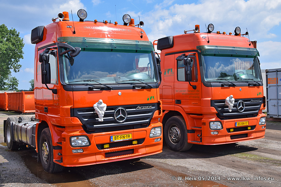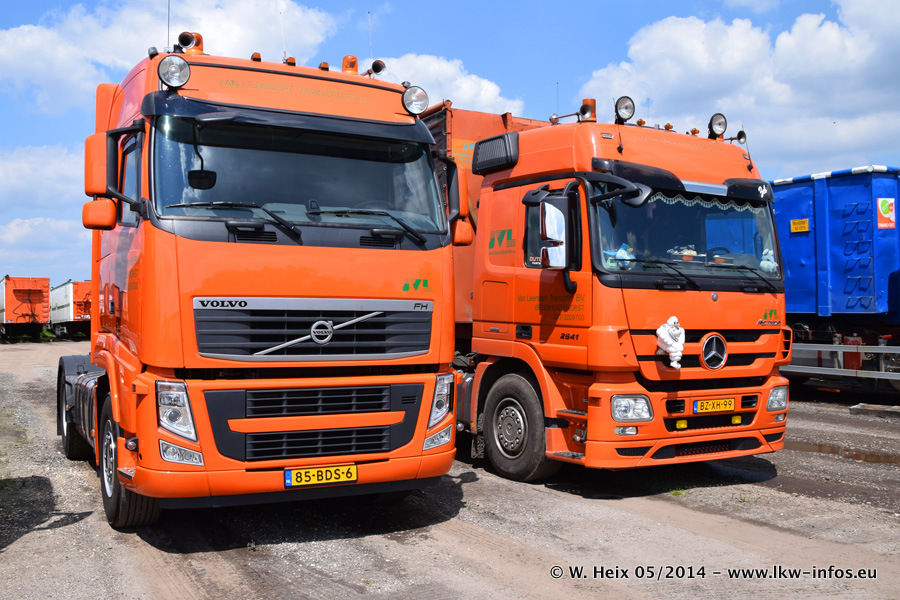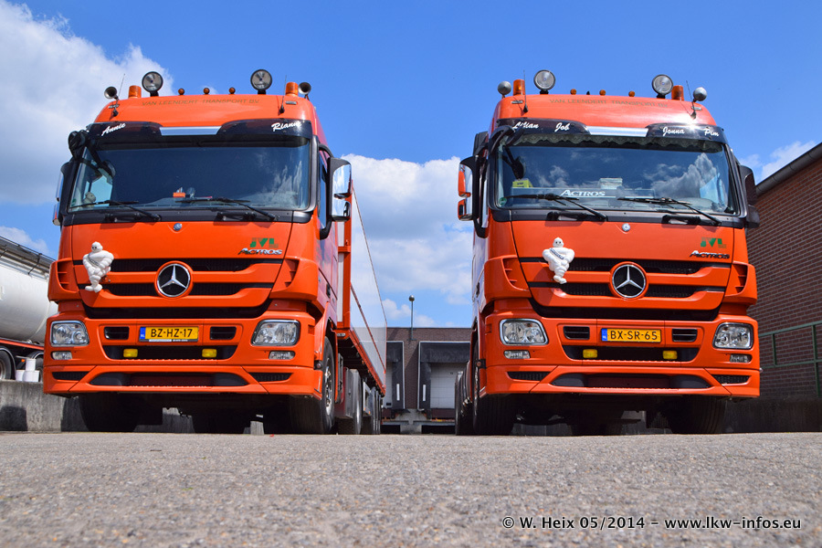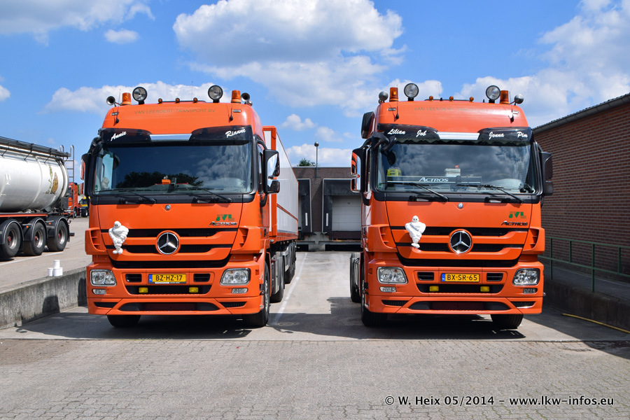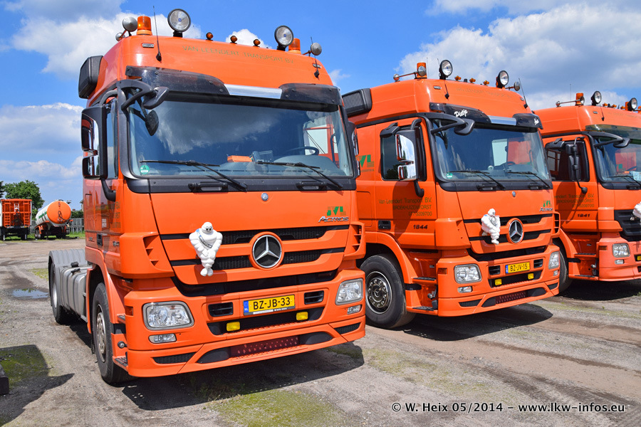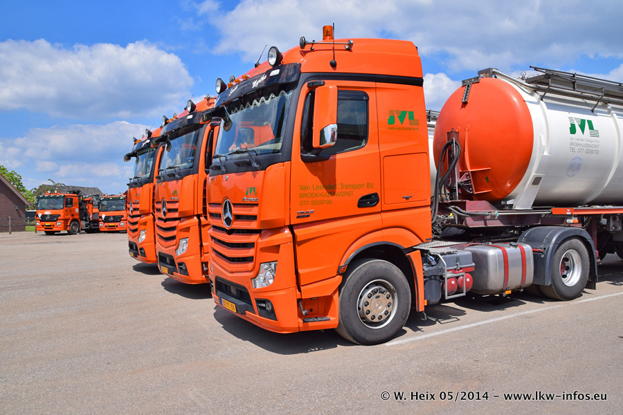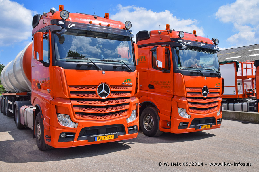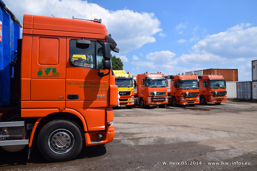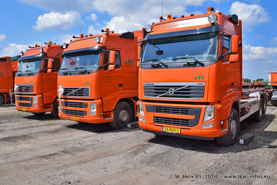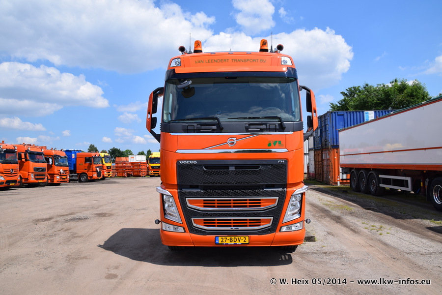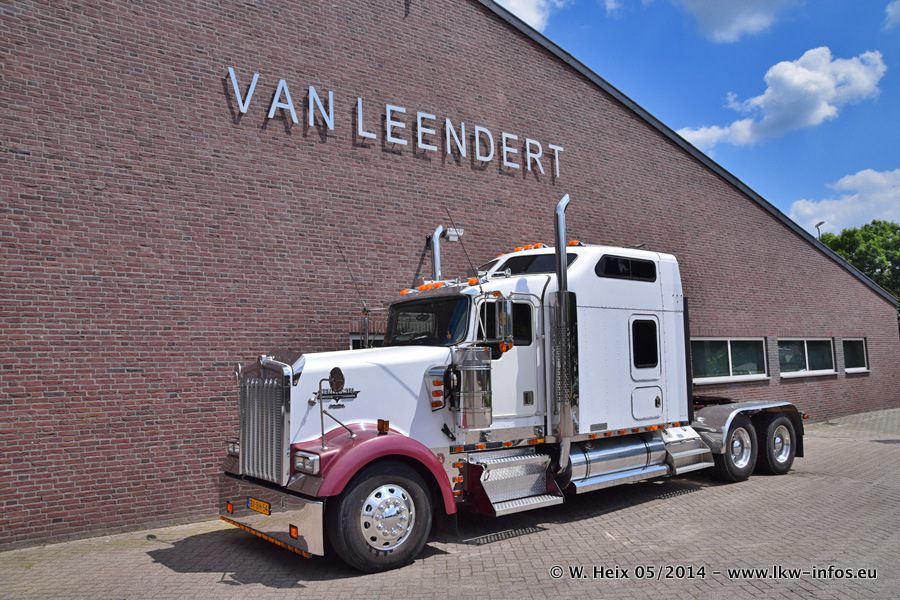 Der Fuhrpark besteht zur Zeit (Ende Mai 2014) aus 42 LKW der Hersteller MAN, Mercedes-Benz, Renault und Volvo. In der Woche vor meinem Besuch hat van Leendert zwei neue Volvo FH Euro 6 bekommen. Es gibt auch einen "Oldtimer", das ist ein Mercedes-Benz NG 2632 6x6. Dies war der erste LKW, den Erik van Leendert nach der Übernahme der Firma von seinem Vater im Jahr 1982 neu gekauft hat. Dieser LKW wird niemals verkauft und wird sogar im Nahverkehr und zum Umsetzen von Containern auf dem Hof verwendet. Der Kenworth W 900 ist Baujahr 2000 und wird nicht im normalen Tagesgeschäft eingesetzt. Nur für diverse Veranstaltungen wie z. B. den jährlichen Truckrun in Horst kommt der US-Truck zum Einsatz.