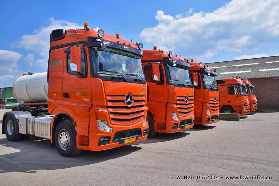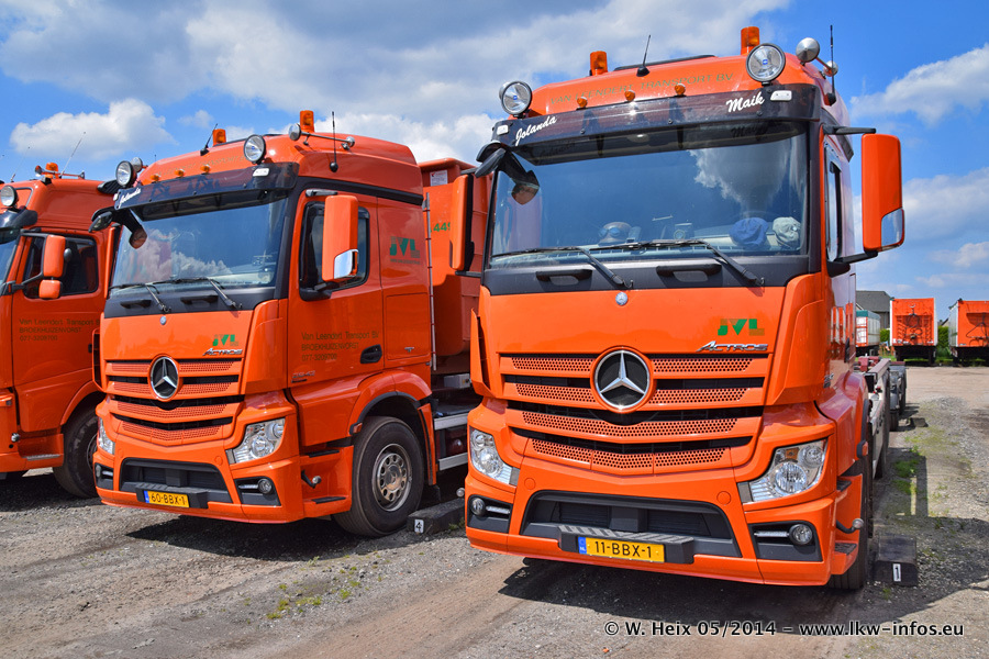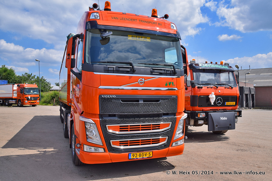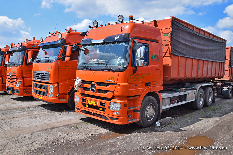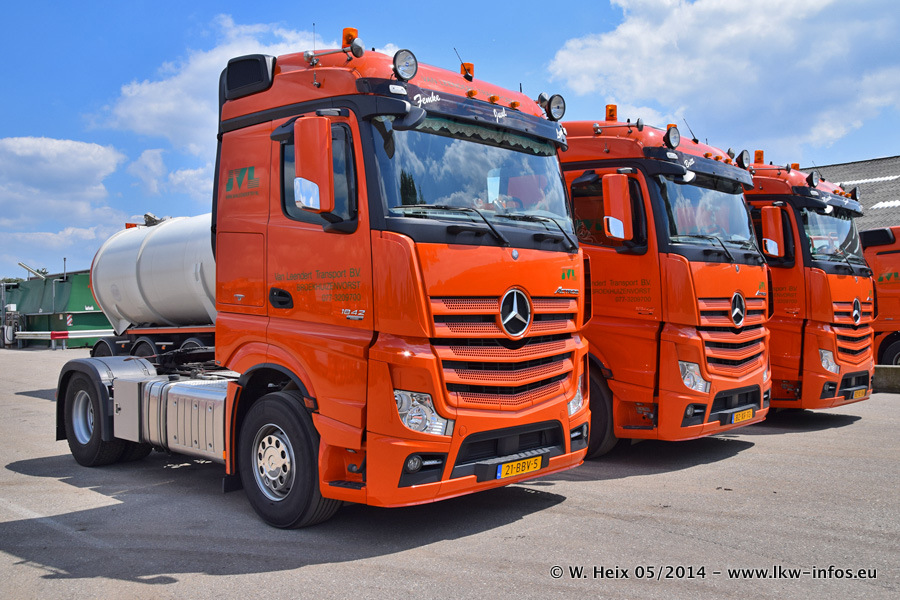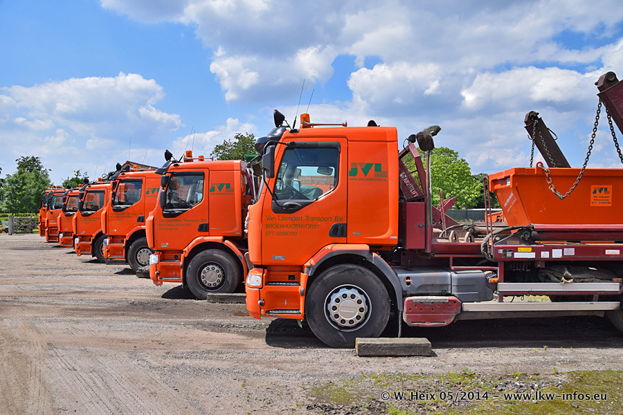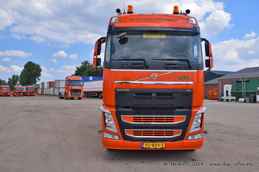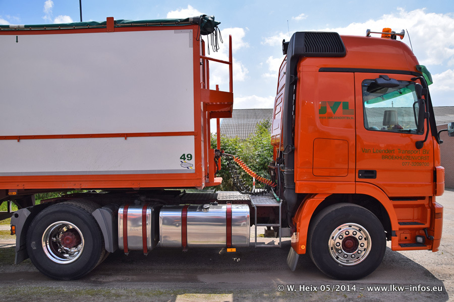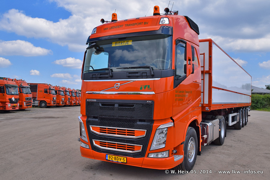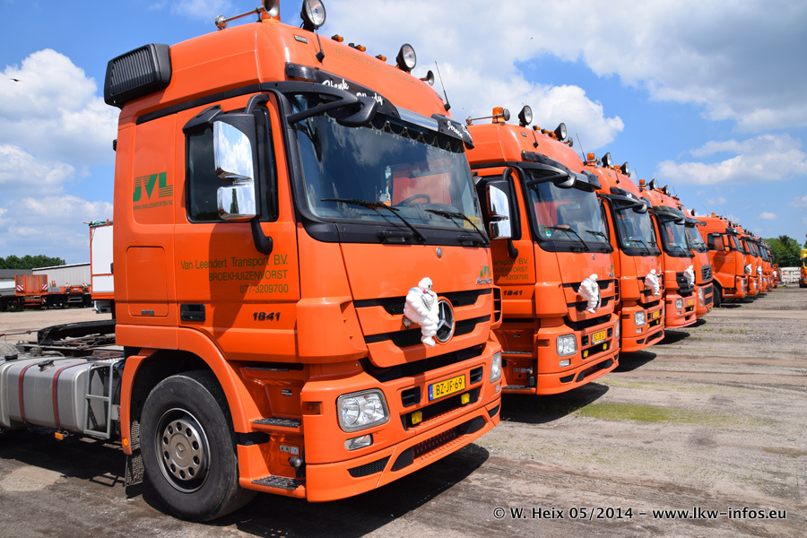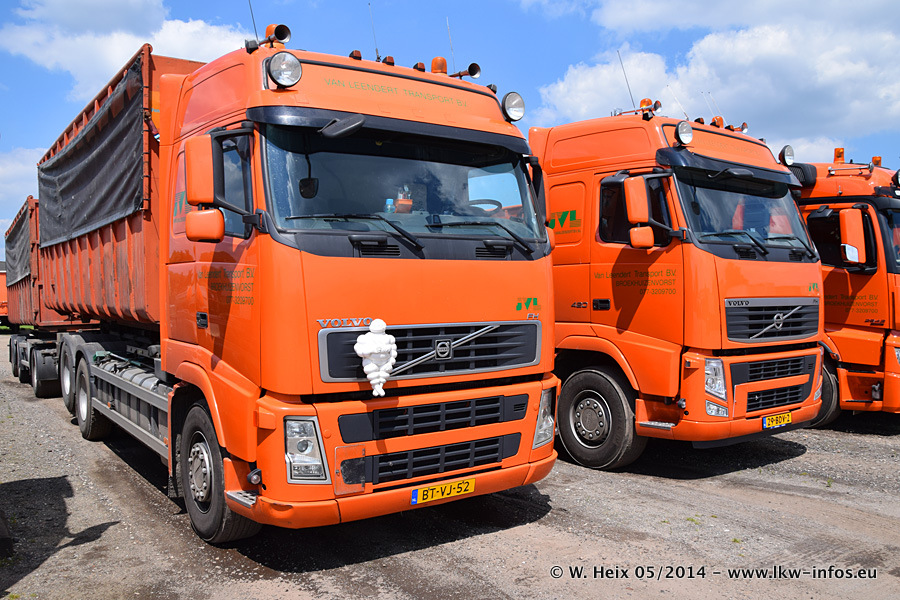 Der Fuhrpark besteht zur Zeit (Ende Mai 2014) aus 42 LKW der Hersteller MAN, Mercedes-Benz, Renault und Volvo. In der Woche vor meinem Besuch hat van Leendert zwei neue Volvo FH Euro 6 bekommen. Es gibt auch einen "Oldtimer", das ist ein Mercedes-Benz NG 2632 6x6. Dies war der erste LKW, den Erik van Leendert nach der Übernahme der Firma von seinem Vater im Jahr 1982 neu gekauft hat. Dieser LKW wird niemals verkauft und wird sogar im Nahverkehr und zum Umsetzen von Containern auf dem Hof verwendet. Der Kenworth W 900 ist Baujahr 2000 und wird nicht im normalen Tagesgeschäft eingesetzt. Nur für diverse Veranstaltungen wie z. B. den jährlichen Truckrun in Horst kommt der US-Truck zum Einsatz.