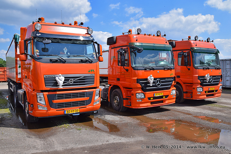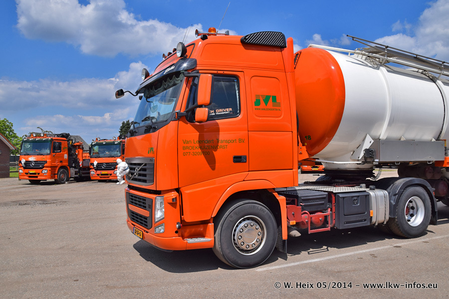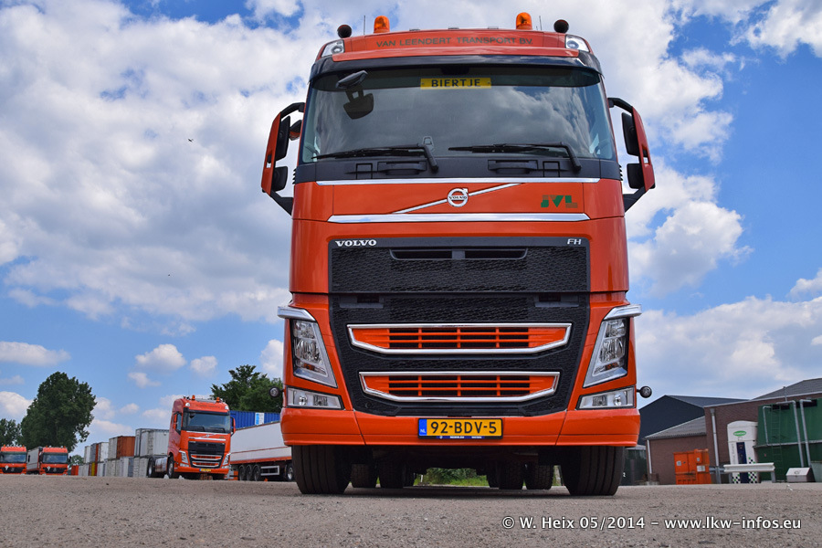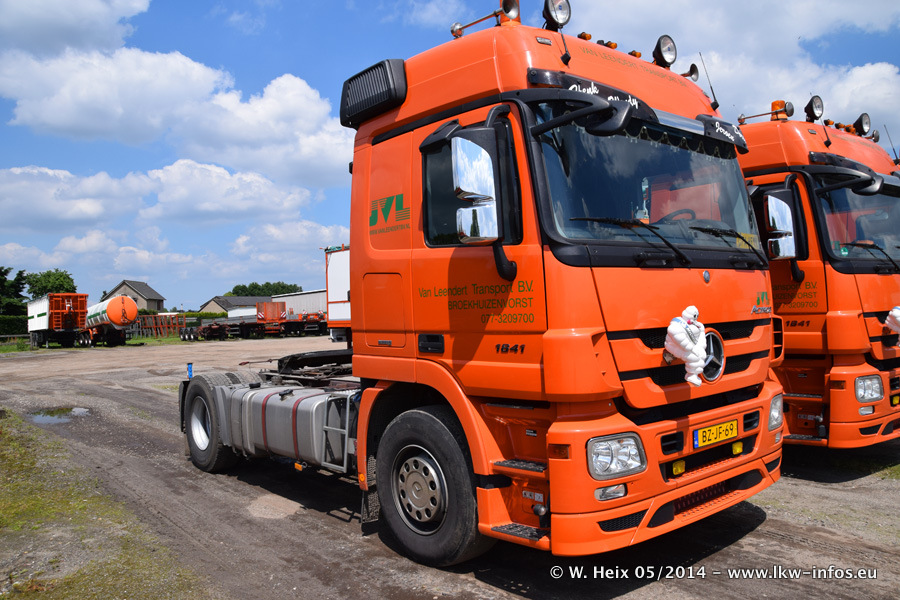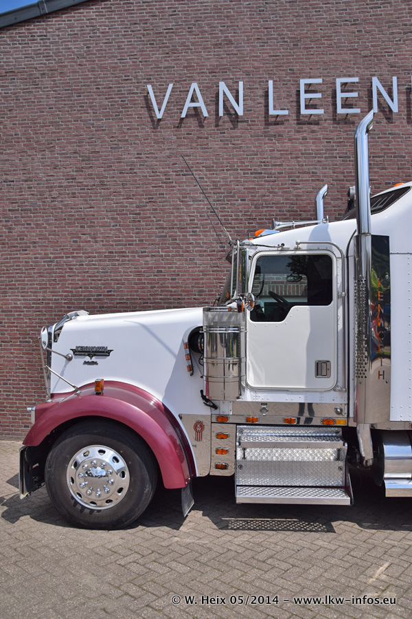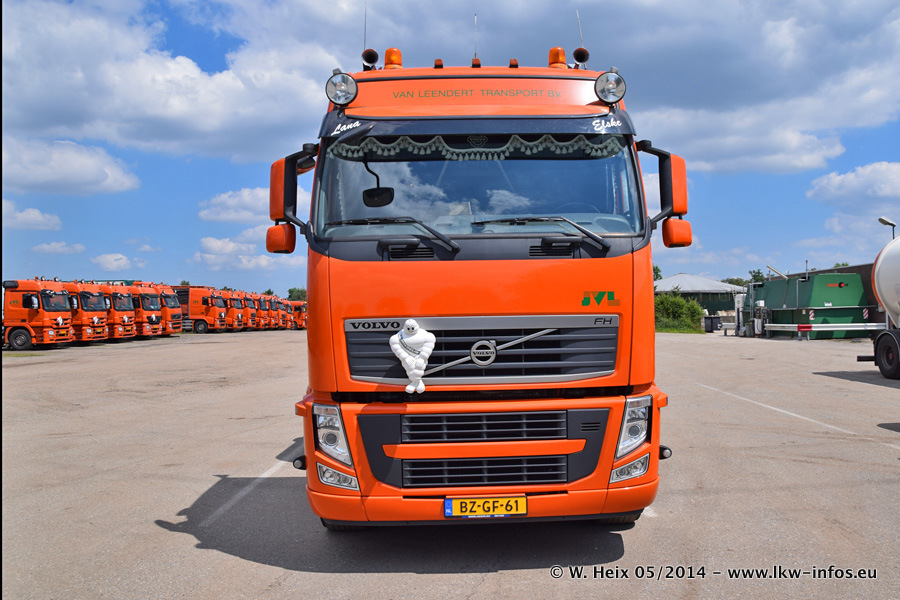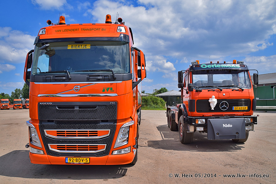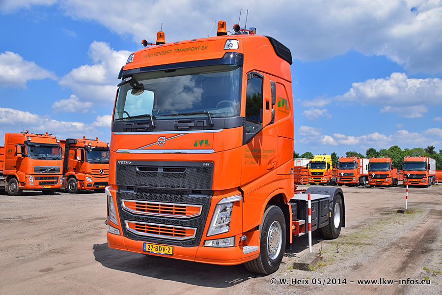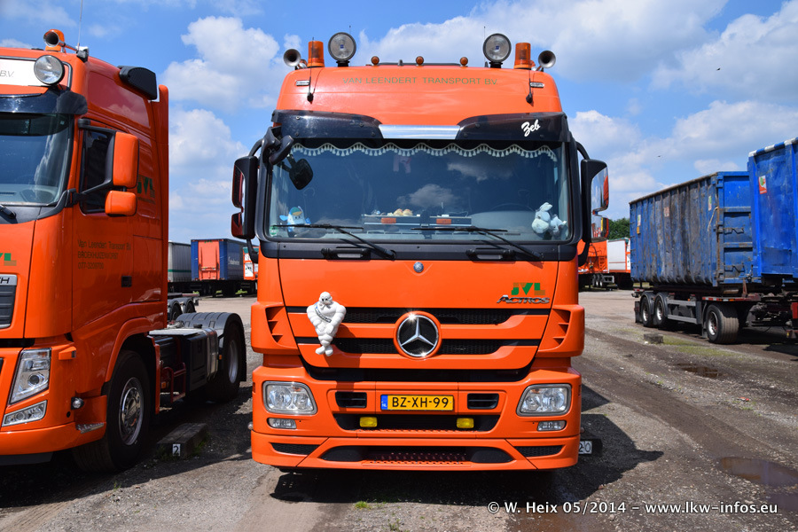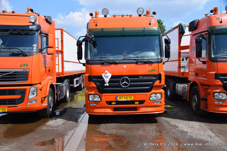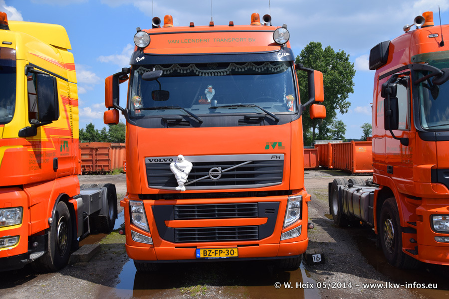 Der Fuhrpark besteht zur Zeit (Ende Mai 2014) aus 42 LKW der Hersteller MAN, Mercedes-Benz, Renault und Volvo. In der Woche vor meinem Besuch hat van Leendert zwei neue Volvo FH Euro 6 bekommen. Es gibt auch einen "Oldtimer", das ist ein Mercedes-Benz NG 2632 6x6. Dies war der erste LKW, den Erik van Leendert nach der Übernahme der Firma von seinem Vater im Jahr 1982 neu gekauft hat. Dieser LKW wird niemals verkauft und wird sogar im Nahverkehr und zum Umsetzen von Containern auf dem Hof verwendet. Der Kenworth W 900 ist Baujahr 2000 und wird nicht im normalen Tagesgeschäft eingesetzt. Nur für diverse Veranstaltungen wie z. B. den jährlichen Truckrun in Horst kommt der US-Truck zum Einsatz.