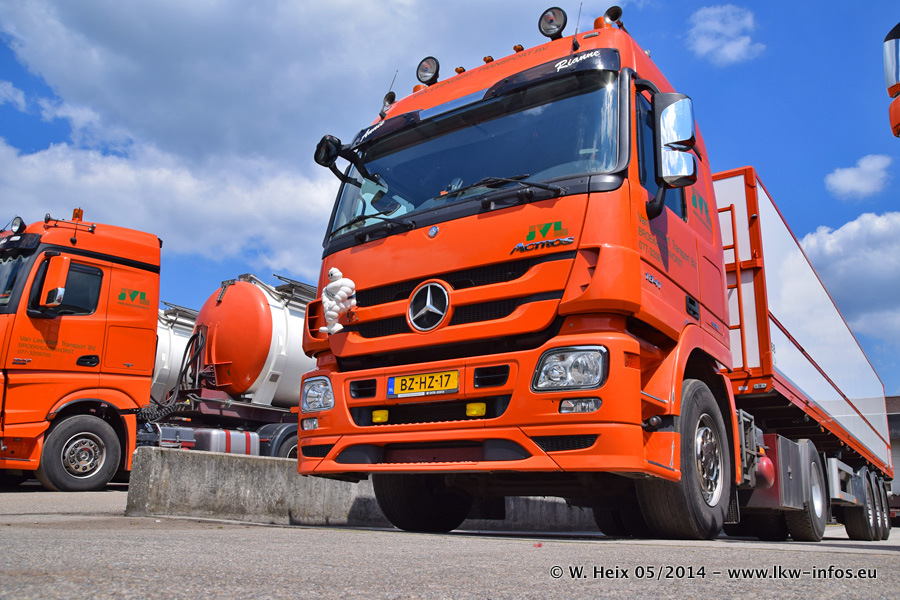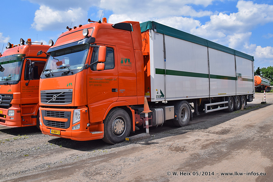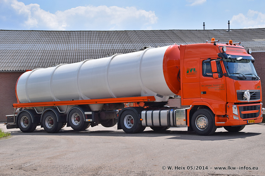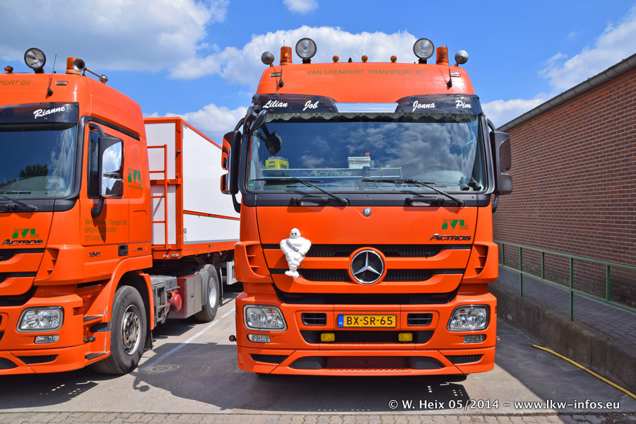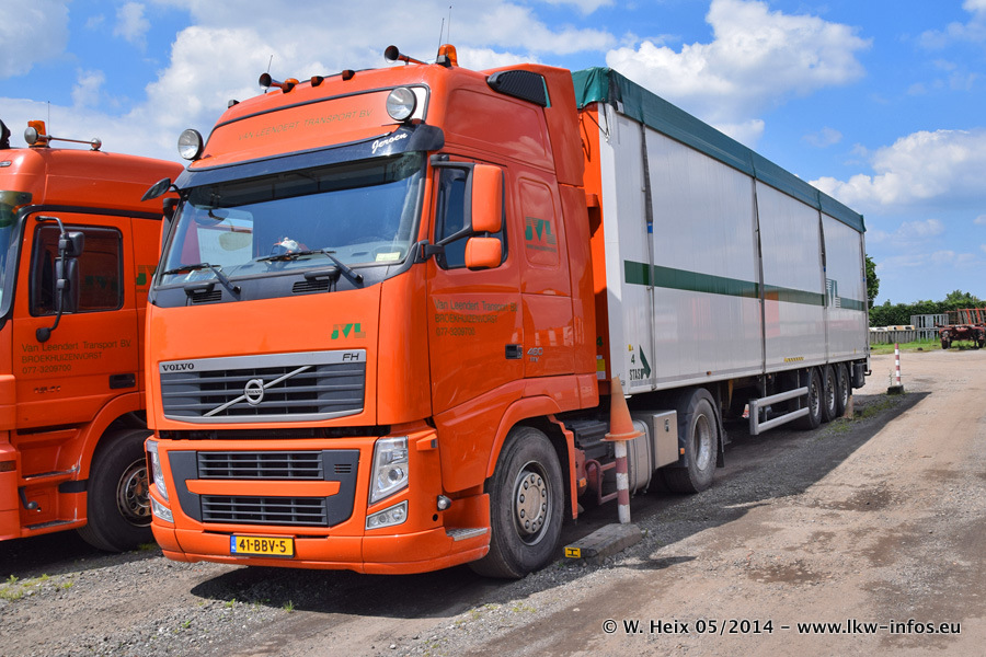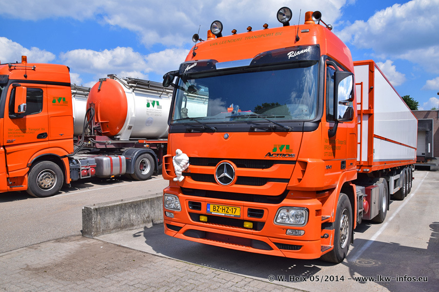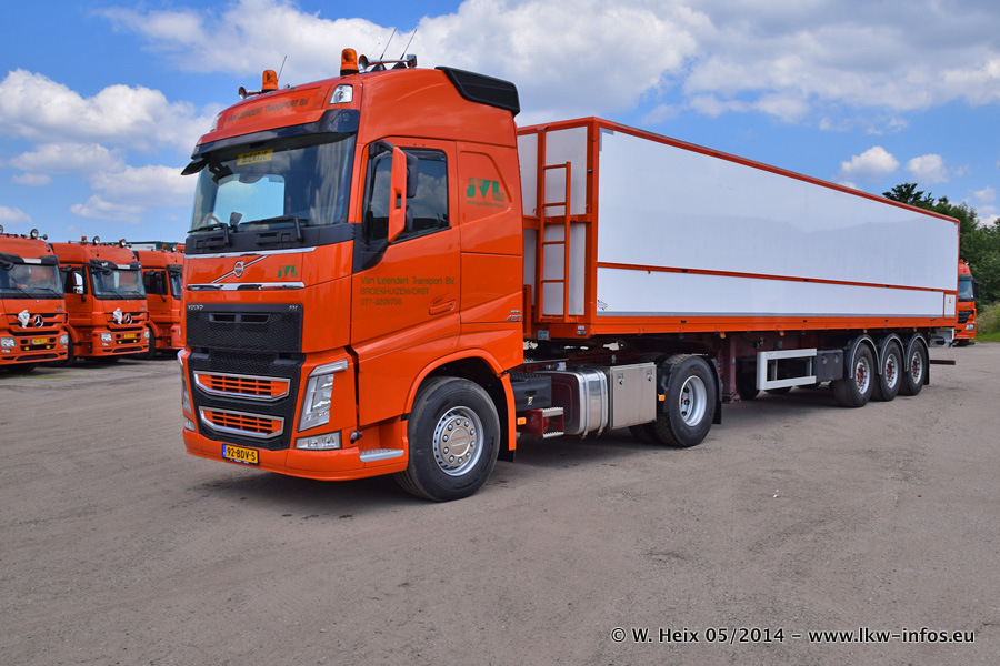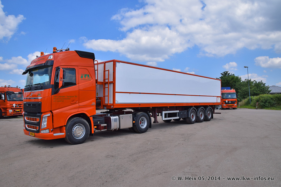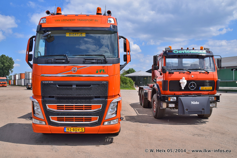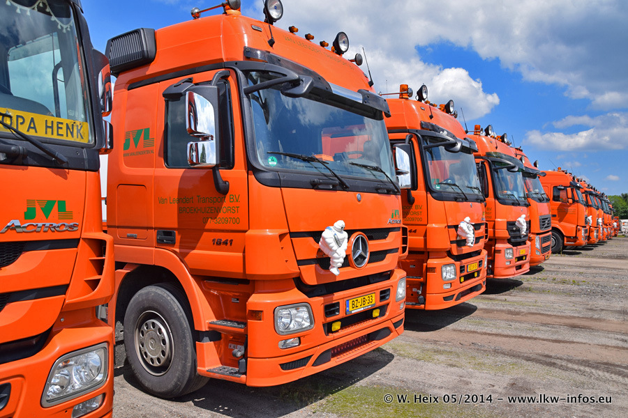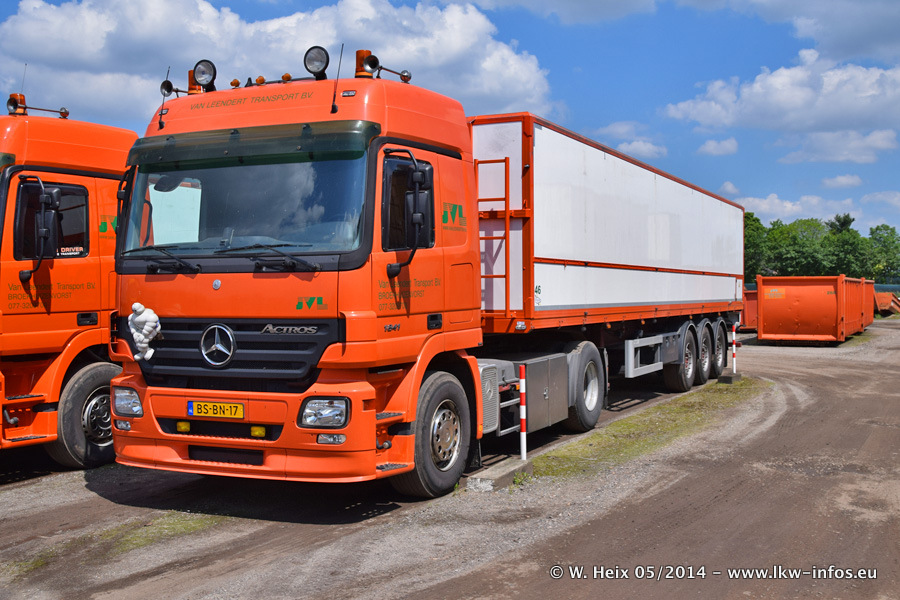 Der Fuhrpark besteht zur Zeit (Ende Mai 2014) aus 42 LKW der Hersteller MAN, Mercedes-Benz, Renault und Volvo. In der Woche vor meinem Besuch hat van Leendert zwei neue Volvo FH Euro 6 bekommen. Es gibt auch einen "Oldtimer", das ist ein Mercedes-Benz NG 2632 6x6. Dies war der erste LKW, den Erik van Leendert nach der Übernahme der Firma von seinem Vater im Jahr 1982 neu gekauft hat. Dieser LKW wird niemals verkauft und wird sogar im Nahverkehr und zum Umsetzen von Containern auf dem Hof verwendet. Der Kenworth W 900 ist Baujahr 2000 und wird nicht im normalen Tagesgeschäft eingesetzt. Nur für diverse Veranstaltungen wie z. B. den jährlichen Truckrun in Horst kommt der US-Truck zum Einsatz.