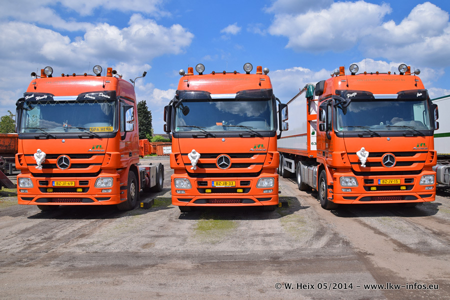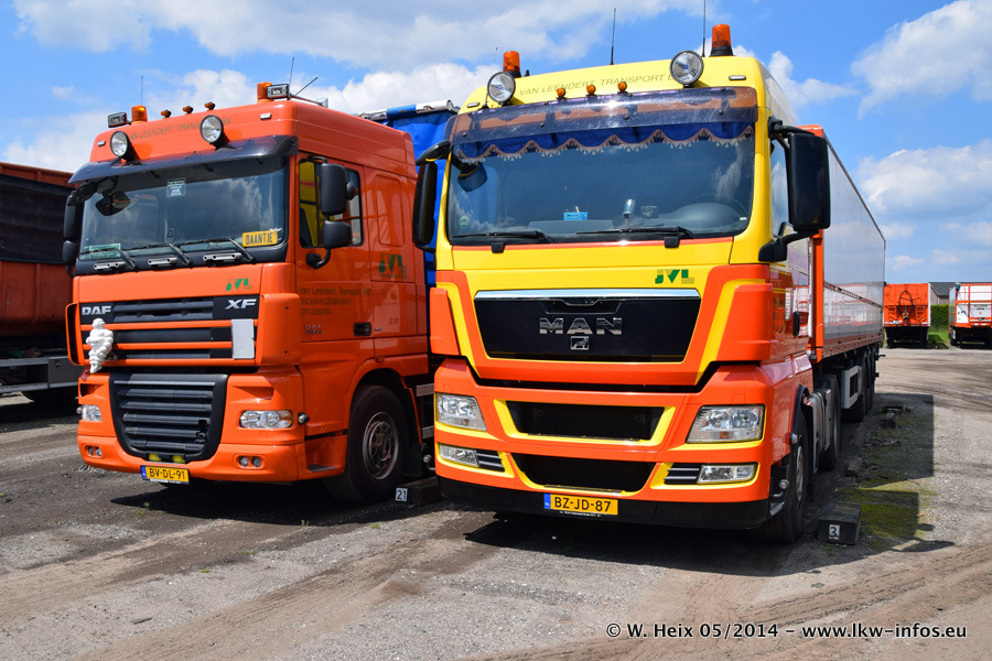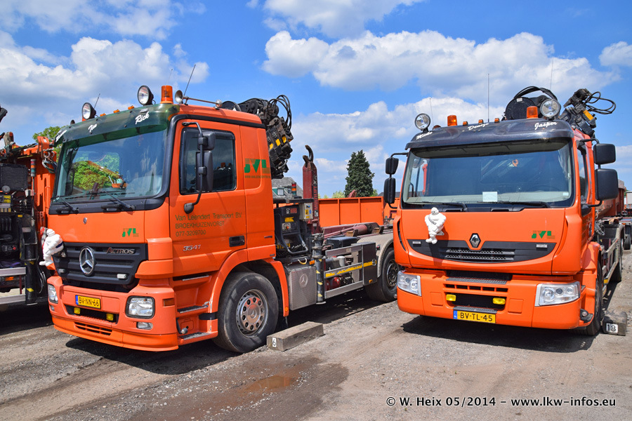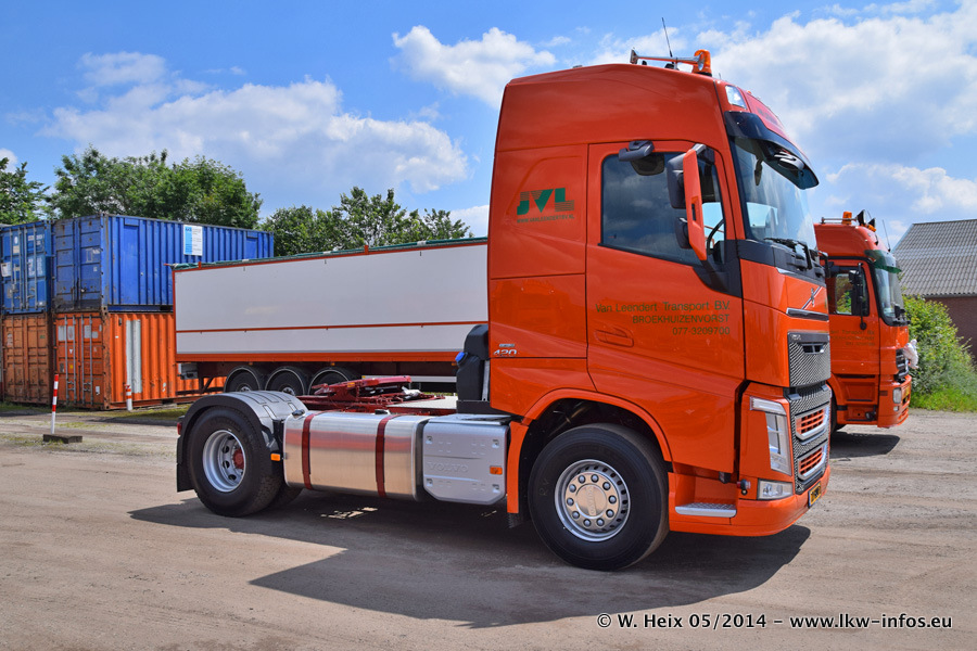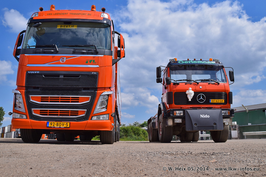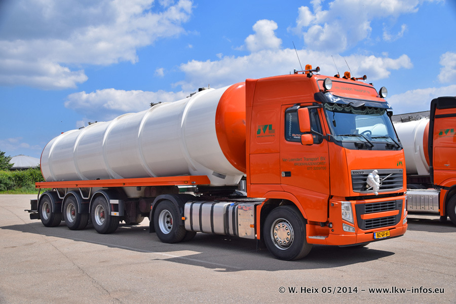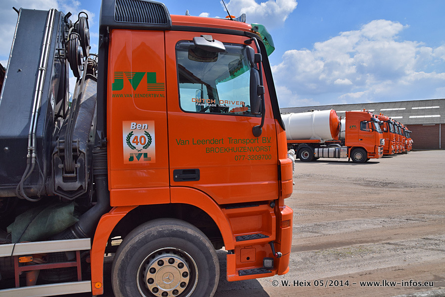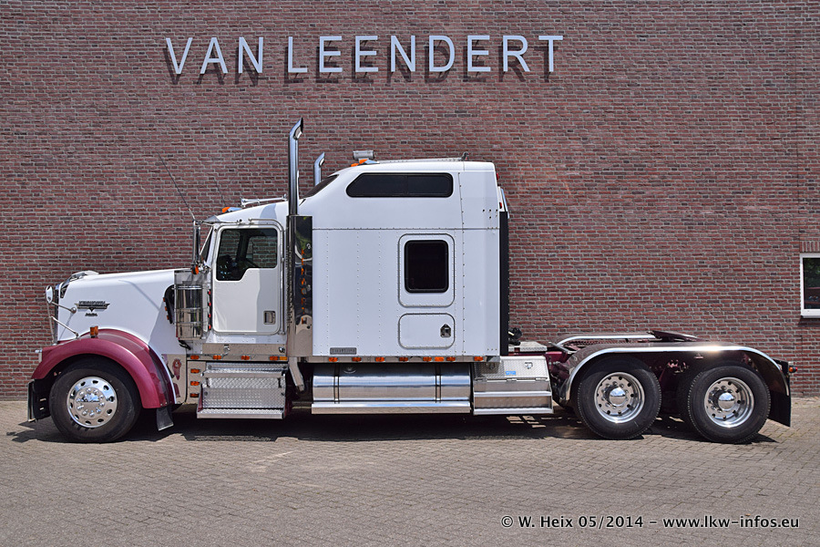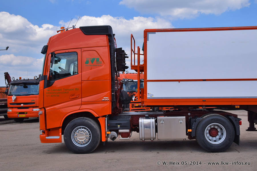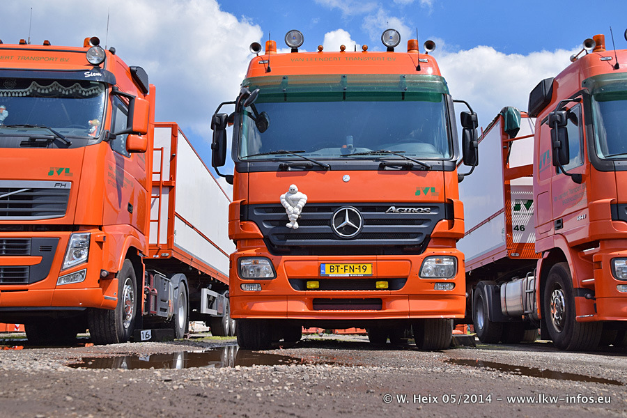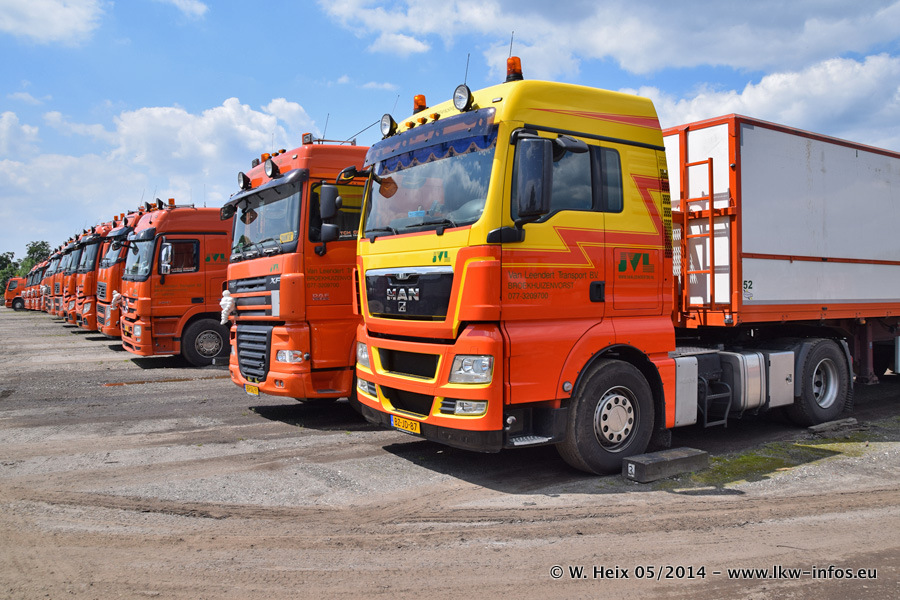 Der Fuhrpark besteht zur Zeit (Ende Mai 2014) aus 42 LKW der Hersteller MAN, Mercedes-Benz, Renault und Volvo. In der Woche vor meinem Besuch hat van Leendert zwei neue Volvo FH Euro 6 bekommen. Es gibt auch einen "Oldtimer", das ist ein Mercedes-Benz NG 2632 6x6. Dies war der erste LKW, den Erik van Leendert nach der Übernahme der Firma von seinem Vater im Jahr 1982 neu gekauft hat. Dieser LKW wird niemals verkauft und wird sogar im Nahverkehr und zum Umsetzen von Containern auf dem Hof verwendet. Der Kenworth W 900 ist Baujahr 2000 und wird nicht im normalen Tagesgeschäft eingesetzt. Nur für diverse Veranstaltungen wie z. B. den jährlichen Truckrun in Horst kommt der US-Truck zum Einsatz.