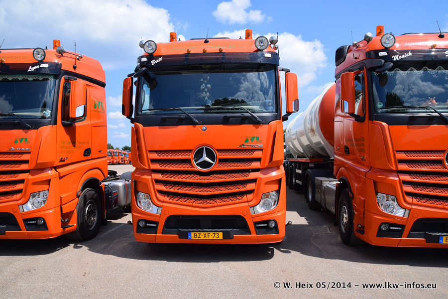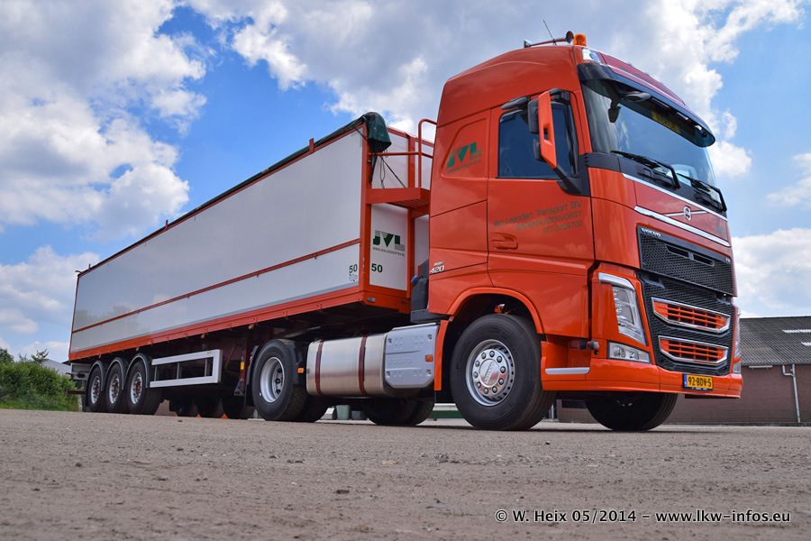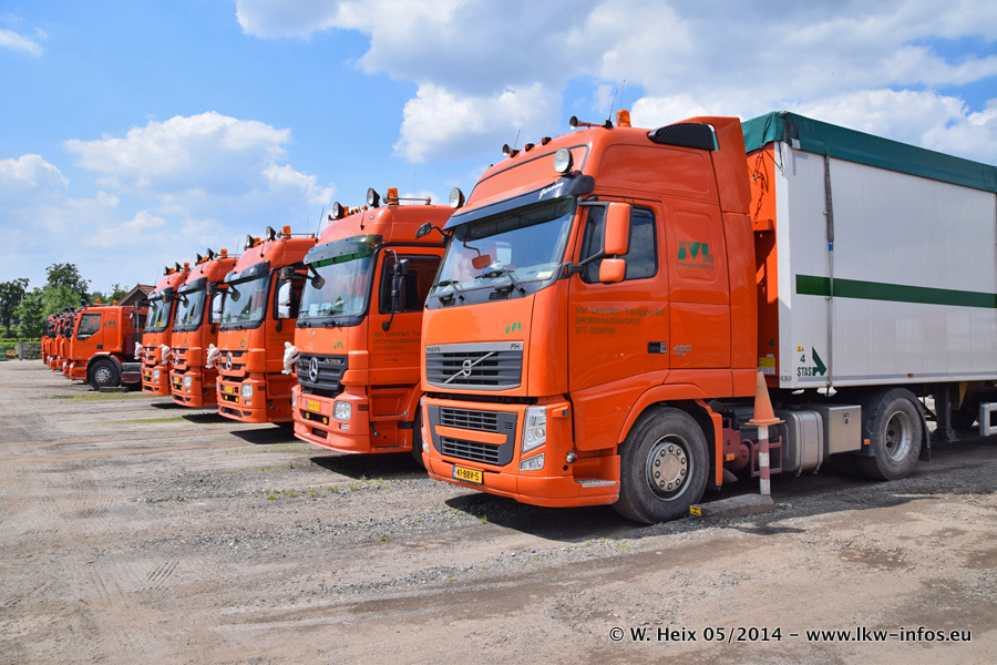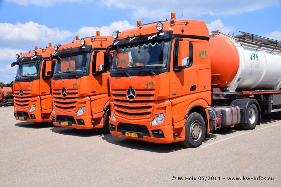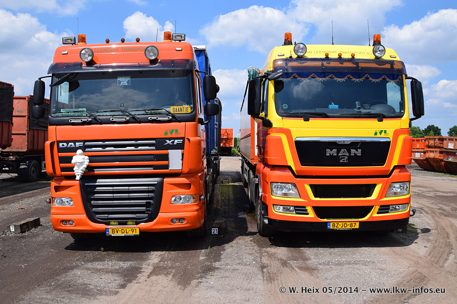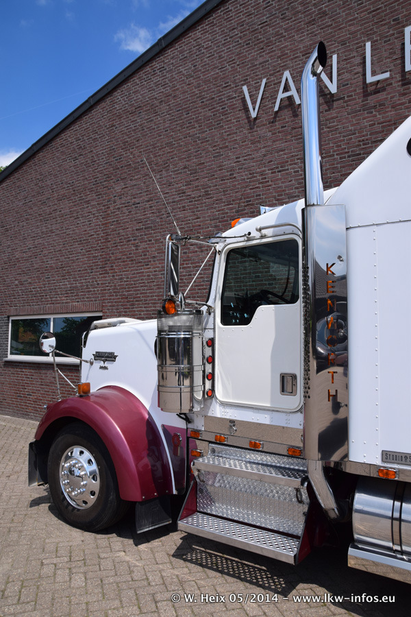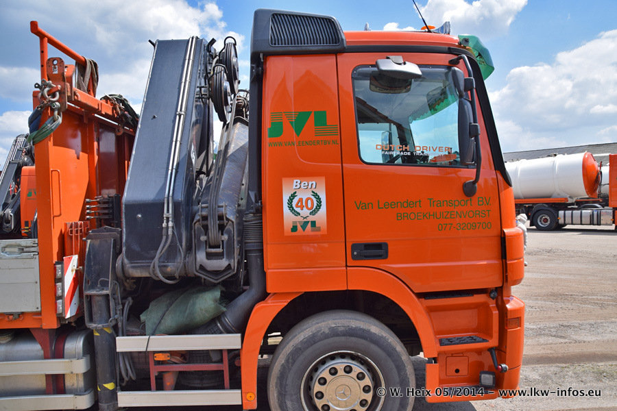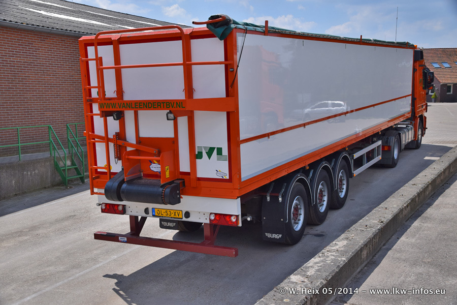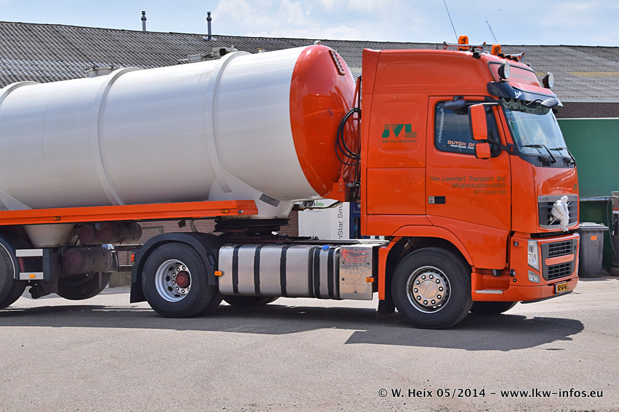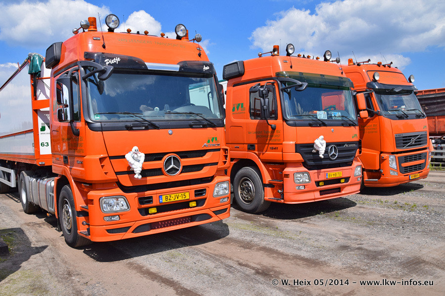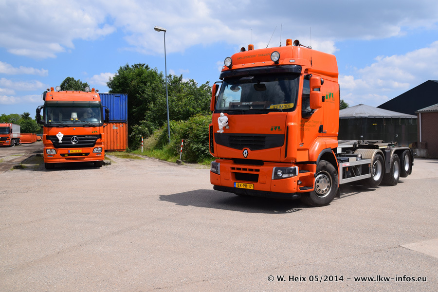 Der Fuhrpark besteht zur Zeit (Ende Mai 2014) aus 42 LKW der Hersteller MAN, Mercedes-Benz, Renault und Volvo. In der Woche vor meinem Besuch hat van Leendert zwei neue Volvo FH Euro 6 bekommen. Es gibt auch einen "Oldtimer", das ist ein Mercedes-Benz NG 2632 6x6. Dies war der erste LKW, den Erik van Leendert nach der Übernahme der Firma von seinem Vater im Jahr 1982 neu gekauft hat. Dieser LKW wird niemals verkauft und wird sogar im Nahverkehr und zum Umsetzen von Containern auf dem Hof verwendet. Der Kenworth W 900 ist Baujahr 2000 und wird nicht im normalen Tagesgeschäft eingesetzt. Nur für diverse Veranstaltungen wie z. B. den jährlichen Truckrun in Horst kommt der US-Truck zum Einsatz.