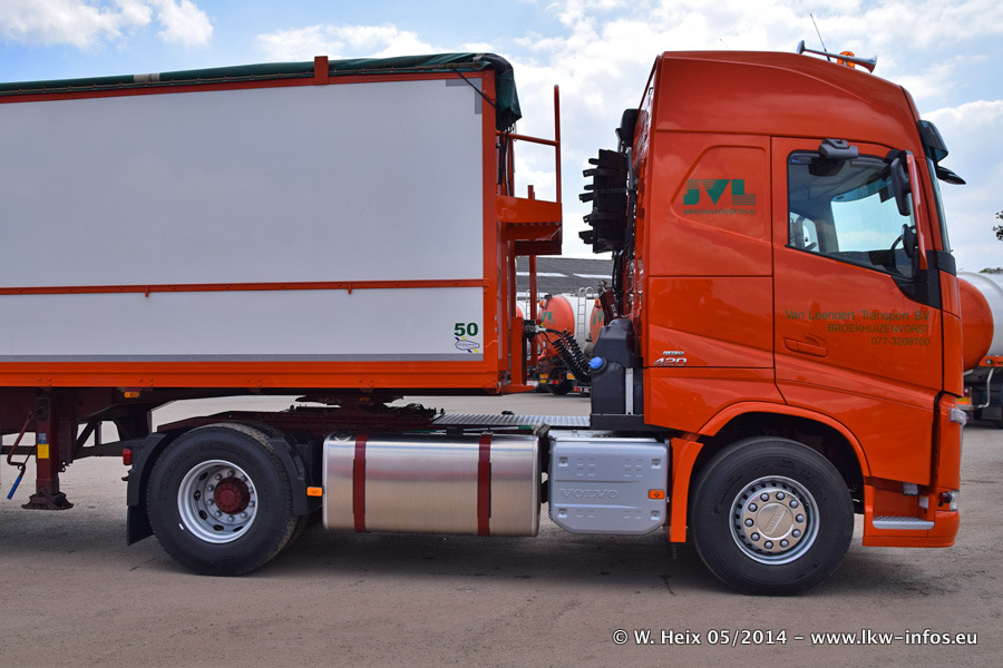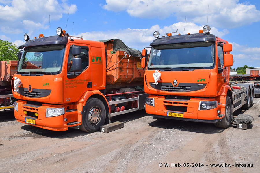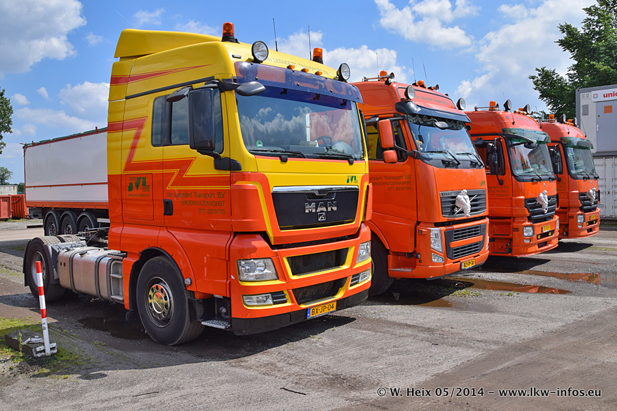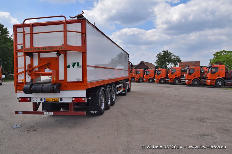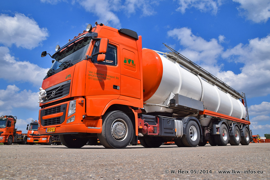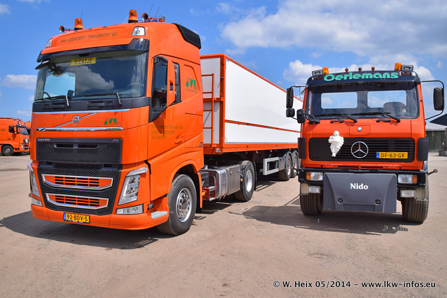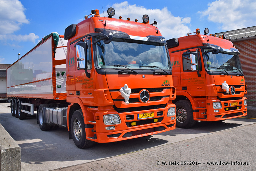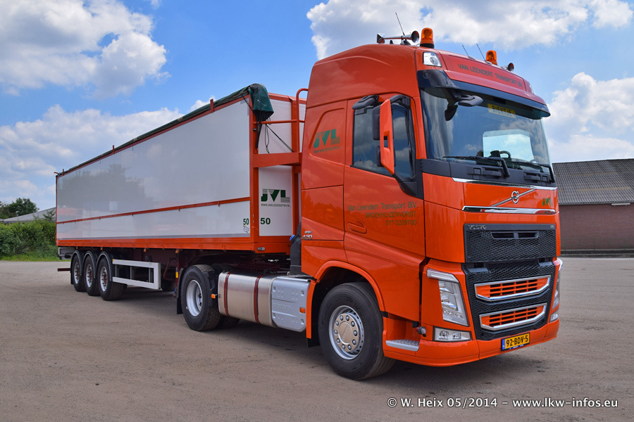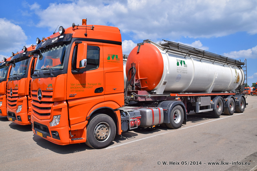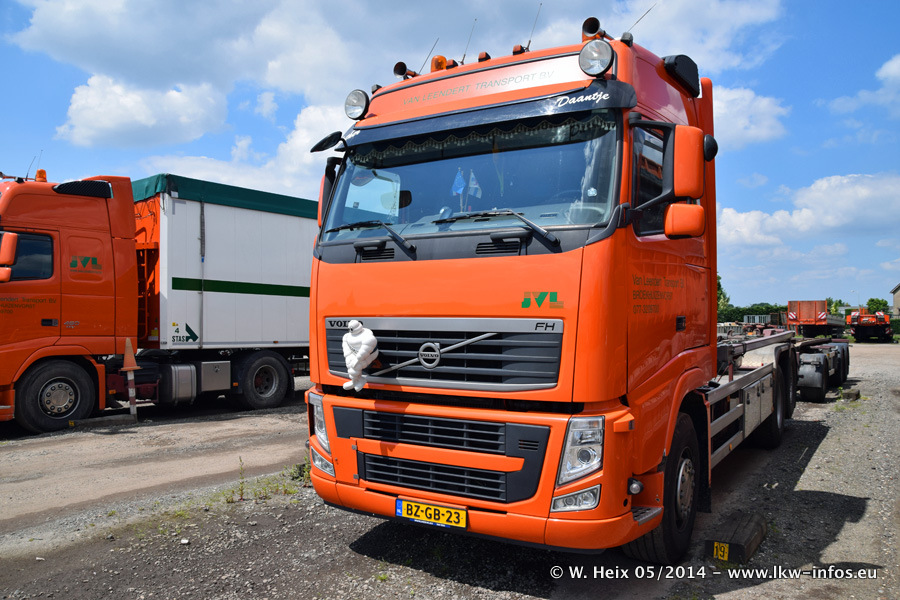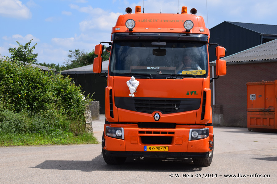 Der Fuhrpark besteht zur Zeit (Ende Mai 2014) aus 42 LKW der Hersteller MAN, Mercedes-Benz, Renault und Volvo. In der Woche vor meinem Besuch hat van Leendert zwei neue Volvo FH Euro 6 bekommen. Es gibt auch einen "Oldtimer", das ist ein Mercedes-Benz NG 2632 6x6. Dies war der erste LKW, den Erik van Leendert nach der Übernahme der Firma von seinem Vater im Jahr 1982 neu gekauft hat. Dieser LKW wird niemals verkauft und wird sogar im Nahverkehr und zum Umsetzen von Containern auf dem Hof verwendet. Der Kenworth W 900 ist Baujahr 2000 und wird nicht im normalen Tagesgeschäft eingesetzt. Nur für diverse Veranstaltungen wie z. B. den jährlichen Truckrun in Horst kommt der US-Truck zum Einsatz.