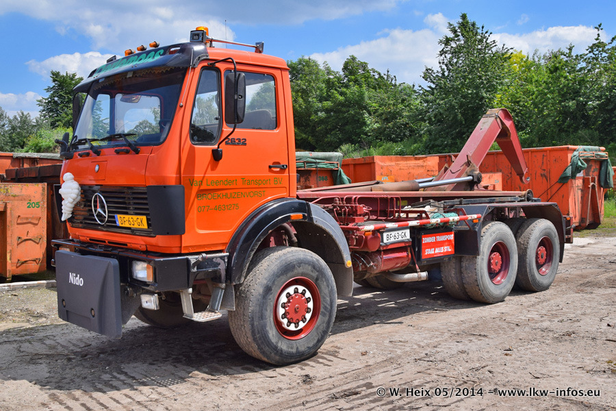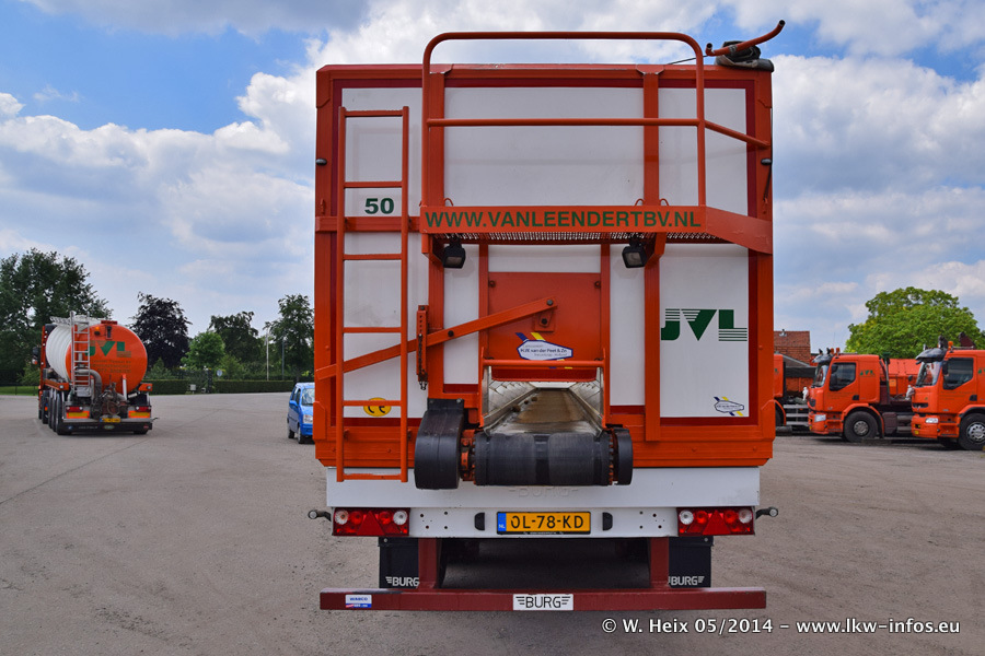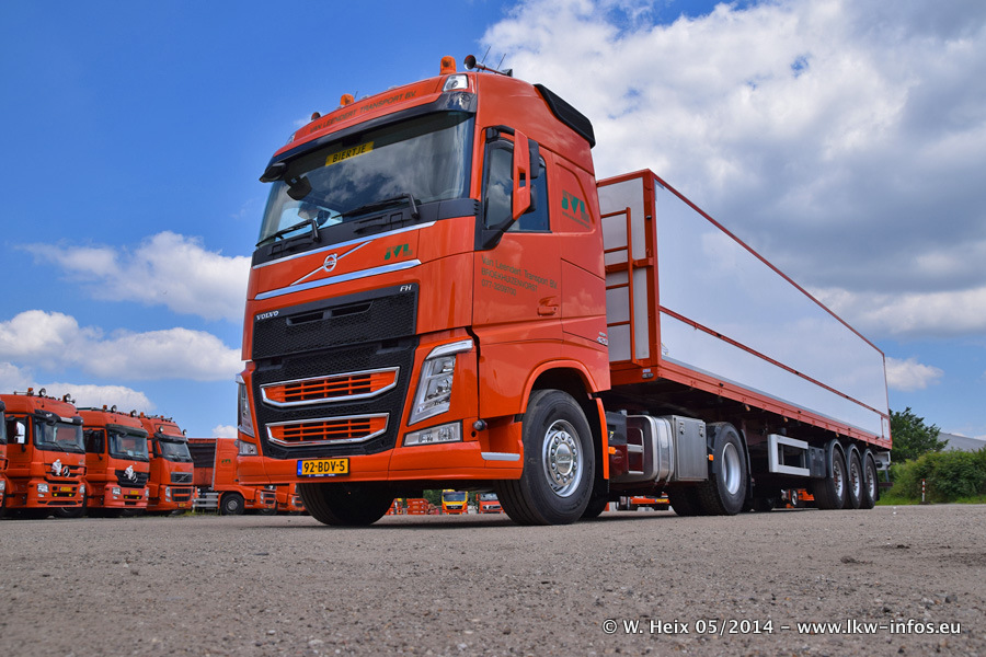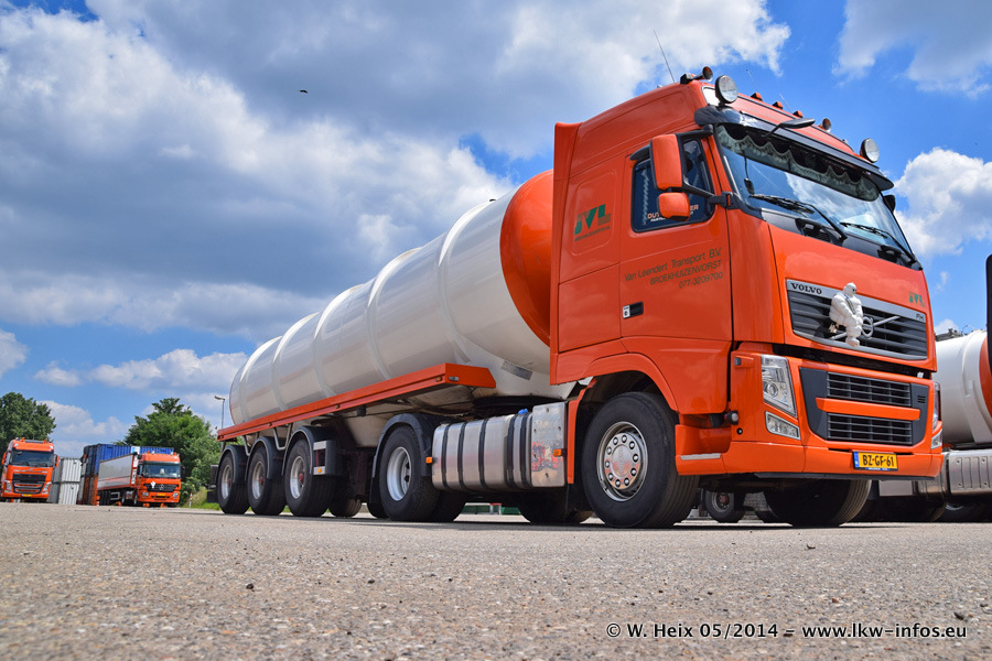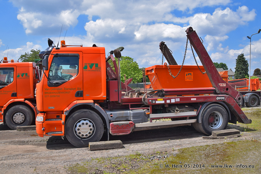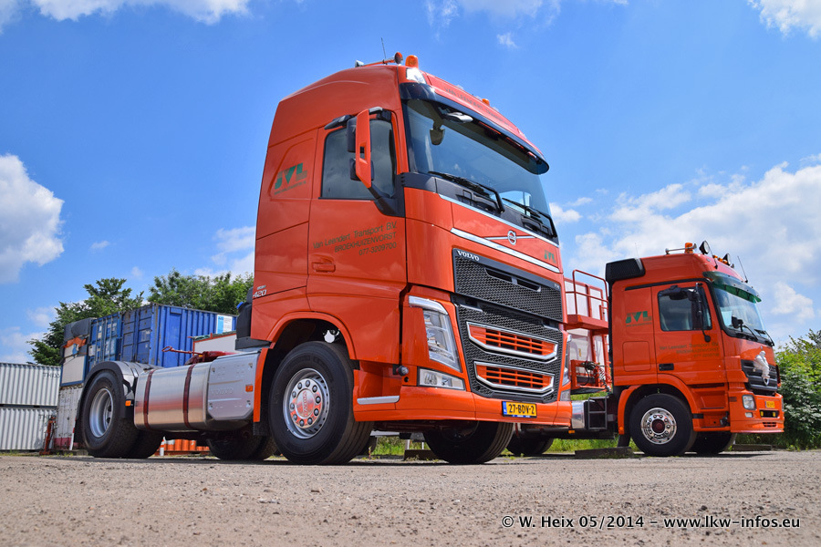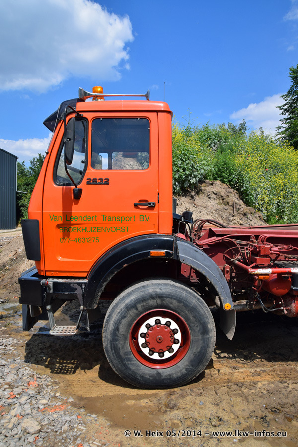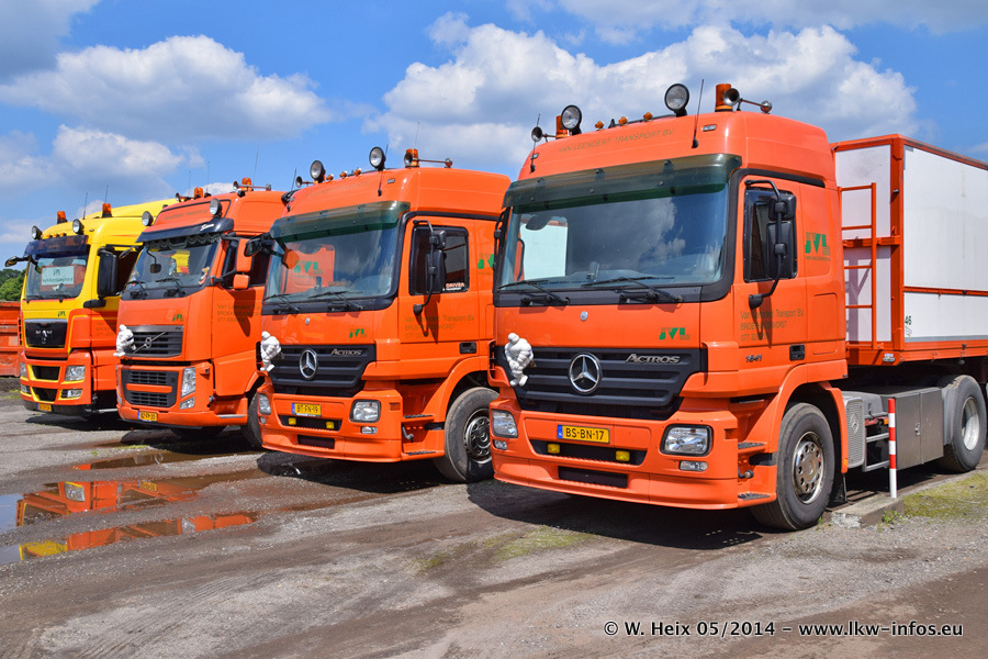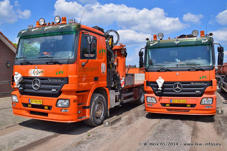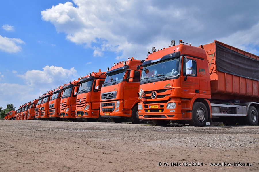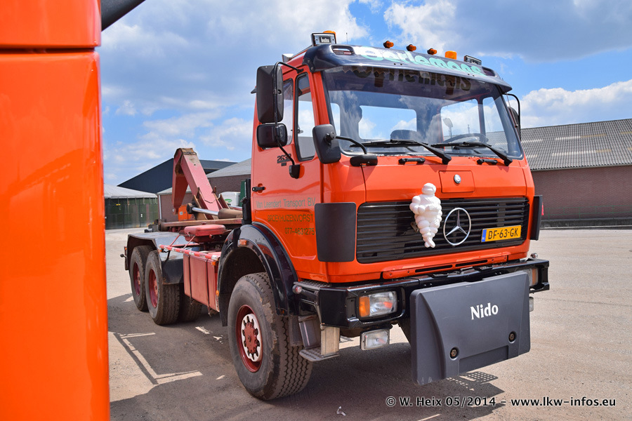 Der Fuhrpark besteht zur Zeit (Ende Mai 2014) aus 42 LKW der Hersteller MAN, Mercedes-Benz, Renault und Volvo. In der Woche vor meinem Besuch hat van Leendert zwei neue Volvo FH Euro 6 bekommen. Es gibt auch einen "Oldtimer", das ist ein Mercedes-Benz NG 2632 6x6. Dies war der erste LKW, den Erik van Leendert nach der Übernahme der Firma von seinem Vater im Jahr 1982 neu gekauft hat. Dieser LKW wird niemals verkauft und wird sogar im Nahverkehr und zum Umsetzen von Containern auf dem Hof verwendet. Der Kenworth W 900 ist Baujahr 2000 und wird nicht im normalen Tagesgeschäft eingesetzt. Nur für diverse Veranstaltungen wie z. B. den jährlichen Truckrun in Horst kommt der US-Truck zum Einsatz.