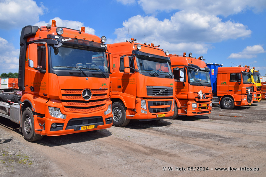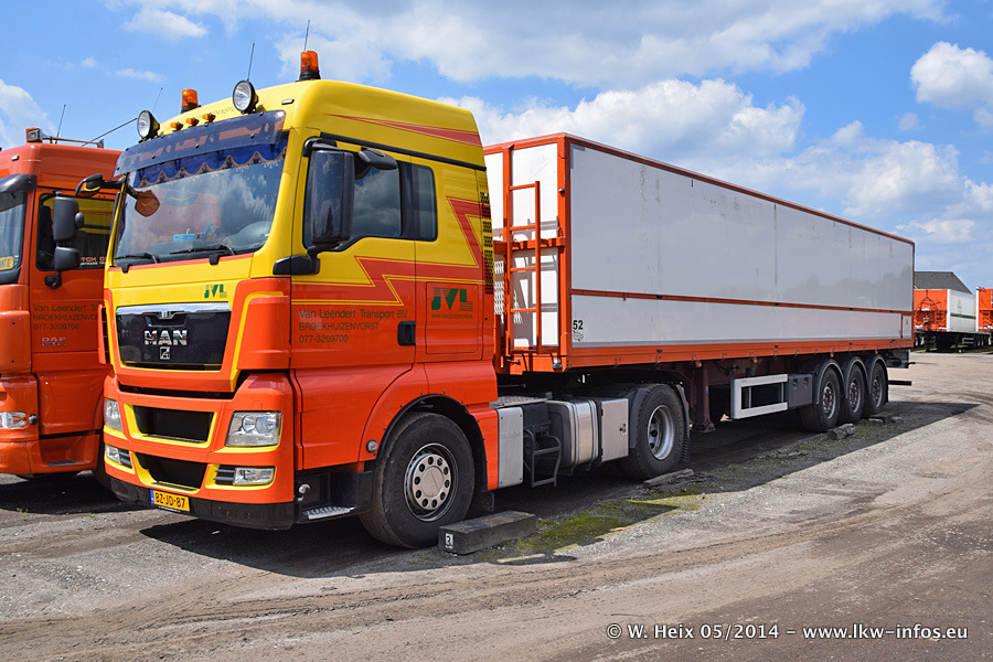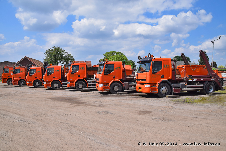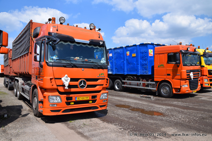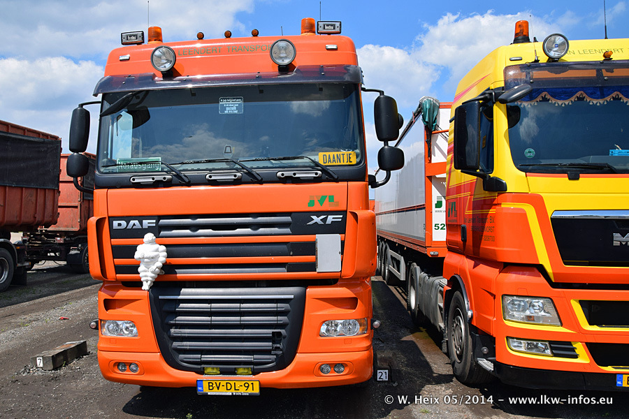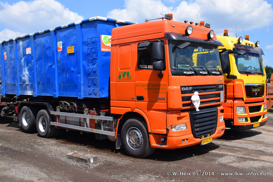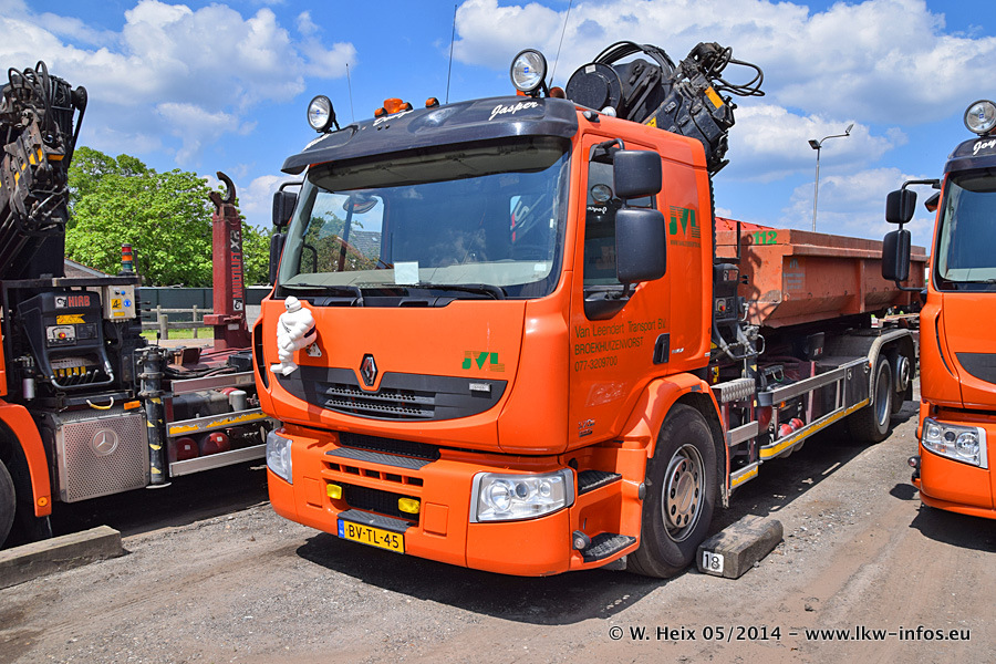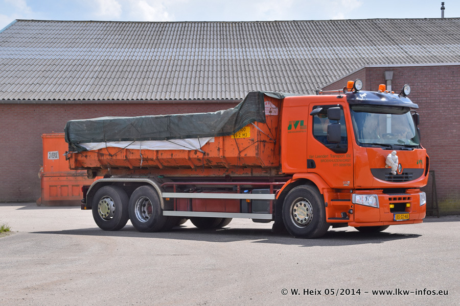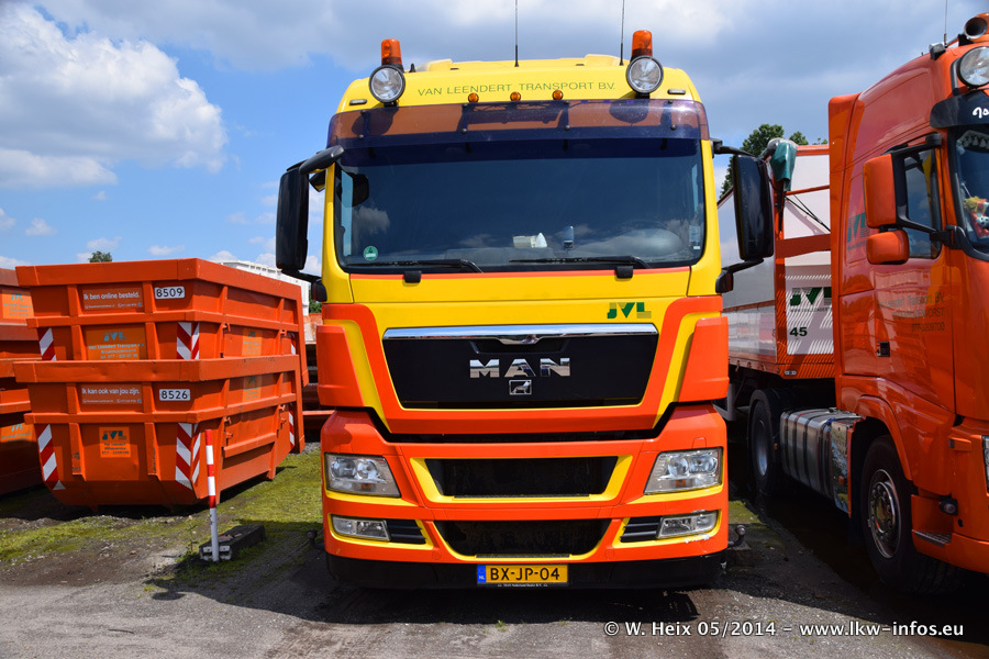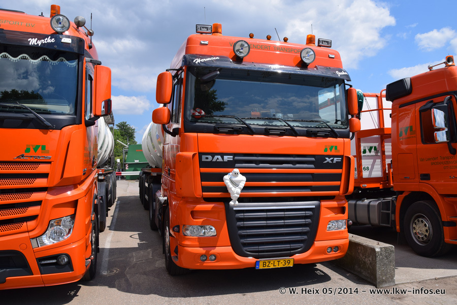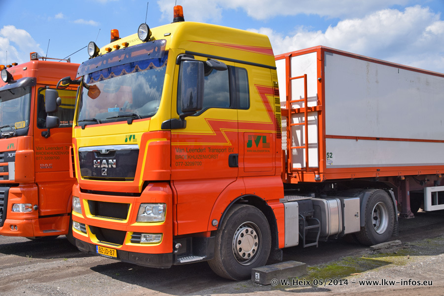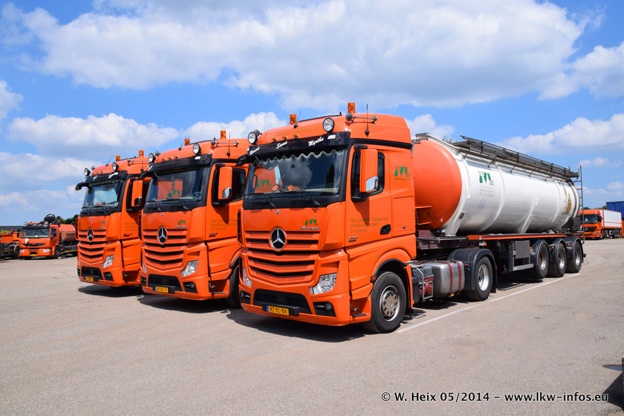 Der Fuhrpark besteht zur Zeit (Ende Mai 2014) aus 42 LKW der Hersteller MAN, Mercedes-Benz, Renault und Volvo. In der Woche vor meinem Besuch hat van Leendert zwei neue Volvo FH Euro 6 bekommen. Es gibt auch einen "Oldtimer", das ist ein Mercedes-Benz NG 2632 6x6. Dies war der erste LKW, den Erik van Leendert nach der Übernahme der Firma von seinem Vater im Jahr 1982 neu gekauft hat. Dieser LKW wird niemals verkauft und wird sogar im Nahverkehr und zum Umsetzen von Containern auf dem Hof verwendet. Der Kenworth W 900 ist Baujahr 2000 und wird nicht im normalen Tagesgeschäft eingesetzt. Nur für diverse Veranstaltungen wie z. B. den jährlichen Truckrun in Horst kommt der US-Truck zum Einsatz.