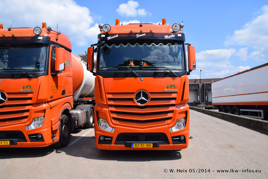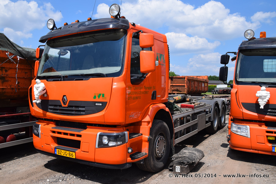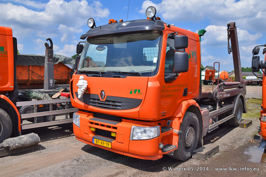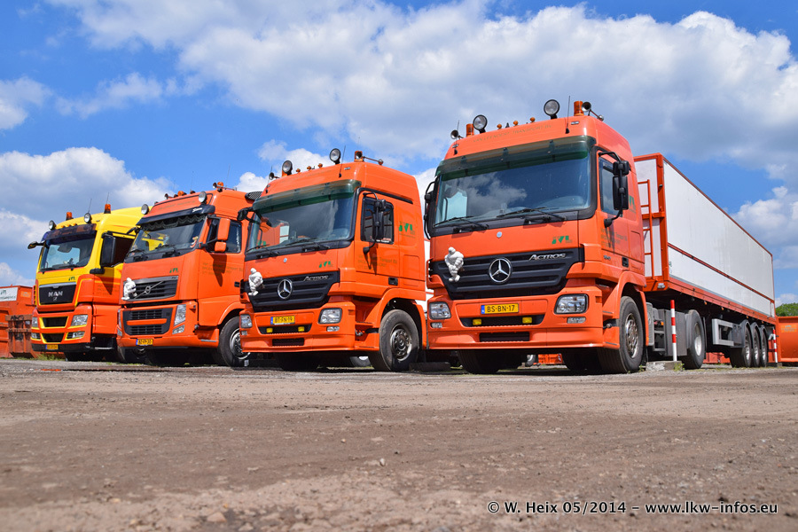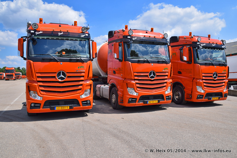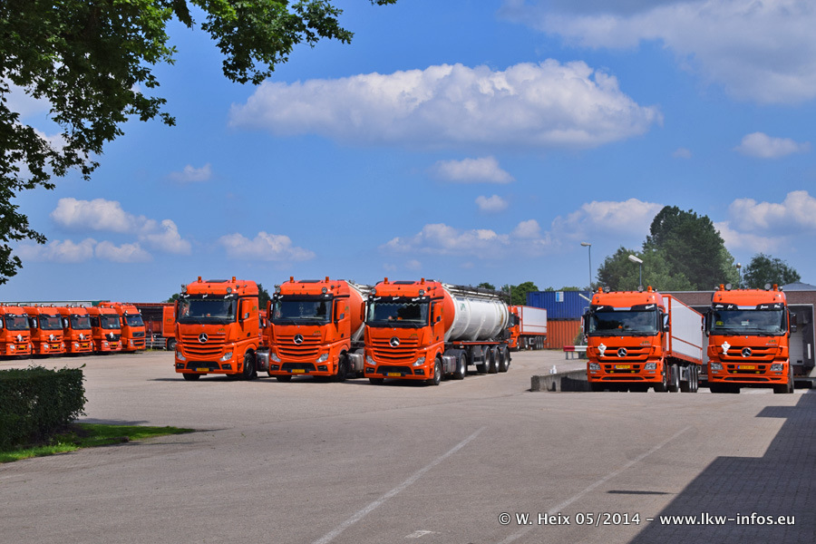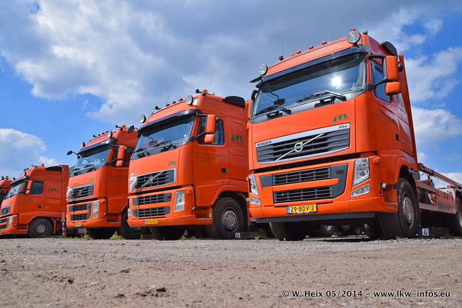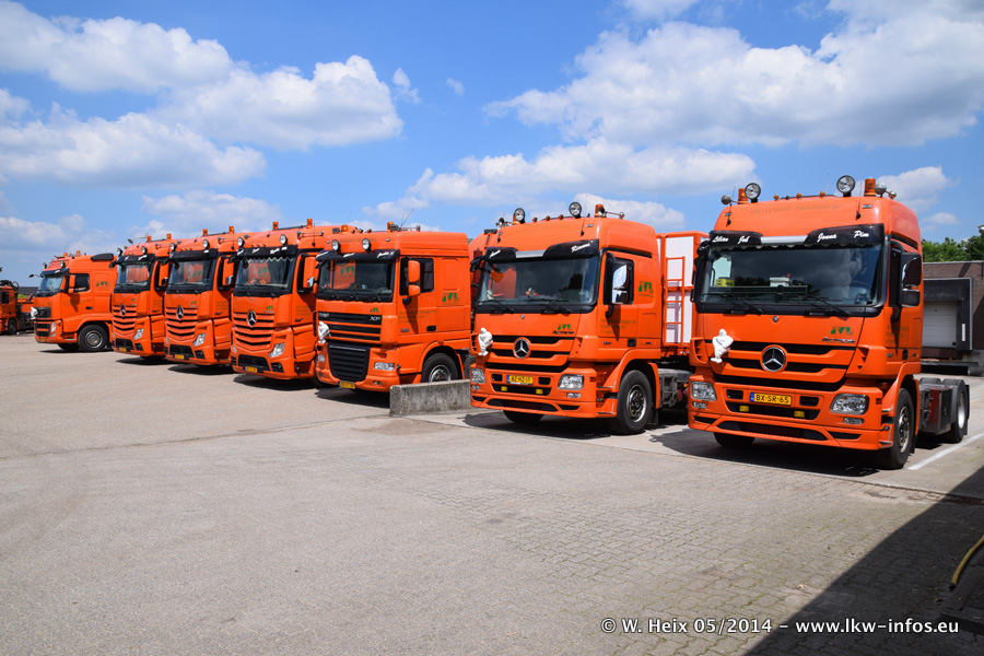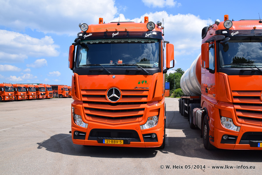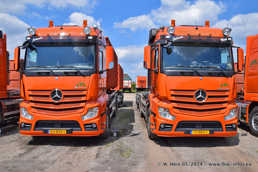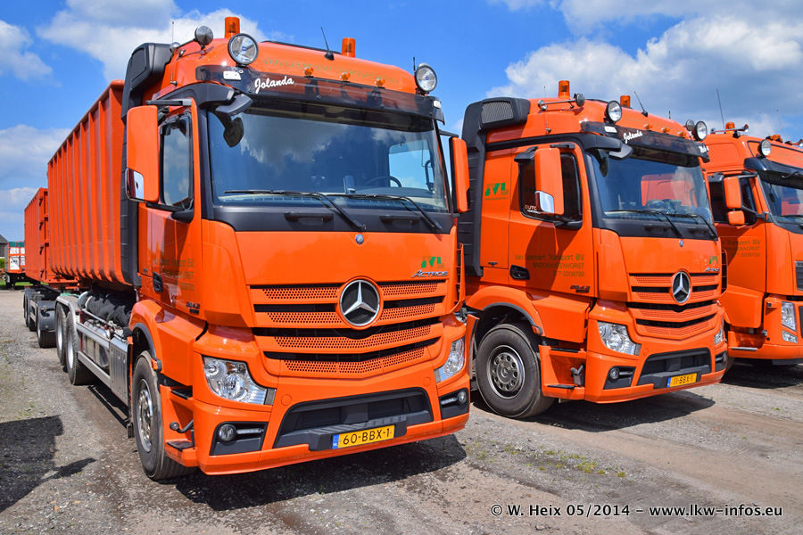 Der Fuhrpark besteht zur Zeit (Ende Mai 2014) aus 42 LKW der Hersteller MAN, Mercedes-Benz, Renault und Volvo. In der Woche vor meinem Besuch hat van Leendert zwei neue Volvo FH Euro 6 bekommen. Es gibt auch einen "Oldtimer", das ist ein Mercedes-Benz NG 2632 6x6. Dies war der erste LKW, den Erik van Leendert nach der Übernahme der Firma von seinem Vater im Jahr 1982 neu gekauft hat. Dieser LKW wird niemals verkauft und wird sogar im Nahverkehr und zum Umsetzen von Containern auf dem Hof verwendet. Der Kenworth W 900 ist Baujahr 2000 und wird nicht im normalen Tagesgeschäft eingesetzt. Nur für diverse Veranstaltungen wie z. B. den jährlichen Truckrun in Horst kommt der US-Truck zum Einsatz.