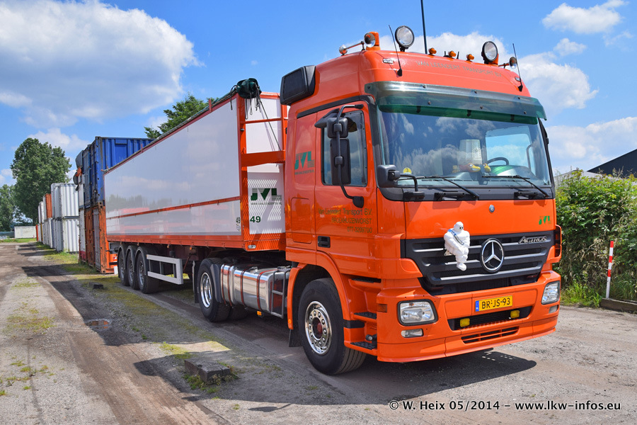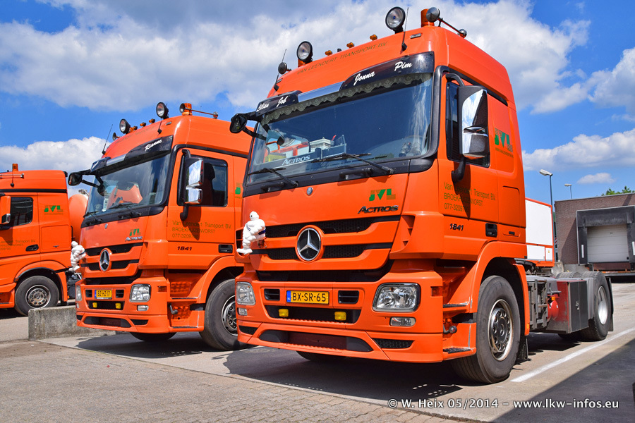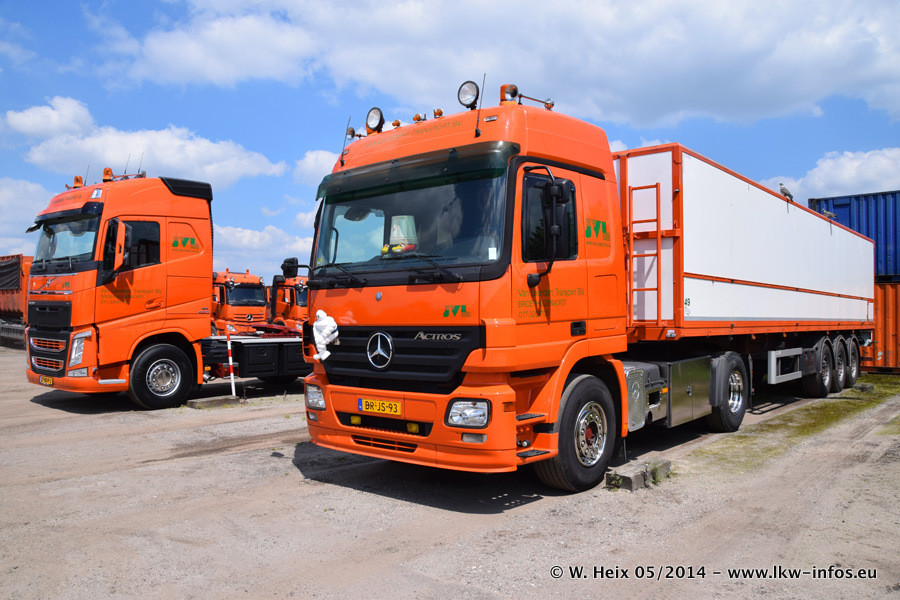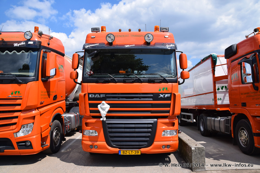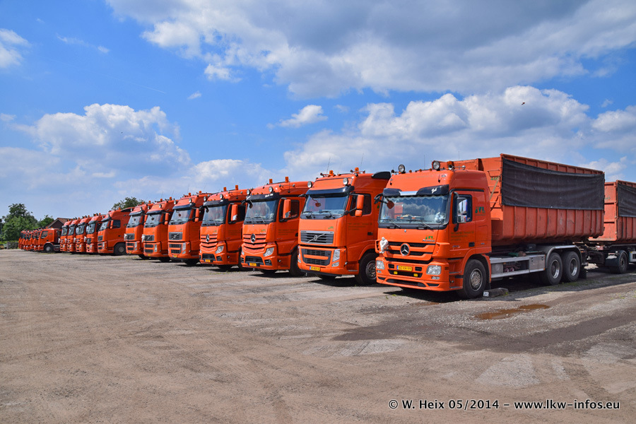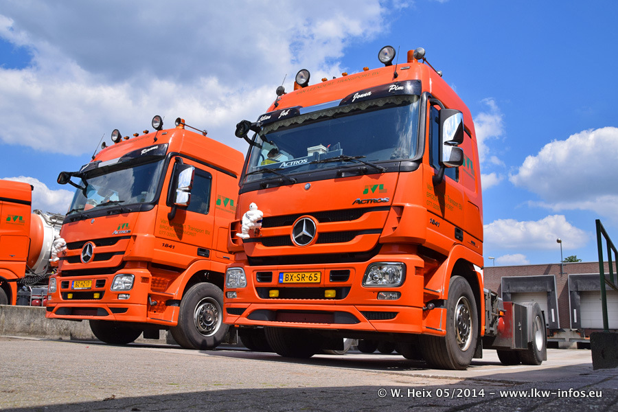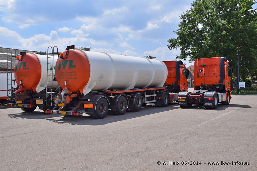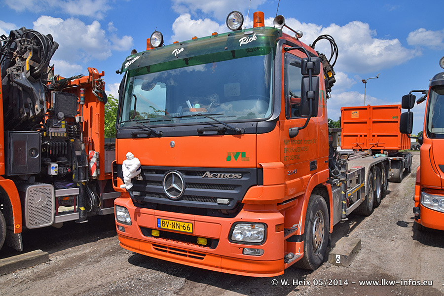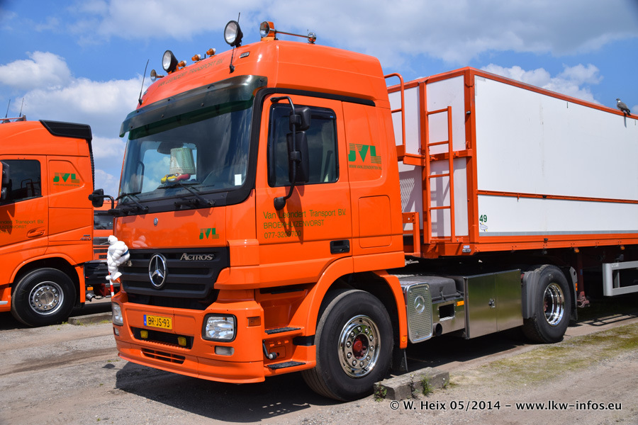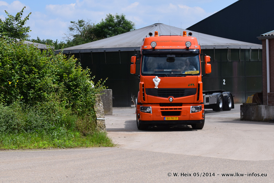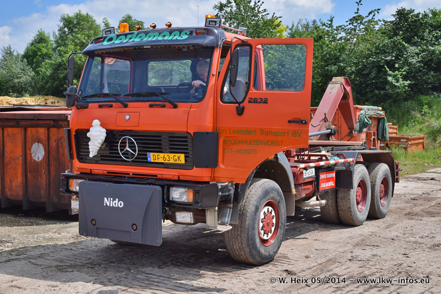 Der Fuhrpark besteht zur Zeit (Ende Mai 2014) aus 42 LKW der Hersteller MAN, Mercedes-Benz, Renault und Volvo. In der Woche vor meinem Besuch hat van Leendert zwei neue Volvo FH Euro 6 bekommen. Es gibt auch einen "Oldtimer", das ist ein Mercedes-Benz NG 2632 6x6. Dies war der erste LKW, den Erik van Leendert nach der Übernahme der Firma von seinem Vater im Jahr 1982 neu gekauft hat. Dieser LKW wird niemals verkauft und wird sogar im Nahverkehr und zum Umsetzen von Containern auf dem Hof verwendet. Der Kenworth W 900 ist Baujahr 2000 und wird nicht im normalen Tagesgeschäft eingesetzt. Nur für diverse Veranstaltungen wie z. B. den jährlichen Truckrun in Horst kommt der US-Truck zum Einsatz.
