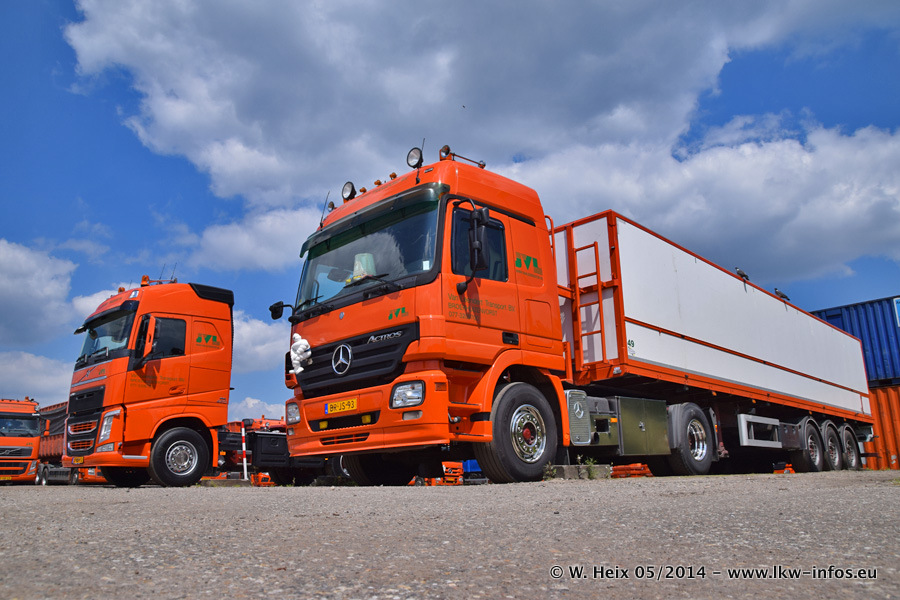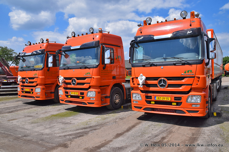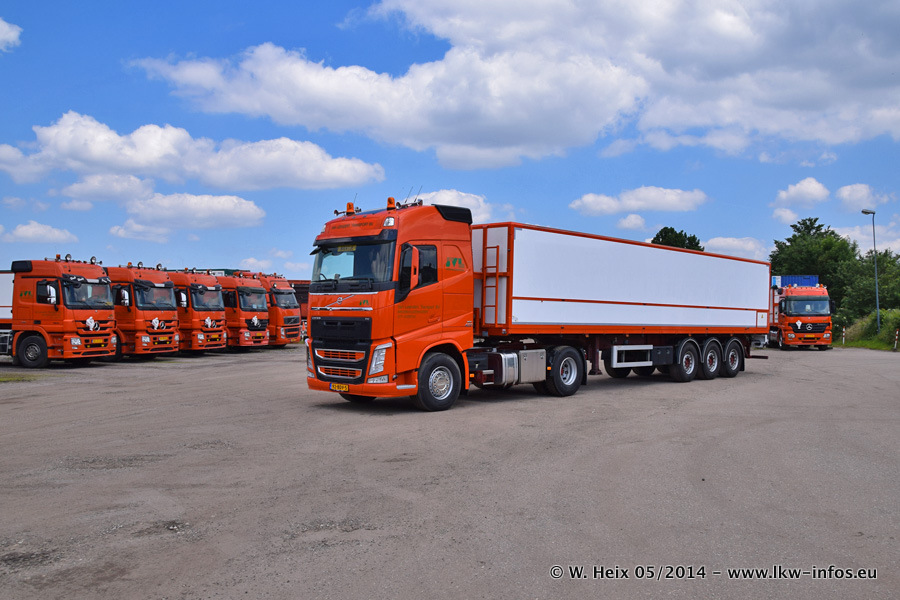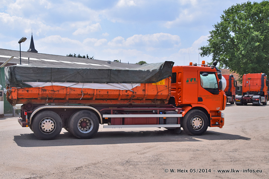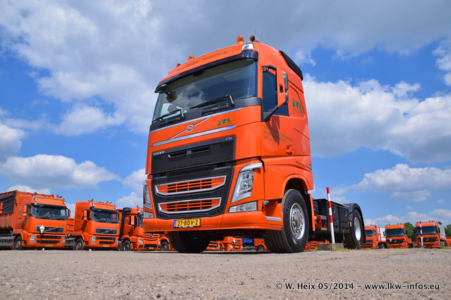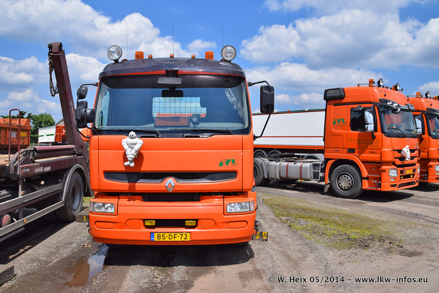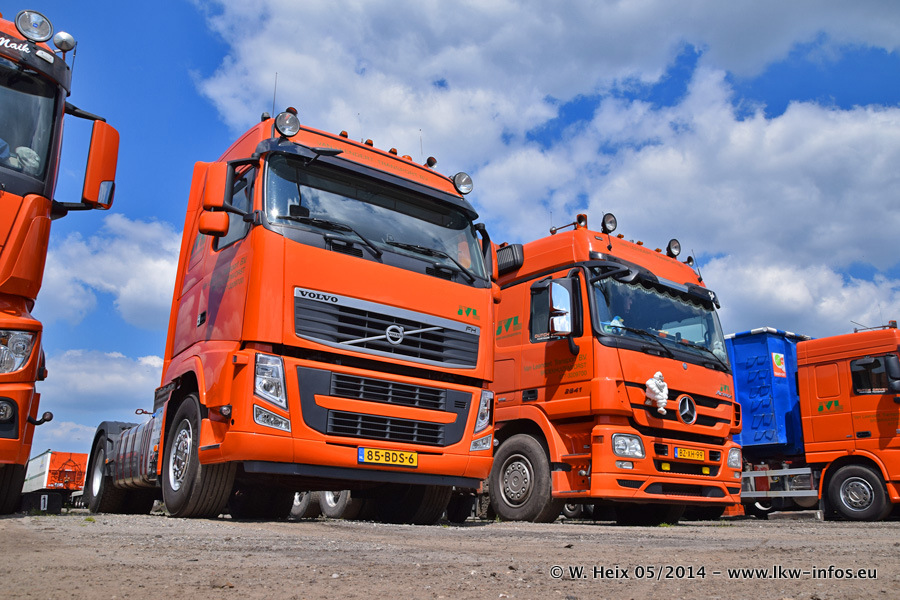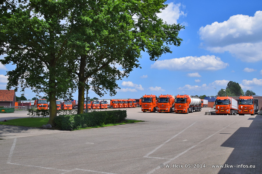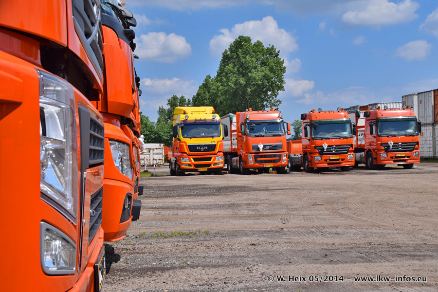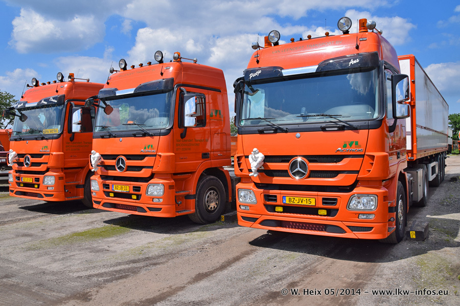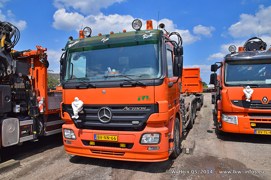 Der Fuhrpark besteht zur Zeit (Ende Mai 2014) aus 42 LKW der Hersteller MAN, Mercedes-Benz, Renault und Volvo. In der Woche vor meinem Besuch hat van Leendert zwei neue Volvo FH Euro 6 bekommen. Es gibt auch einen "Oldtimer", das ist ein Mercedes-Benz NG 2632 6x6. Dies war der erste LKW, den Erik van Leendert nach der Übernahme der Firma von seinem Vater im Jahr 1982 neu gekauft hat. Dieser LKW wird niemals verkauft und wird sogar im Nahverkehr und zum Umsetzen von Containern auf dem Hof verwendet. Der Kenworth W 900 ist Baujahr 2000 und wird nicht im normalen Tagesgeschäft eingesetzt. Nur für diverse Veranstaltungen wie z. B. den jährlichen Truckrun in Horst kommt der US-Truck zum Einsatz.