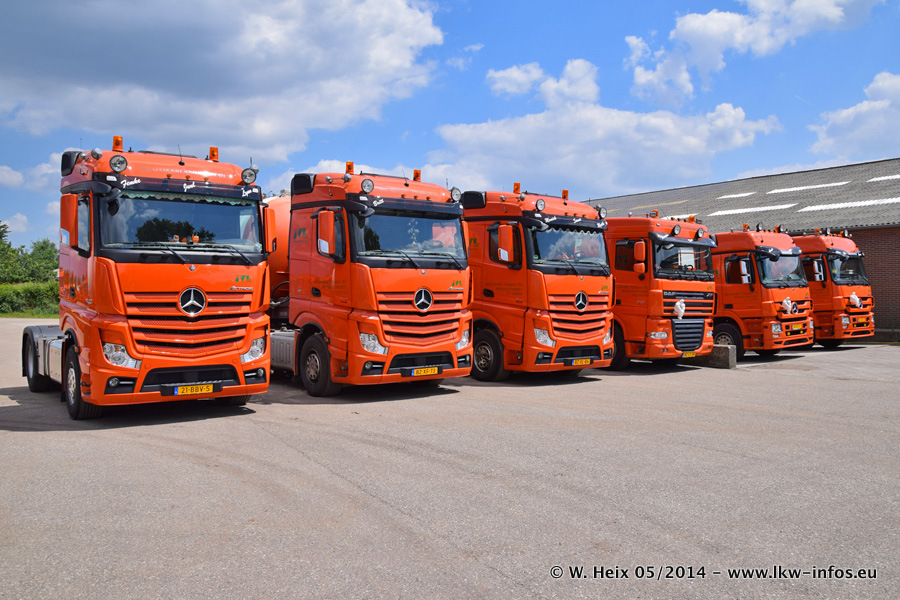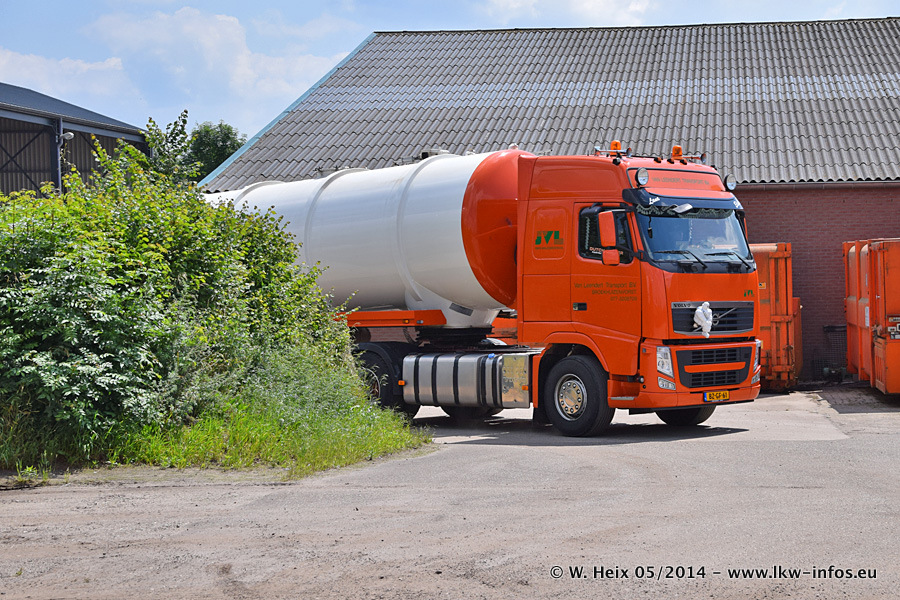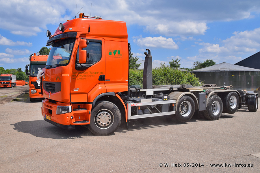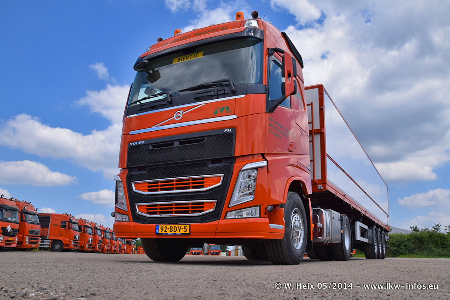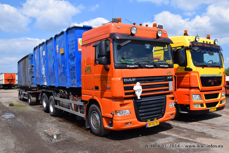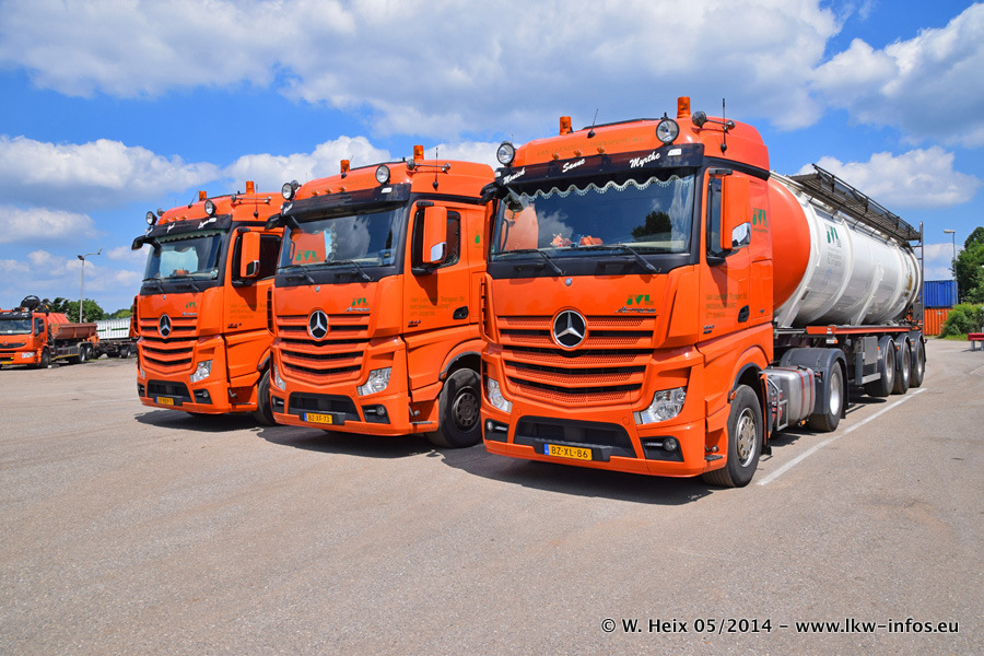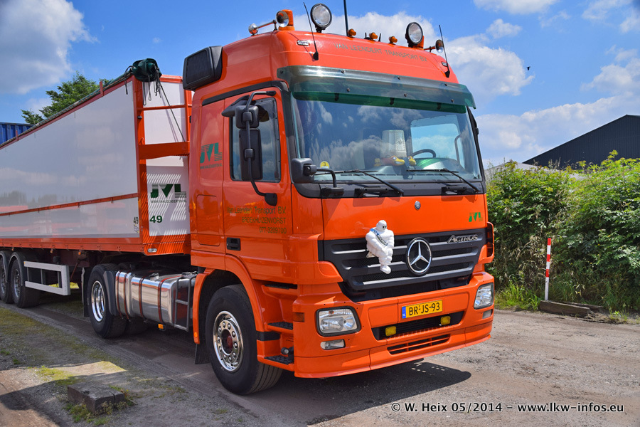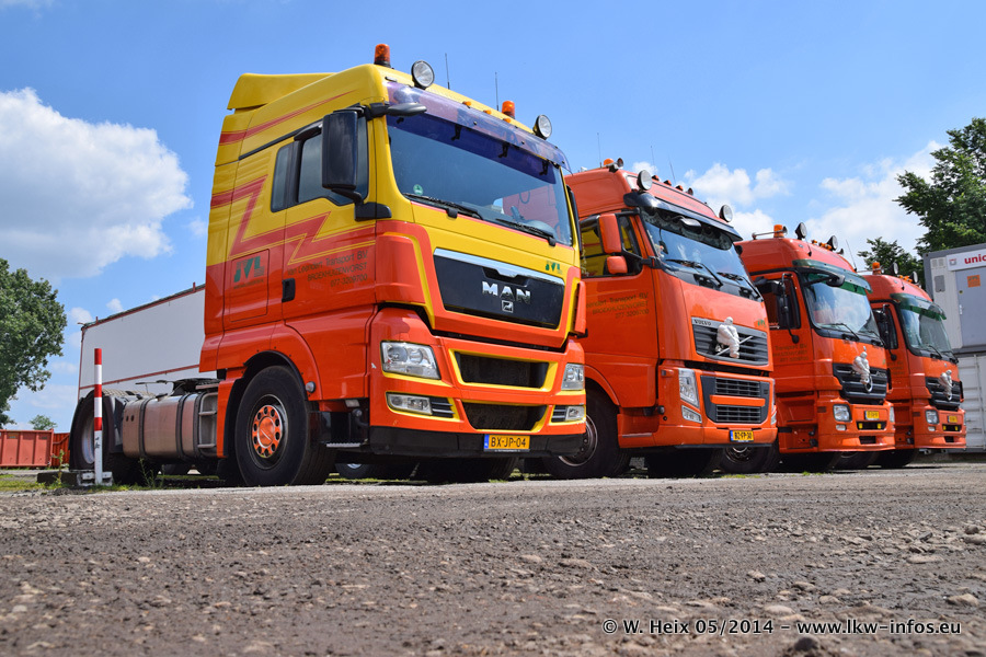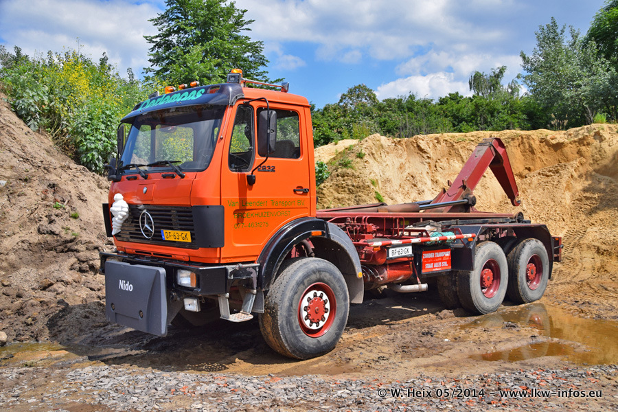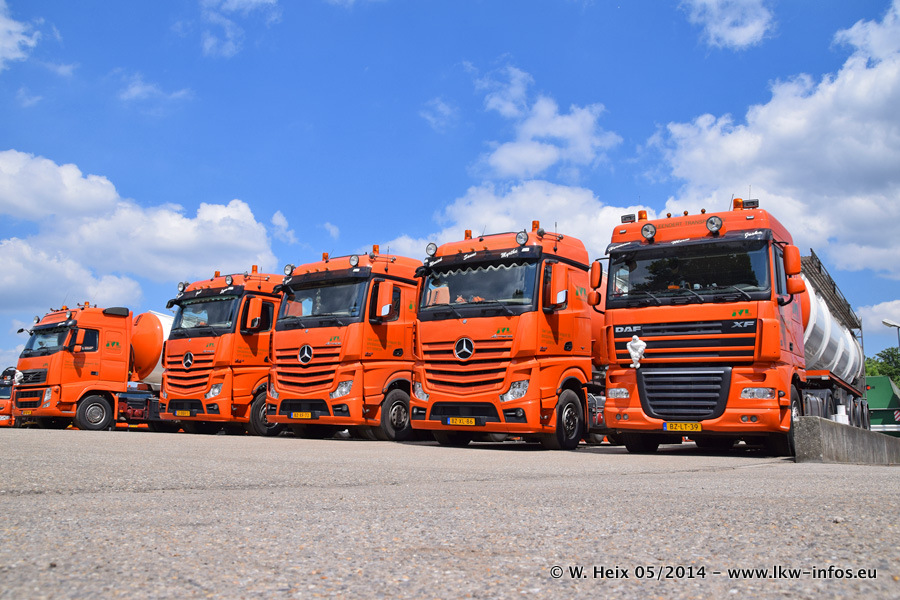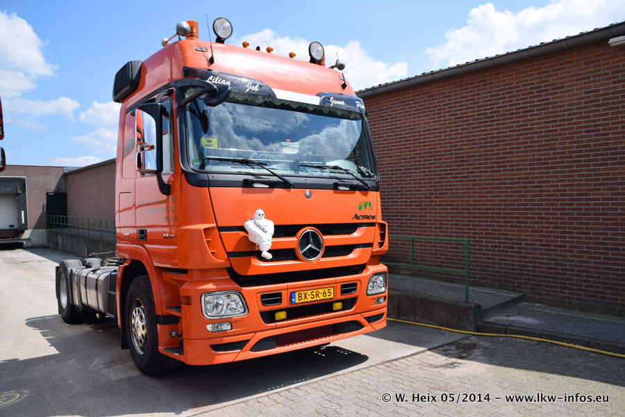 Der Fuhrpark besteht zur Zeit (Ende Mai 2014) aus 42 LKW der Hersteller MAN, Mercedes-Benz, Renault und Volvo. In der Woche vor meinem Besuch hat van Leendert zwei neue Volvo FH Euro 6 bekommen. Es gibt auch einen "Oldtimer", das ist ein Mercedes-Benz NG 2632 6x6. Dies war der erste LKW, den Erik van Leendert nach der Übernahme der Firma von seinem Vater im Jahr 1982 neu gekauft hat. Dieser LKW wird niemals verkauft und wird sogar im Nahverkehr und zum Umsetzen von Containern auf dem Hof verwendet. Der Kenworth W 900 ist Baujahr 2000 und wird nicht im normalen Tagesgeschäft eingesetzt. Nur für diverse Veranstaltungen wie z. B. den jährlichen Truckrun in Horst kommt der US-Truck zum Einsatz.