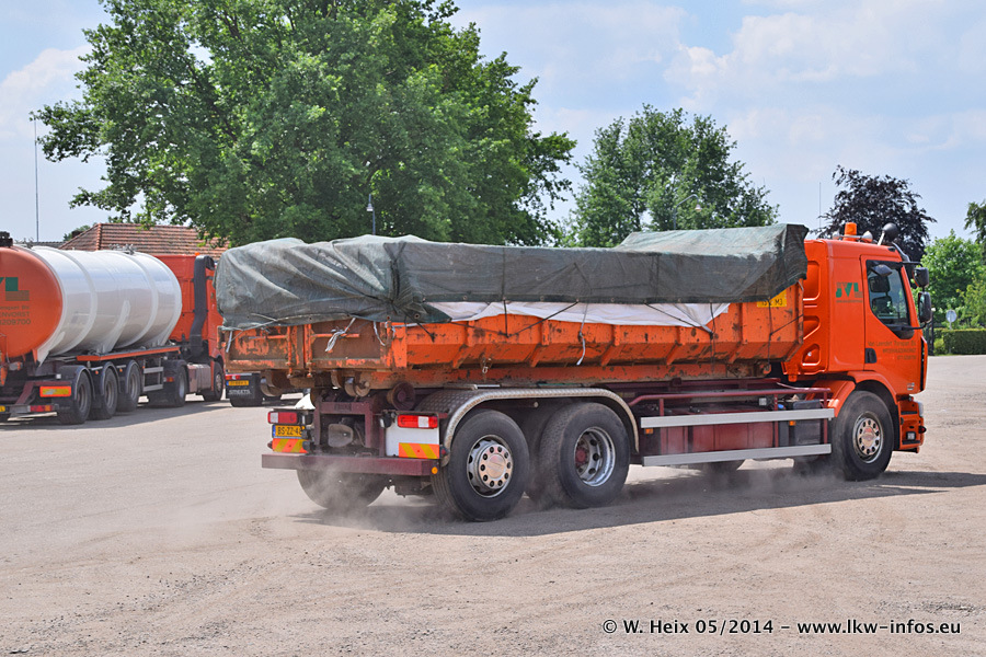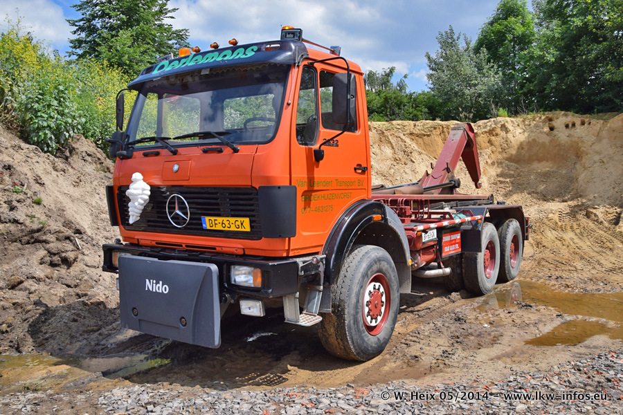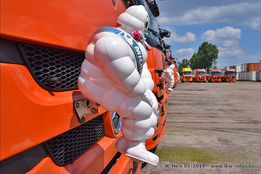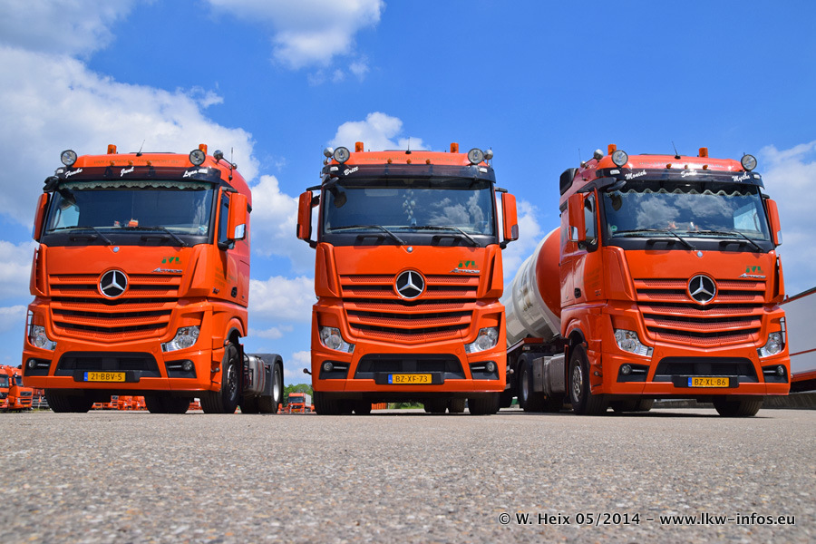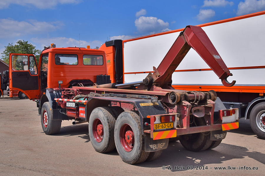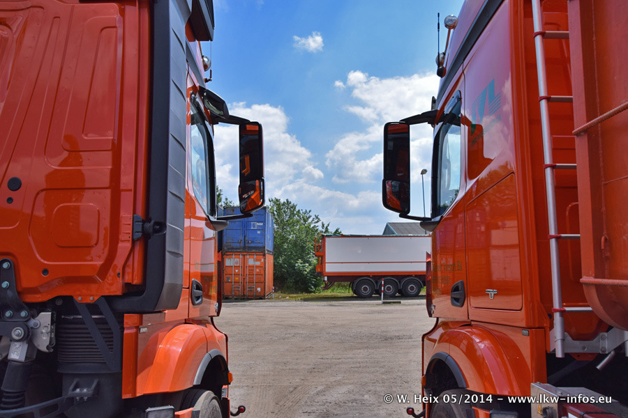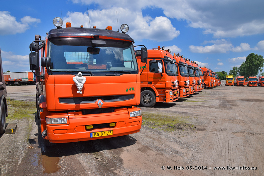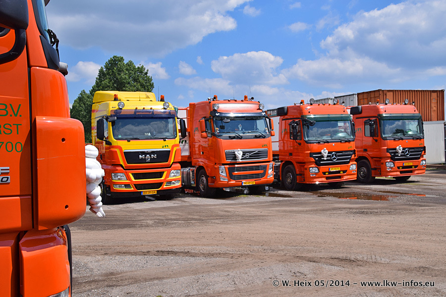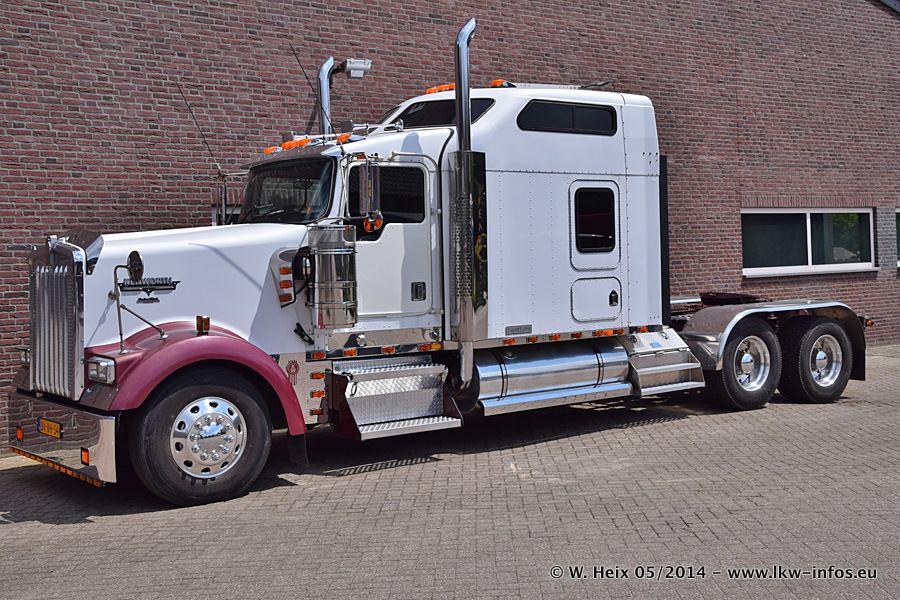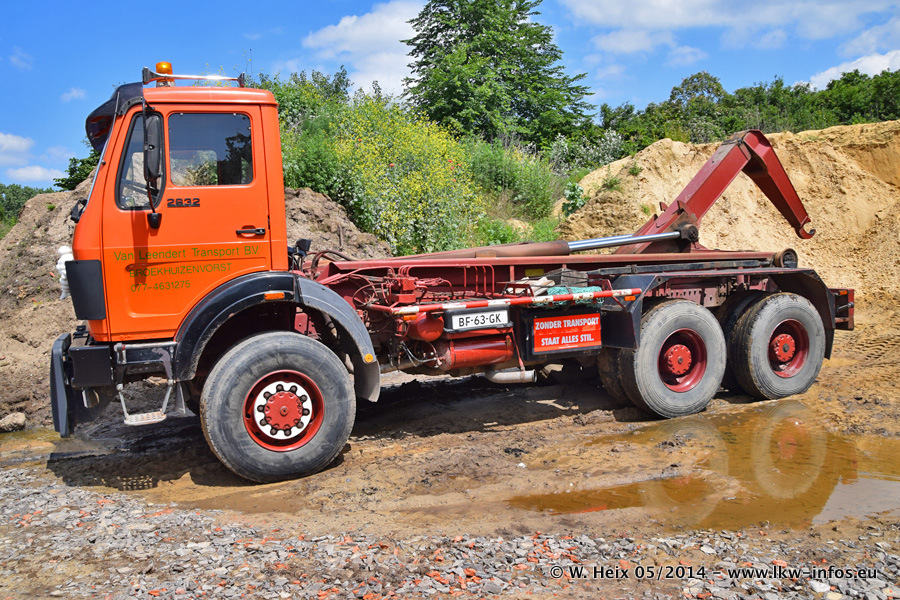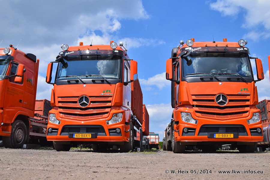 Der Fuhrpark besteht zur Zeit (Ende Mai 2014) aus 42 LKW der Hersteller MAN, Mercedes-Benz, Renault und Volvo. In der Woche vor meinem Besuch hat van Leendert zwei neue Volvo FH Euro 6 bekommen. Es gibt auch einen "Oldtimer", das ist ein Mercedes-Benz NG 2632 6x6. Dies war der erste LKW, den Erik van Leendert nach der Übernahme der Firma von seinem Vater im Jahr 1982 neu gekauft hat. Dieser LKW wird niemals verkauft und wird sogar im Nahverkehr und zum Umsetzen von Containern auf dem Hof verwendet. Der Kenworth W 900 ist Baujahr 2000 und wird nicht im normalen Tagesgeschäft eingesetzt. Nur für diverse Veranstaltungen wie z. B. den jährlichen Truckrun in Horst kommt der US-Truck zum Einsatz.