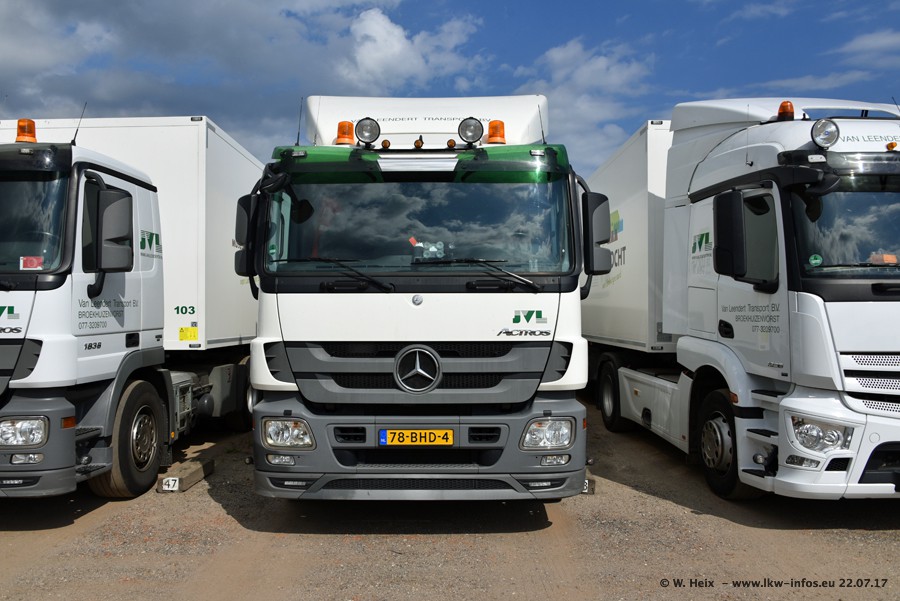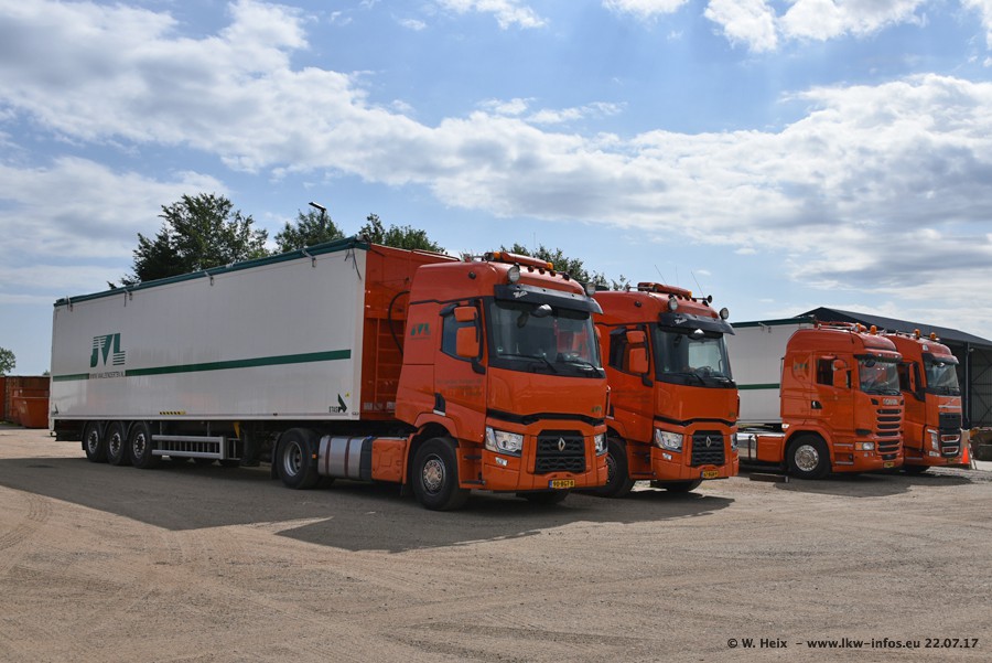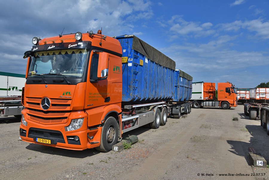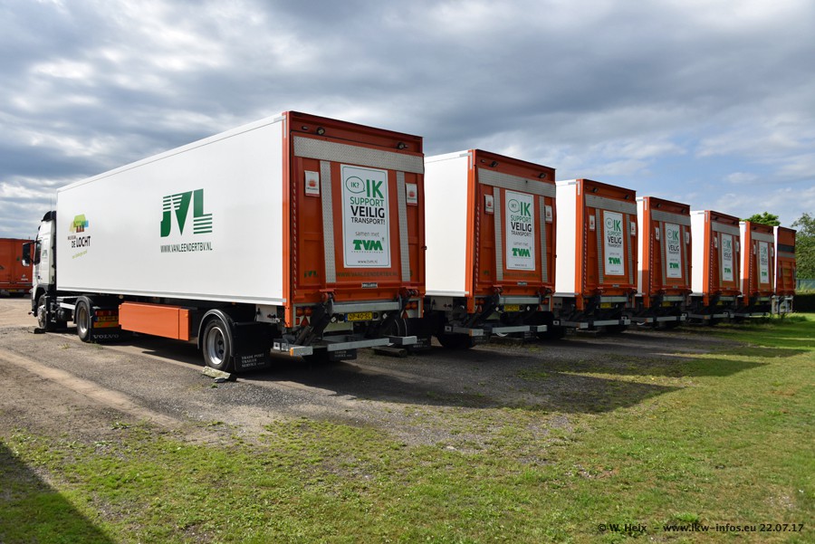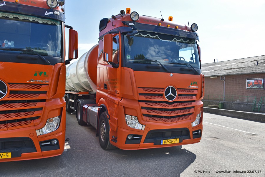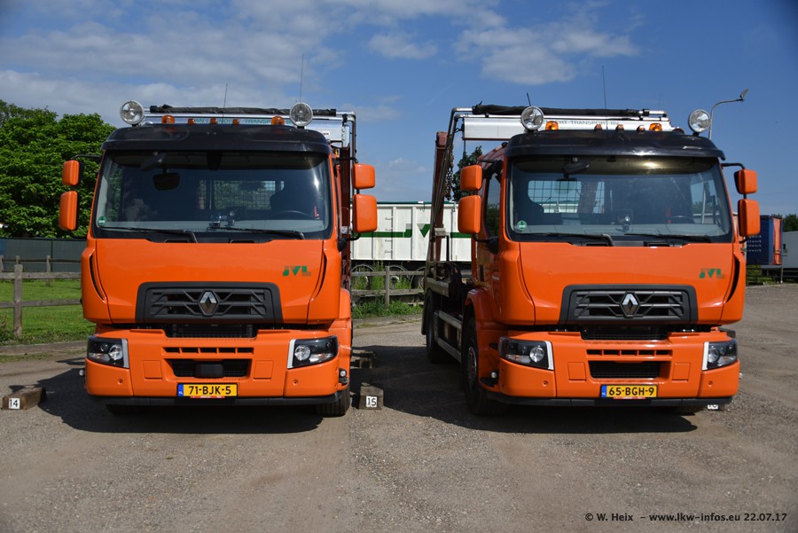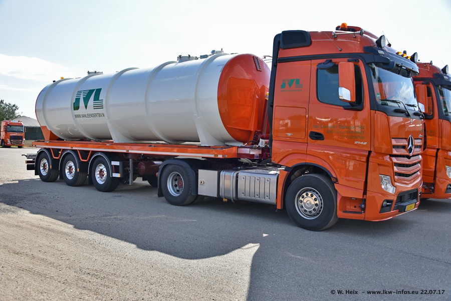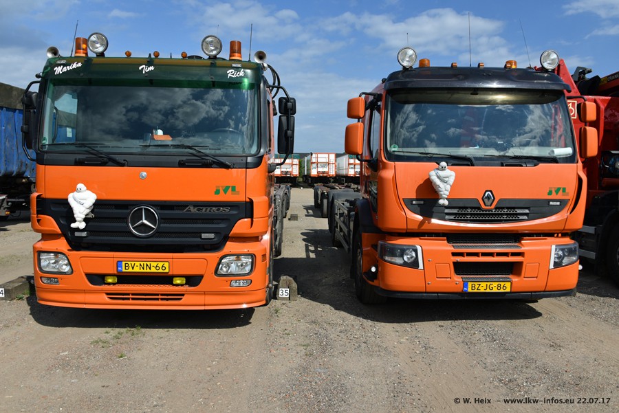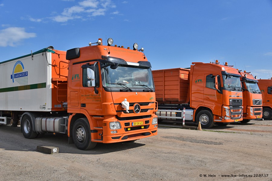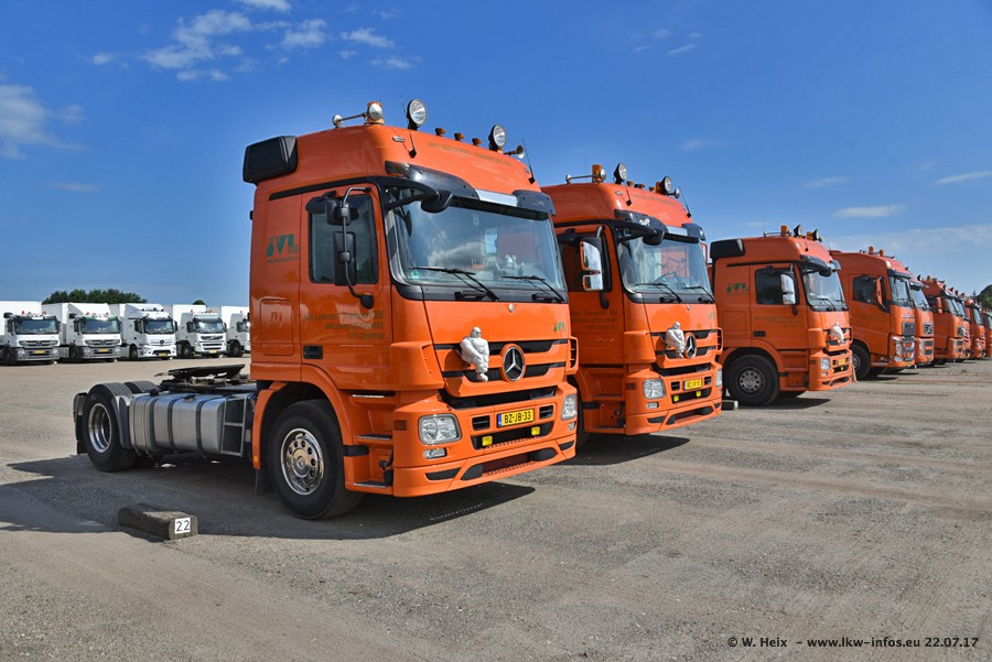 Seit meinem letzten Besuch bei JVL im Oktober 2016 sind einige neue Fahrzeuge in den Fuhrpark gekommen. Das sind: 3 Mercedes-Benz Actros 4 (Nr. 3 ist auf den letzten 2 Bildern zu sehen), 1 Volvo FH 04, 1 DAF XF Euro 6 (war nicht da), 1 Renault D und mehrere Auflieger. Es waren nicht alle LKW zuhause, aber das schöne Sommerwetter hat mir viele gute Bilder ermöglicht.