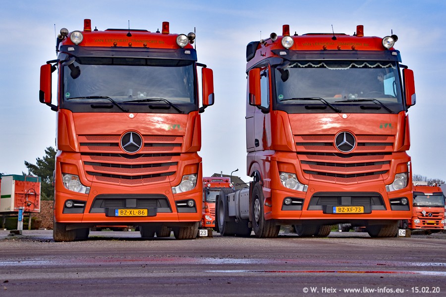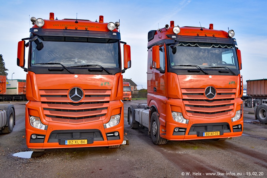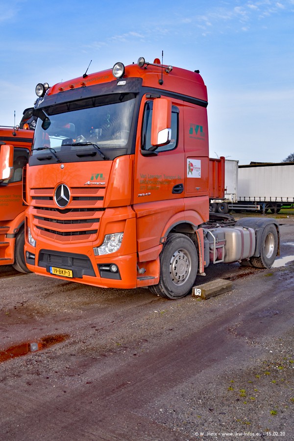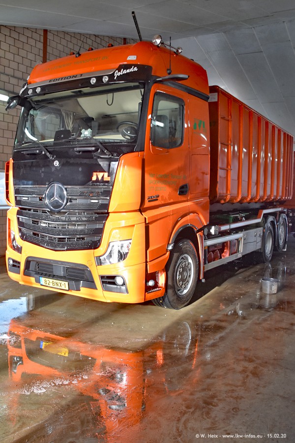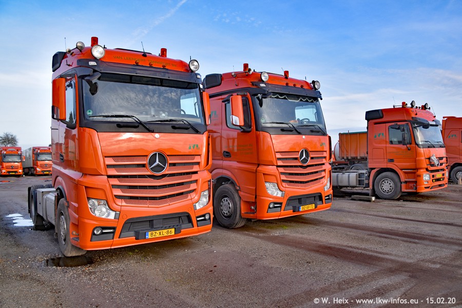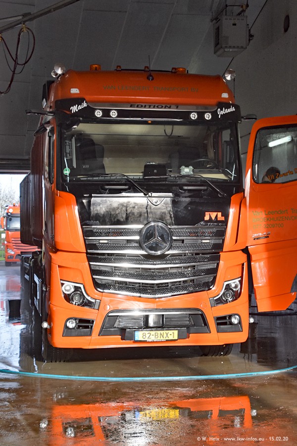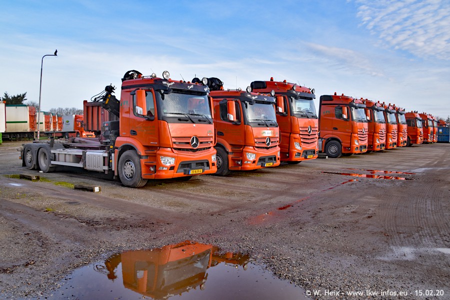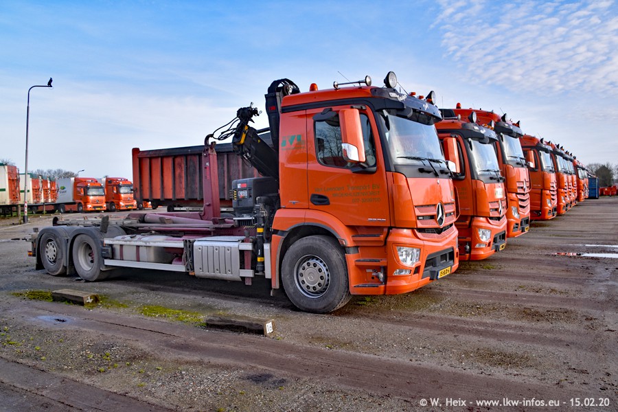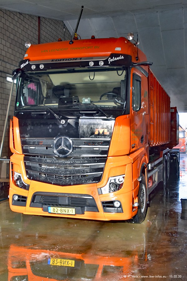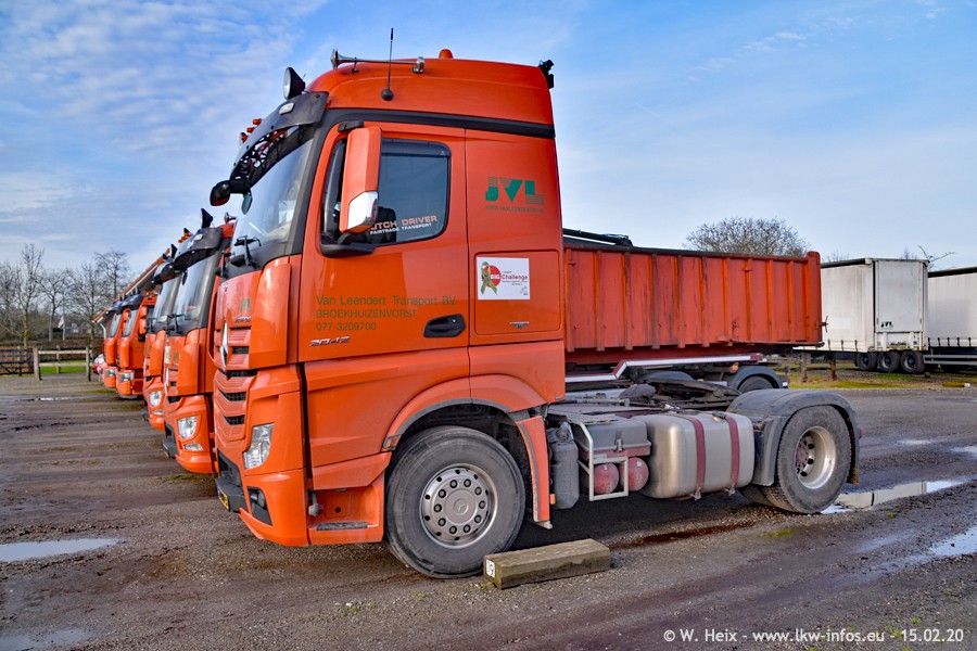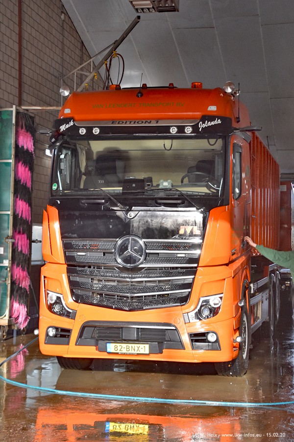 Die Nachricht kam 3 Tage vor meinem Besuch: van Leendert hat einen großen Teil des Fuhrparks an die Firma AB Texel verkauft - zum 01.03.2020. Das bedeutet, dass rund 30 Fahrzeuge verkauft sind. Der Bereich Umweltservice bleibt bestehen und wird mit 18 LKW fortgeführt. Es gibt also zum letzten Mal so gut wie alle LKW auf dem Hof zu sehen. Neu sind zwei Mercedes-Benz New Actros 4 2136, die auf den ersten Fotos zu sehen sind. Zwei weitere werden demnächst folgen. Welche LKW genau bleiben, weiß ich im Moment nicht. Auf jeden Fall der Mercedes-Benz New Actros 4 "Edition 1", den JVL sich zum 40-jährigen Firmenjubiläim im September 2019 gegönnt hat. Siehe Bildergalerie Teil 12!