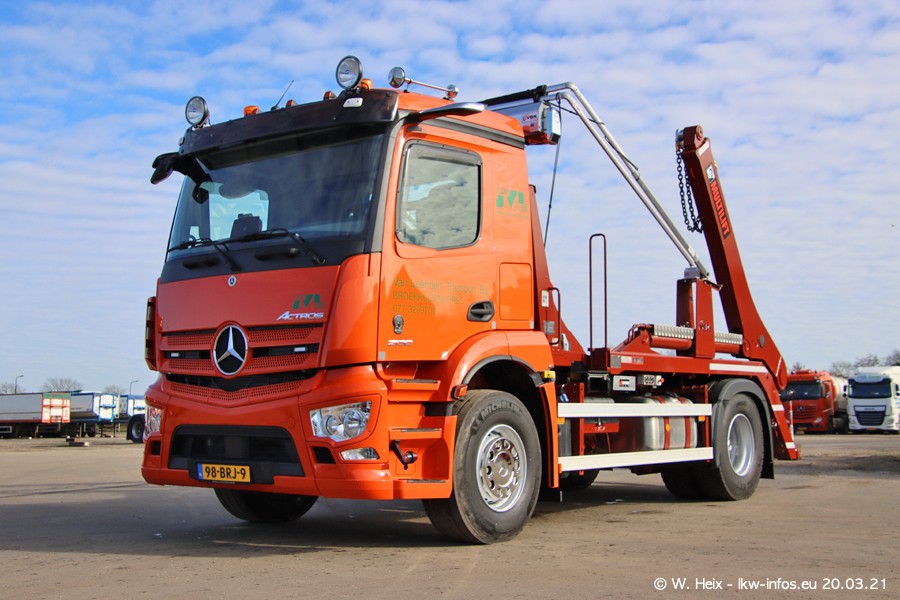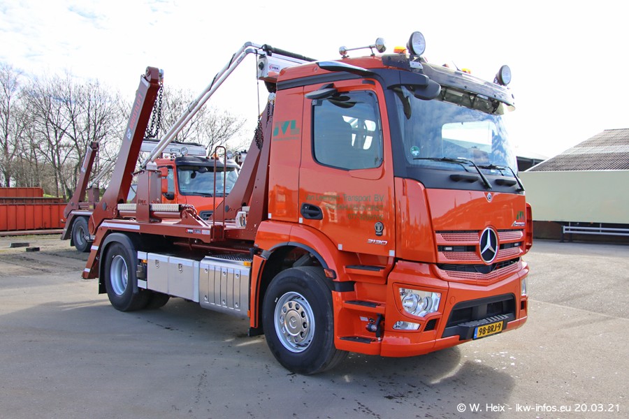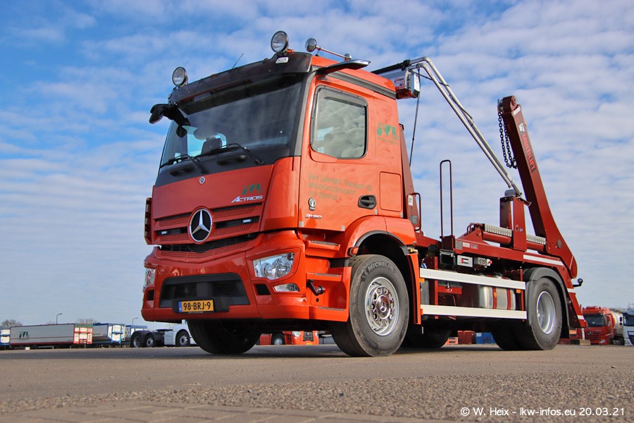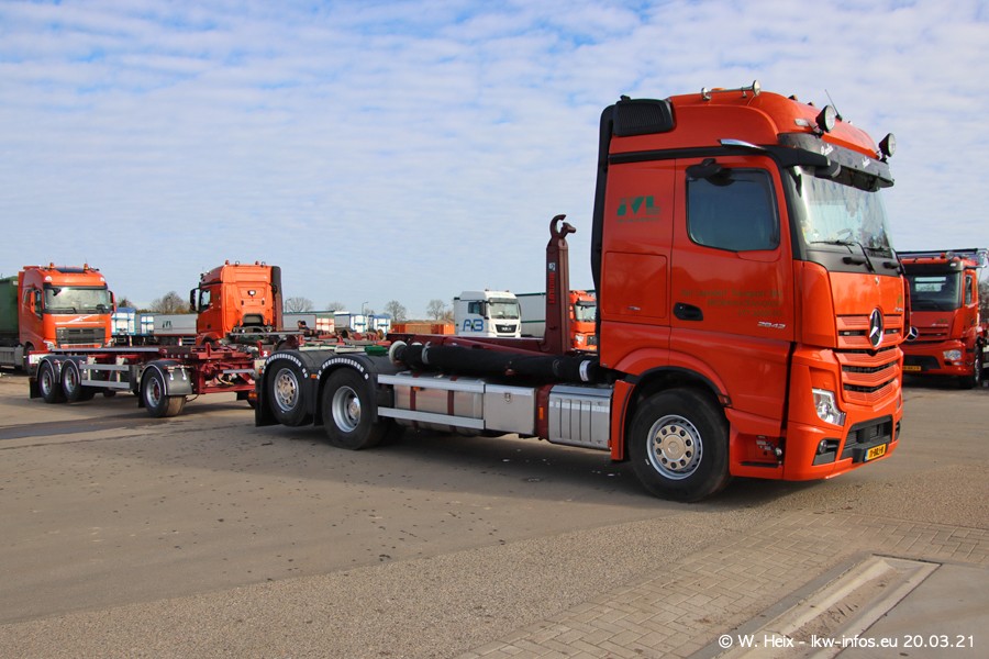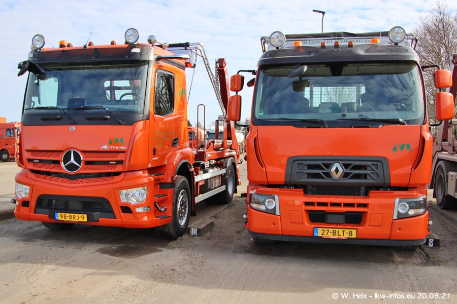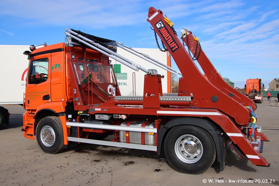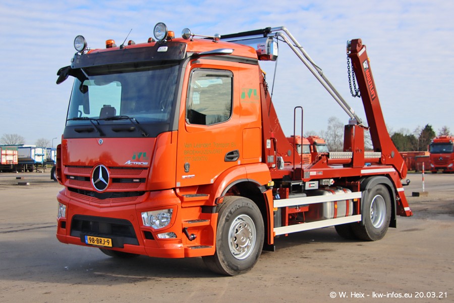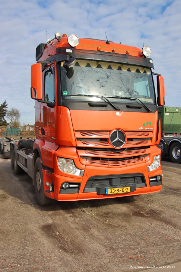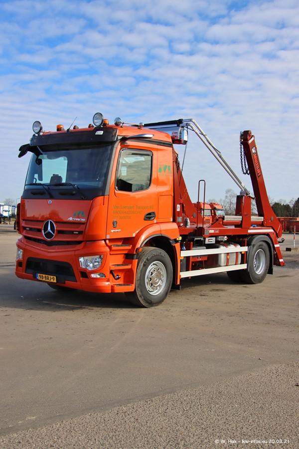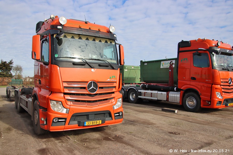 Letzte Woche hat van Leendert einen neuen Mercedes-Benz New Actros 4 (MP 5) bekommen inkl neuem Anhänger für den Transport von (Abroll-) Containern. Vor zwei Tagen, also am Donnerstag, ist ein weiterer kleiner Mercedes-Benz New Actros 4 (MP5) dazu gekommen und verstärkt die drei LKW von Renault beim Transport von kleinen Containern für Sperrmüll und andere Materialien. Ein alter LKW wurde verkauft. Der Rest ist bekannt, wobei nicht alle LKW zuhause waren, da bei van Leendert auch samstags gearbeitet wird.