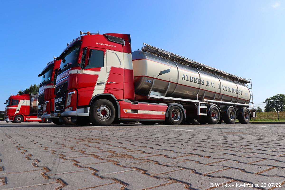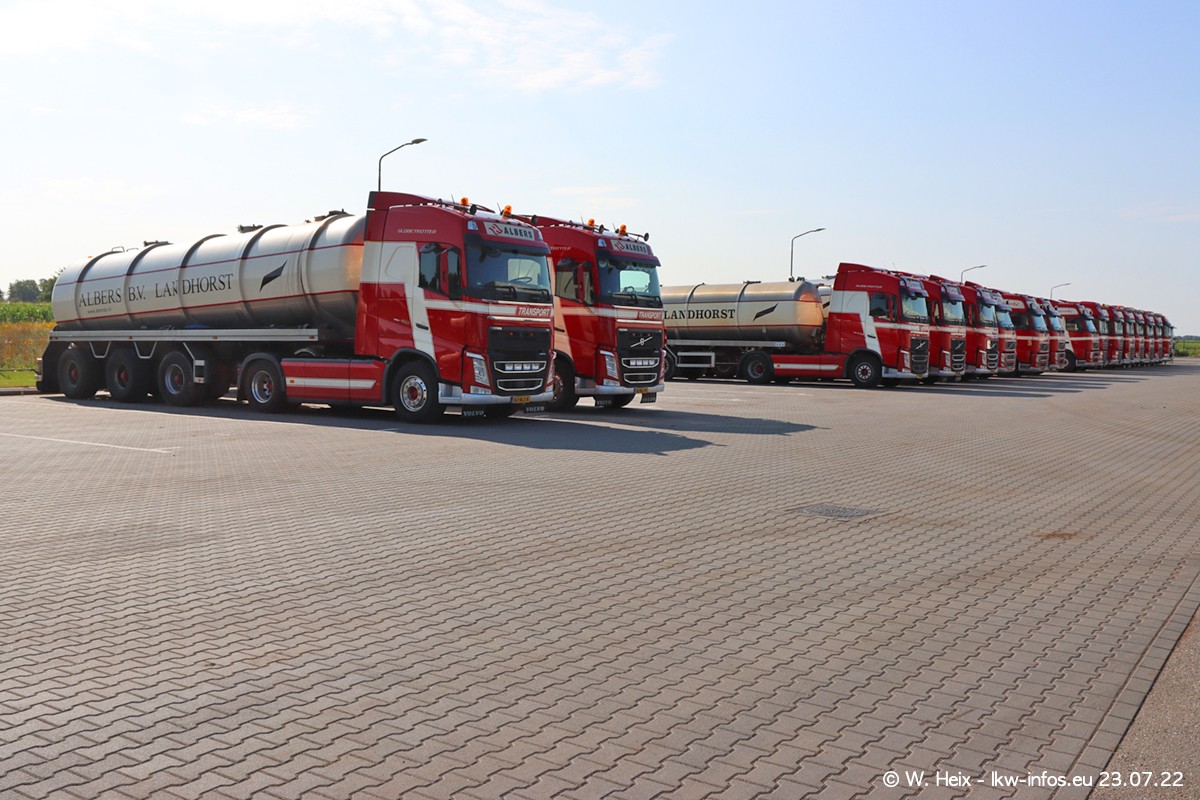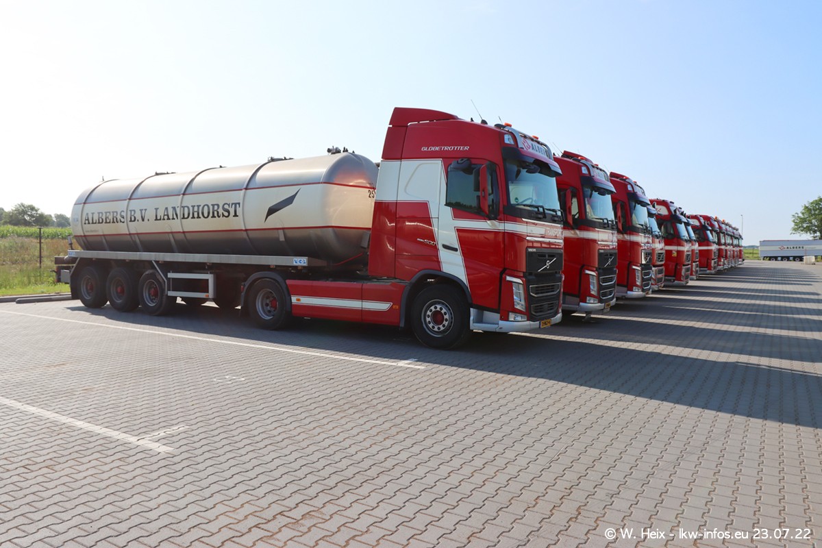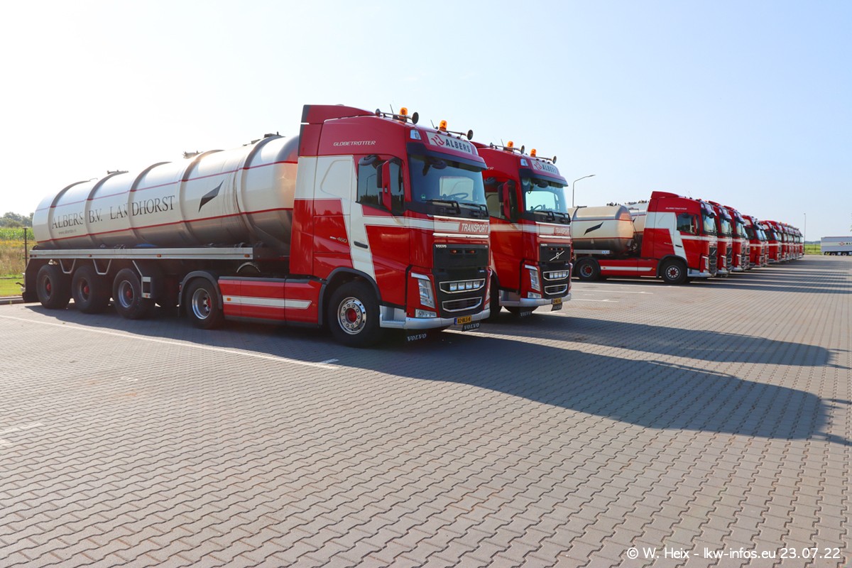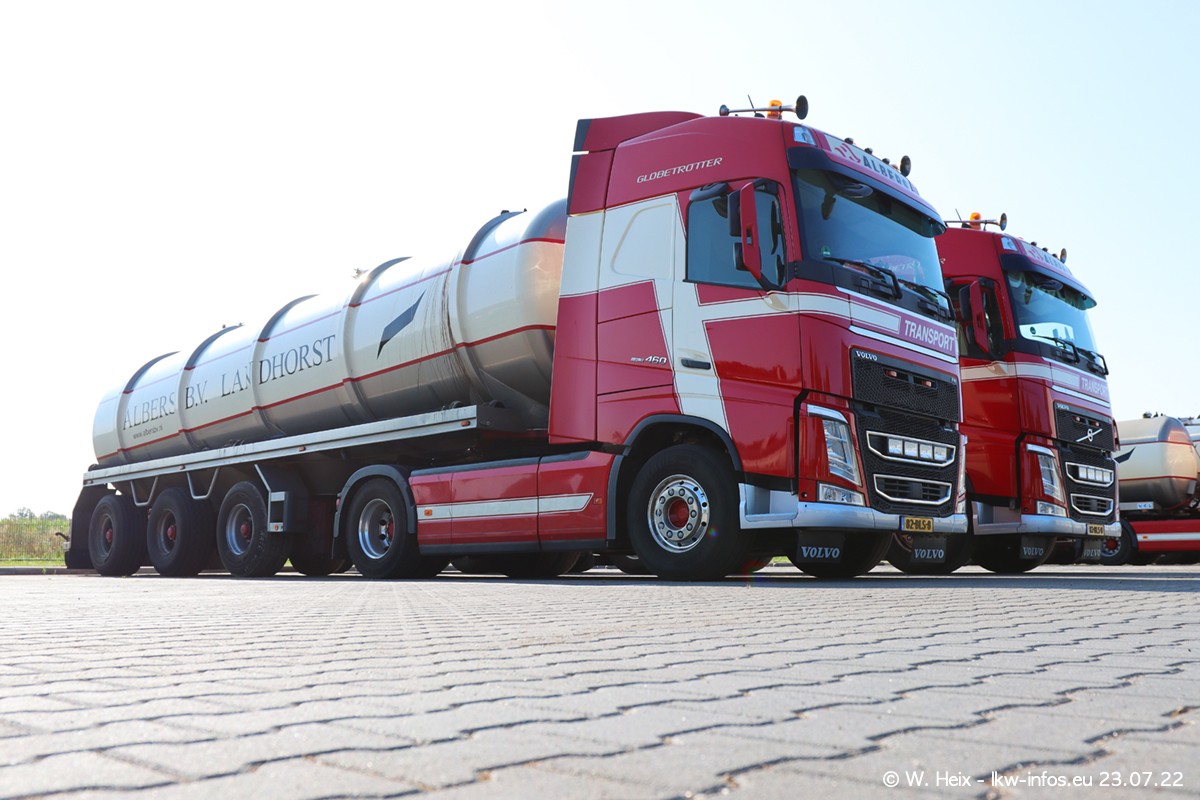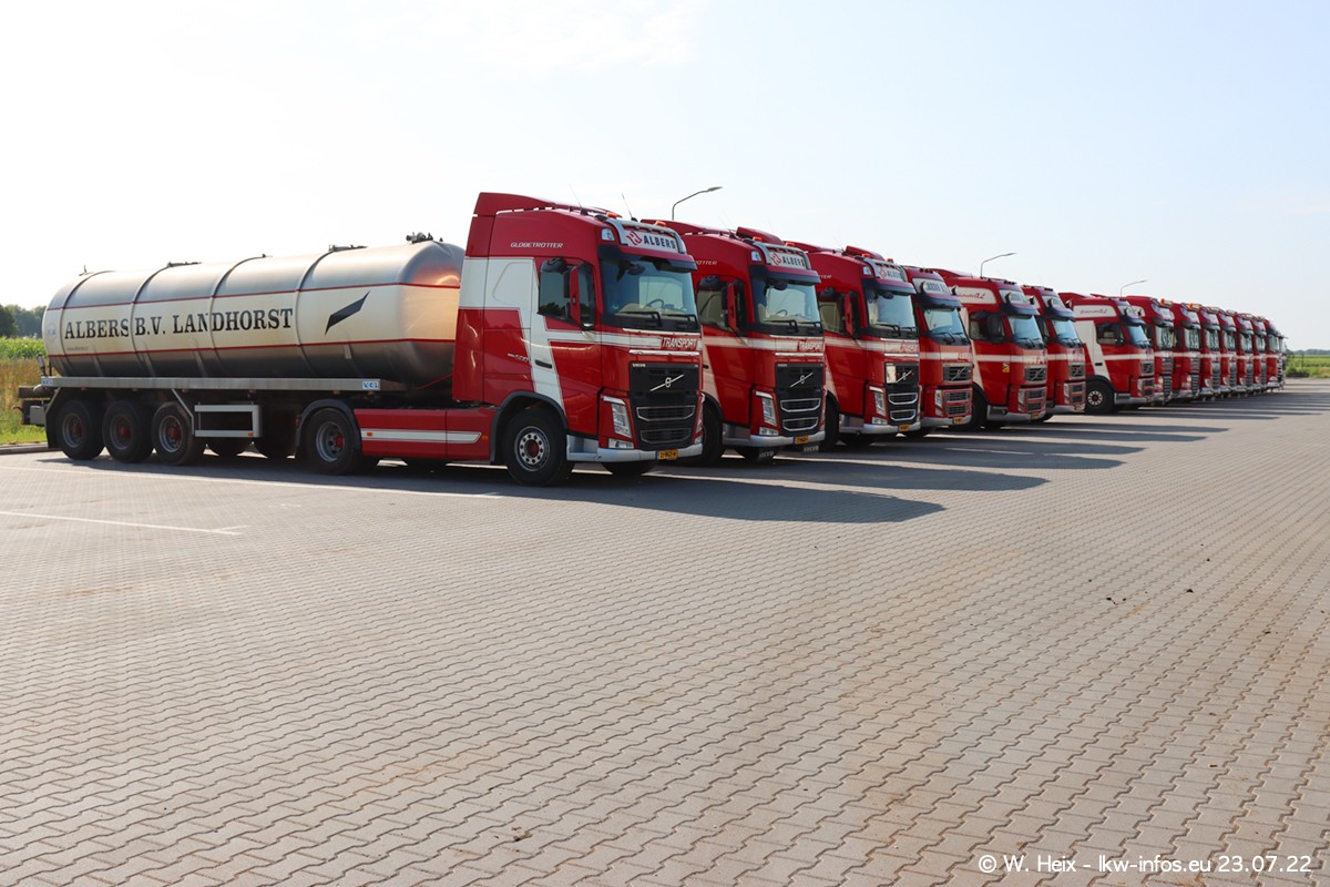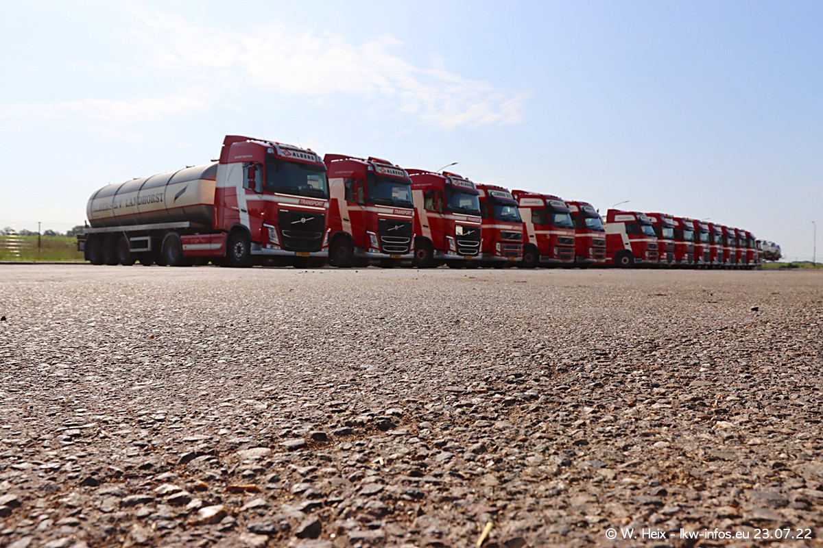 Ende 2021 ist der Fuhrpark von landhorst umgezogen nach Zeeland. Hier gibt es deutlich mehr Platz für die Fahrzeuge. Am Wochenende stehen alle LKW in einer Reihe, sortiert nach Hersteller und Alter. Ein großer Teil der LKW war zuhause. Schön, dass auch der alte VOLVO F10 samt passendem Auflieger mit auf dem Hof stand. Da die Fahrzeuge früh morgens wegen der Sonne genau falsch herum auf dem Gelände standen, war es etwas schwierig mit dem Fotografieren. Aber die Bilder sind trotzdem gut geworden.