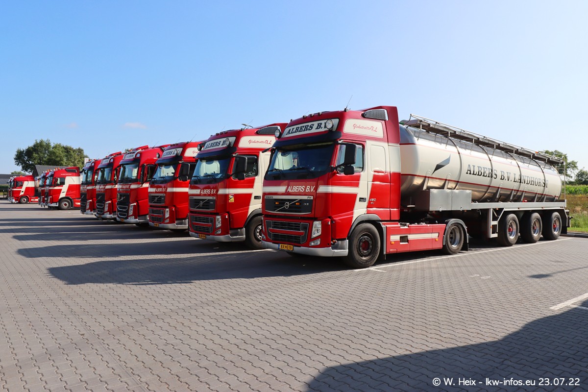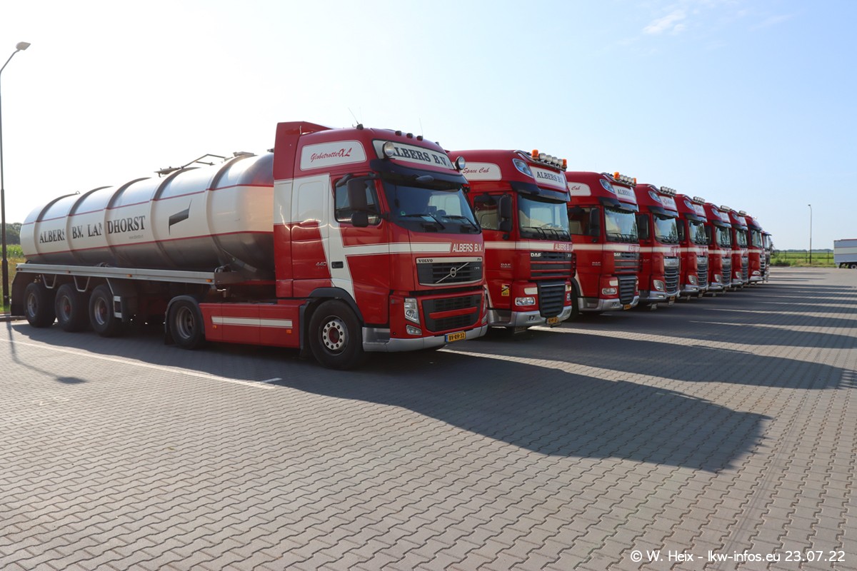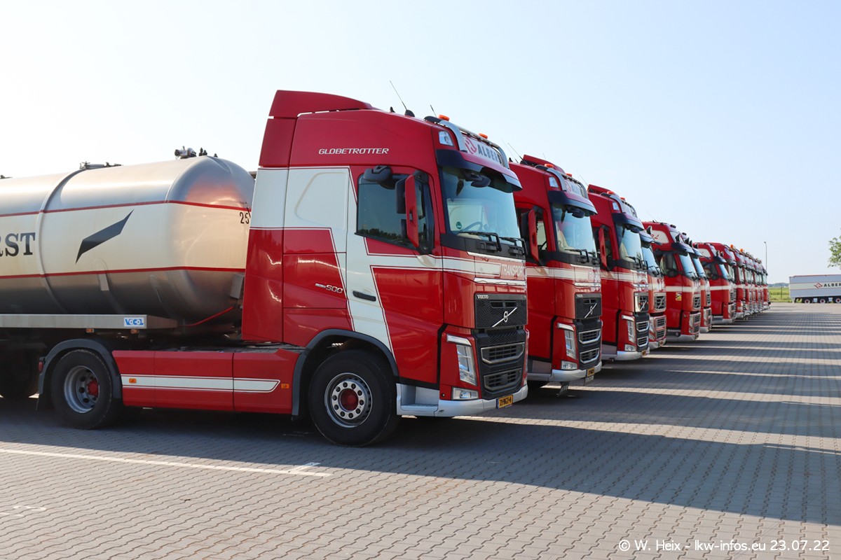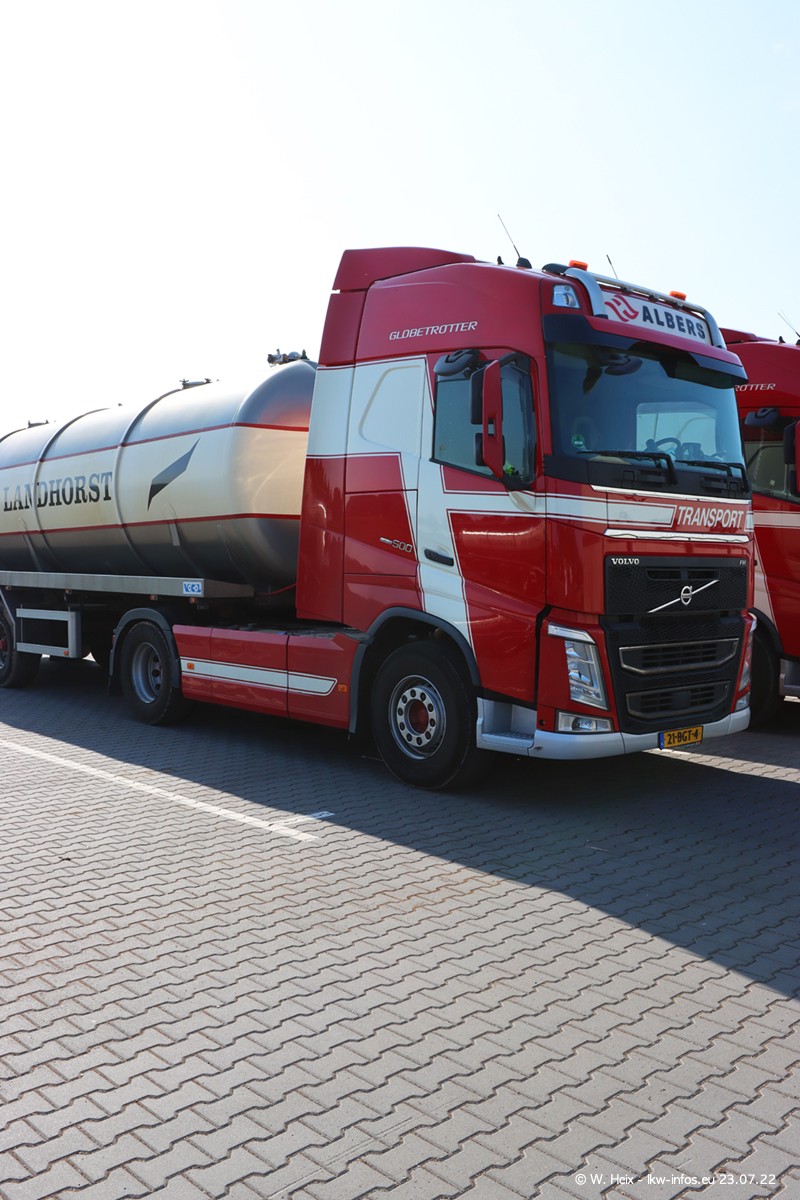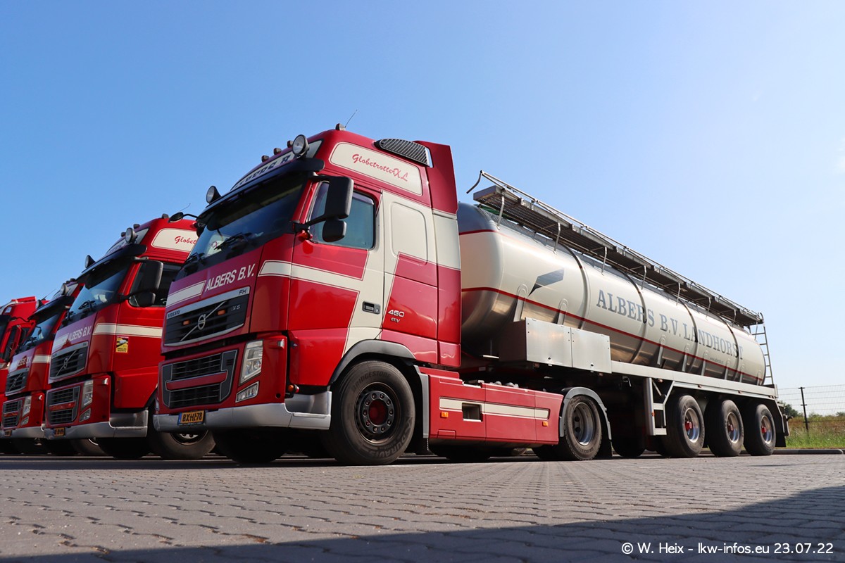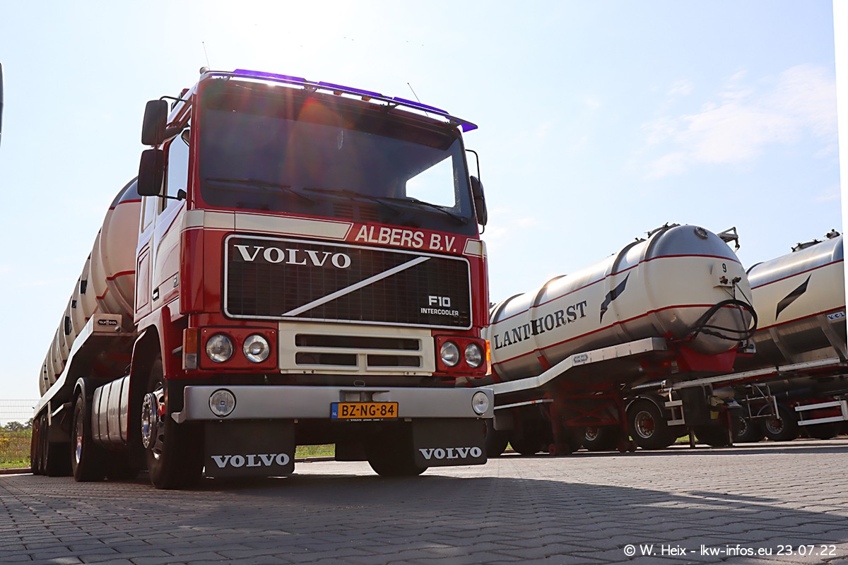 Ende 2021 ist der Fuhrpark von landhorst umgezogen nach Zeeland. Hier gibt es deutlich mehr Platz für die Fahrzeuge. Am Wochenende stehen alle LKW in einer Reihe, sortiert nach Hersteller und Alter. Ein großer Teil der LKW war zuhause. Schön, dass auch der alte VOLVO F10 samt passendem Auflieger mit auf dem Hof stand. Da die Fahrzeuge früh morgens wegen der Sonne genau falsch herum auf dem Gelände standen, war es etwas schwierig mit dem Fotografieren. Aber die Bilder sind trotzdem gut geworden.