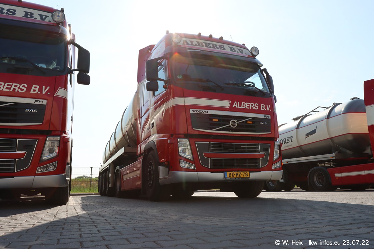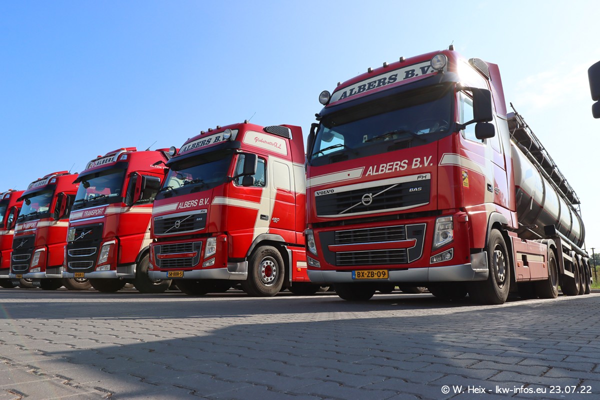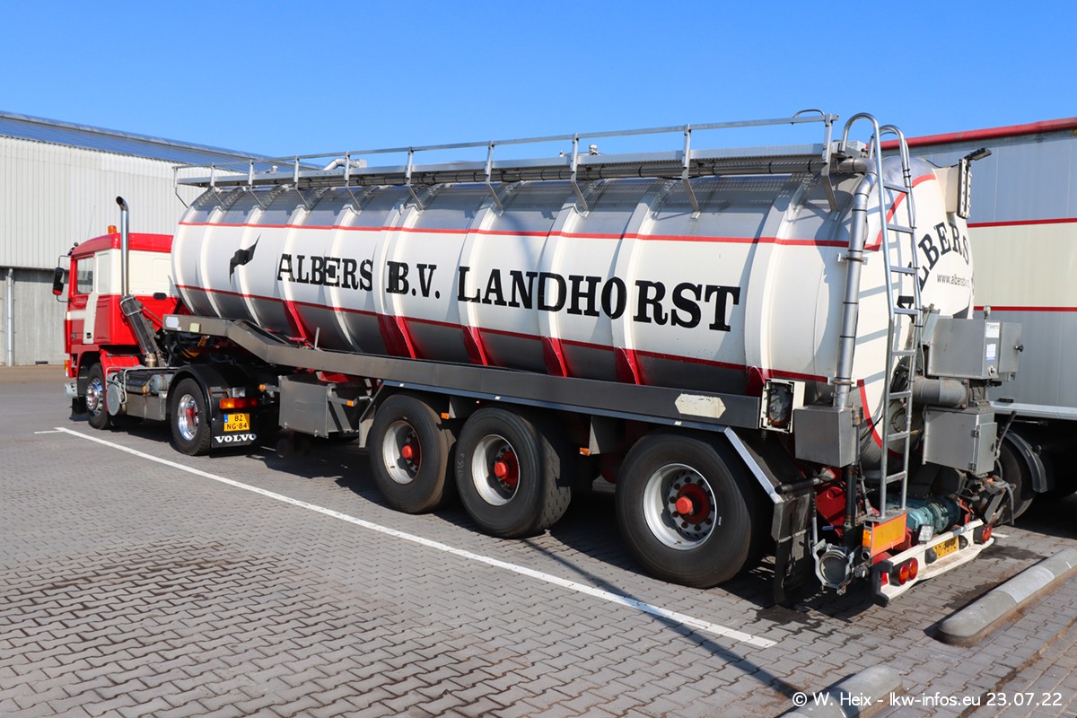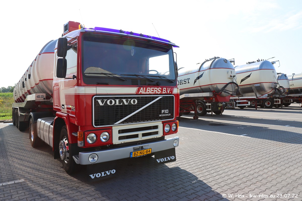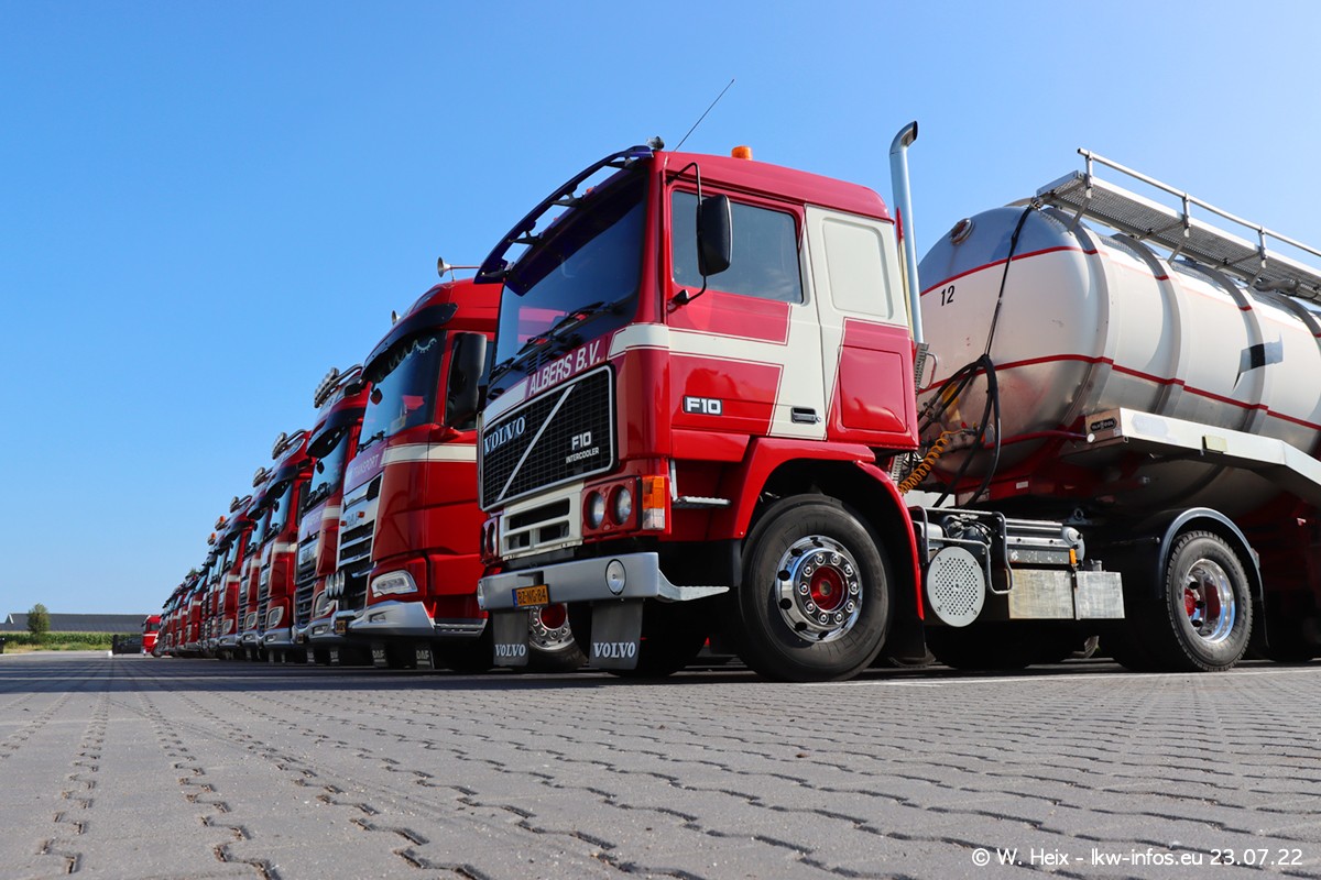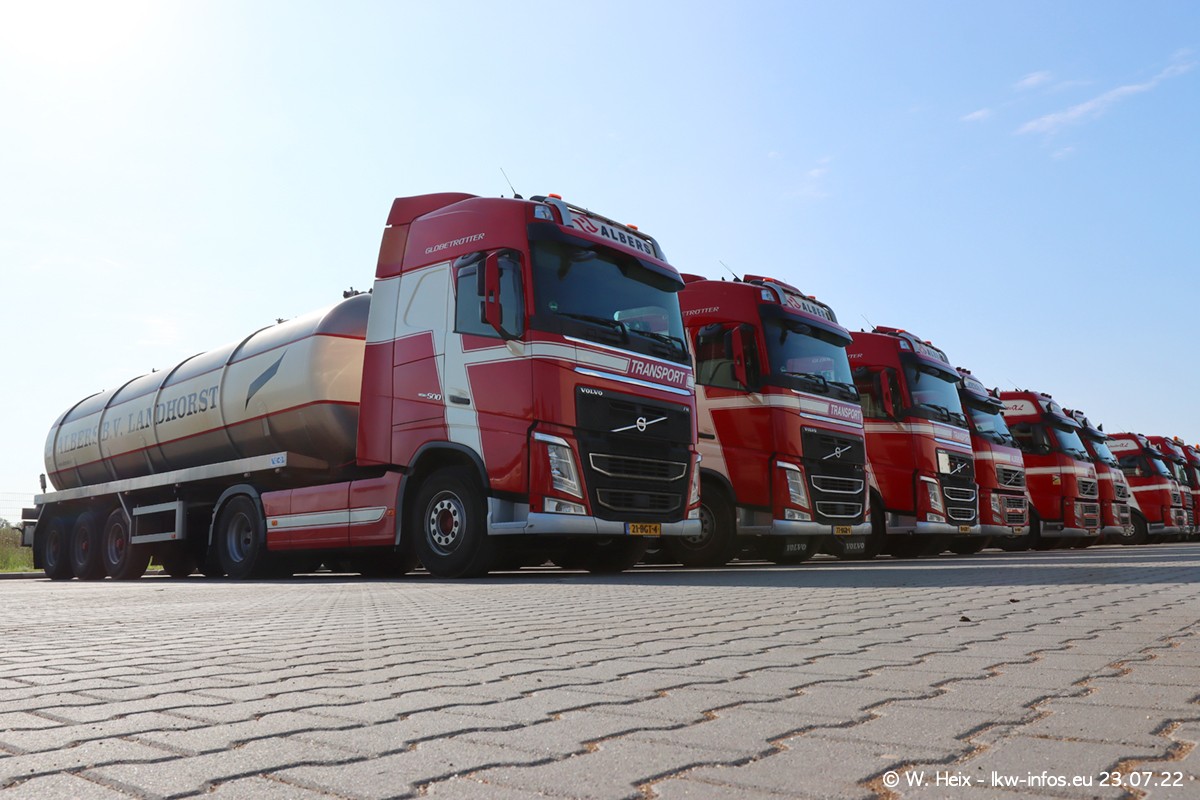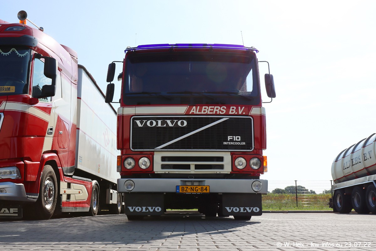 Ende 2021 ist der Fuhrpark von landhorst umgezogen nach Zeeland. Hier gibt es deutlich mehr Platz für die Fahrzeuge. Am Wochenende stehen alle LKW in einer Reihe, sortiert nach Hersteller und Alter. Ein großer Teil der LKW war zuhause. Schön, dass auch der alte VOLVO F10 samt passendem Auflieger mit auf dem Hof stand. Da die Fahrzeuge früh morgens wegen der Sonne genau falsch herum auf dem Gelände standen, war es etwas schwierig mit dem Fotografieren. Aber die Bilder sind trotzdem gut geworden.