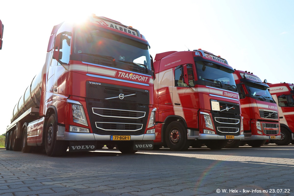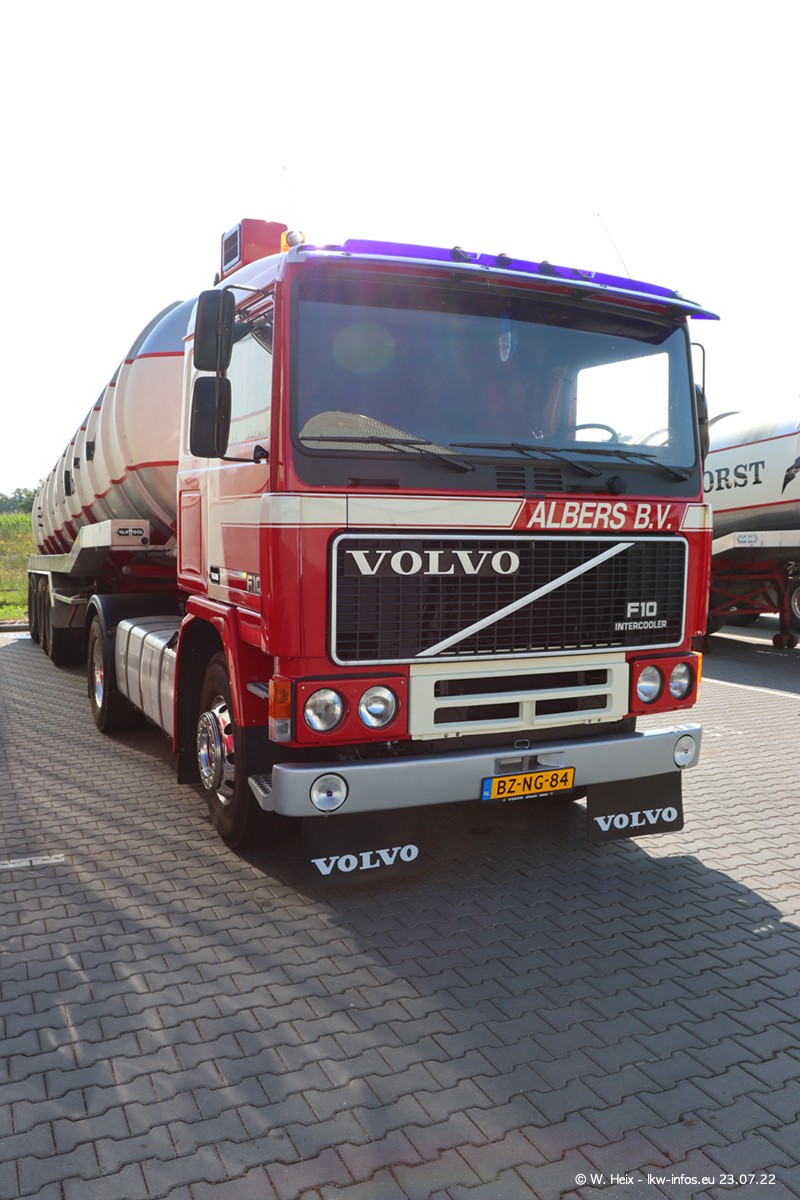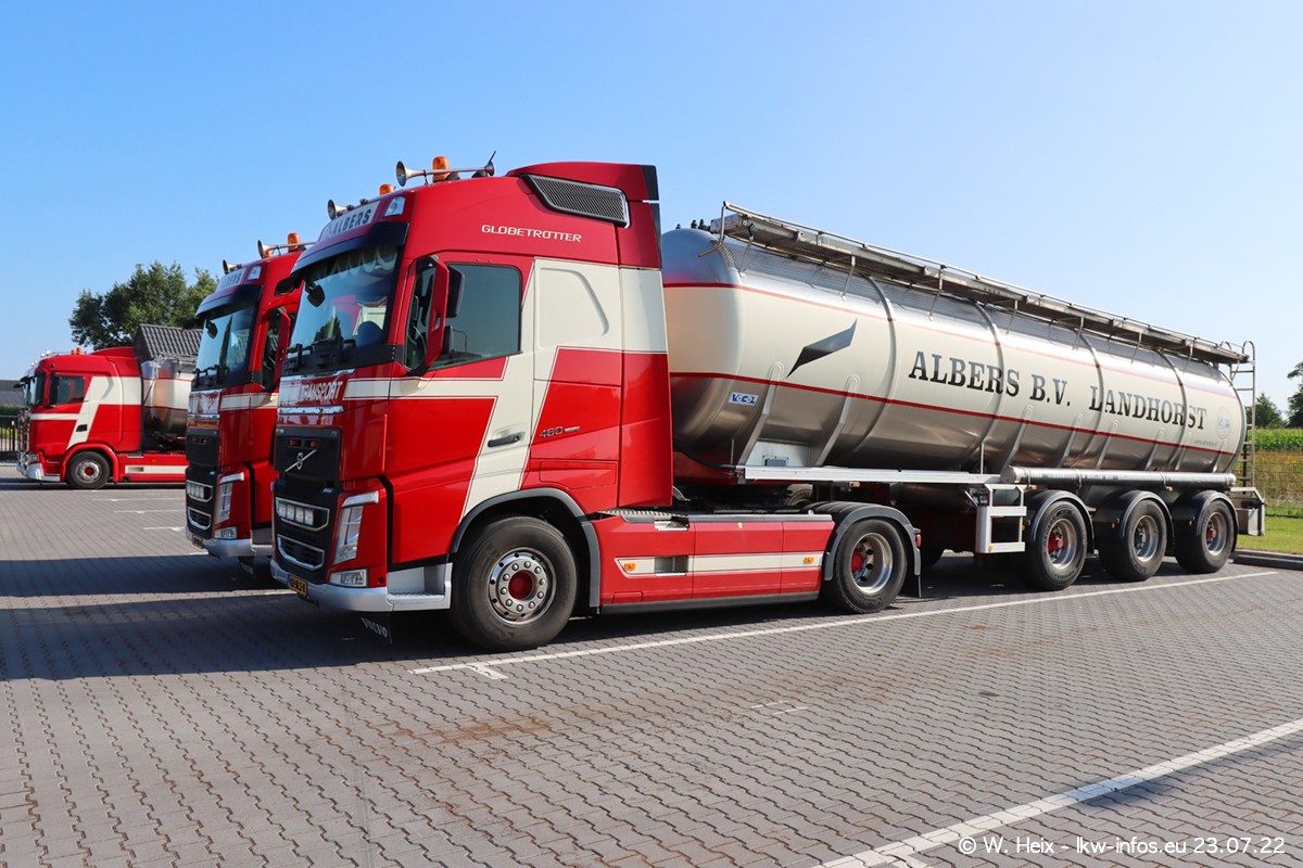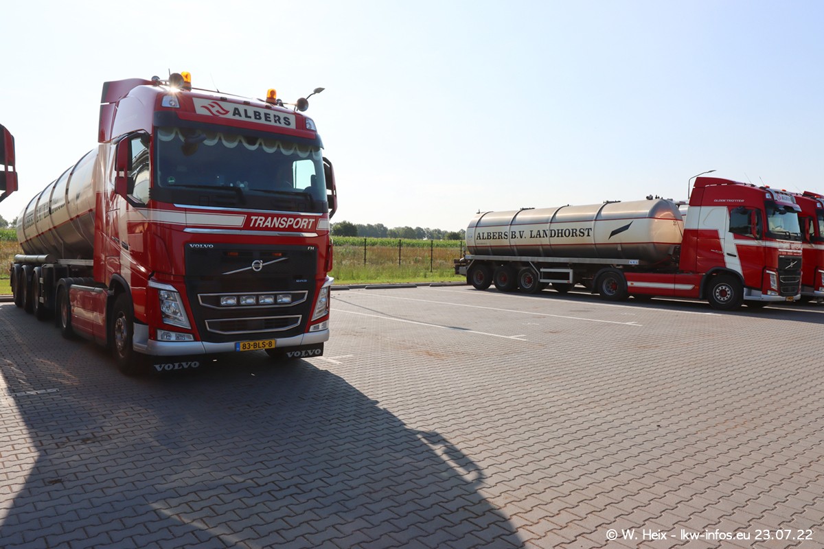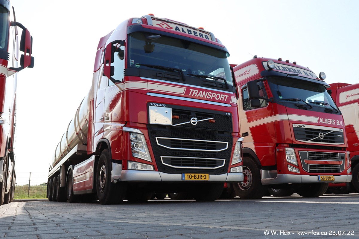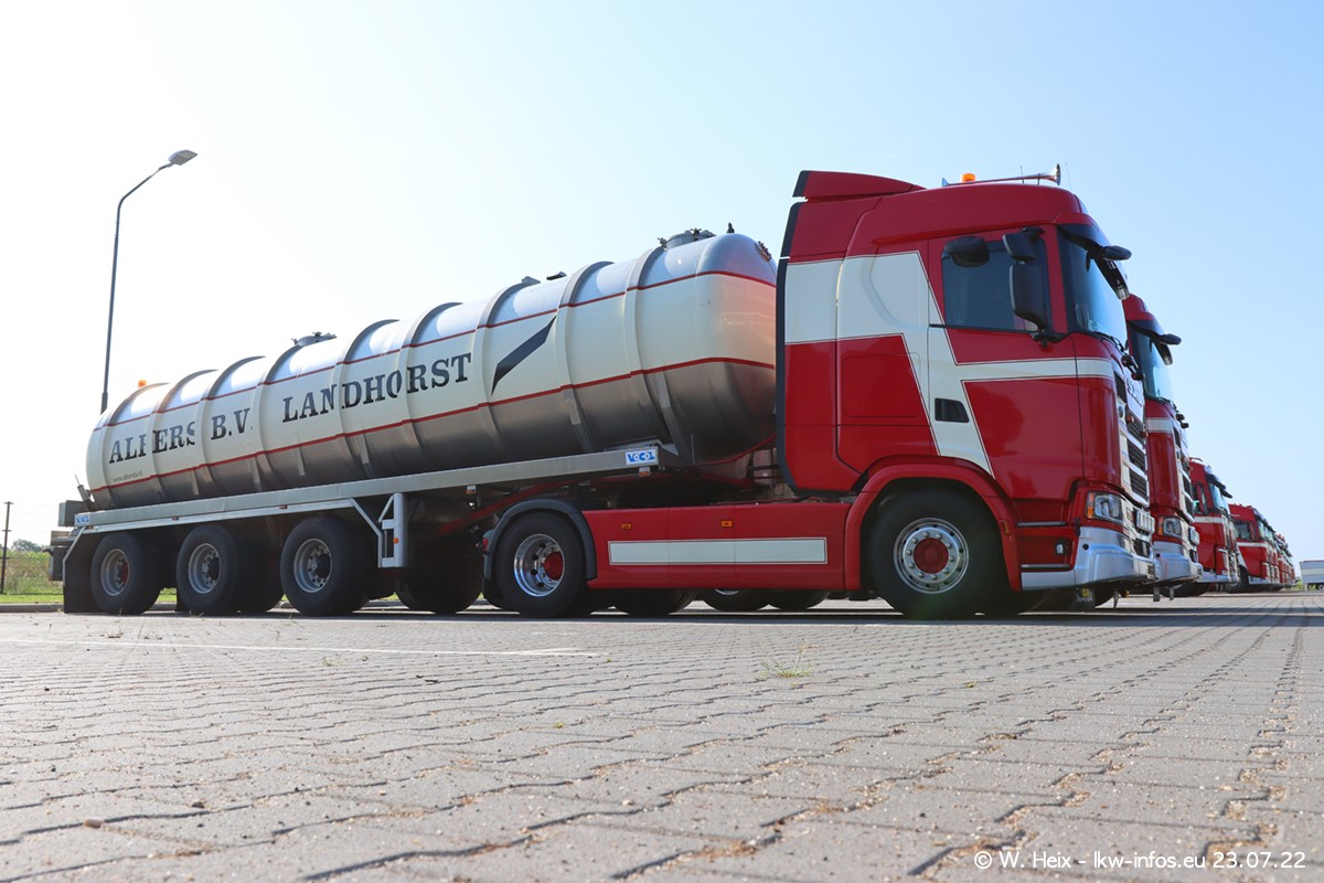 Ende 2021 ist der Fuhrpark von landhorst umgezogen nach Zeeland. Hier gibt es deutlich mehr Platz für die Fahrzeuge. Am Wochenende stehen alle LKW in einer Reihe, sortiert nach Hersteller und Alter. Ein großer Teil der LKW war zuhause. Schön, dass auch der alte VOLVO F10 samt passendem Auflieger mit auf dem Hof stand. Da die Fahrzeuge früh morgens wegen der Sonne genau falsch herum auf dem Gelände standen, war es etwas schwierig mit dem Fotografieren. Aber die Bilder sind trotzdem gut geworden.