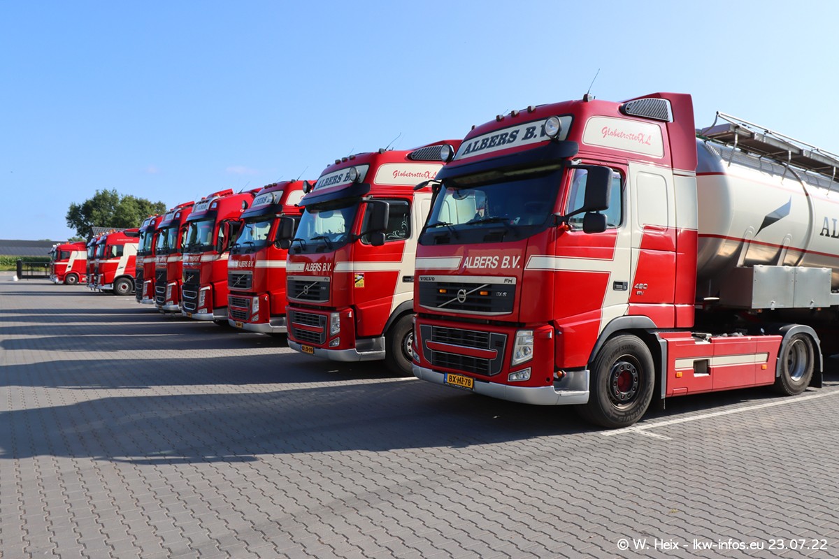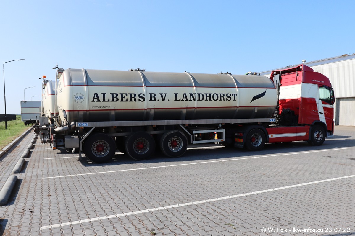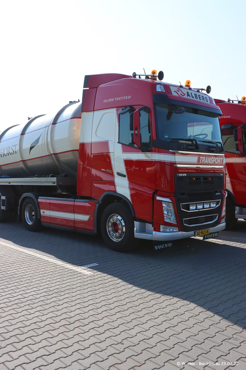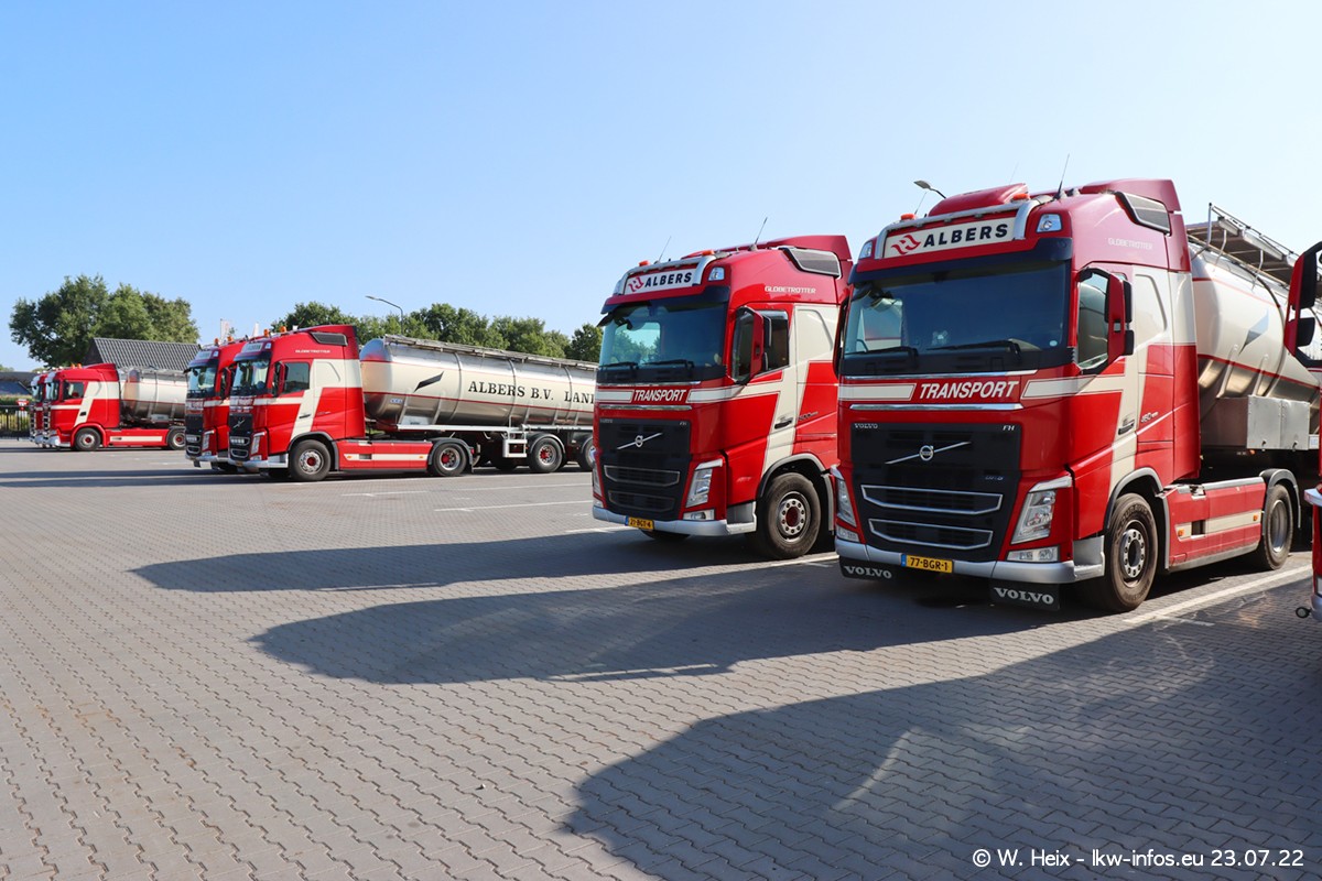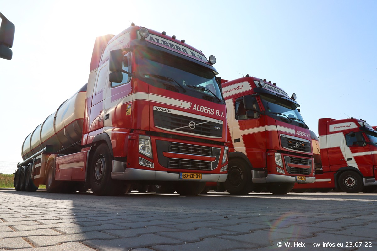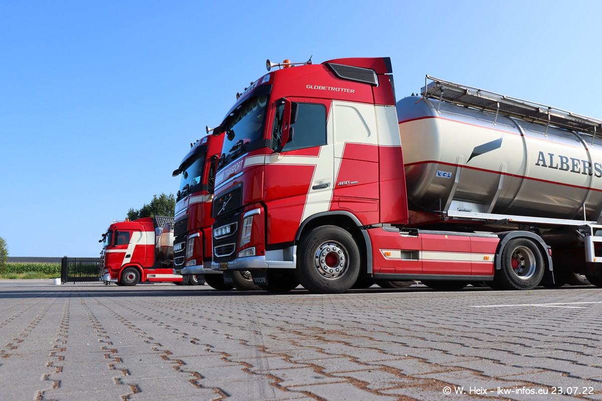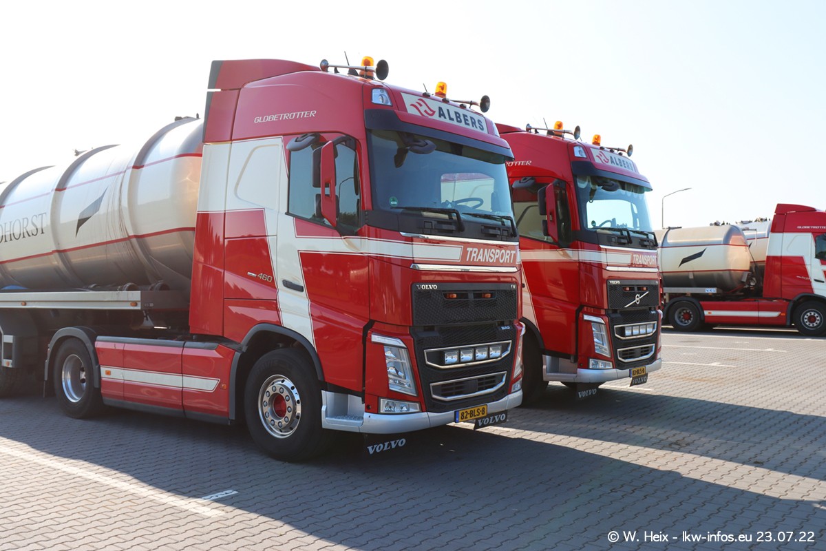 Ende 2021 ist der Fuhrpark von landhorst umgezogen nach Zeeland. Hier gibt es deutlich mehr Platz für die Fahrzeuge. Am Wochenende stehen alle LKW in einer Reihe, sortiert nach Hersteller und Alter. Ein großer Teil der LKW war zuhause. Schön, dass auch der alte VOLVO F10 samt passendem Auflieger mit auf dem Hof stand. Da die Fahrzeuge früh morgens wegen der Sonne genau falsch herum auf dem Gelände standen, war es etwas schwierig mit dem Fotografieren. Aber die Bilder sind trotzdem gut geworden.