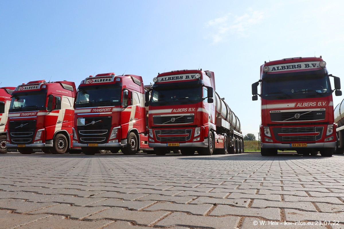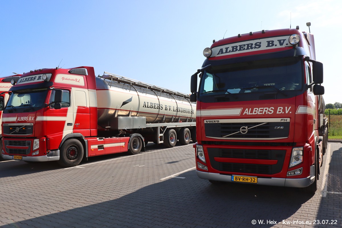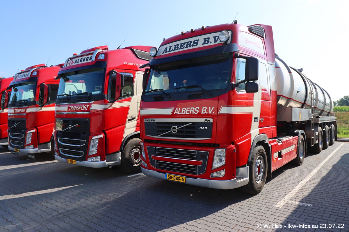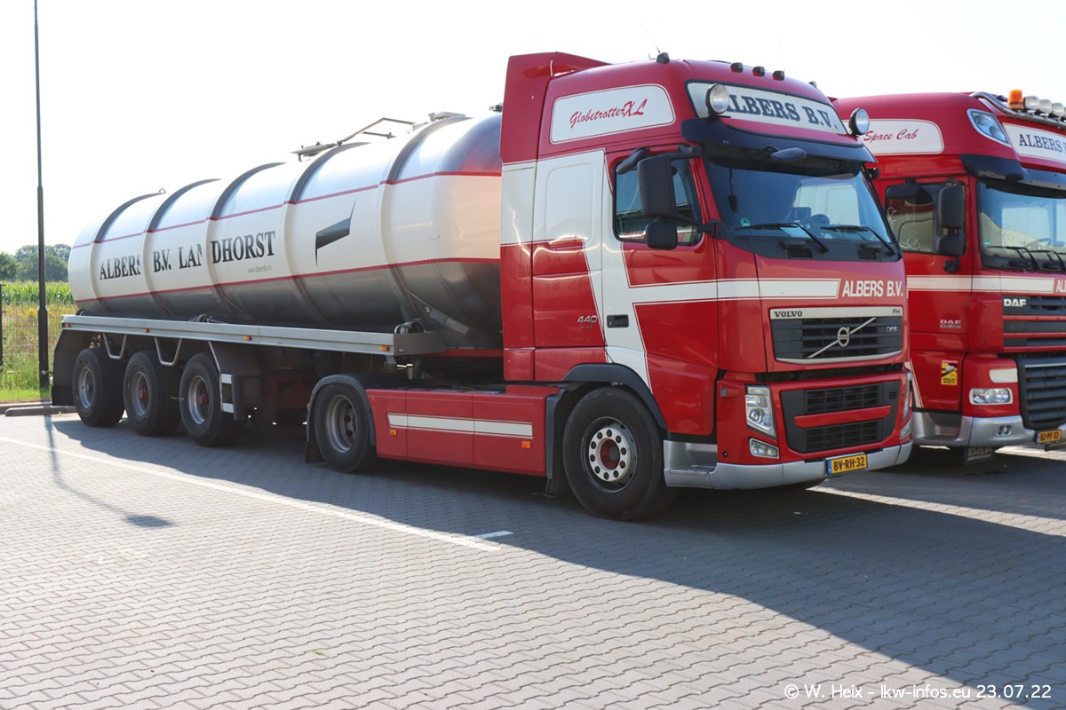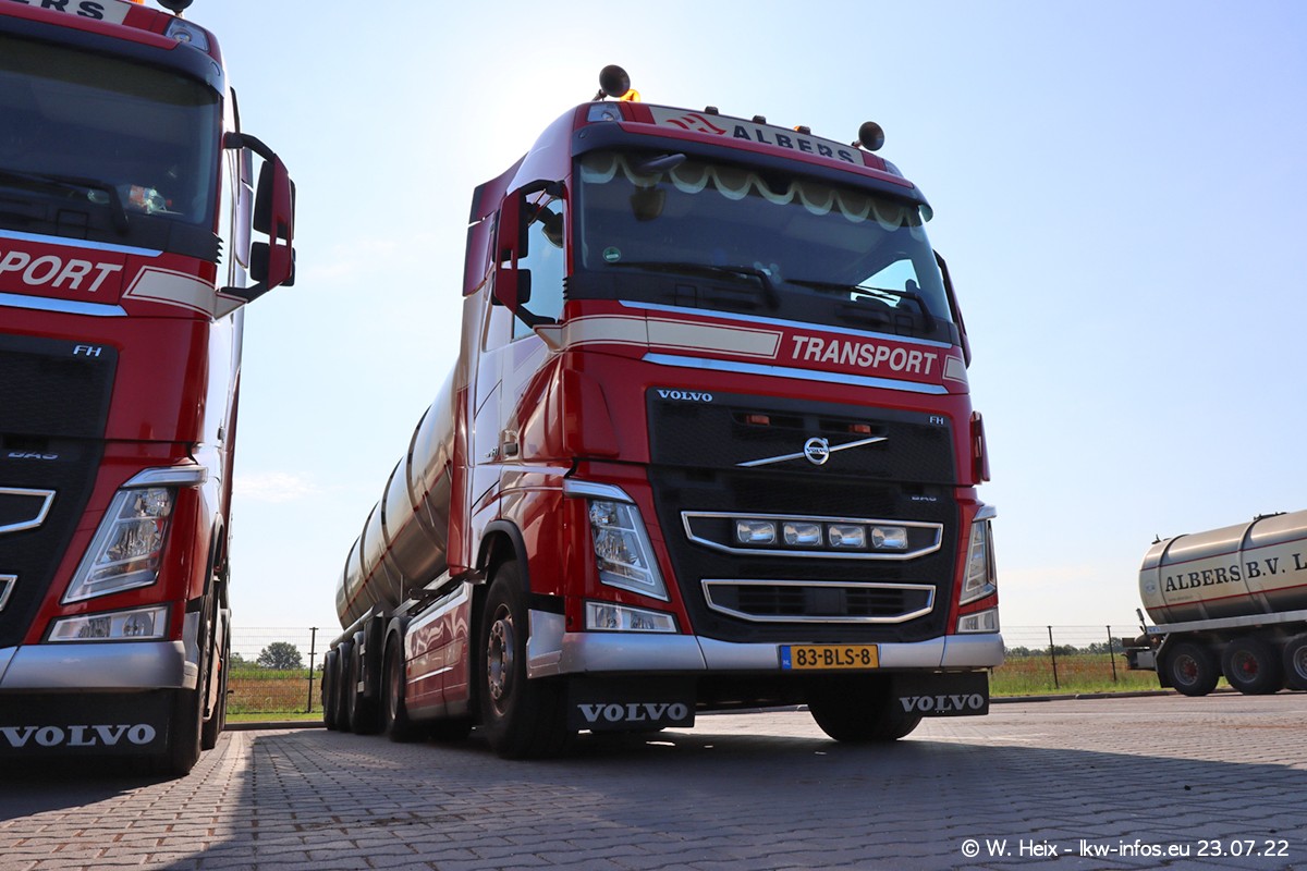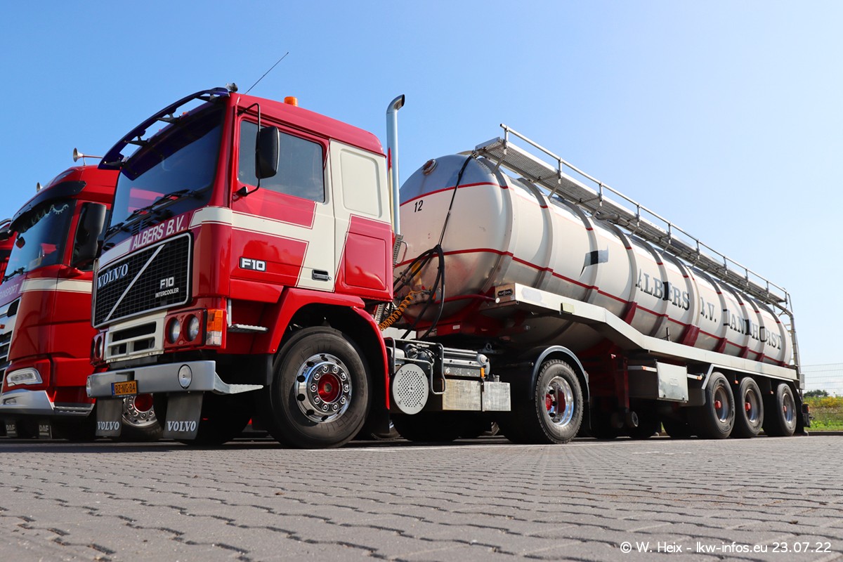 Ende 2021 ist der Fuhrpark von landhorst umgezogen nach Zeeland. Hier gibt es deutlich mehr Platz für die Fahrzeuge. Am Wochenende stehen alle LKW in einer Reihe, sortiert nach Hersteller und Alter. Ein großer Teil der LKW war zuhause. Schön, dass auch der alte VOLVO F10 samt passendem Auflieger mit auf dem Hof stand. Da die Fahrzeuge früh morgens wegen der Sonne genau falsch herum auf dem Gelände standen, war es etwas schwierig mit dem Fotografieren. Aber die Bilder sind trotzdem gut geworden.