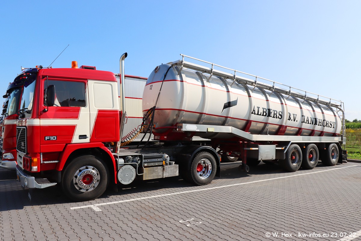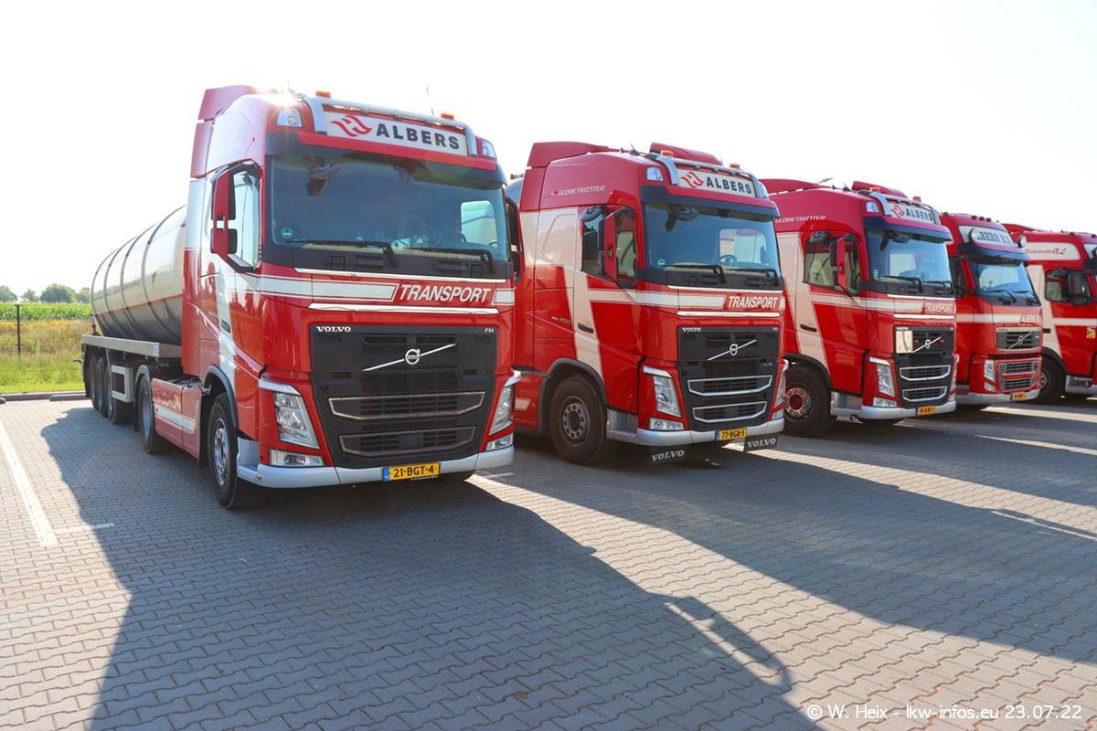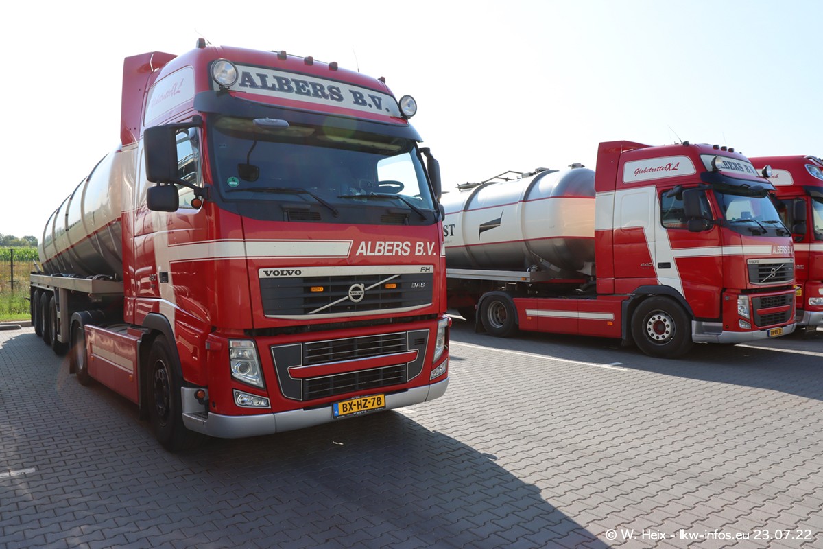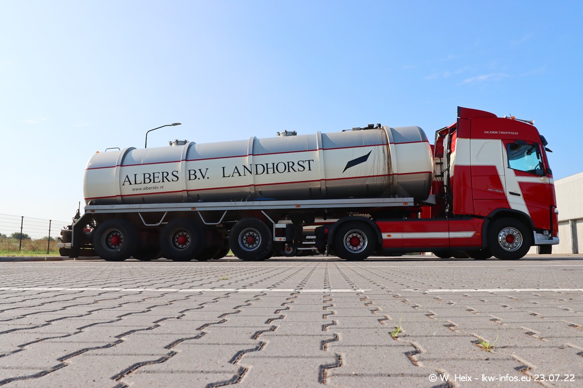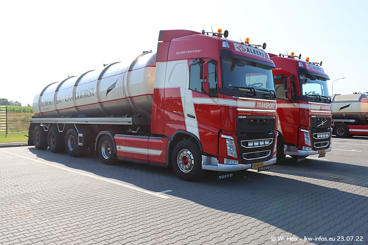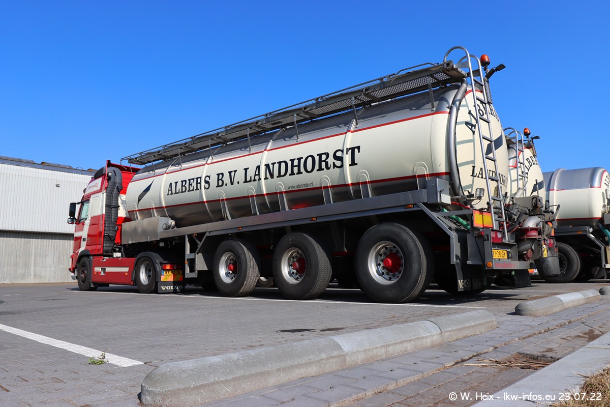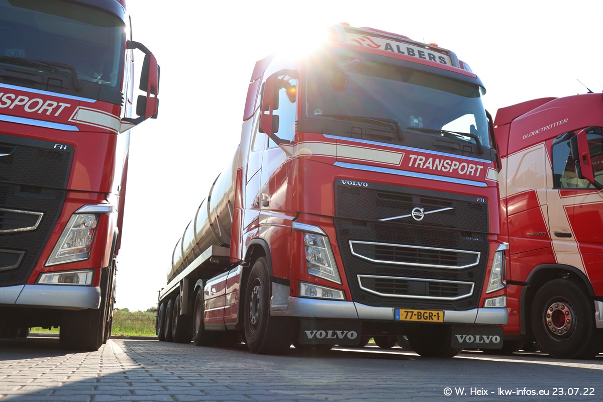 Ende 2021 ist der Fuhrpark von landhorst umgezogen nach Zeeland. Hier gibt es deutlich mehr Platz für die Fahrzeuge. Am Wochenende stehen alle LKW in einer Reihe, sortiert nach Hersteller und Alter. Ein großer Teil der LKW war zuhause. Schön, dass auch der alte VOLVO F10 samt passendem Auflieger mit auf dem Hof stand. Da die Fahrzeuge früh morgens wegen der Sonne genau falsch herum auf dem Gelände standen, war es etwas schwierig mit dem Fotografieren. Aber die Bilder sind trotzdem gut geworden.