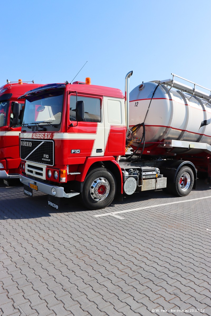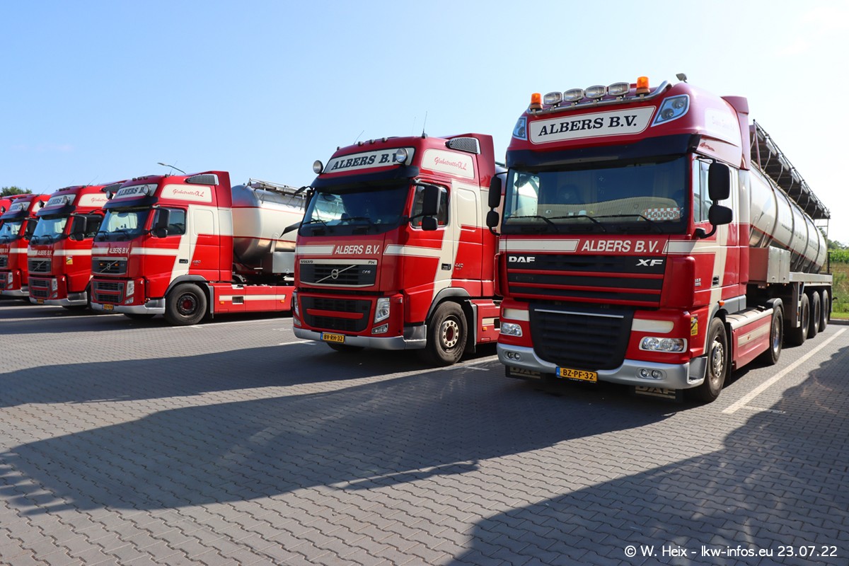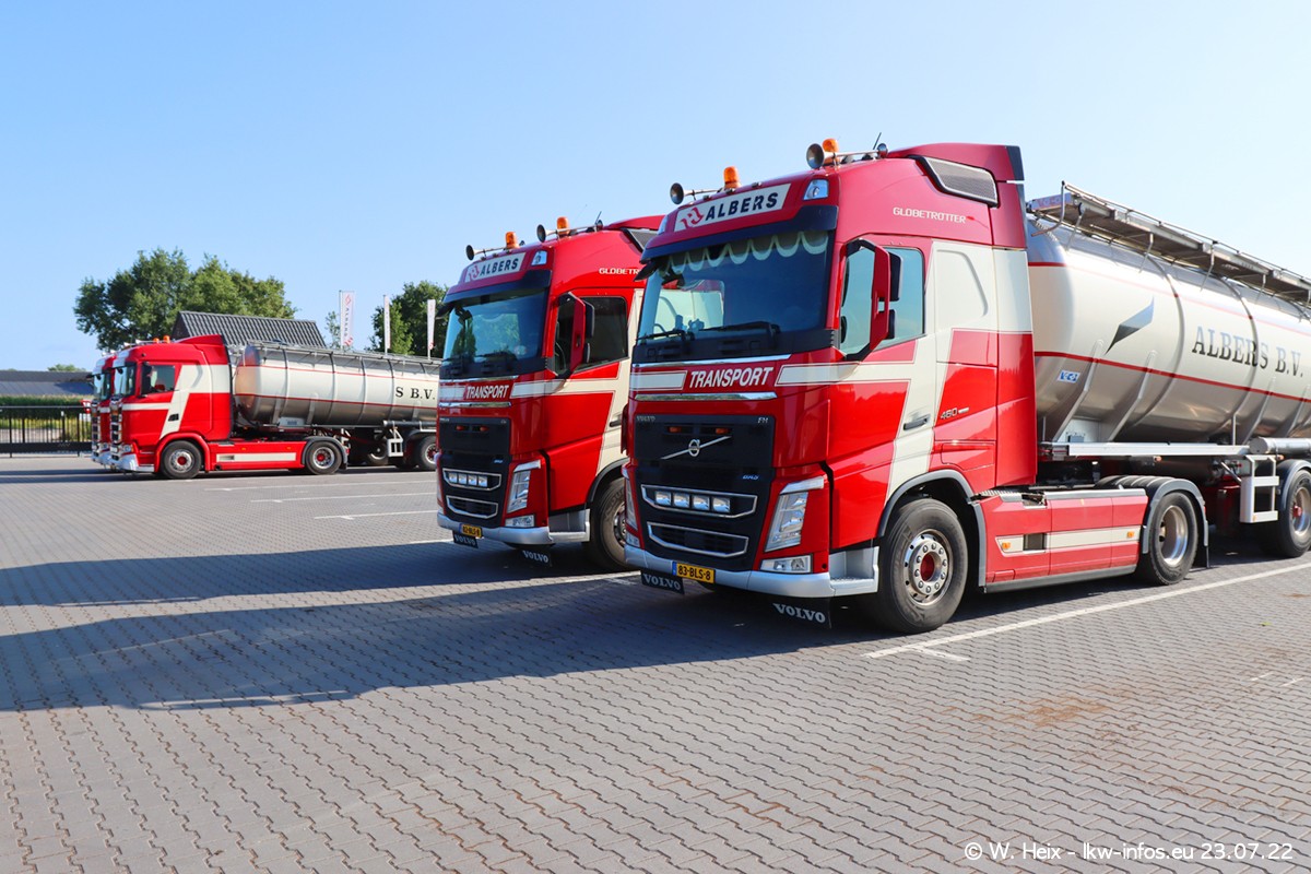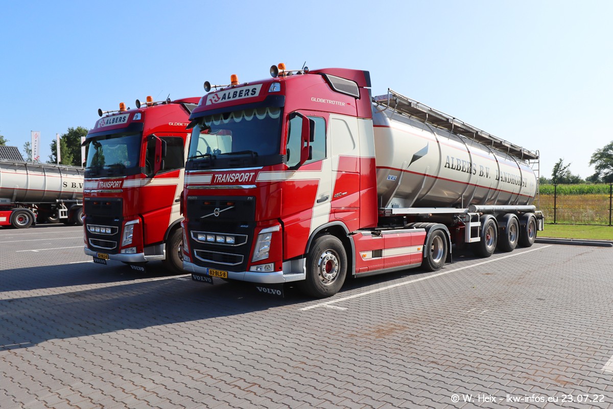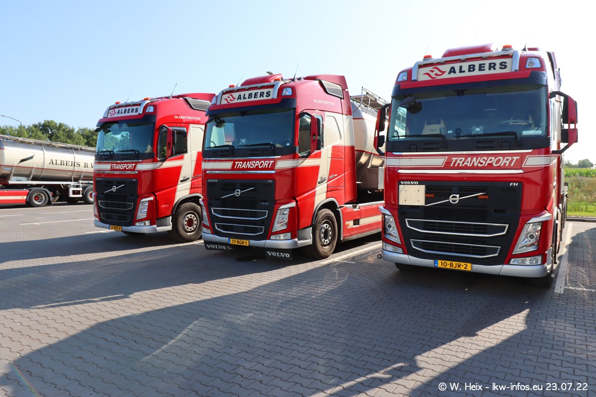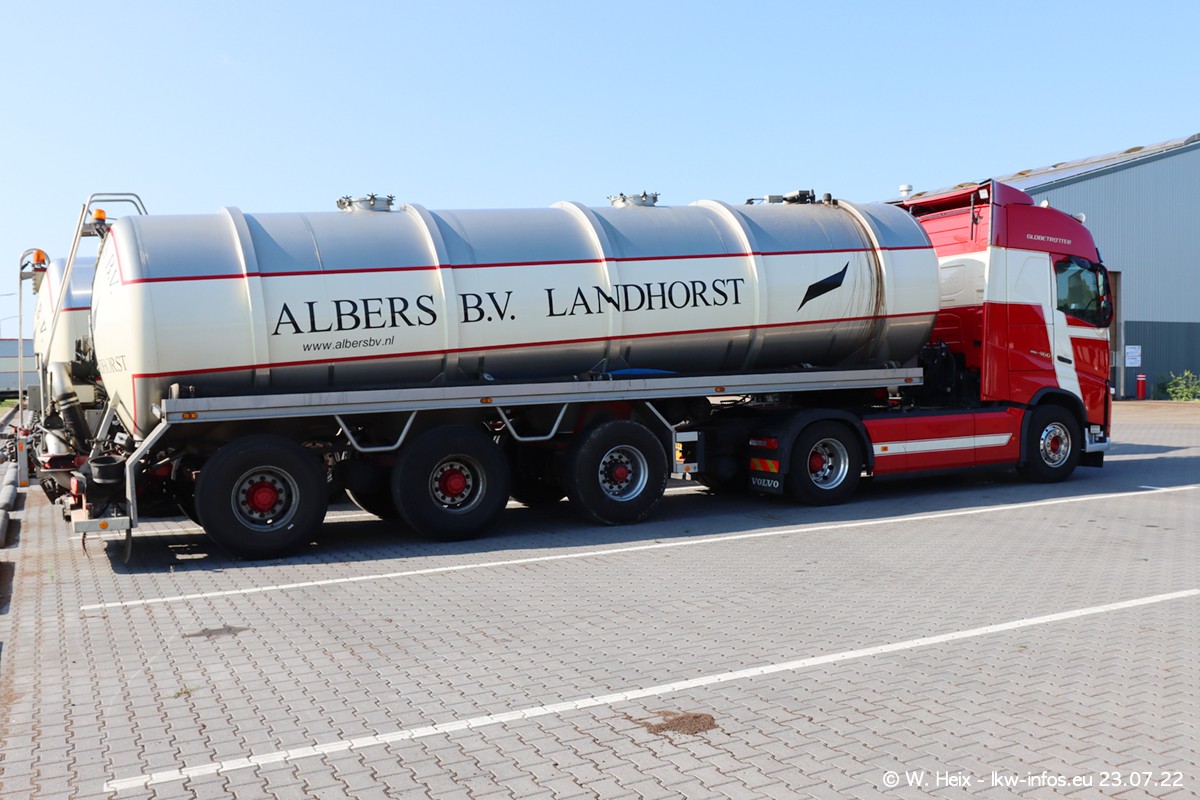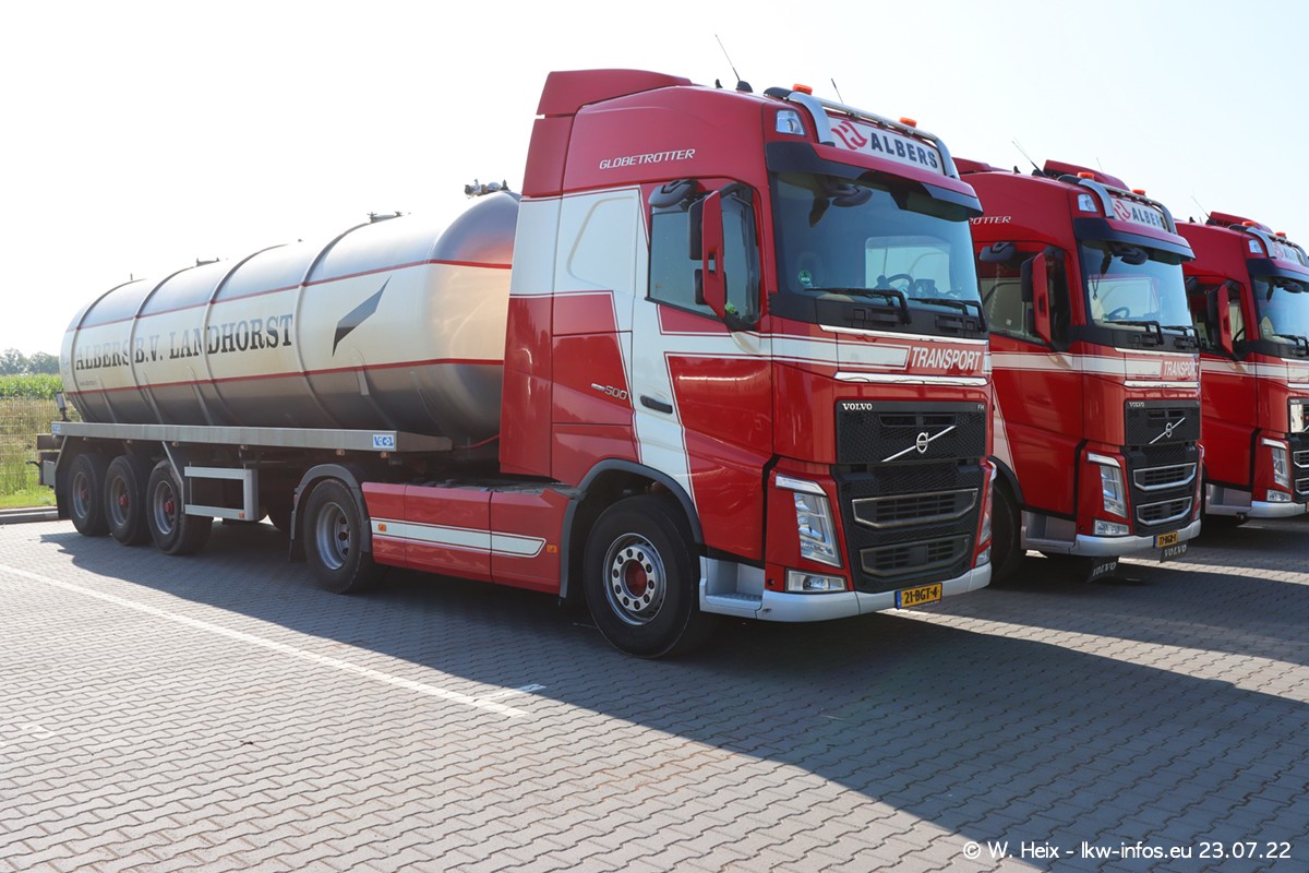 Ende 2021 ist der Fuhrpark von landhorst umgezogen nach Zeeland. Hier gibt es deutlich mehr Platz für die Fahrzeuge. Am Wochenende stehen alle LKW in einer Reihe, sortiert nach Hersteller und Alter. Ein großer Teil der LKW war zuhause. Schön, dass auch der alte VOLVO F10 samt passendem Auflieger mit auf dem Hof stand. Da die Fahrzeuge früh morgens wegen der Sonne genau falsch herum auf dem Gelände standen, war es etwas schwierig mit dem Fotografieren. Aber die Bilder sind trotzdem gut geworden.