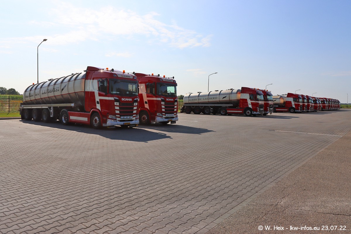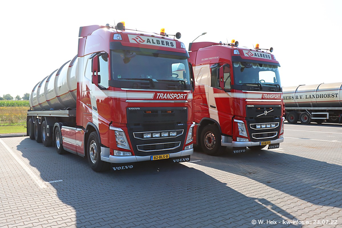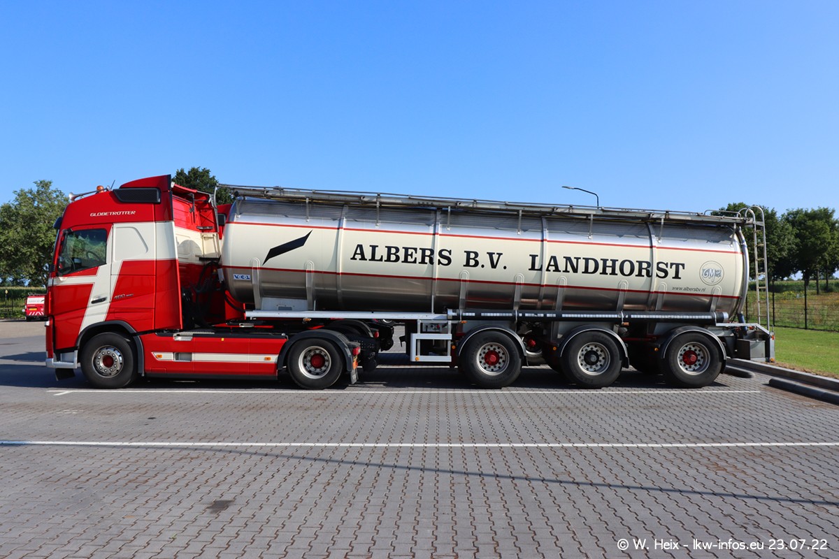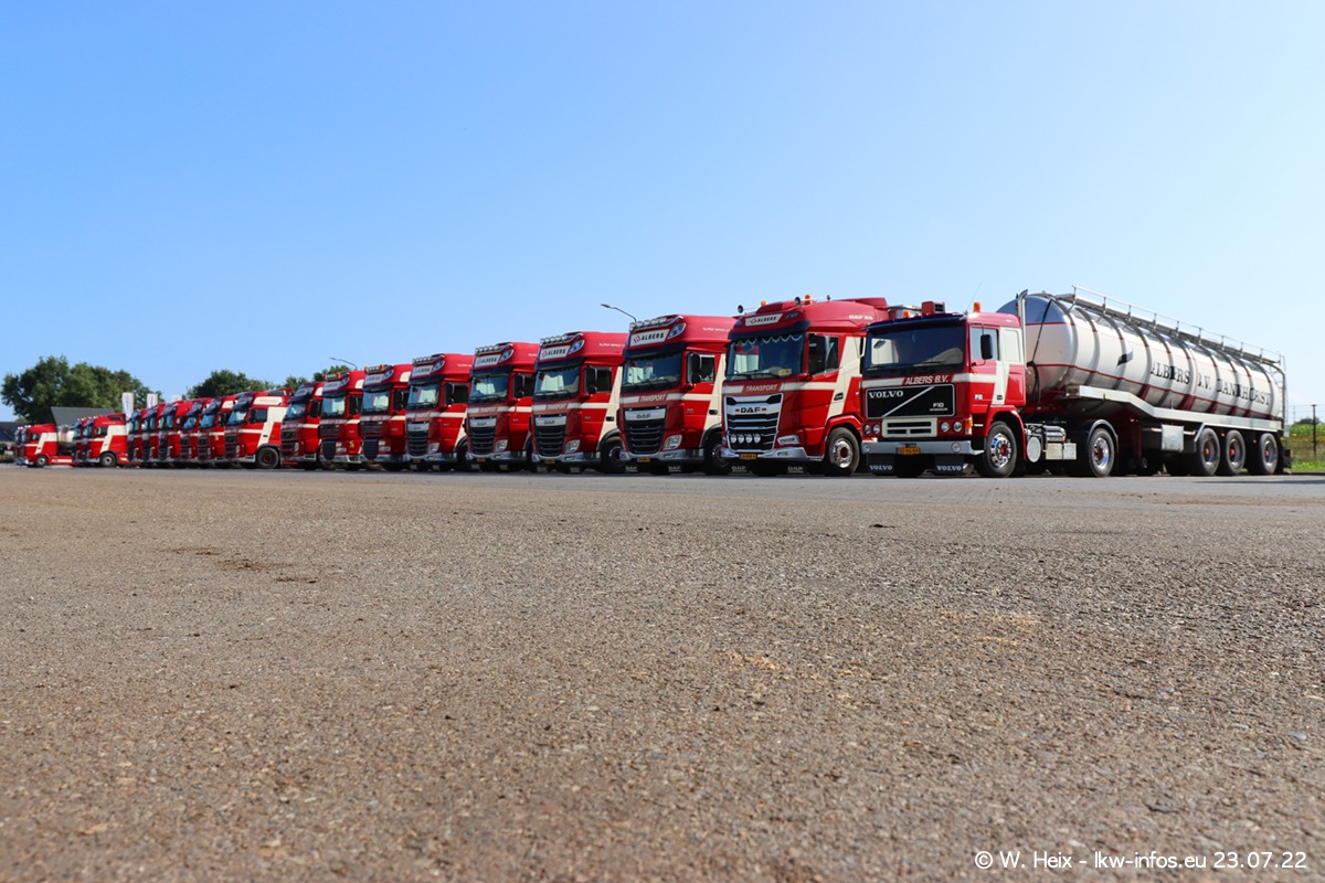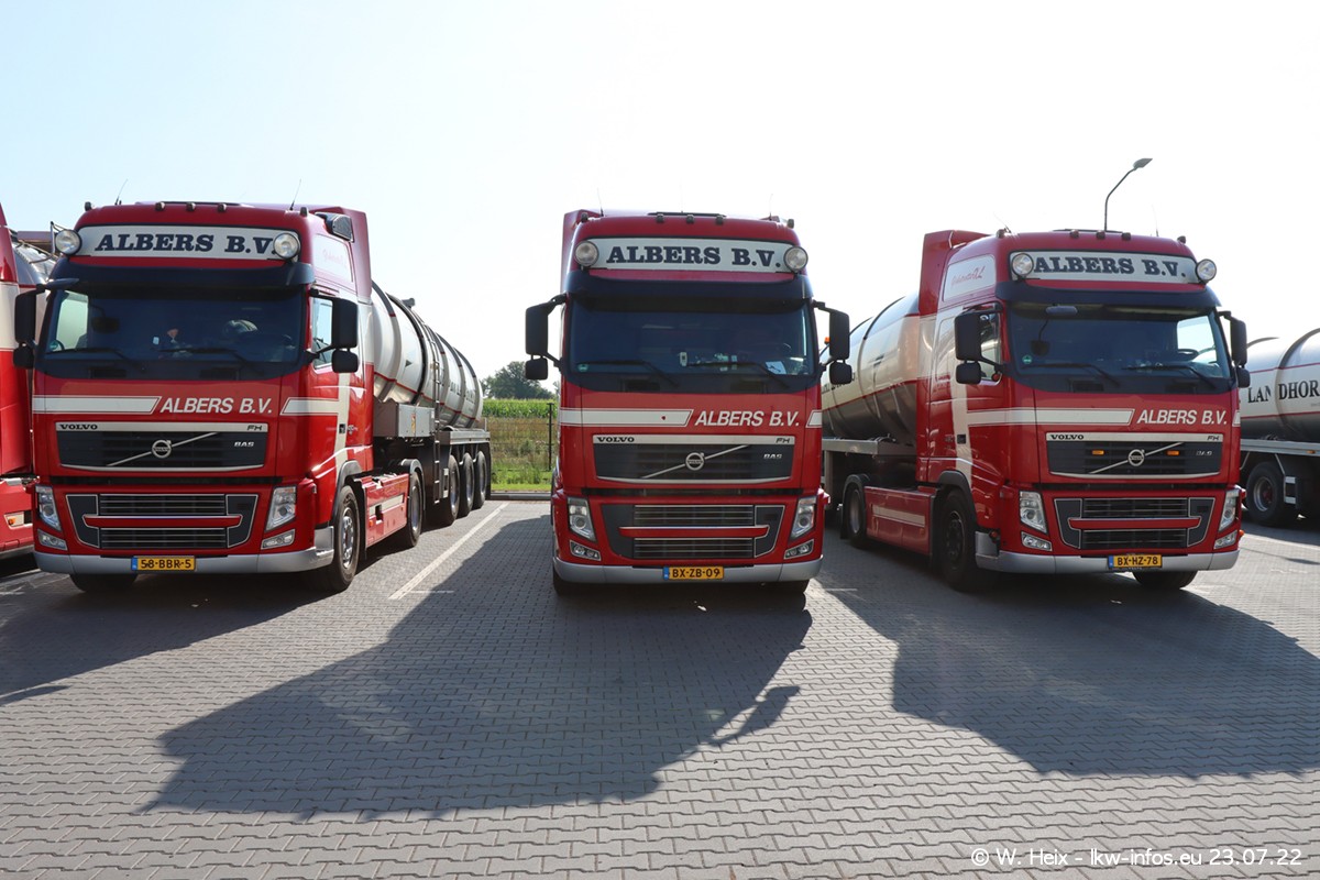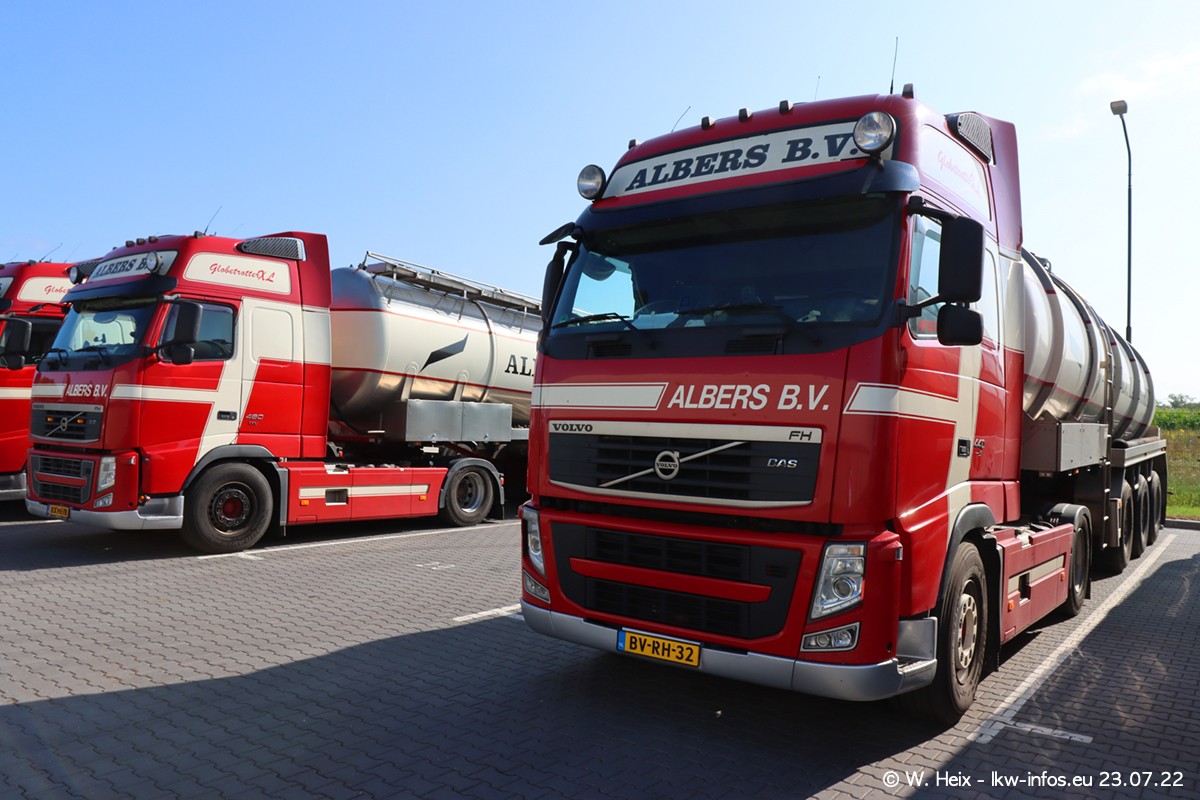 Ende 2021 ist der Fuhrpark von landhorst umgezogen nach Zeeland. Hier gibt es deutlich mehr Platz für die Fahrzeuge. Am Wochenende stehen alle LKW in einer Reihe, sortiert nach Hersteller und Alter. Ein großer Teil der LKW war zuhause. Schön, dass auch der alte VOLVO F10 samt passendem Auflieger mit auf dem Hof stand. Da die Fahrzeuge früh morgens wegen der Sonne genau falsch herum auf dem Gelände standen, war es etwas schwierig mit dem Fotografieren. Aber die Bilder sind trotzdem gut geworden.