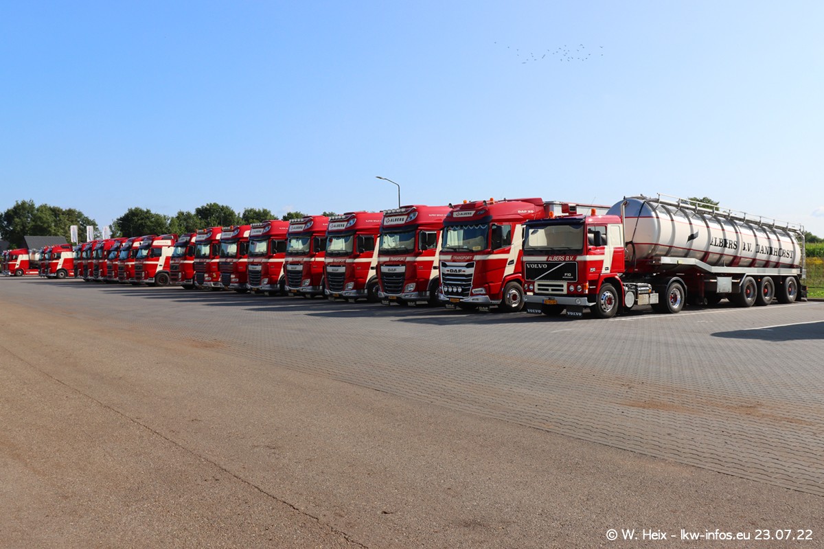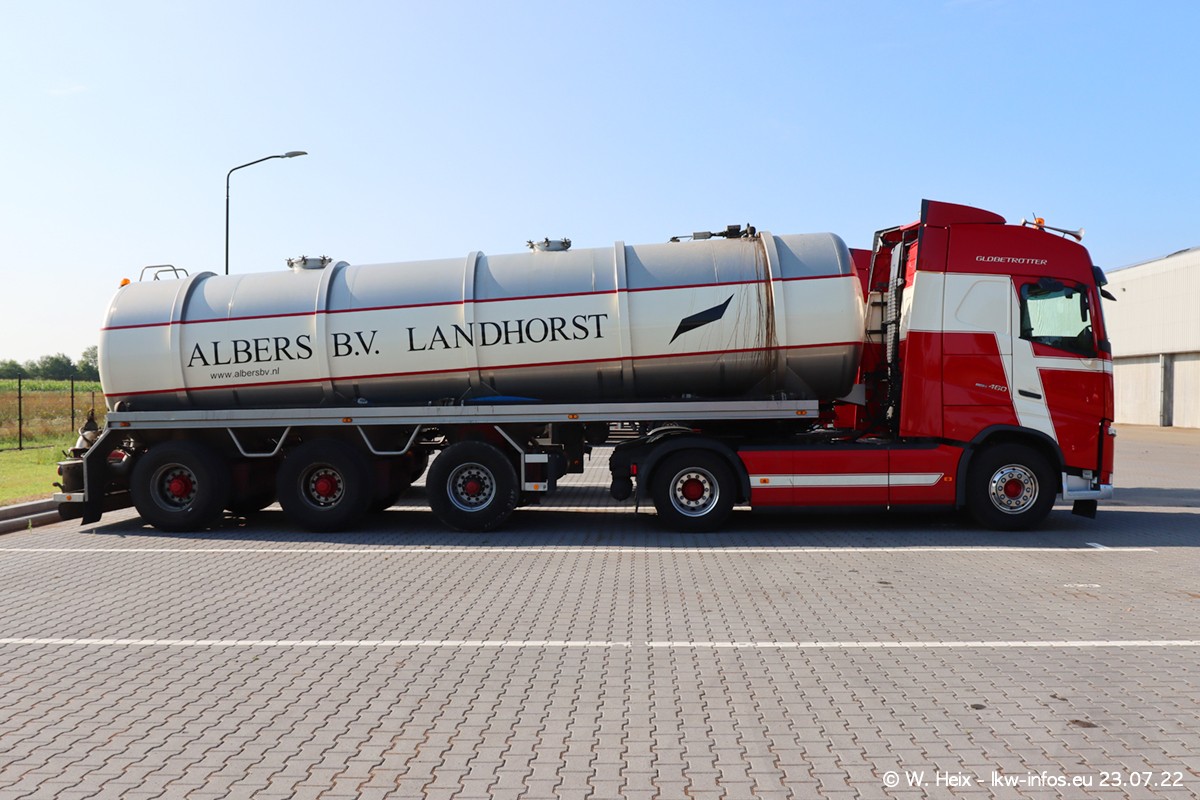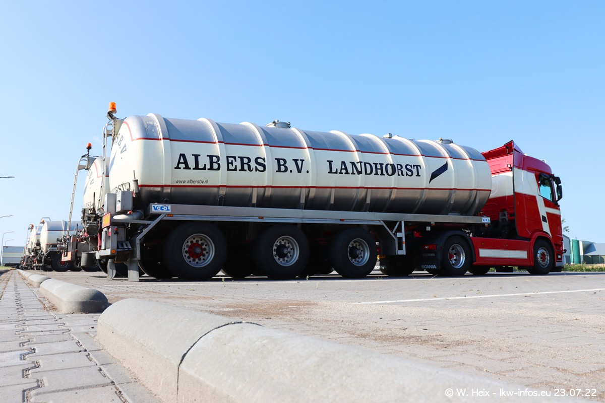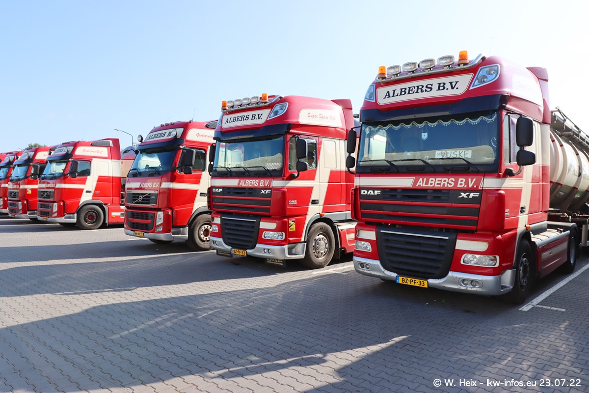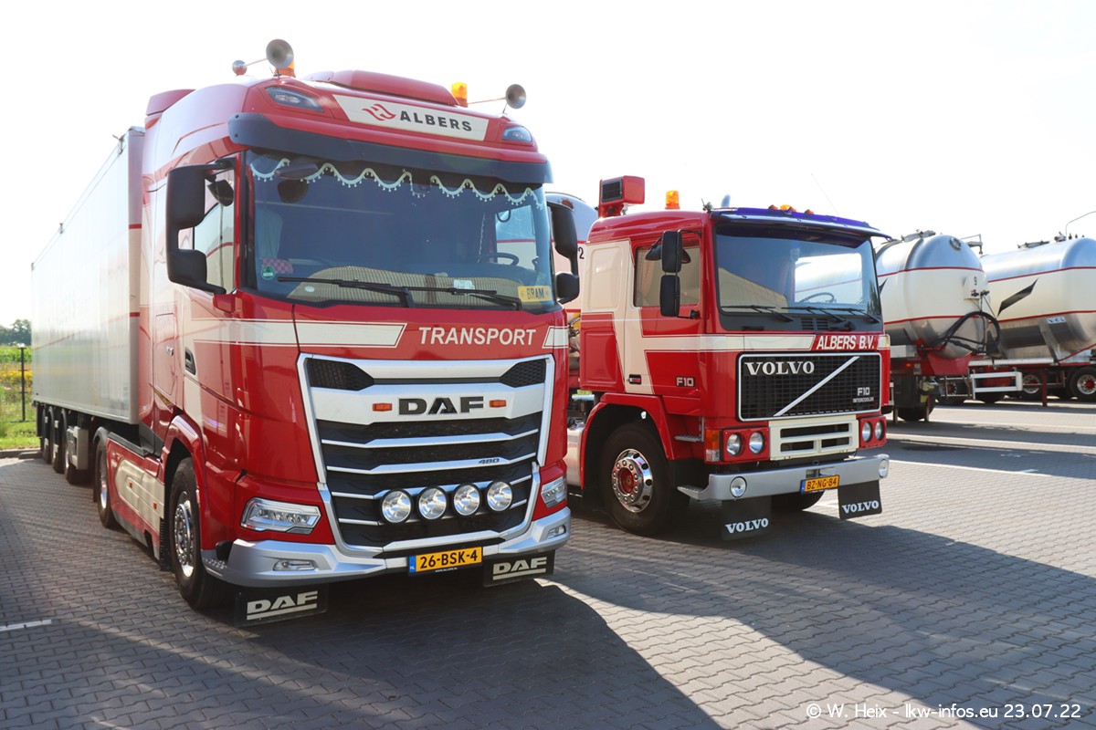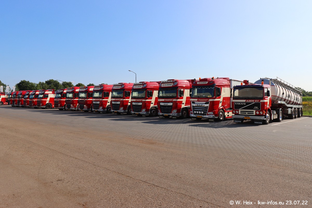 Ende 2021 ist der Fuhrpark von landhorst umgezogen nach Zeeland. Hier gibt es deutlich mehr Platz für die Fahrzeuge. Am Wochenende stehen alle LKW in einer Reihe, sortiert nach Hersteller und Alter. Ein großer Teil der LKW war zuhause. Schön, dass auch der alte VOLVO F10 samt passendem Auflieger mit auf dem Hof stand. Da die Fahrzeuge früh morgens wegen der Sonne genau falsch herum auf dem Gelände standen, war es etwas schwierig mit dem Fotografieren. Aber die Bilder sind trotzdem gut geworden.