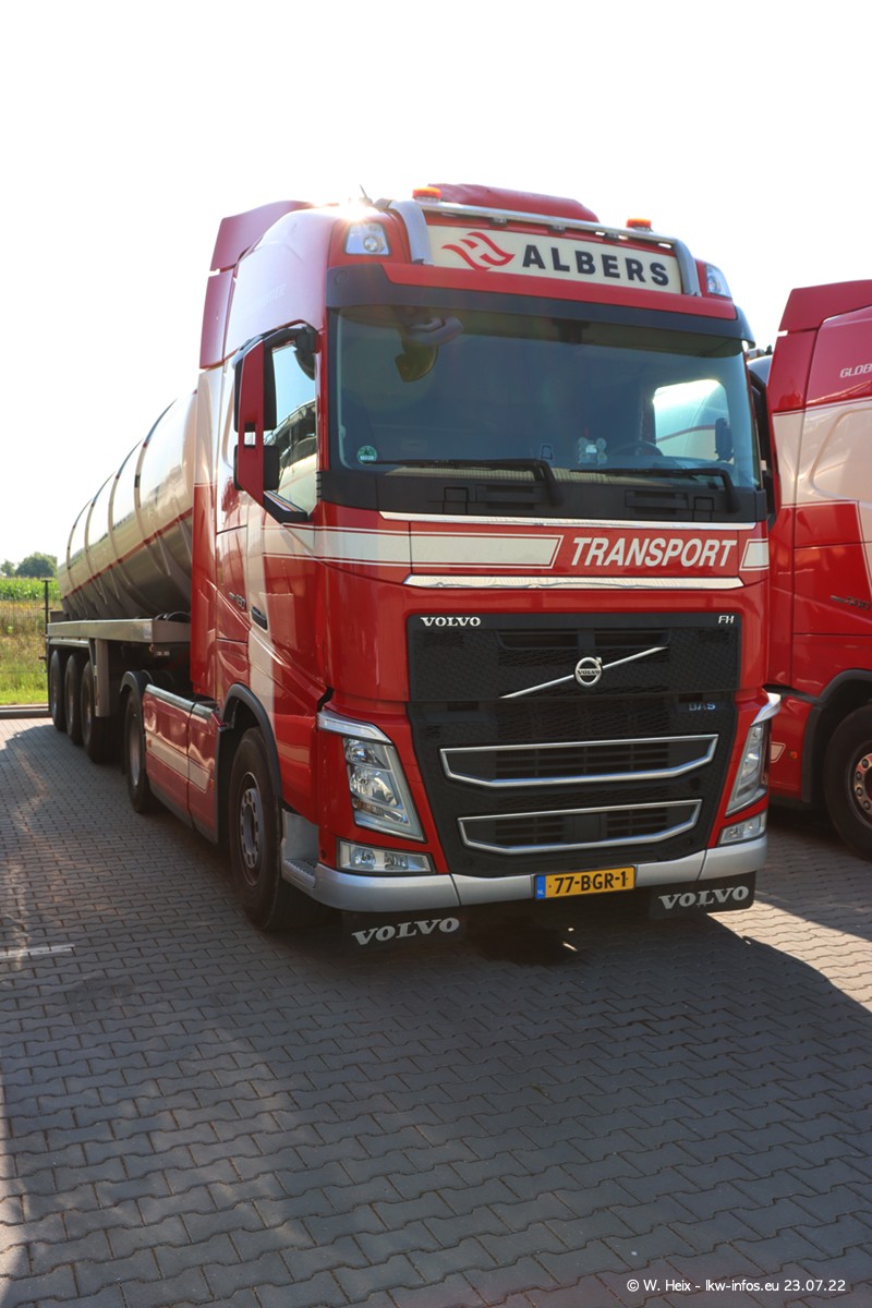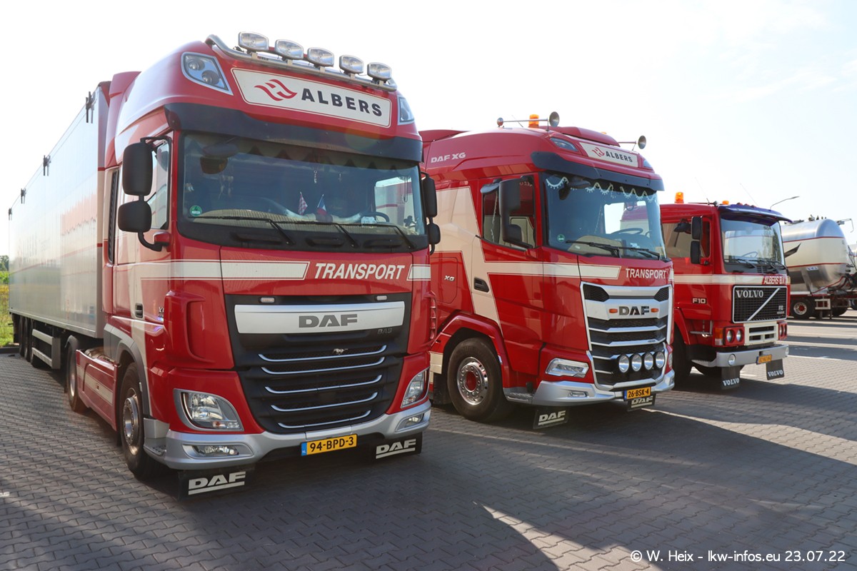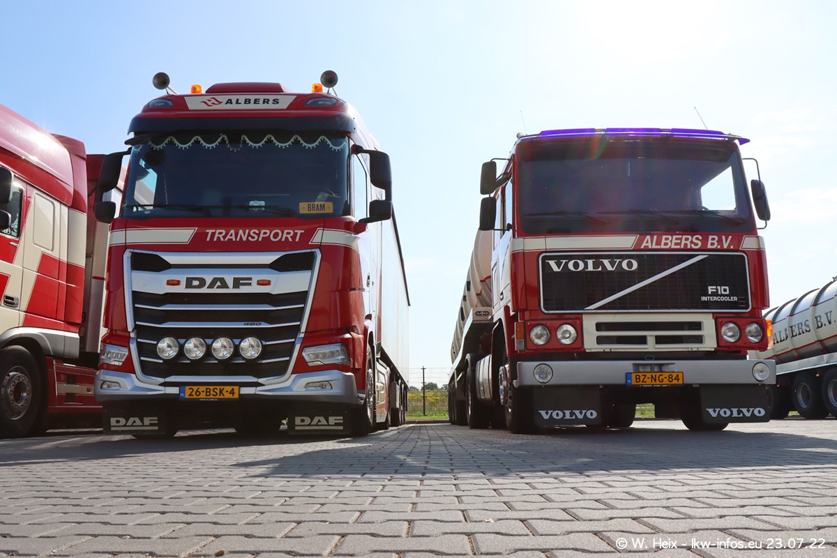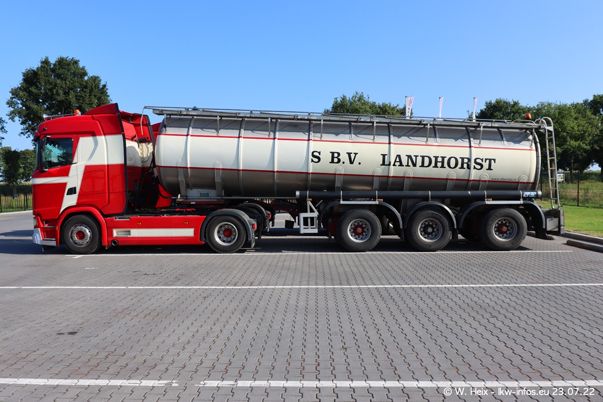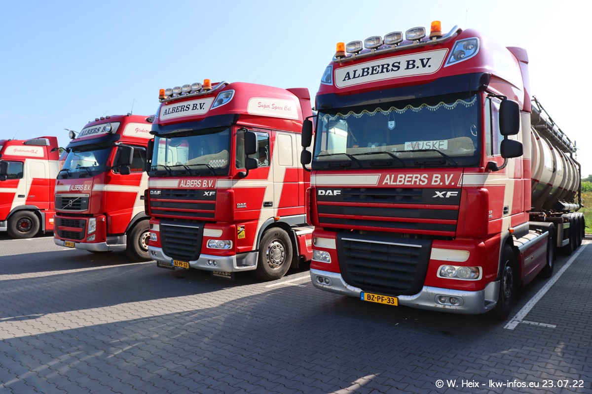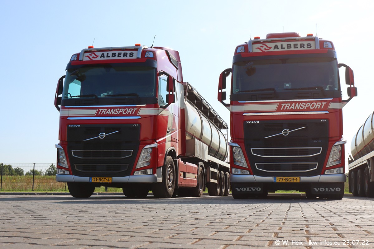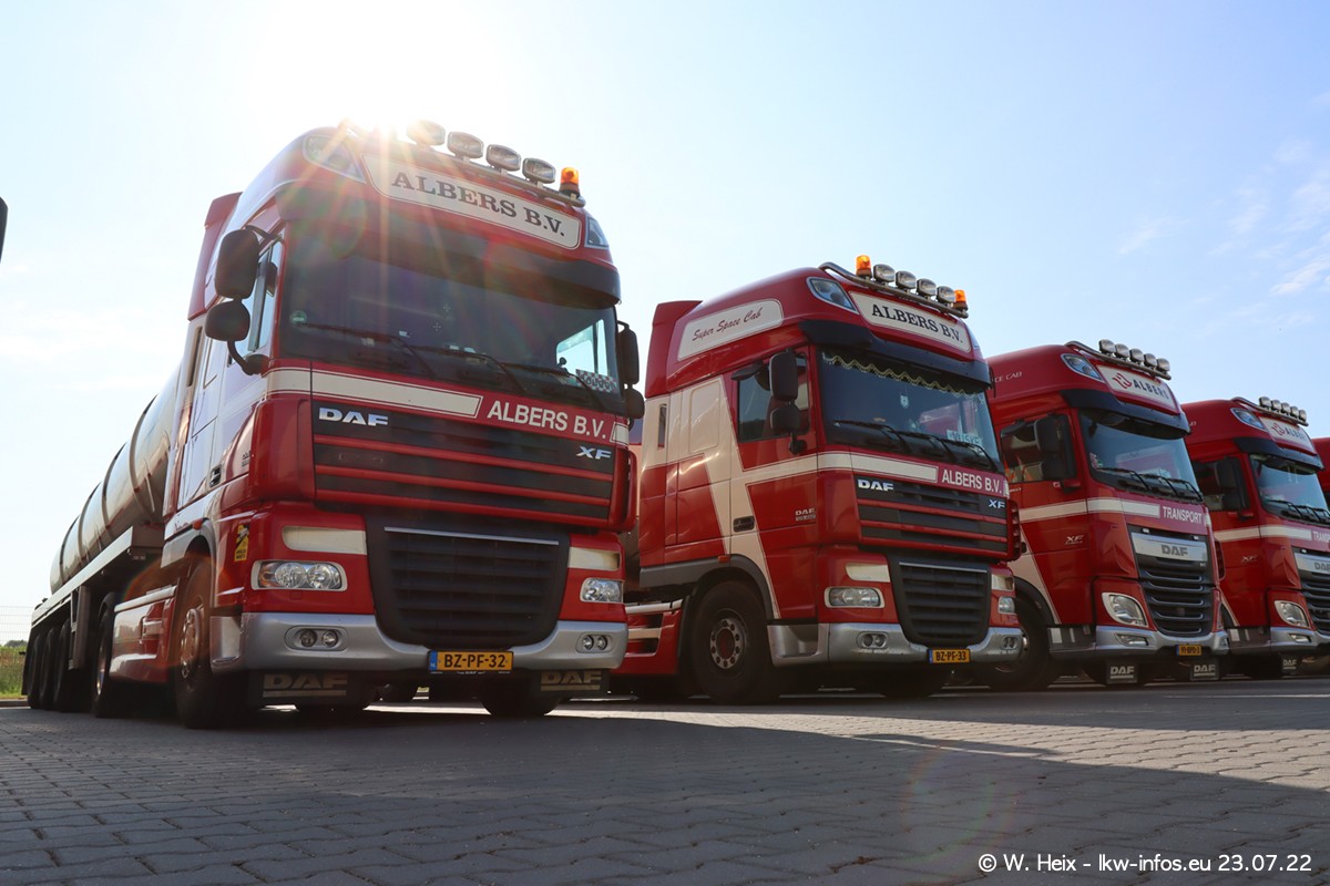 Ende 2021 ist der Fuhrpark von landhorst umgezogen nach Zeeland. Hier gibt es deutlich mehr Platz für die Fahrzeuge. Am Wochenende stehen alle LKW in einer Reihe, sortiert nach Hersteller und Alter. Ein großer Teil der LKW war zuhause. Schön, dass auch der alte VOLVO F10 samt passendem Auflieger mit auf dem Hof stand. Da die Fahrzeuge früh morgens wegen der Sonne genau falsch herum auf dem Gelände standen, war es etwas schwierig mit dem Fotografieren. Aber die Bilder sind trotzdem gut geworden.