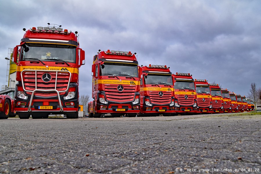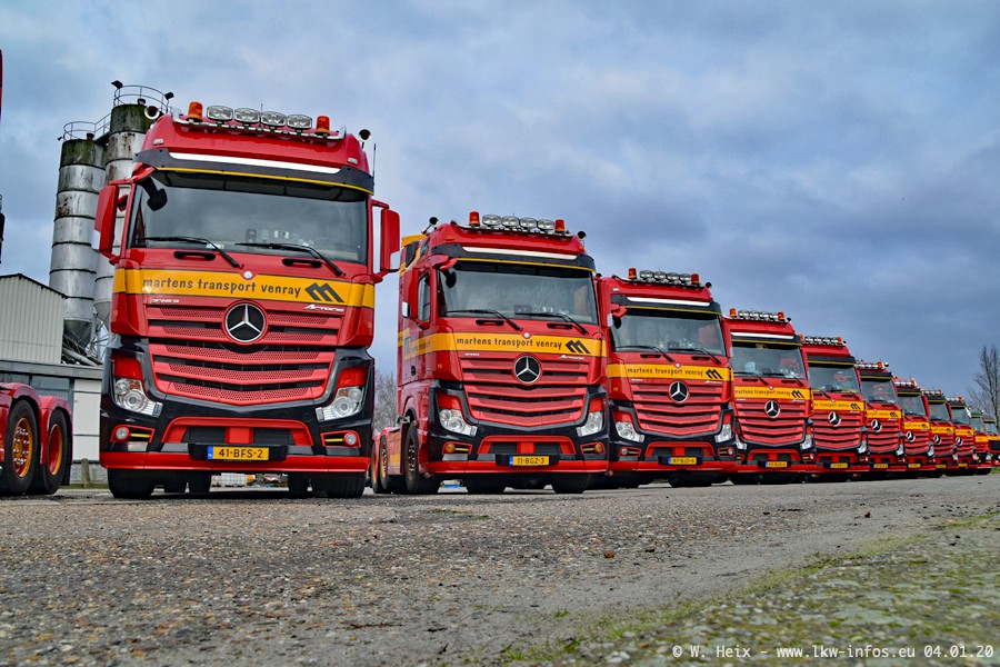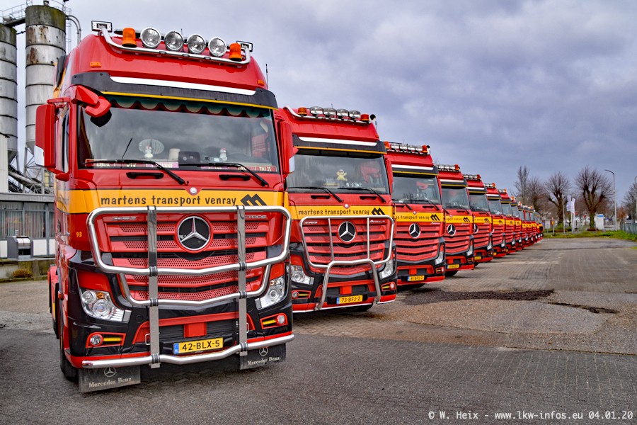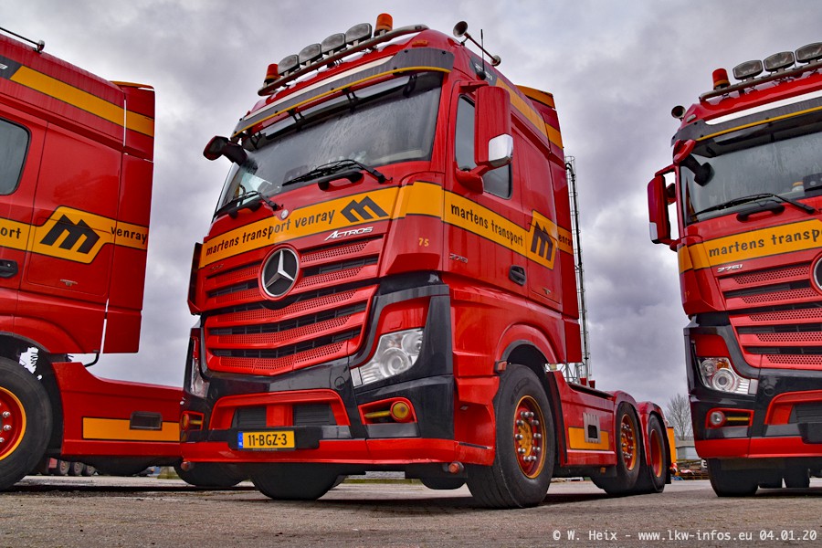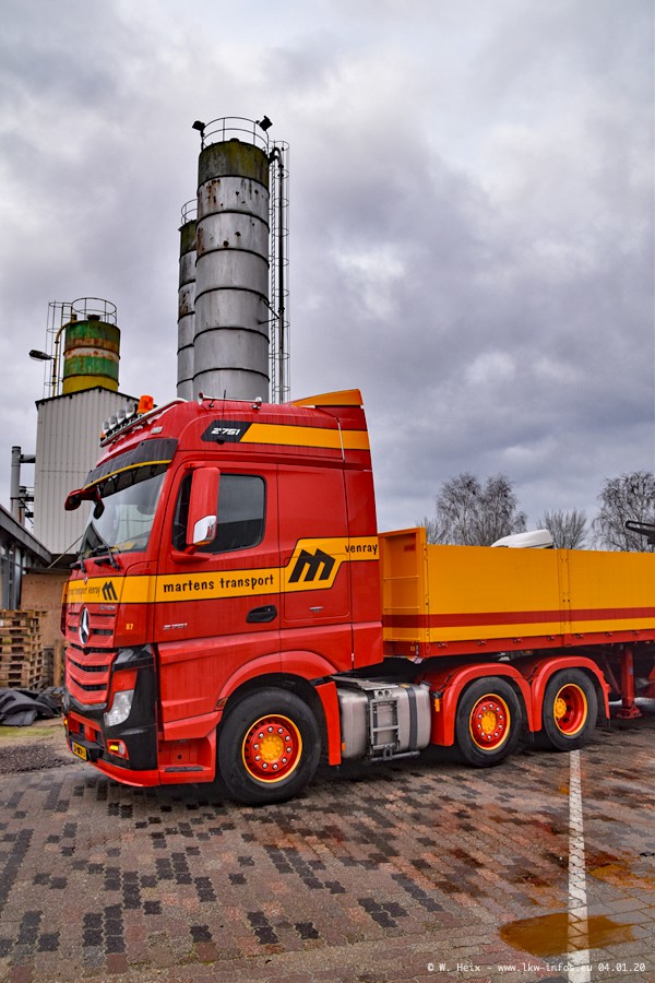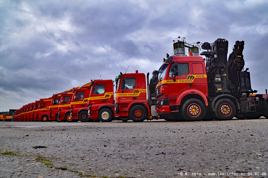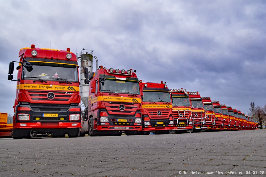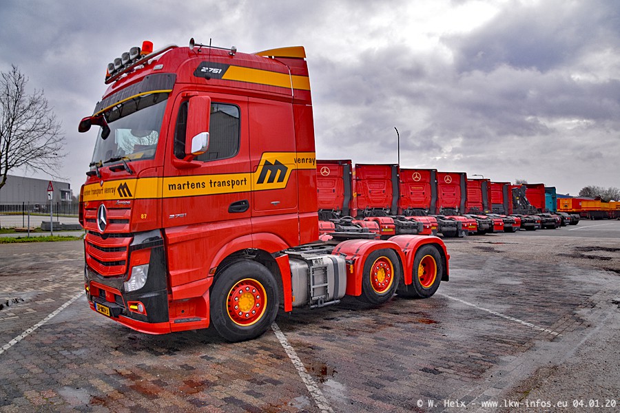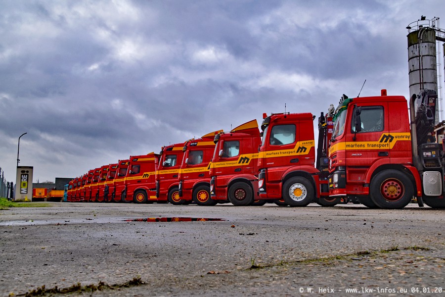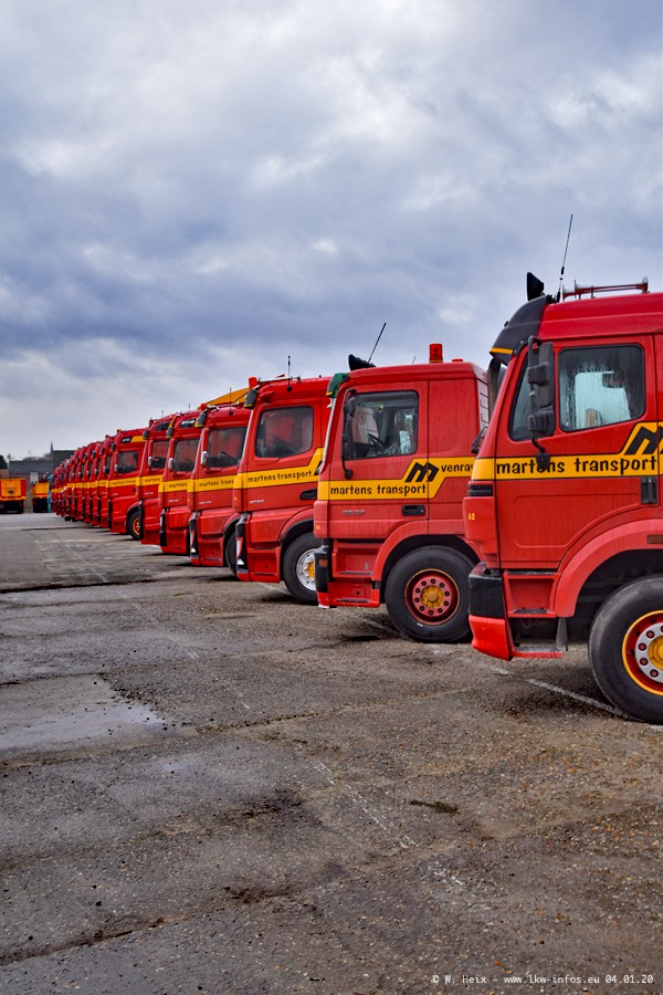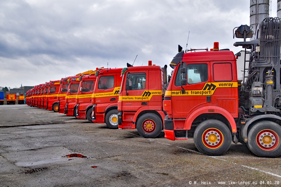 Dies war ein "verspäteter" Weihnachtsbesuch bei Martens. 19 der insgesamt 20 LKW waren zuhause und standen in einer Reihe nebeneinander. Anfang Dezember 2019 gab es auch bei Martens den ersten Mercedes-Benz New Actros 4 (ohne Spiegel). Das ist ein 2733. Mittlerweile gibt es nur noch einen SCANIA 114 im Fuhrpark (der blaue). Der Rest ist komplett von Mercedes-Benz.