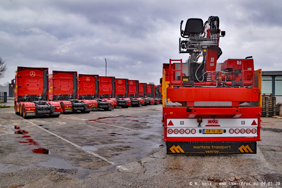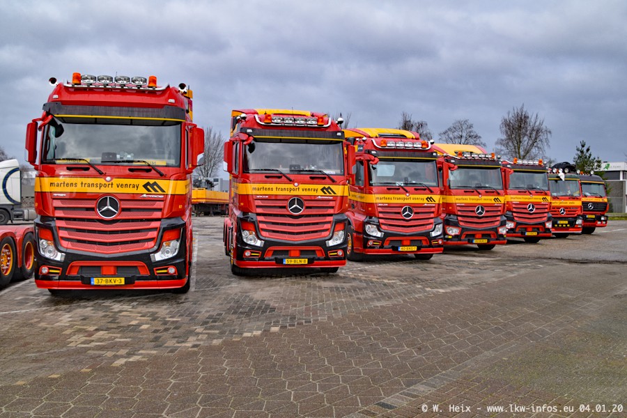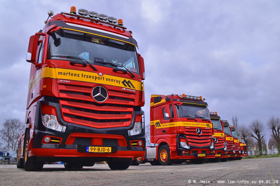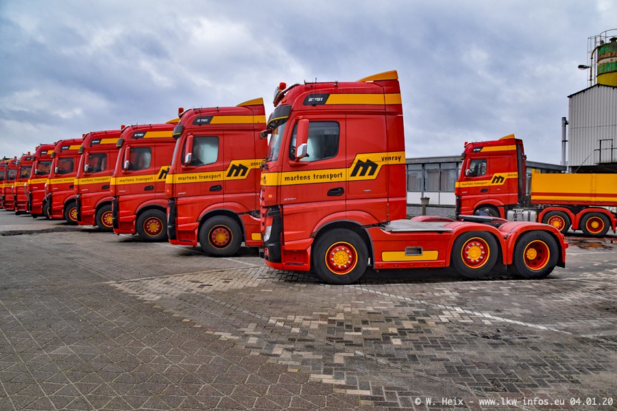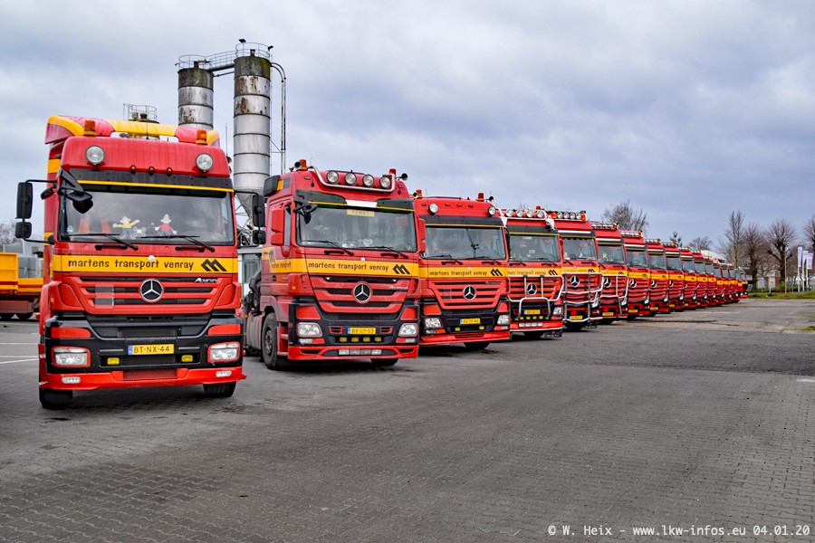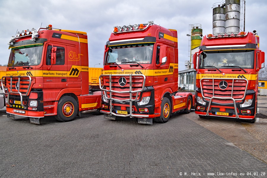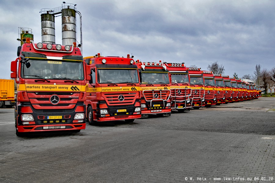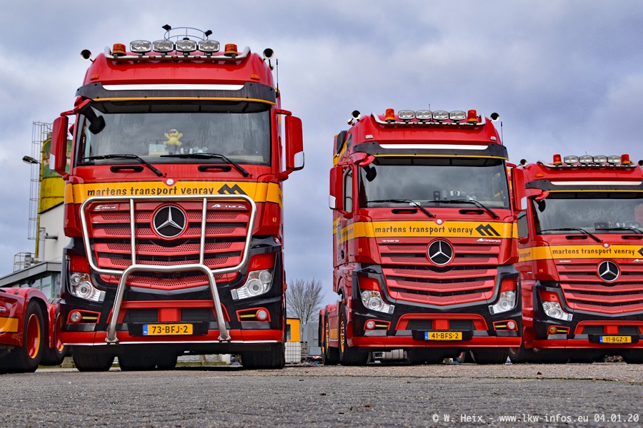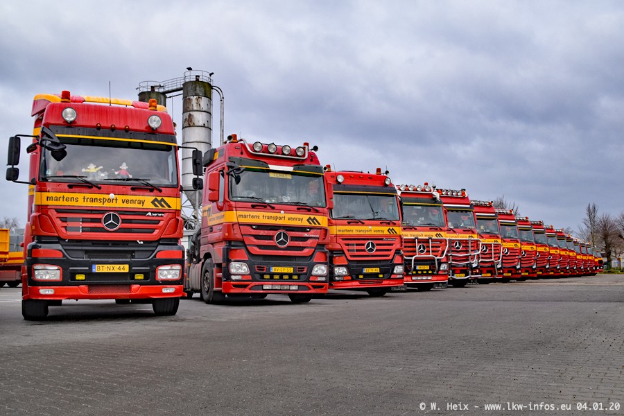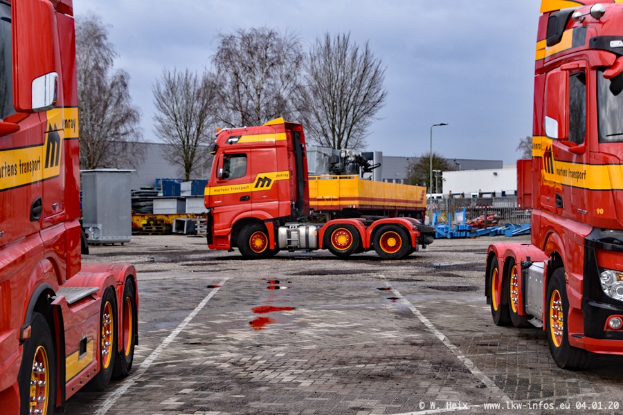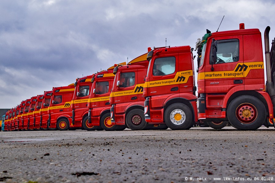 Dies war ein "verspäteter" Weihnachtsbesuch bei Martens. 19 der insgesamt 20 LKW waren zuhause und standen in einer Reihe nebeneinander. Anfang Dezember 2019 gab es auch bei Martens den ersten Mercedes-Benz New Actros 4 (ohne Spiegel). Das ist ein 2733. Mittlerweile gibt es nur noch einen SCANIA 114 im Fuhrpark (der blaue). Der Rest ist komplett von Mercedes-Benz.