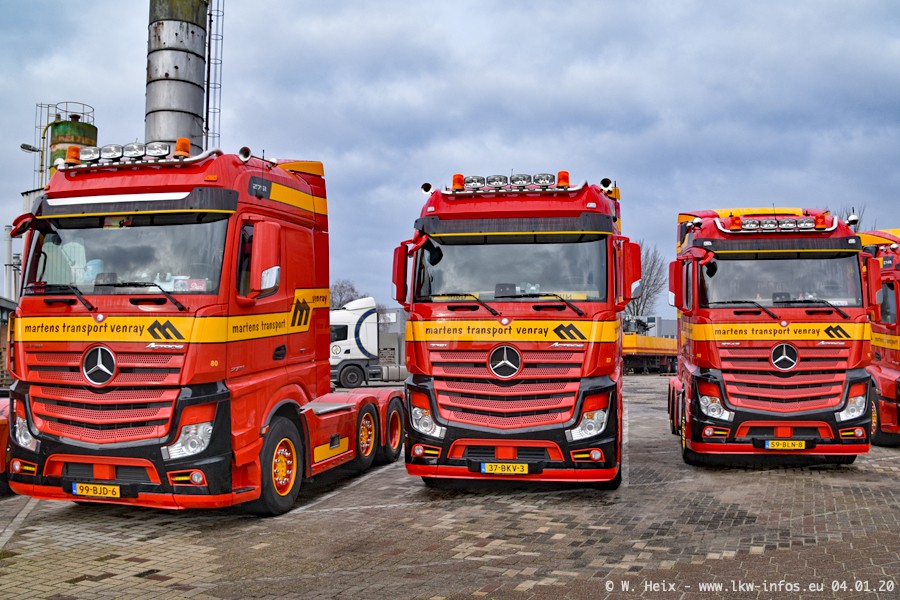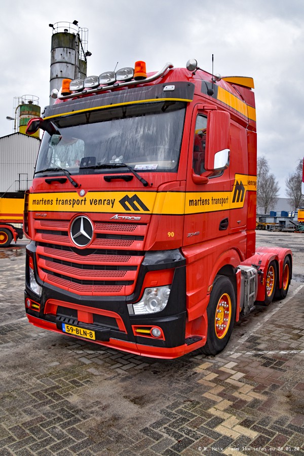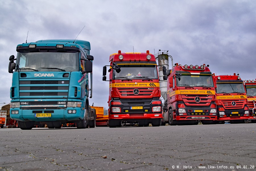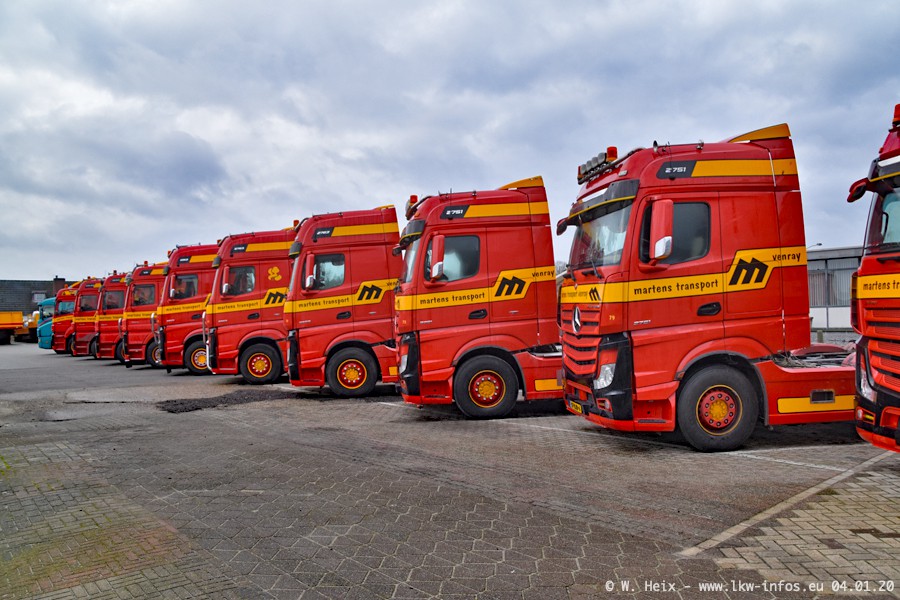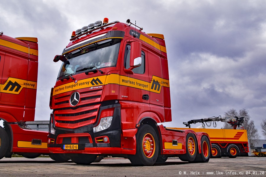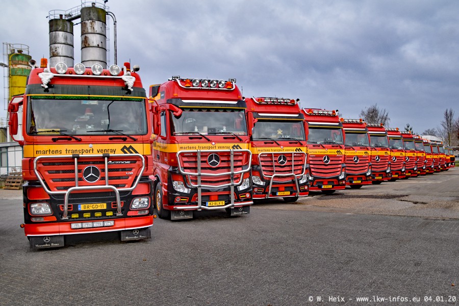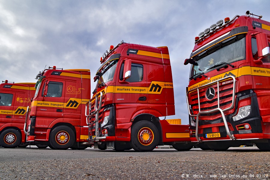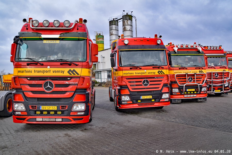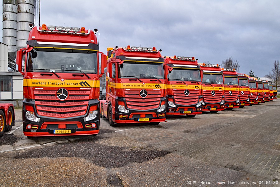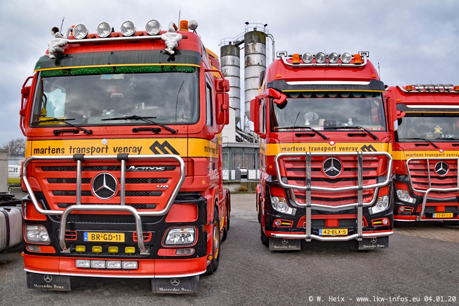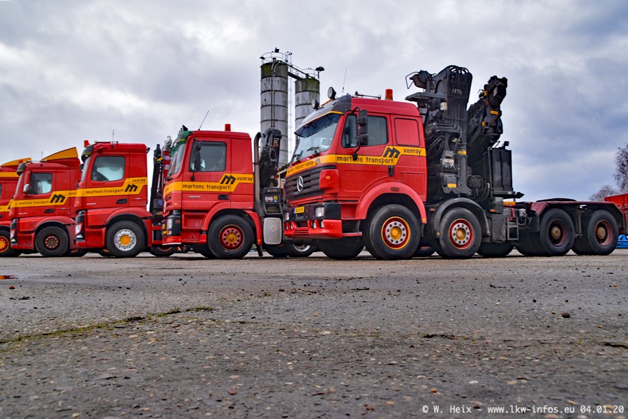 Dies war ein "verspäteter" Weihnachtsbesuch bei Martens. 19 der insgesamt 20 LKW waren zuhause und standen in einer Reihe nebeneinander. Anfang Dezember 2019 gab es auch bei Martens den ersten Mercedes-Benz New Actros 4 (ohne Spiegel). Das ist ein 2733. Mittlerweile gibt es nur noch einen SCANIA 114 im Fuhrpark (der blaue). Der Rest ist komplett von Mercedes-Benz.