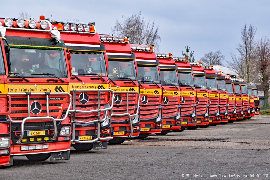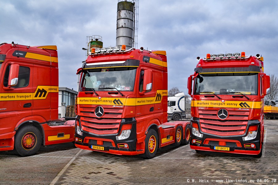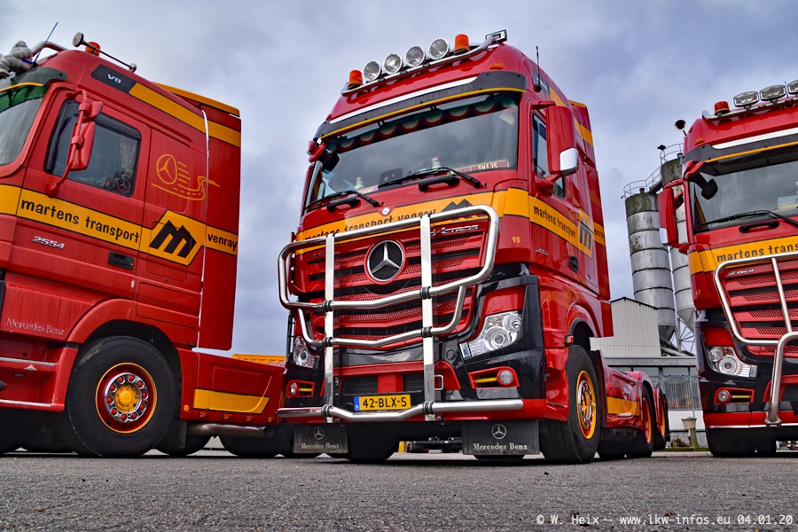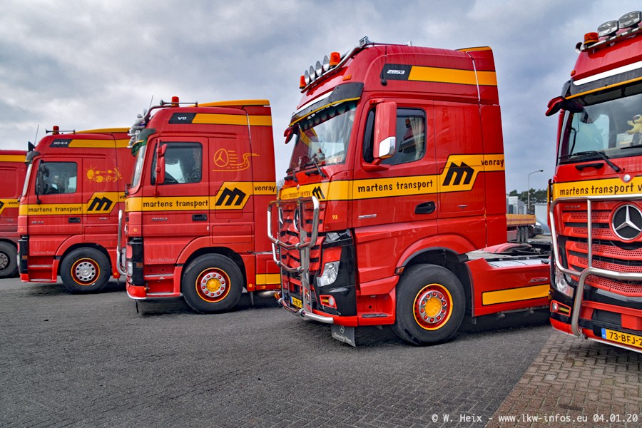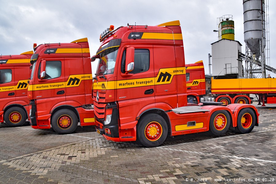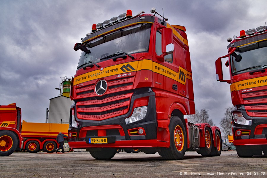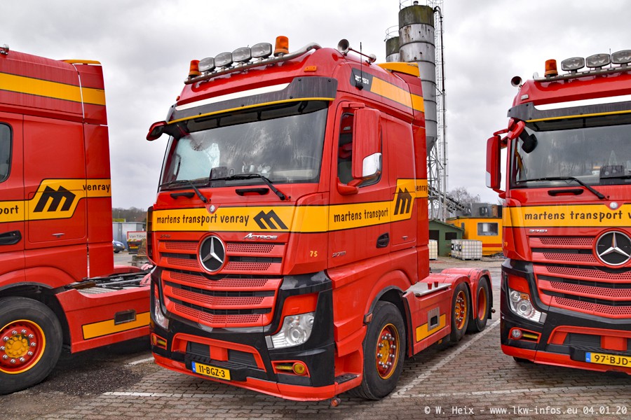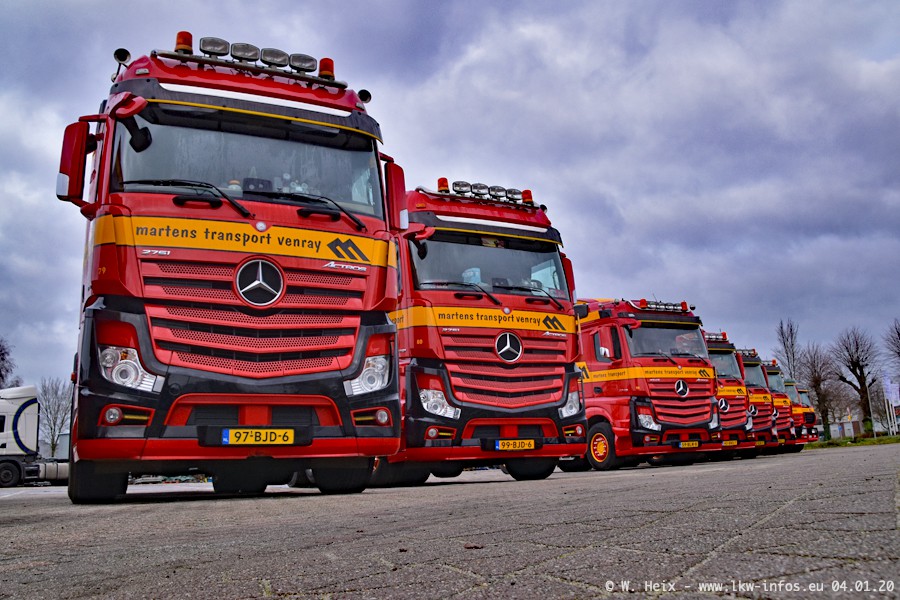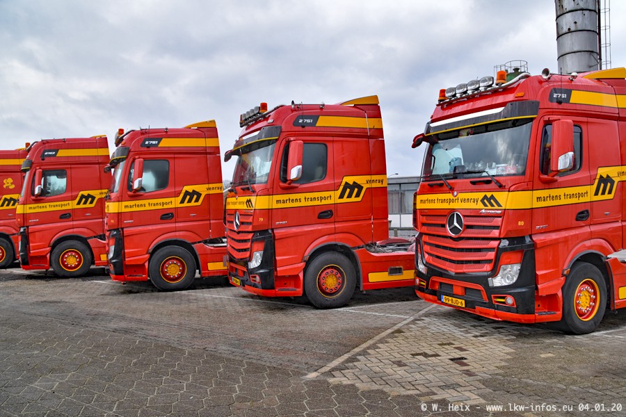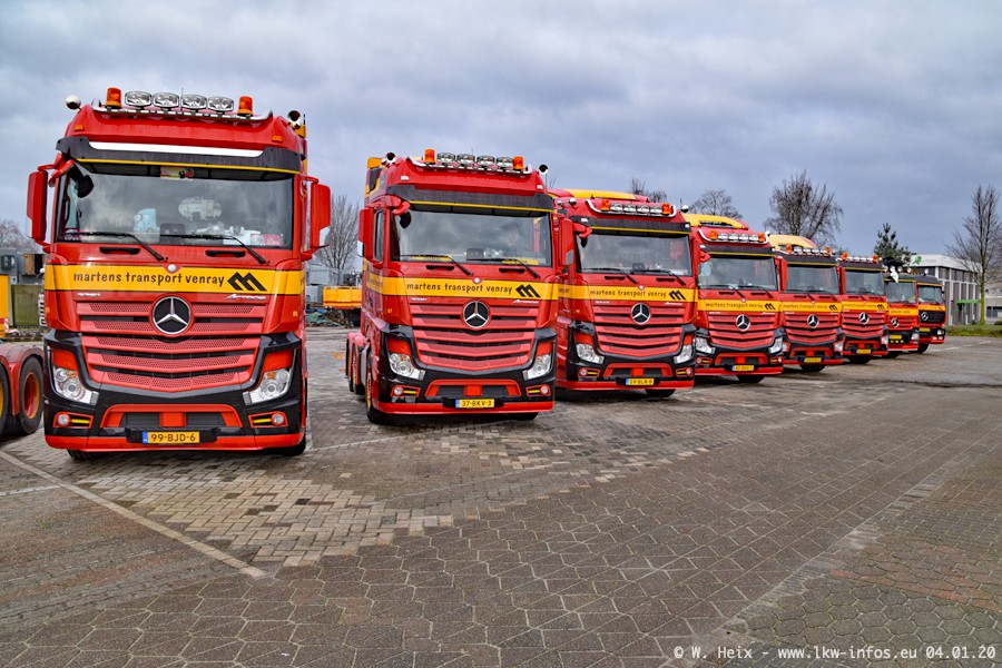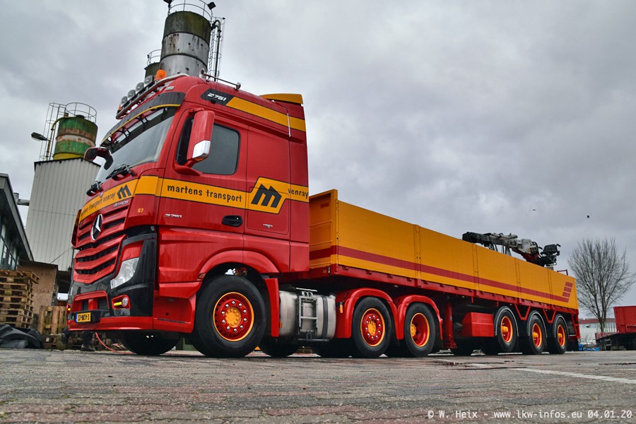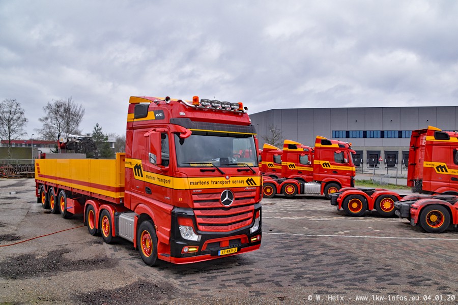 Dies war ein "verspäteter" Weihnachtsbesuch bei Martens. 19 der insgesamt 20 LKW waren zuhause und standen in einer Reihe nebeneinander. Anfang Dezember 2019 gab es auch bei Martens den ersten Mercedes-Benz New Actros 4 (ohne Spiegel). Das ist ein 2733. Mittlerweile gibt es nur noch einen SCANIA 114 im Fuhrpark (der blaue). Der Rest ist komplett von Mercedes-Benz.