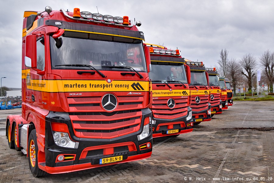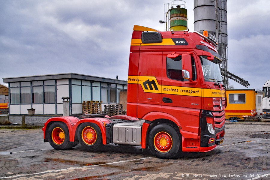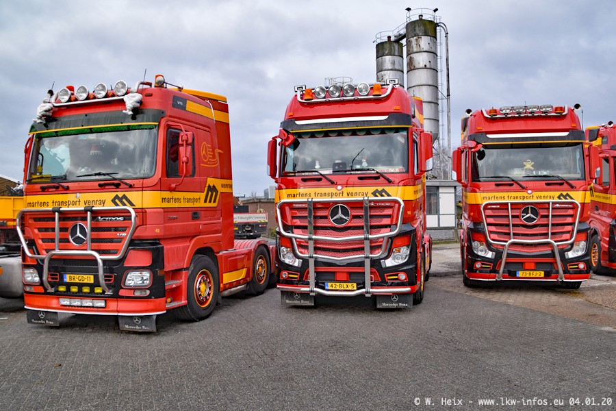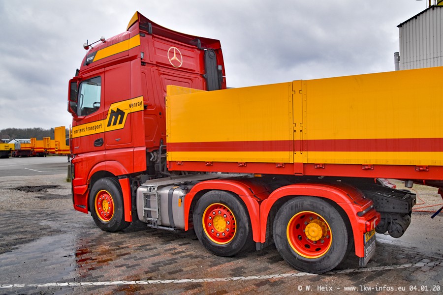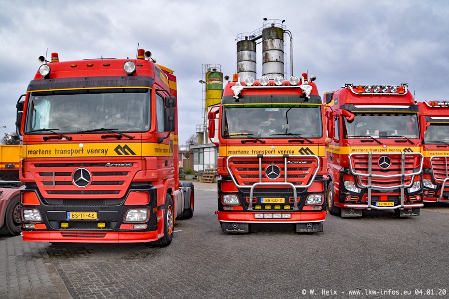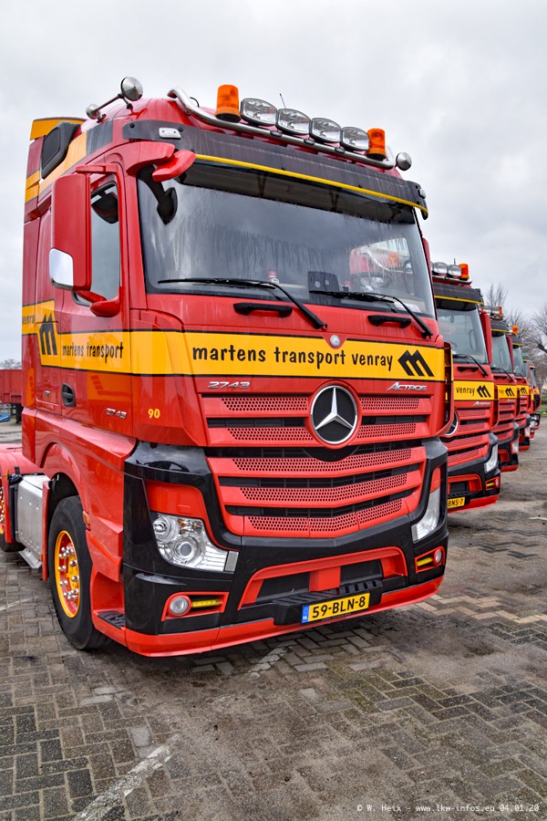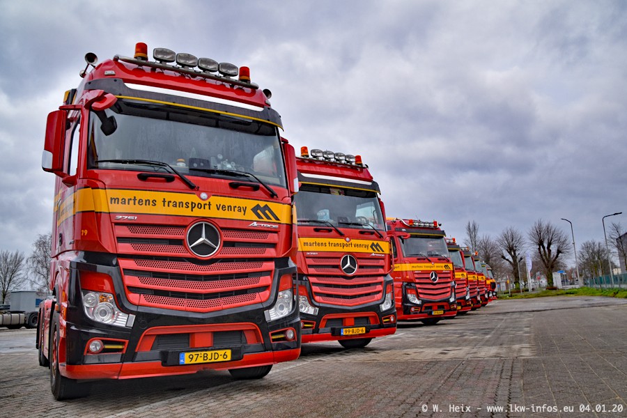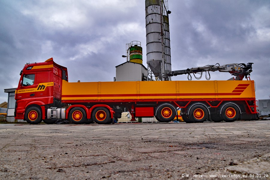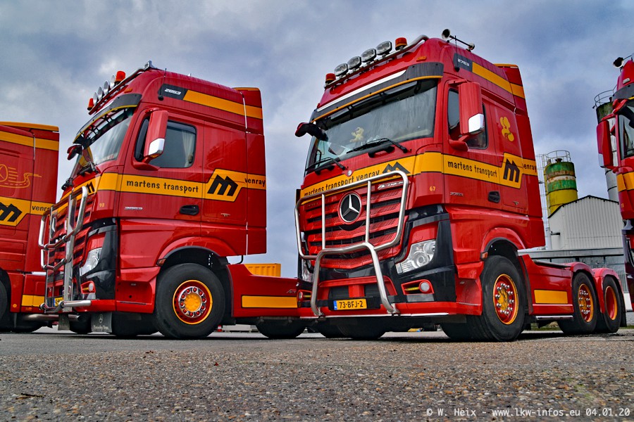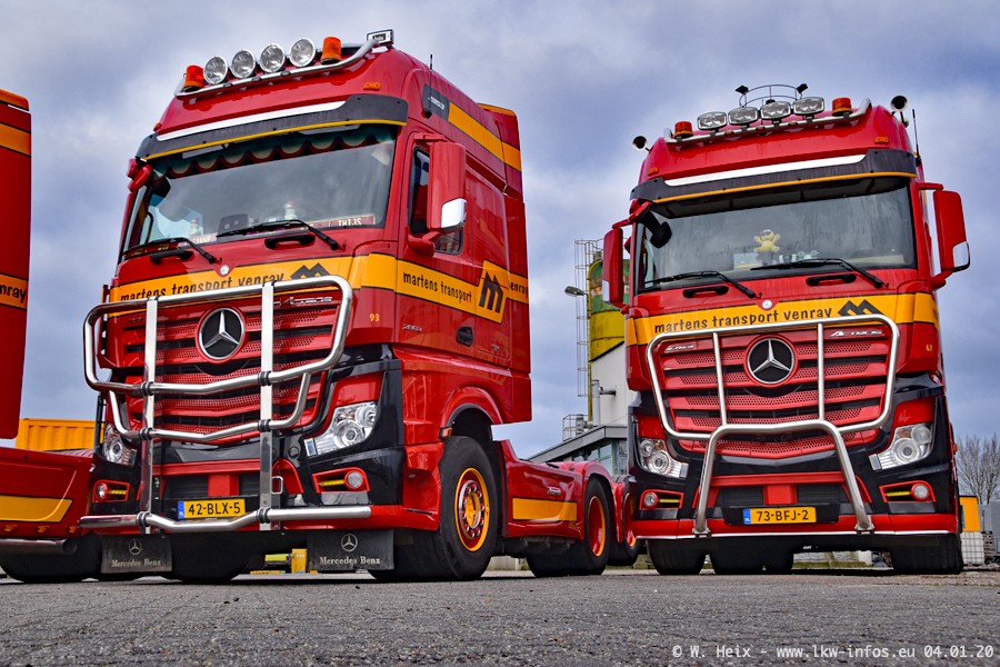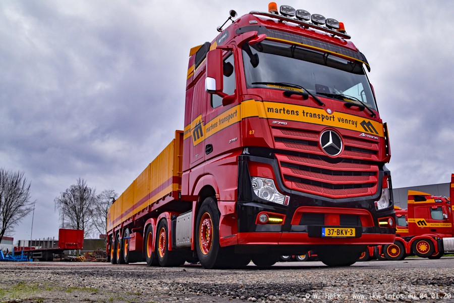 Dies war ein "verspäteter" Weihnachtsbesuch bei Martens. 19 der insgesamt 20 LKW waren zuhause und standen in einer Reihe nebeneinander. Anfang Dezember 2019 gab es auch bei Martens den ersten Mercedes-Benz New Actros 4 (ohne Spiegel). Das ist ein 2733. Mittlerweile gibt es nur noch einen SCANIA 114 im Fuhrpark (der blaue). Der Rest ist komplett von Mercedes-Benz.