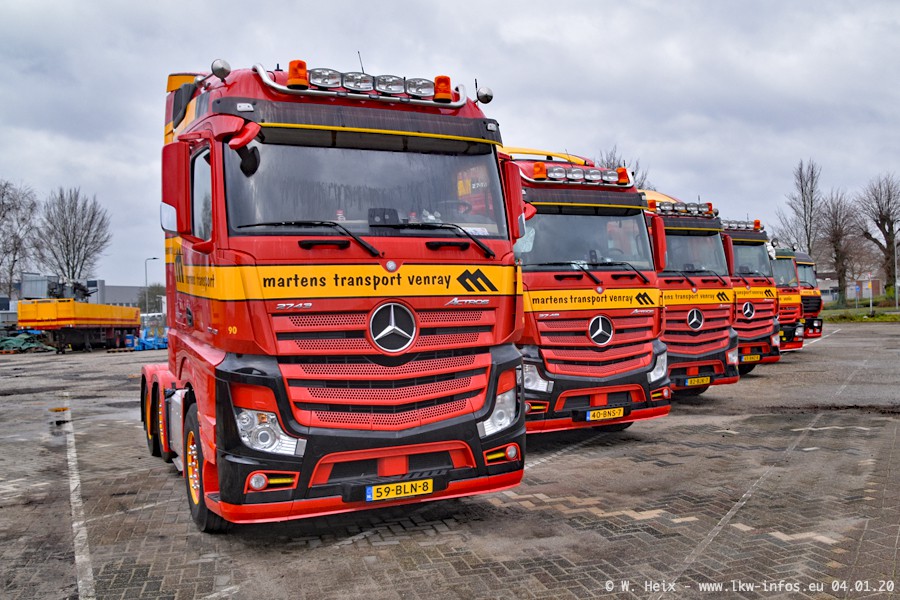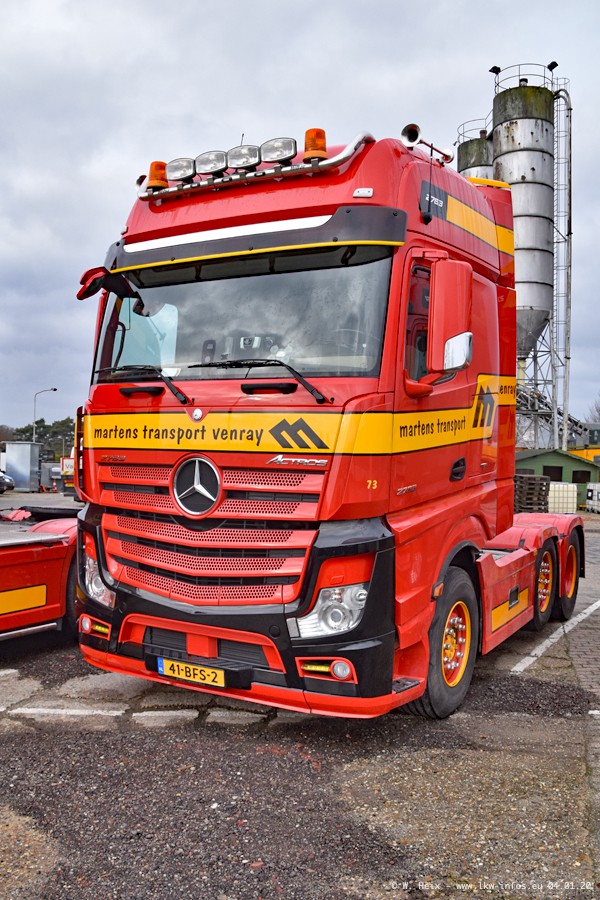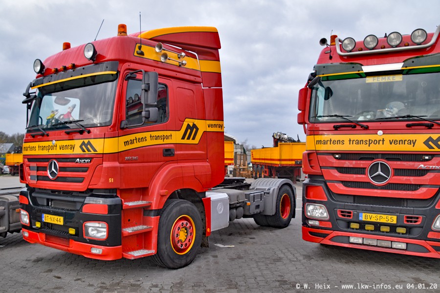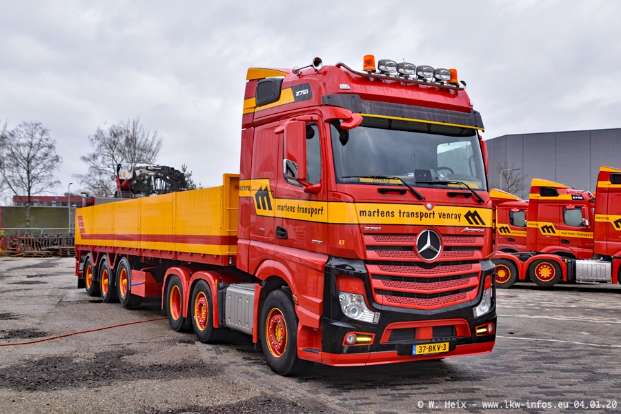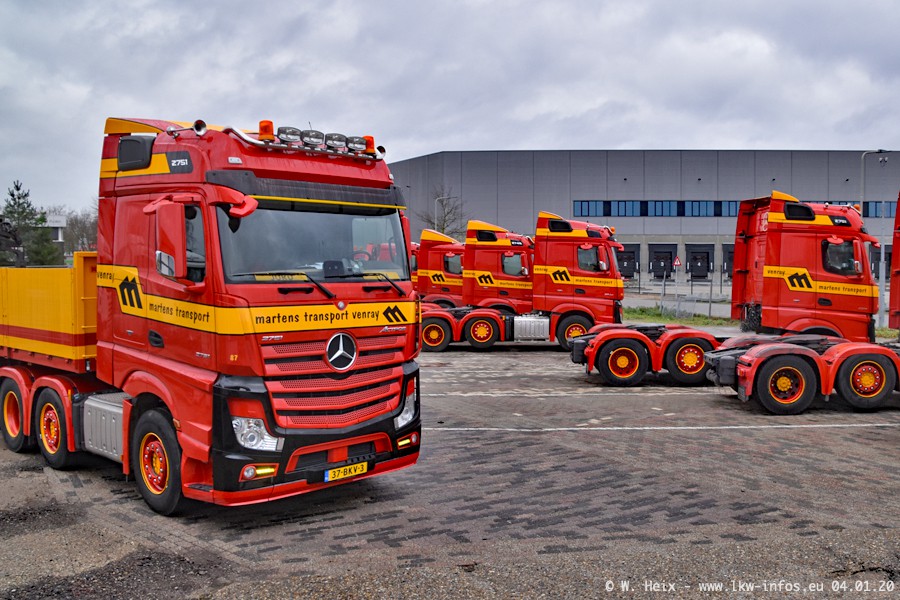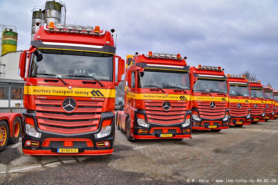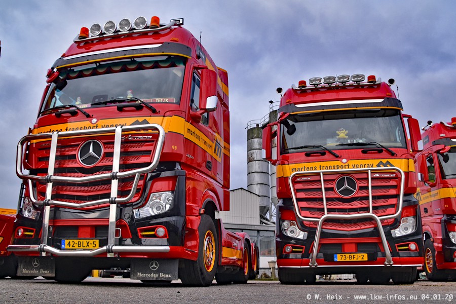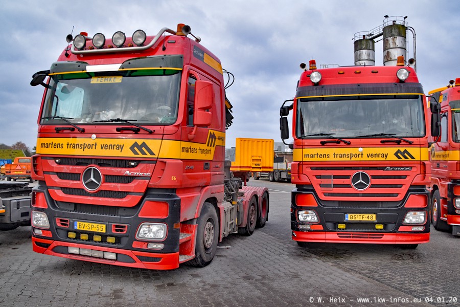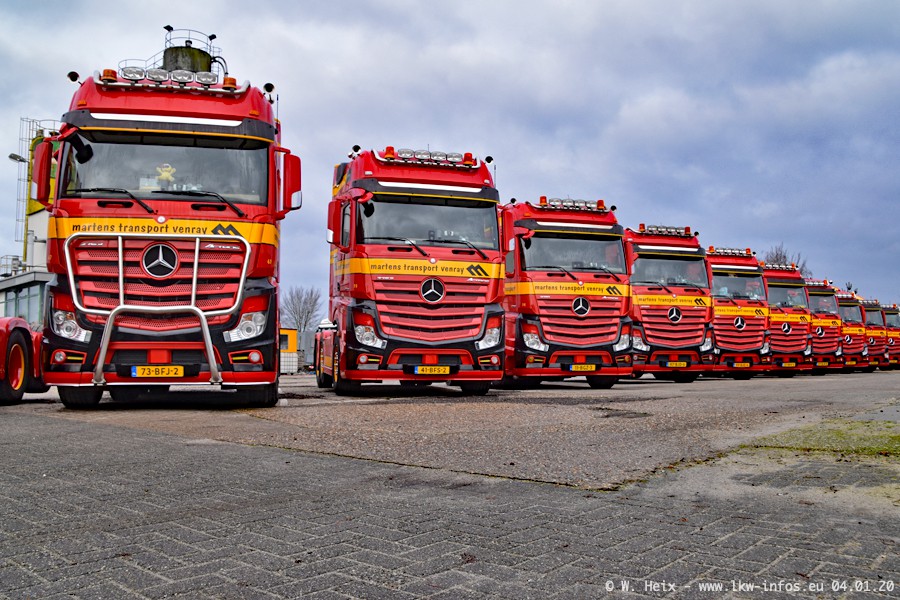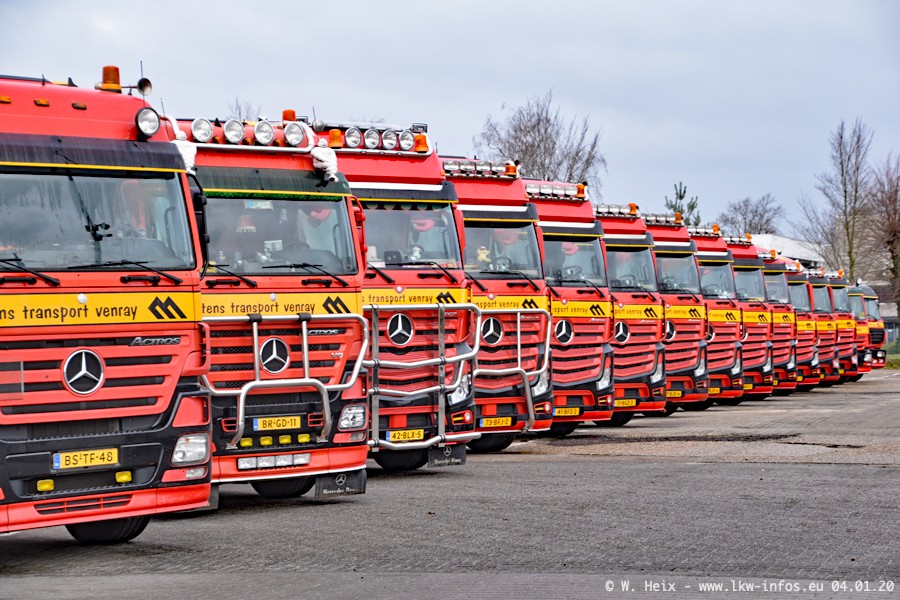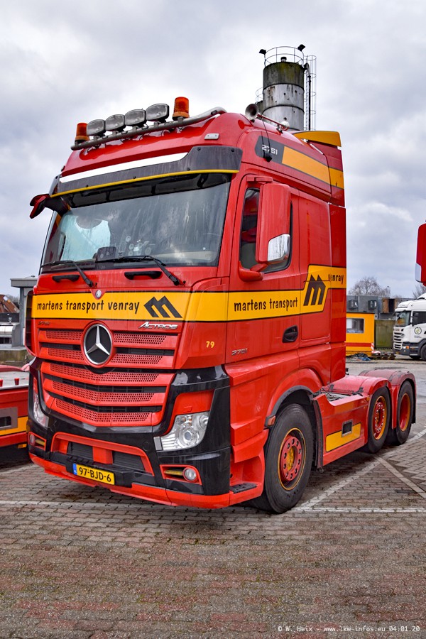 Dies war ein "verspäteter" Weihnachtsbesuch bei Martens. 19 der insgesamt 20 LKW waren zuhause und standen in einer Reihe nebeneinander. Anfang Dezember 2019 gab es auch bei Martens den ersten Mercedes-Benz New Actros 4 (ohne Spiegel). Das ist ein 2733. Mittlerweile gibt es nur noch einen SCANIA 114 im Fuhrpark (der blaue). Der Rest ist komplett von Mercedes-Benz.