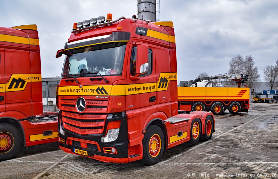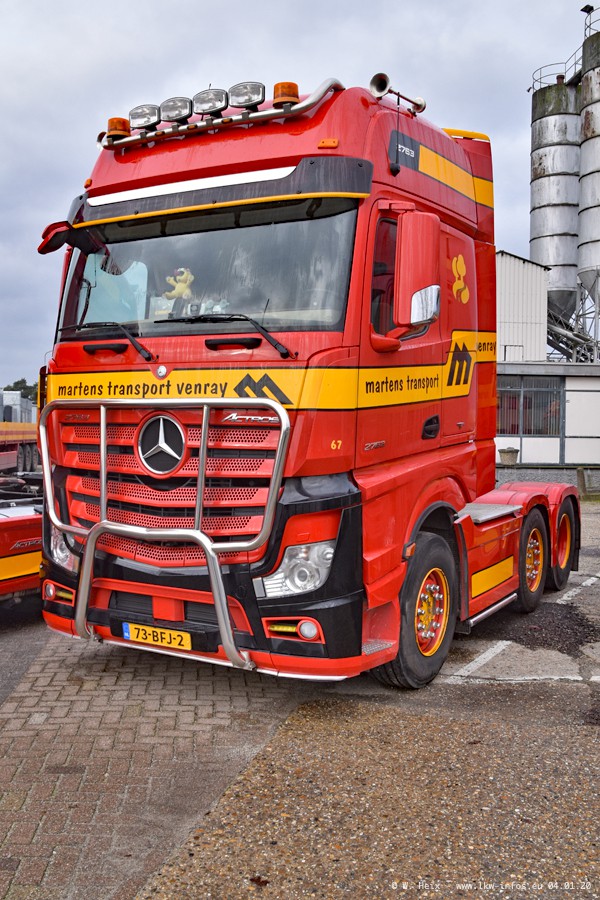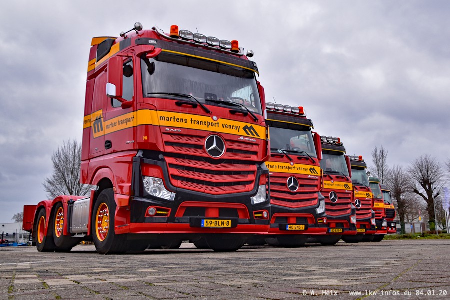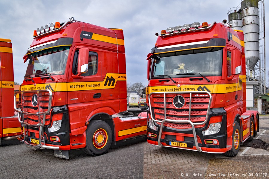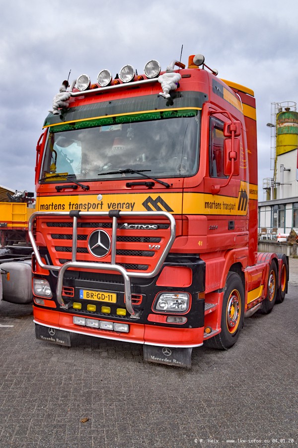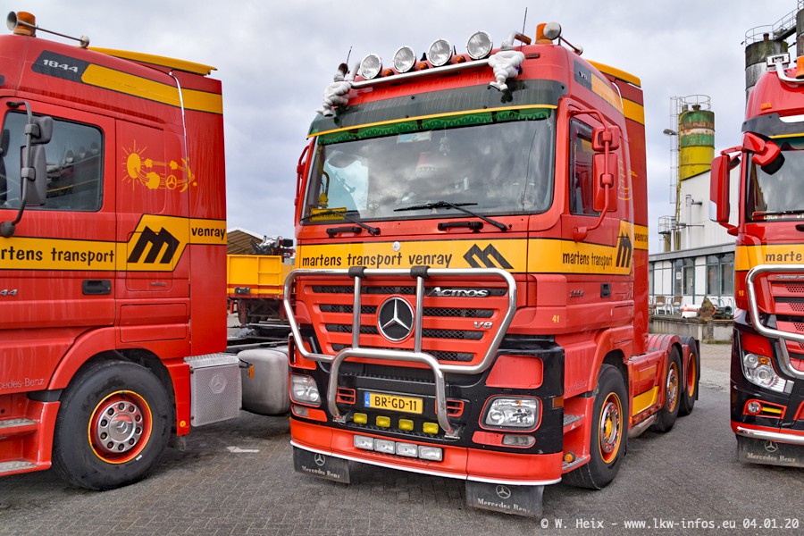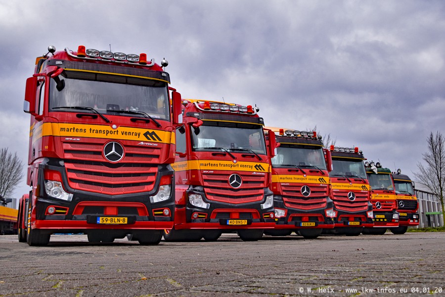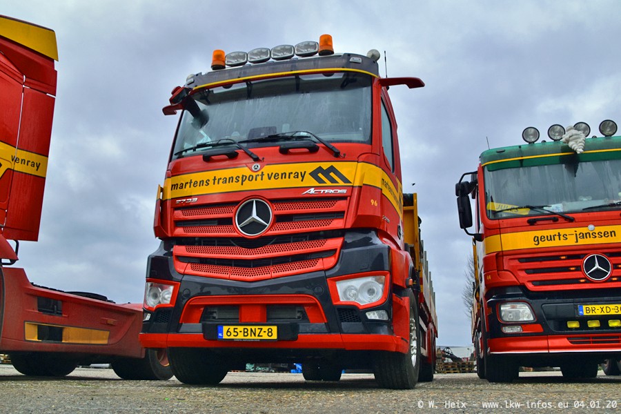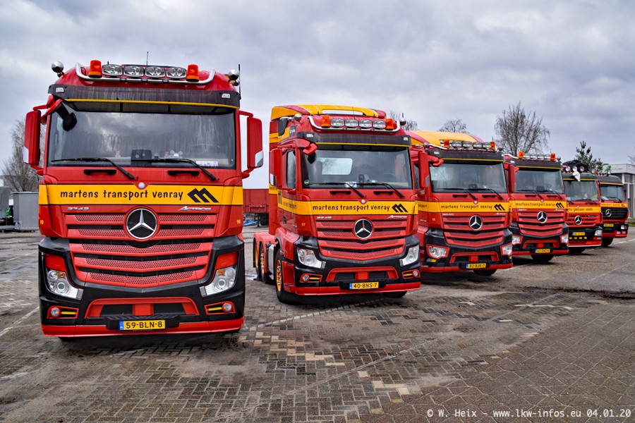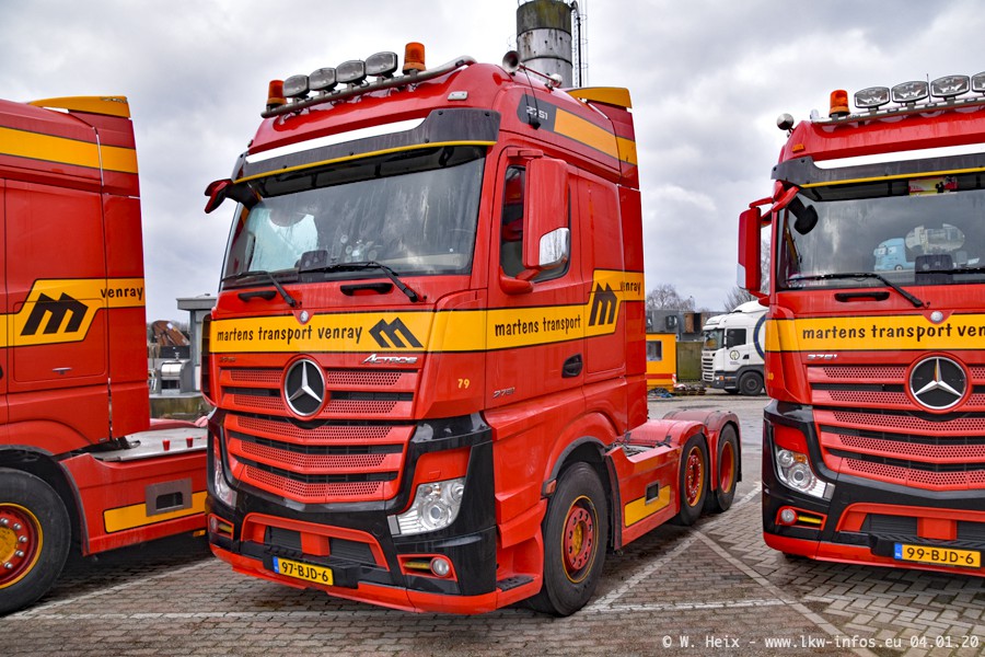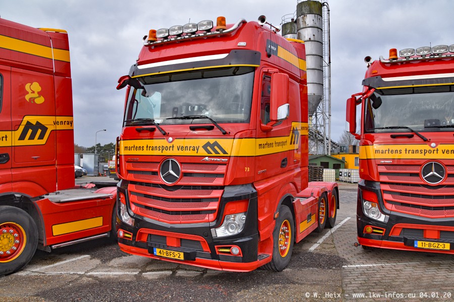 Dies war ein "verspäteter" Weihnachtsbesuch bei Martens. 19 der insgesamt 20 LKW waren zuhause und standen in einer Reihe nebeneinander. Anfang Dezember 2019 gab es auch bei Martens den ersten Mercedes-Benz New Actros 4 (ohne Spiegel). Das ist ein 2733. Mittlerweile gibt es nur noch einen SCANIA 114 im Fuhrpark (der blaue). Der Rest ist komplett von Mercedes-Benz.