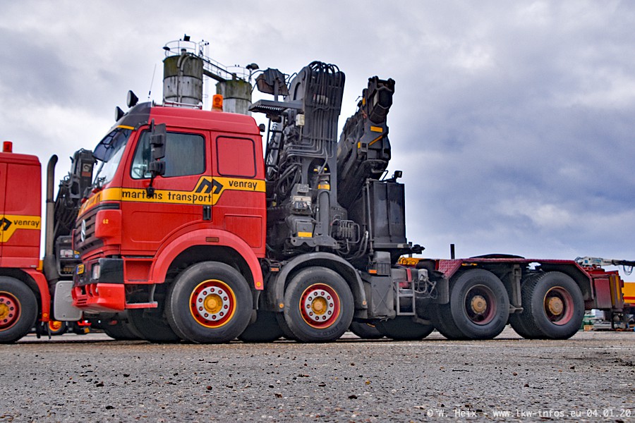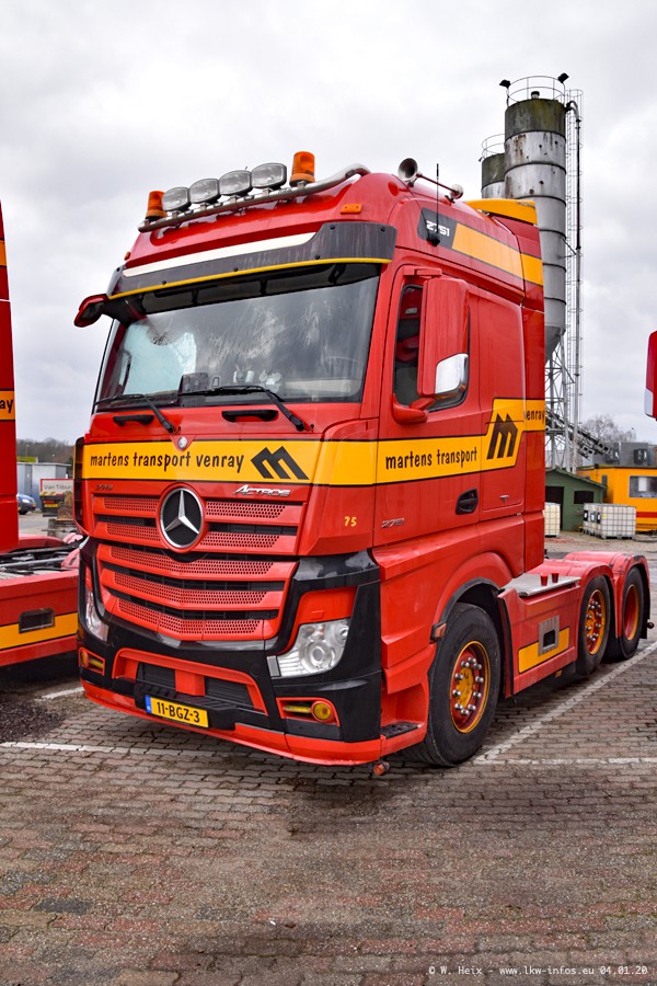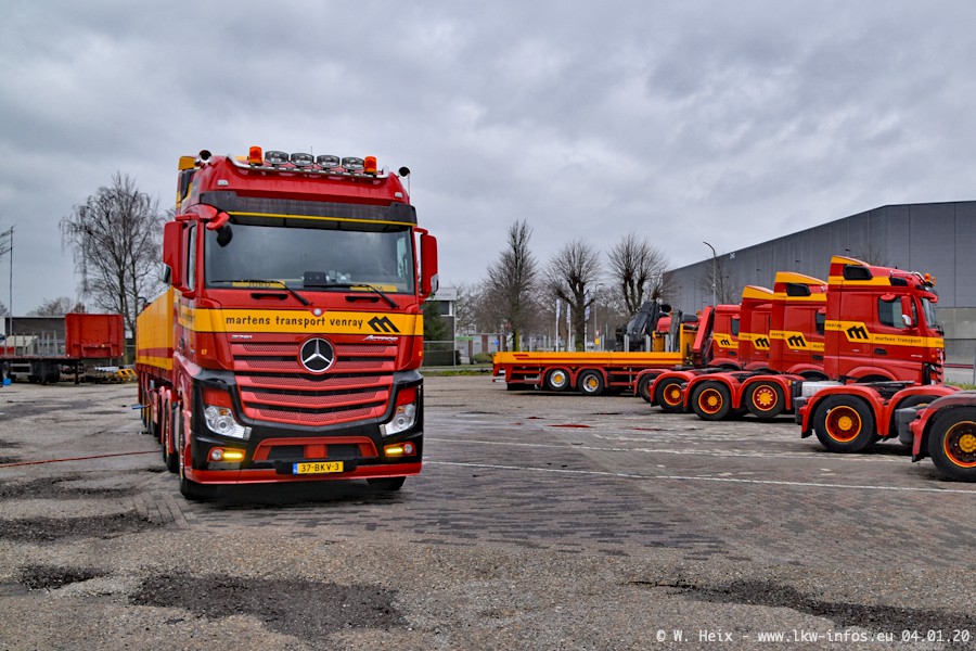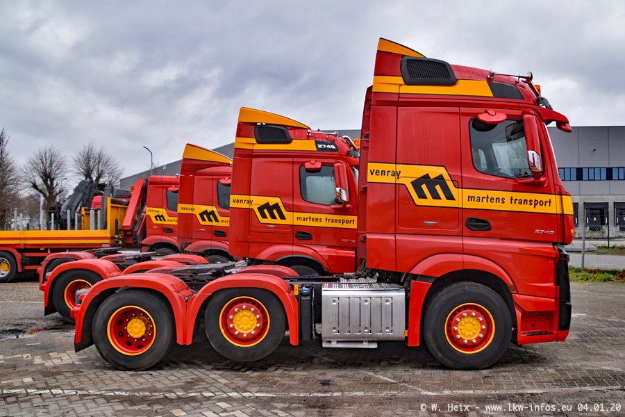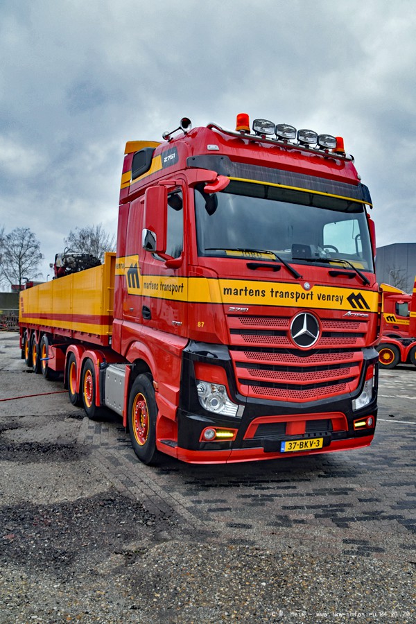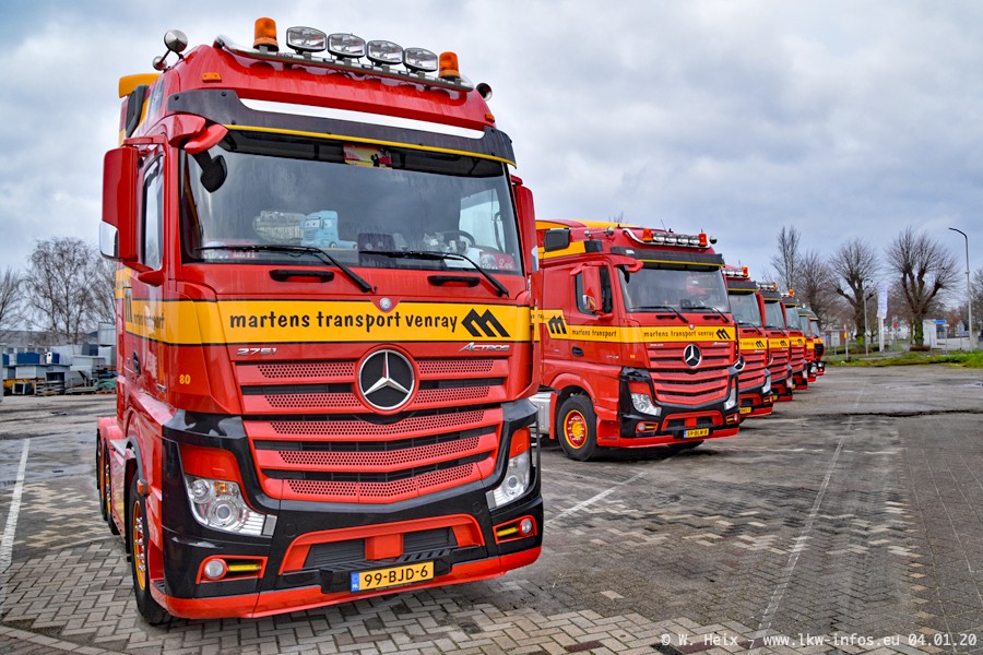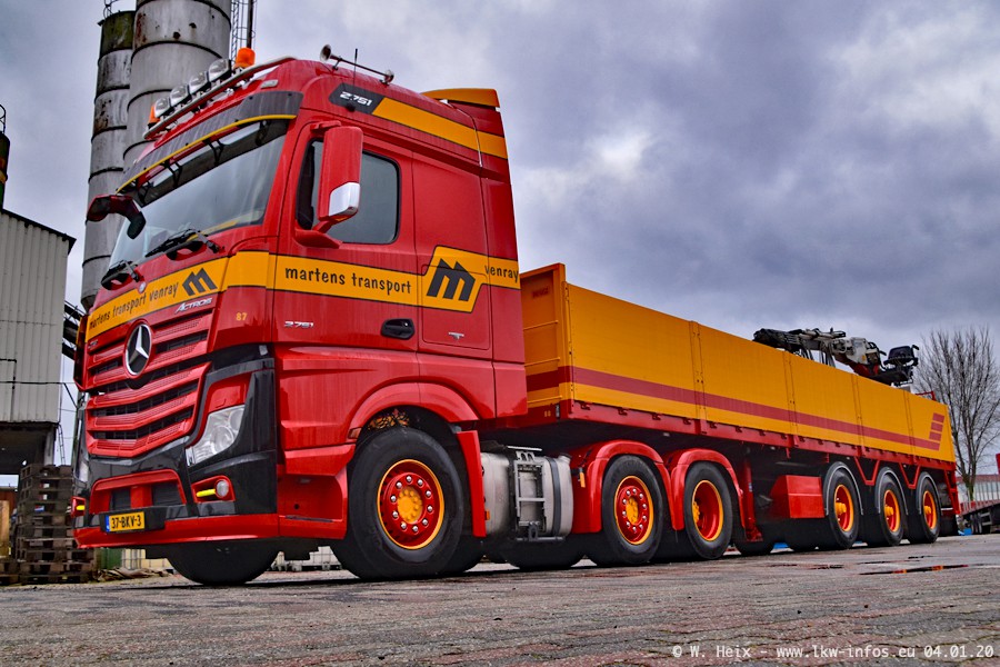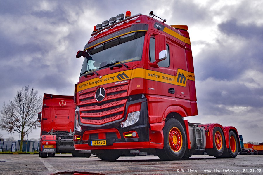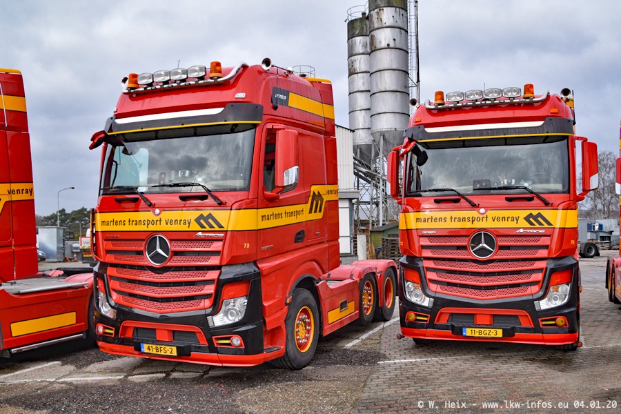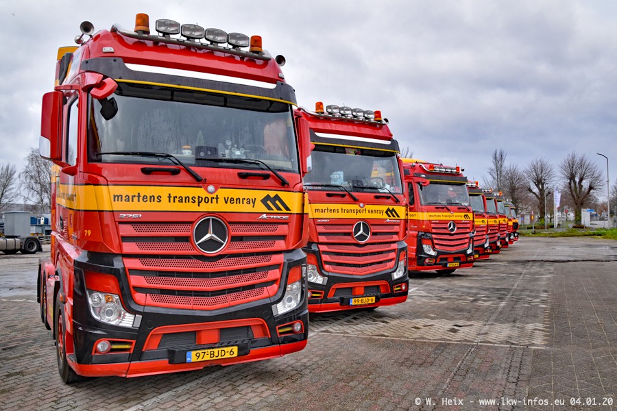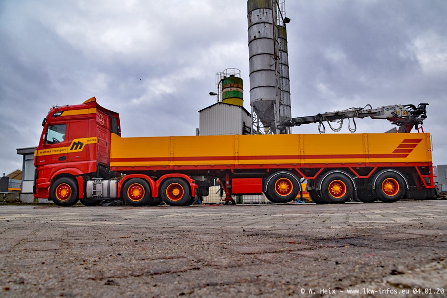 Dies war ein "verspäteter" Weihnachtsbesuch bei Martens. 19 der insgesamt 20 LKW waren zuhause und standen in einer Reihe nebeneinander. Anfang Dezember 2019 gab es auch bei Martens den ersten Mercedes-Benz New Actros 4 (ohne Spiegel). Das ist ein 2733. Mittlerweile gibt es nur noch einen SCANIA 114 im Fuhrpark (der blaue). Der Rest ist komplett von Mercedes-Benz.