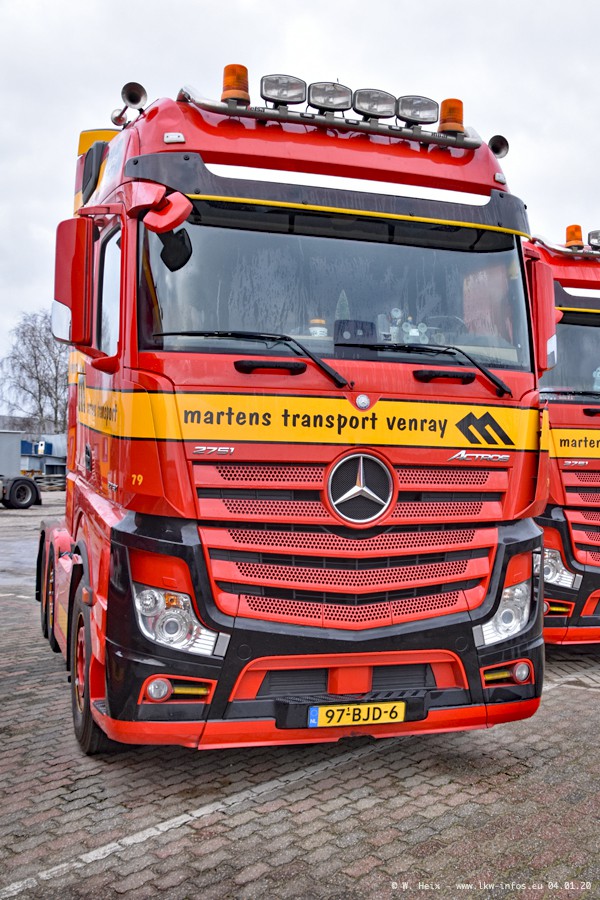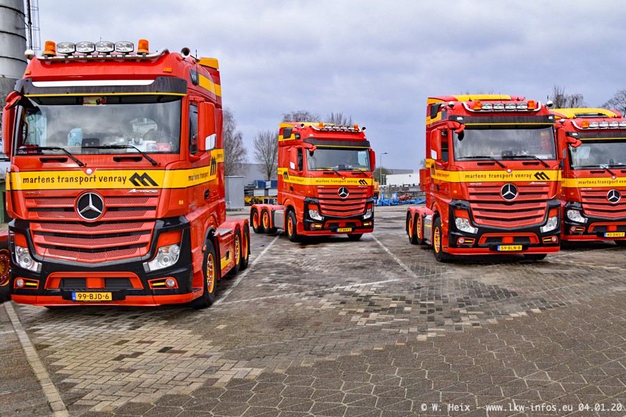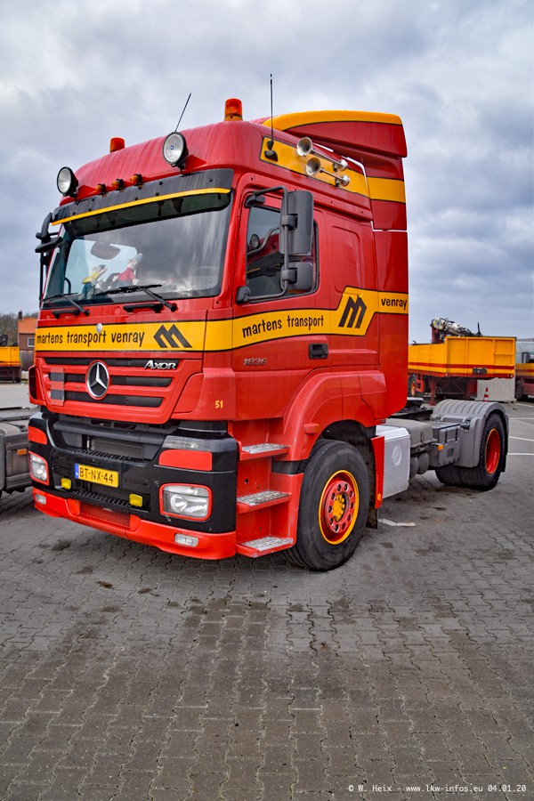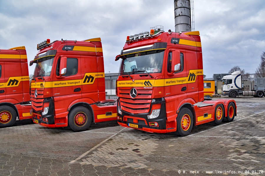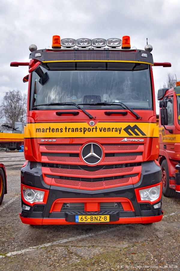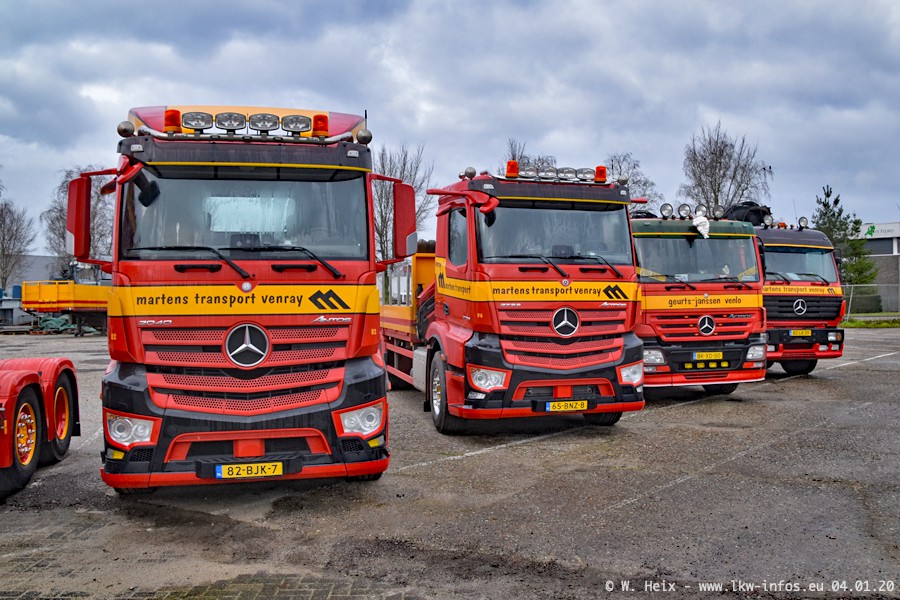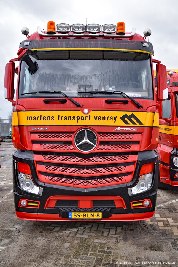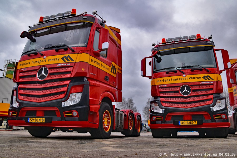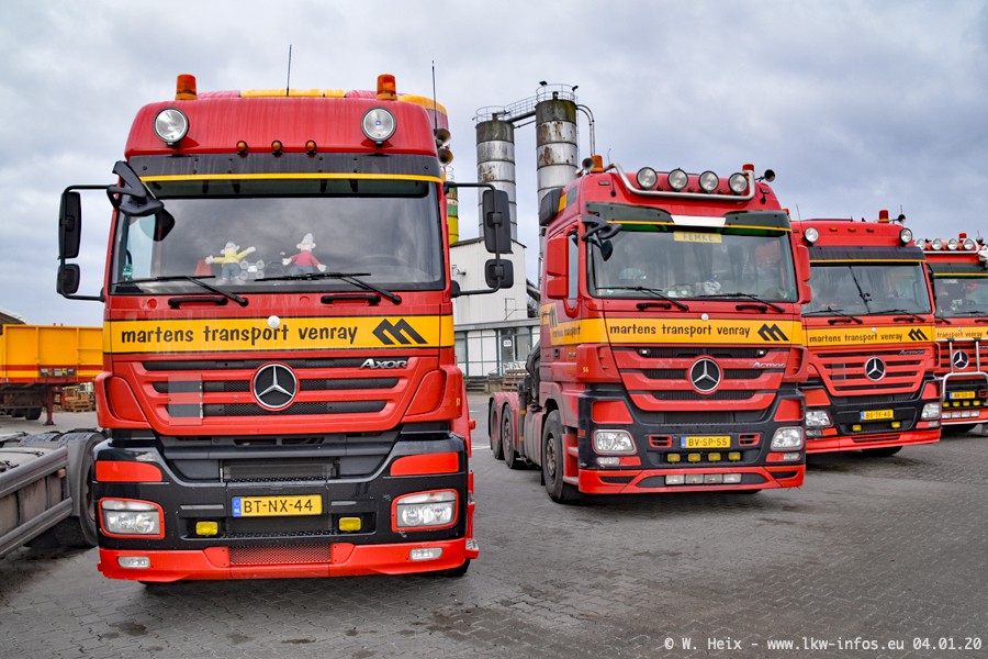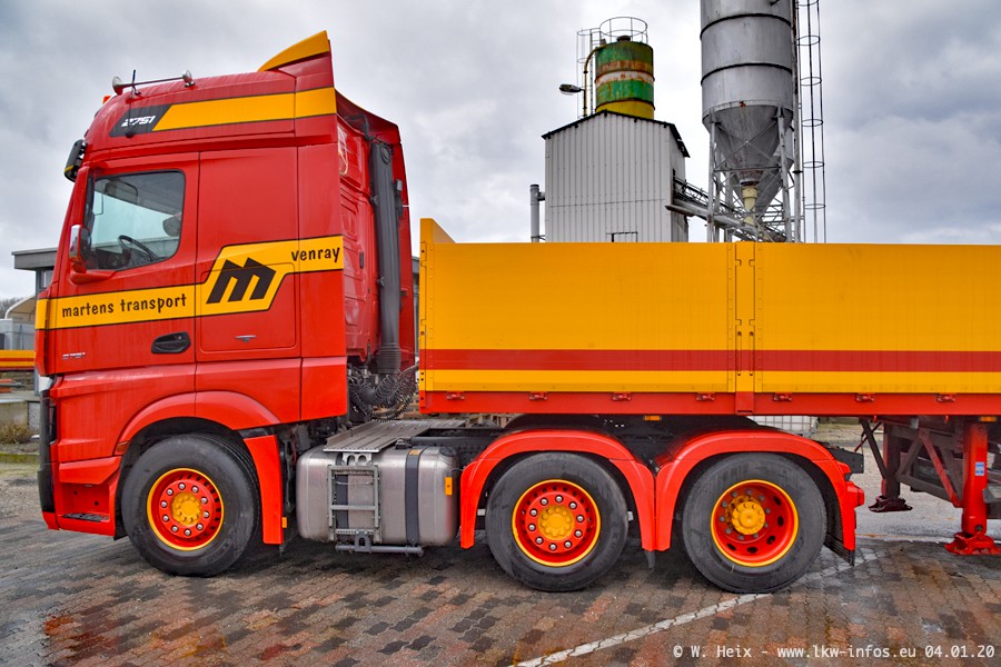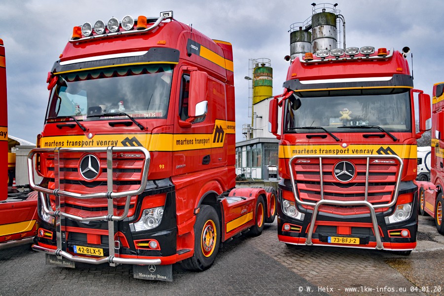 Dies war ein "verspäteter" Weihnachtsbesuch bei Martens. 19 der insgesamt 20 LKW waren zuhause und standen in einer Reihe nebeneinander. Anfang Dezember 2019 gab es auch bei Martens den ersten Mercedes-Benz New Actros 4 (ohne Spiegel). Das ist ein 2733. Mittlerweile gibt es nur noch einen SCANIA 114 im Fuhrpark (der blaue). Der Rest ist komplett von Mercedes-Benz.