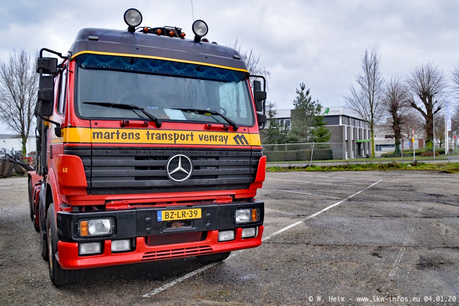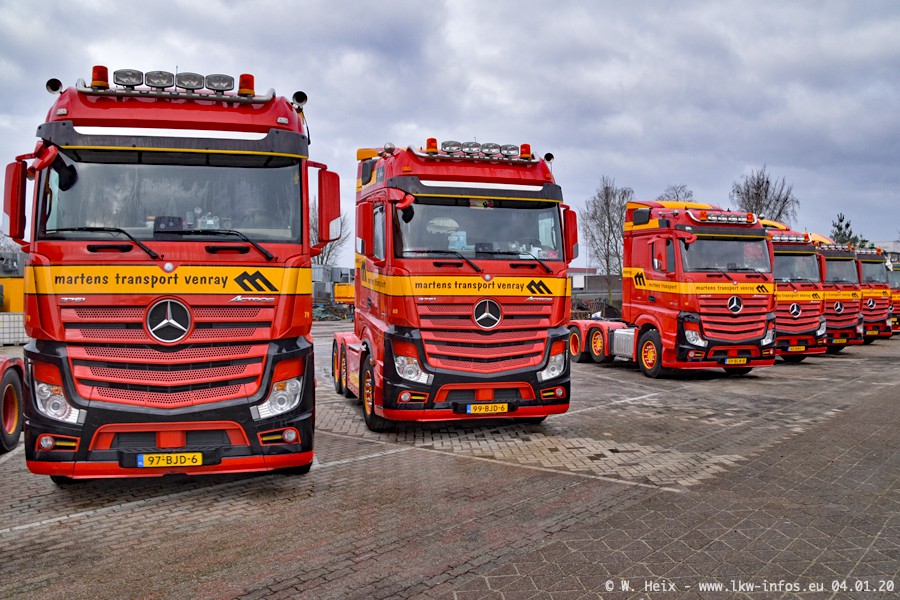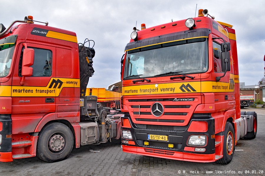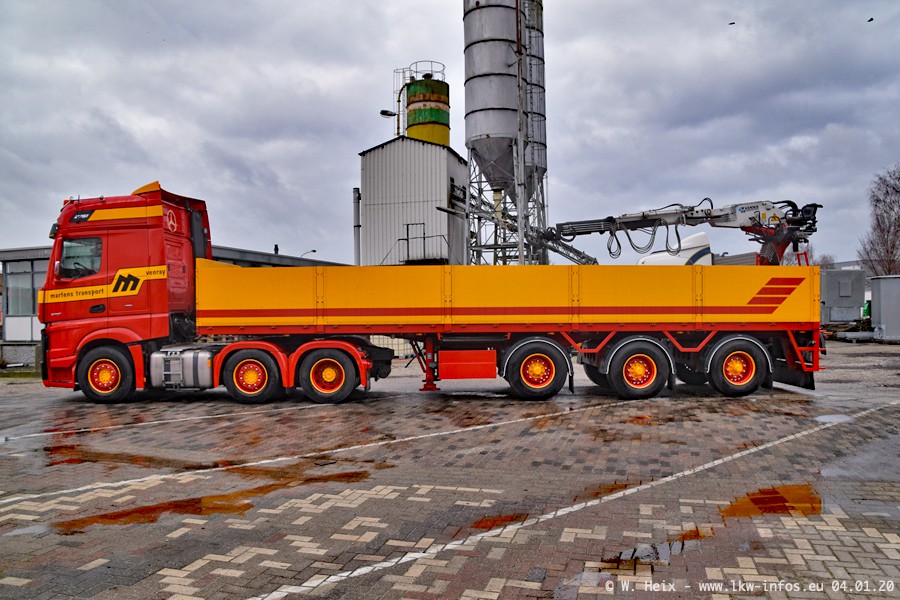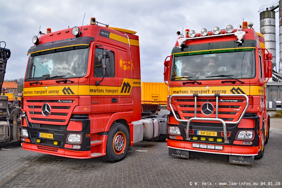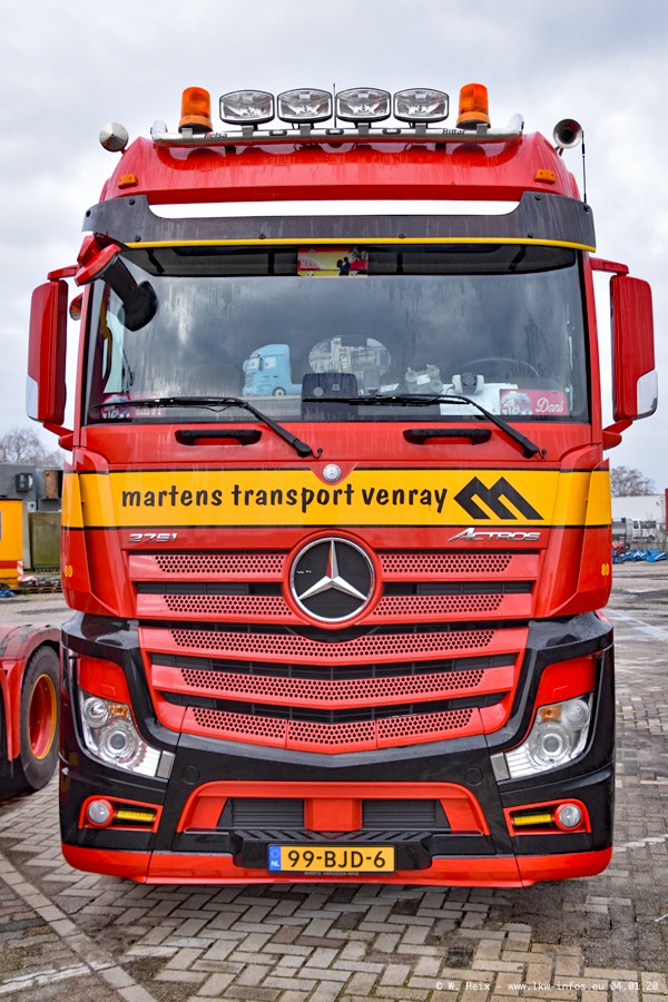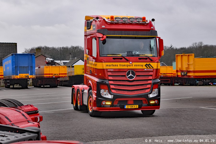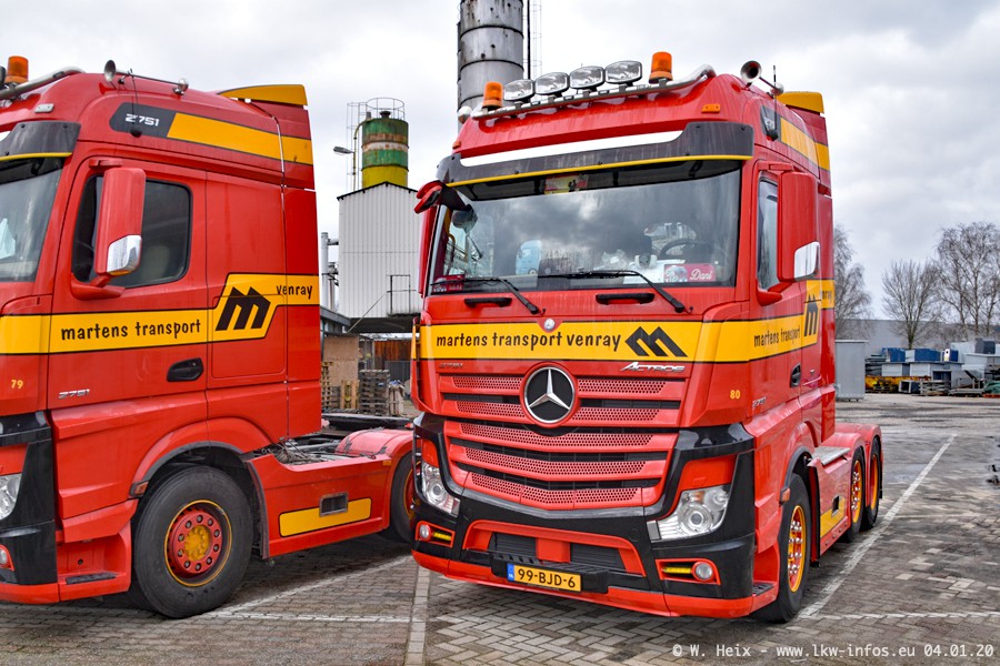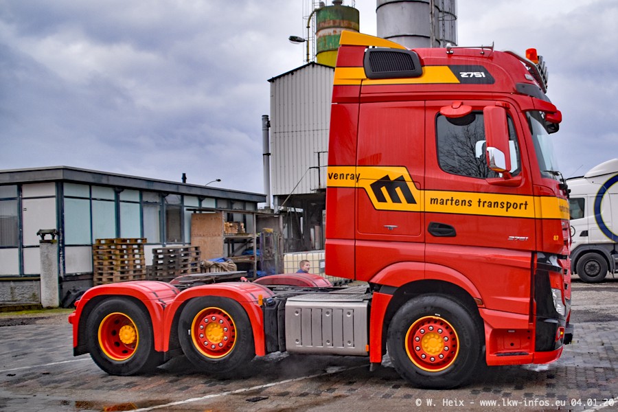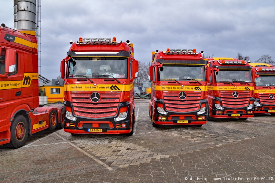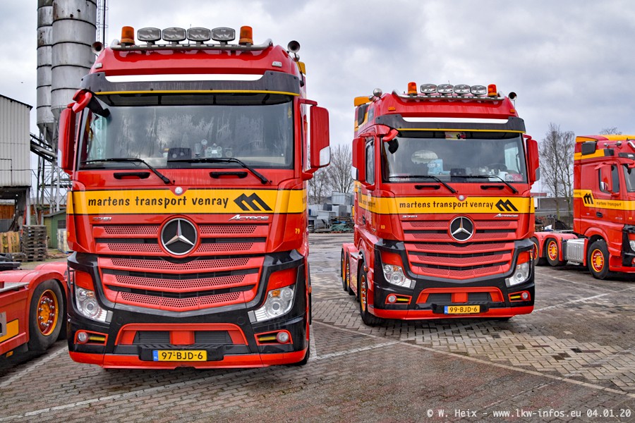 Dies war ein "verspäteter" Weihnachtsbesuch bei Martens. 19 der insgesamt 20 LKW waren zuhause und standen in einer Reihe nebeneinander. Anfang Dezember 2019 gab es auch bei Martens den ersten Mercedes-Benz New Actros 4 (ohne Spiegel). Das ist ein 2733. Mittlerweile gibt es nur noch einen SCANIA 114 im Fuhrpark (der blaue). Der Rest ist komplett von Mercedes-Benz.