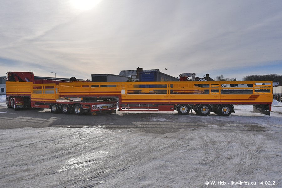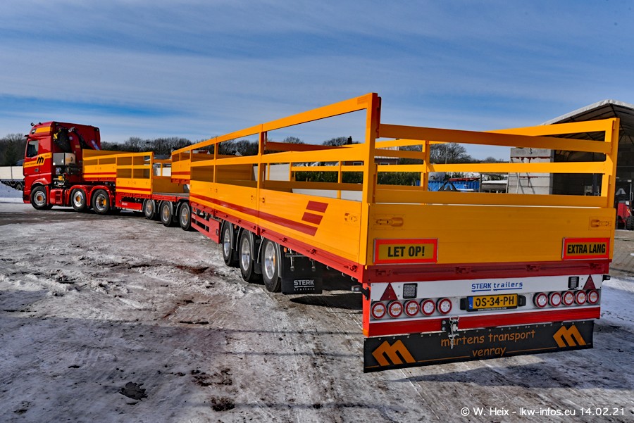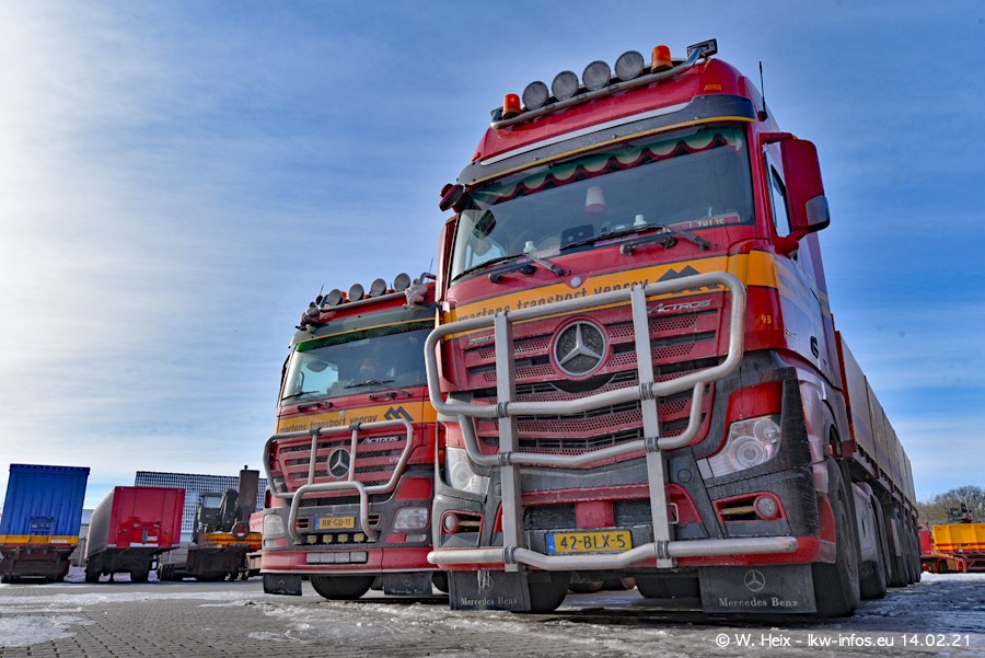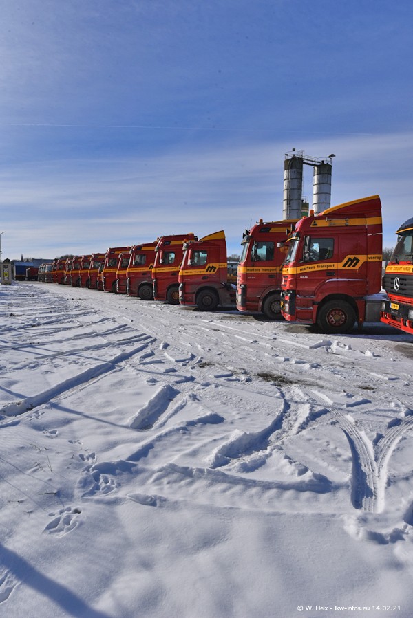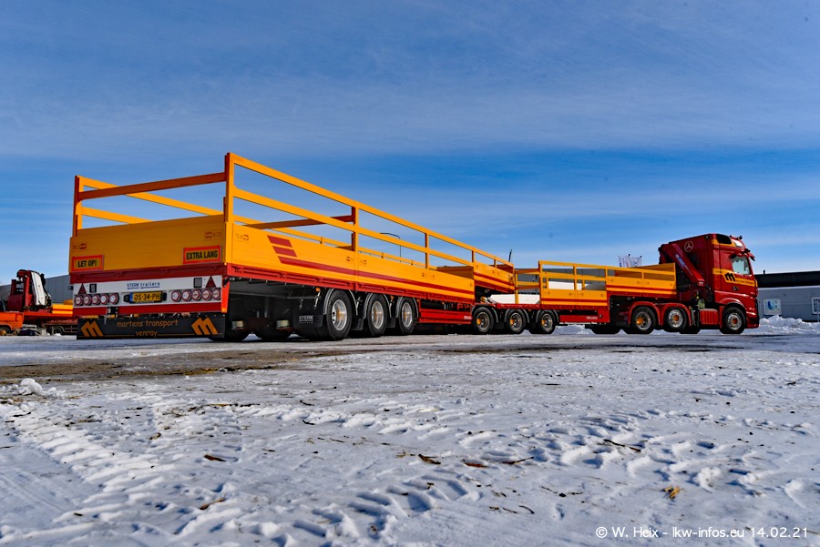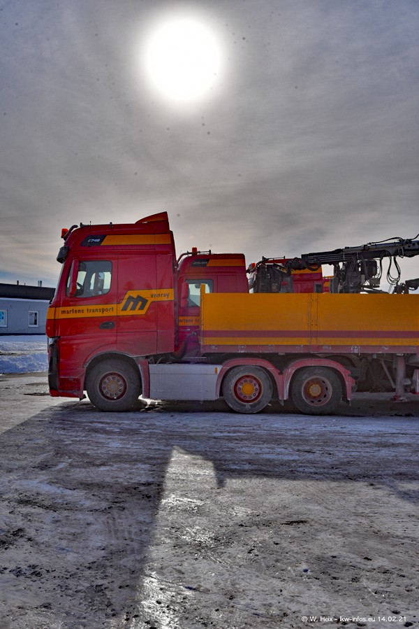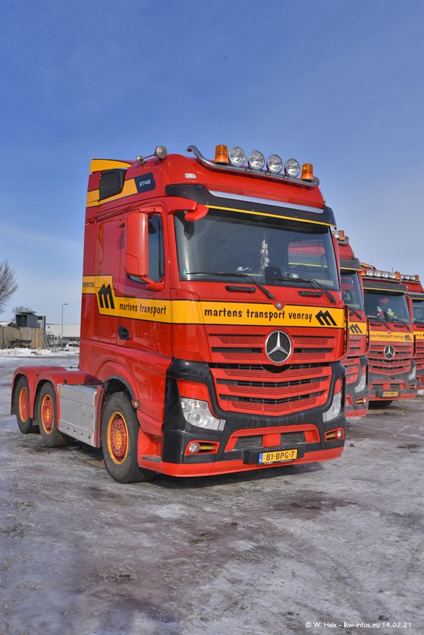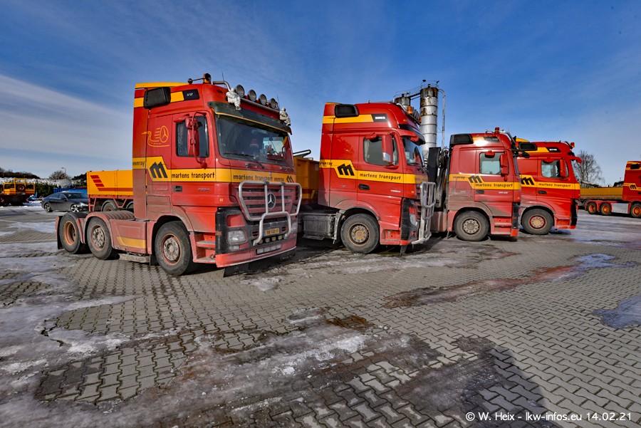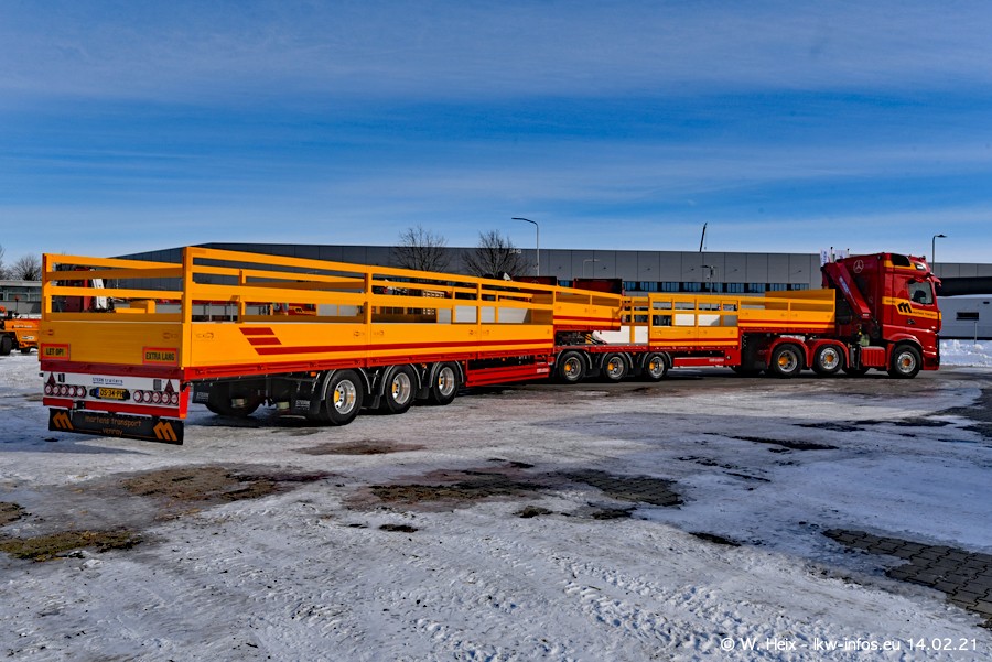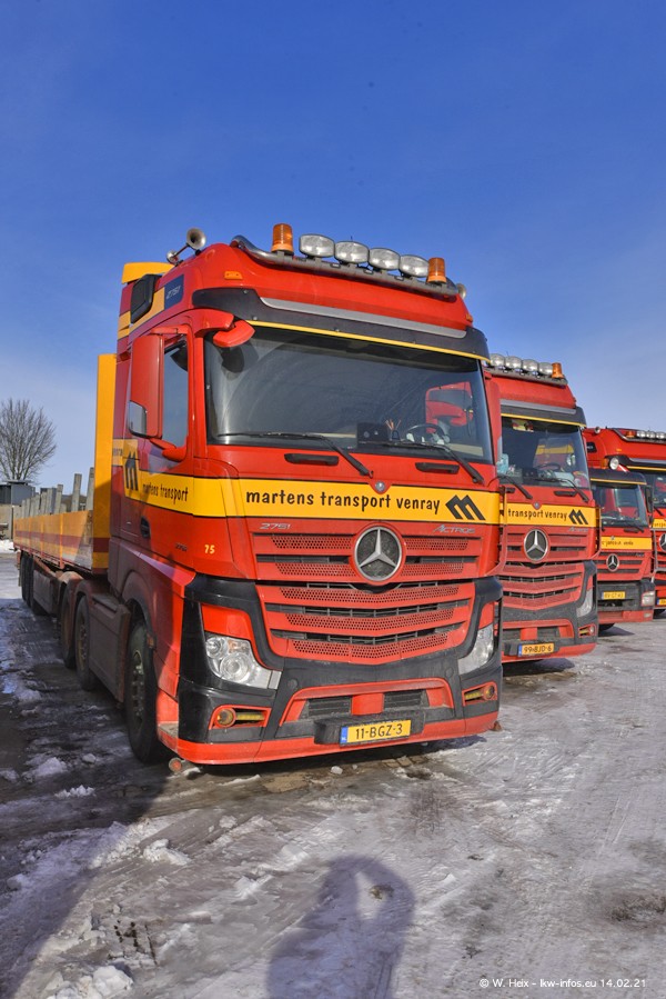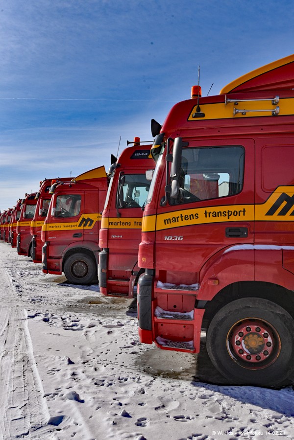 Wie schon in Teil 12 angekündigt, hat Martens Transport in dieser Woche die beiden neuen Auflieger für den Mercedes-Benz New Actros 2851 bekommen. Damit wird die Kombination zu einem LZV (Gigaliner). Die beiden Auflieger wurden von der niederländischen Firma Sterk Trailers gebaut. Der erste Auflieger ist kürzer als der zweite und die Besondeheit ist die auf dem Trailer montierte Sattelkupplung für den zweiten Auflieger, der ein Standardmaß hat. Die Sattelkupplung kann demontiert werden und dann kann der Auflieger "ganz normal" genutzt werden. Diese Art LZV ist in den Niederlanden bisher einzigartig und wird für den Transport von großen Bäumen und Pflanzen in den Niederlanden und Belgien eingesetzt. Ab der kommenden Woche. Und noch etwas hat sich verändert: die beiden bisher blauen Actros 4 Zugmaschinen wurden in den letzten Wochen rot lackiert und entsprechend beschriftet und passen jetzt zum restlichen Fuhrpark. Das das sind die beiden Zugmaschinen mit den silbergrauen Seitenverkleidungen und Kennzeichen "BPG ...". Die Fotos habe ich bei schönstem Winterwetter gemacht. Eis und Schnee sind in den Niederlanden inzwischen genauso selten, wie bei mir zuhause am Niederrhein. Entsprechend schmutig waren die LKW. Das gehört aber bei diesem Wetter irgendwie dazu. Alle LKW waren an diesem Sonntag Vormittag zuhause.