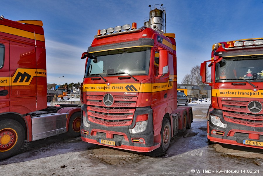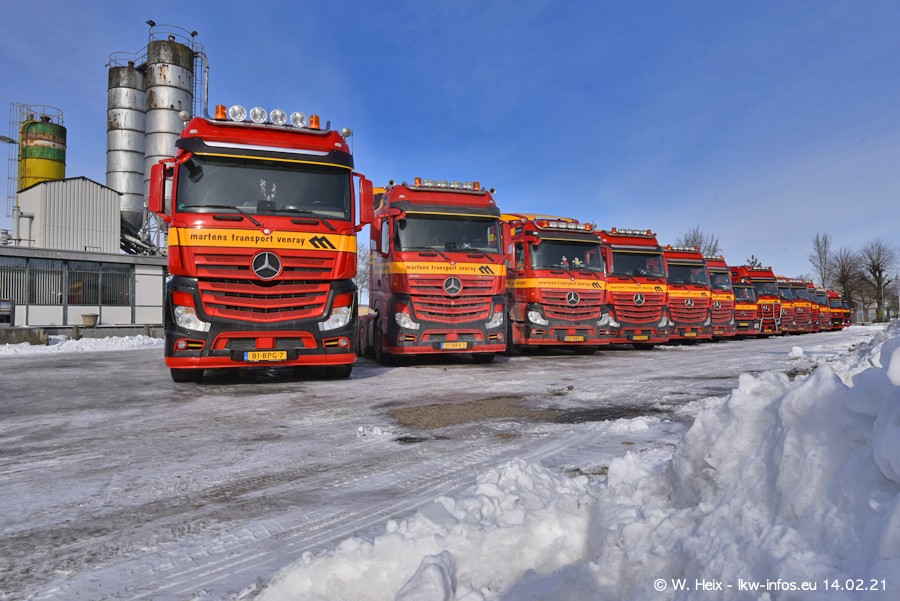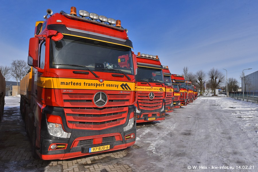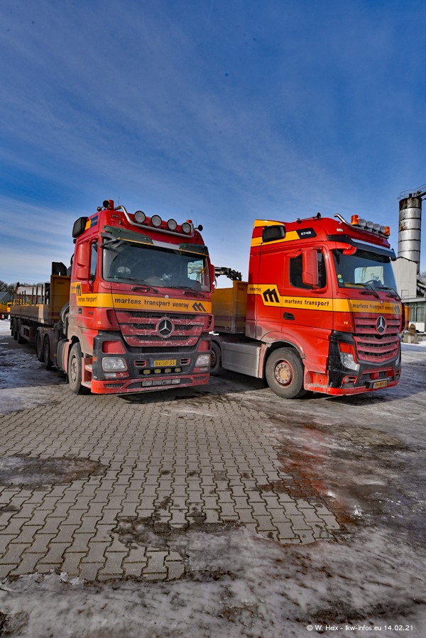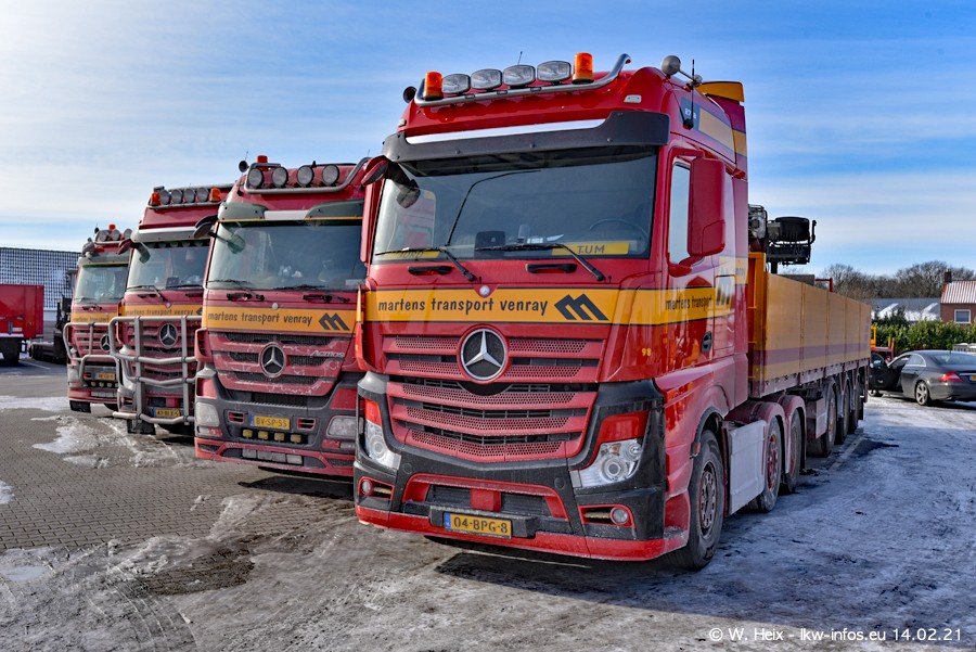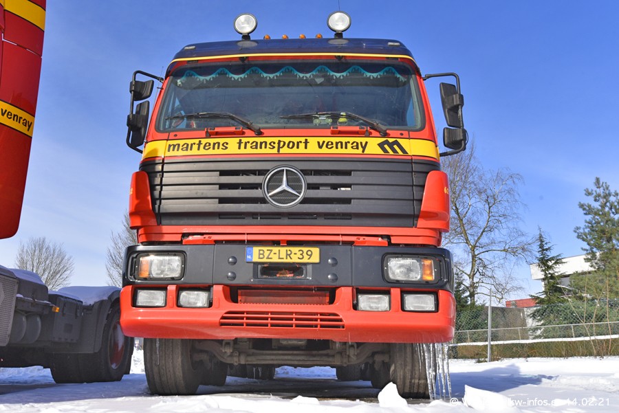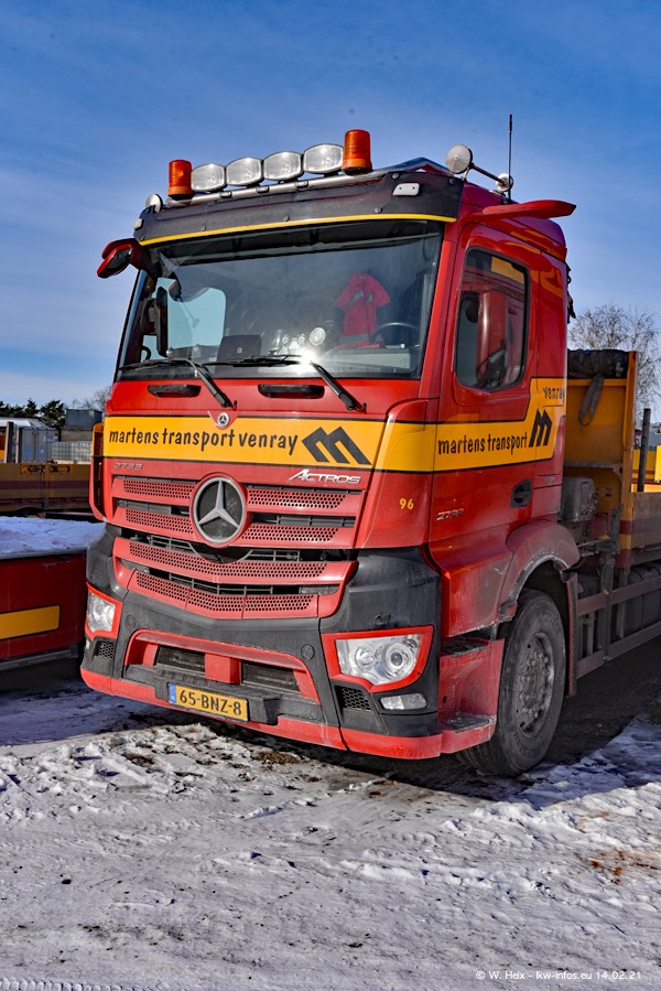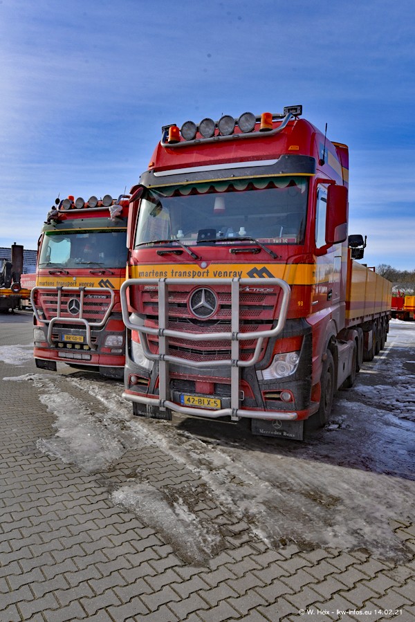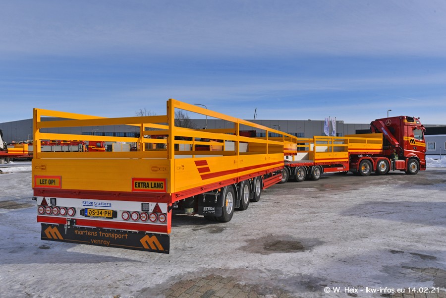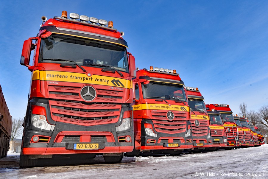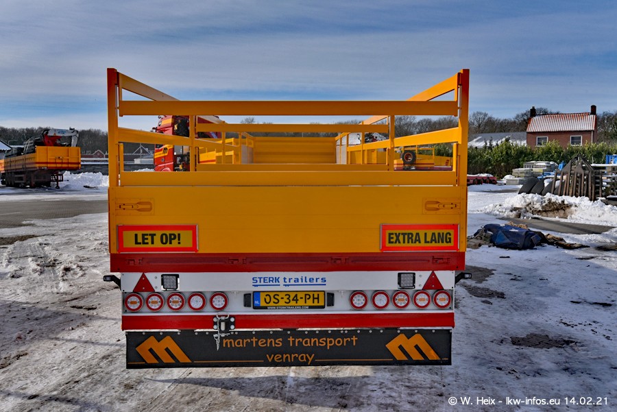 Wie schon in Teil 12 angekündigt, hat Martens Transport in dieser Woche die beiden neuen Auflieger für den Mercedes-Benz New Actros 2851 bekommen. Damit wird die Kombination zu einem LZV (Gigaliner). Die beiden Auflieger wurden von der niederländischen Firma Sterk Trailers gebaut. Der erste Auflieger ist kürzer als der zweite und die Besondeheit ist die auf dem Trailer montierte Sattelkupplung für den zweiten Auflieger, der ein Standardmaß hat. Die Sattelkupplung kann demontiert werden und dann kann der Auflieger "ganz normal" genutzt werden. Diese Art LZV ist in den Niederlanden bisher einzigartig und wird für den Transport von großen Bäumen und Pflanzen in den Niederlanden und Belgien eingesetzt. Ab der kommenden Woche. Und noch etwas hat sich verändert: die beiden bisher blauen Actros 4 Zugmaschinen wurden in den letzten Wochen rot lackiert und entsprechend beschriftet und passen jetzt zum restlichen Fuhrpark. Das das sind die beiden Zugmaschinen mit den silbergrauen Seitenverkleidungen und Kennzeichen "BPG ...". Die Fotos habe ich bei schönstem Winterwetter gemacht. Eis und Schnee sind in den Niederlanden inzwischen genauso selten, wie bei mir zuhause am Niederrhein. Entsprechend schmutig waren die LKW. Das gehört aber bei diesem Wetter irgendwie dazu. Alle LKW waren an diesem Sonntag Vormittag zuhause.